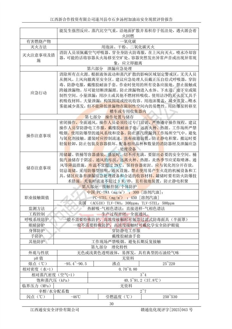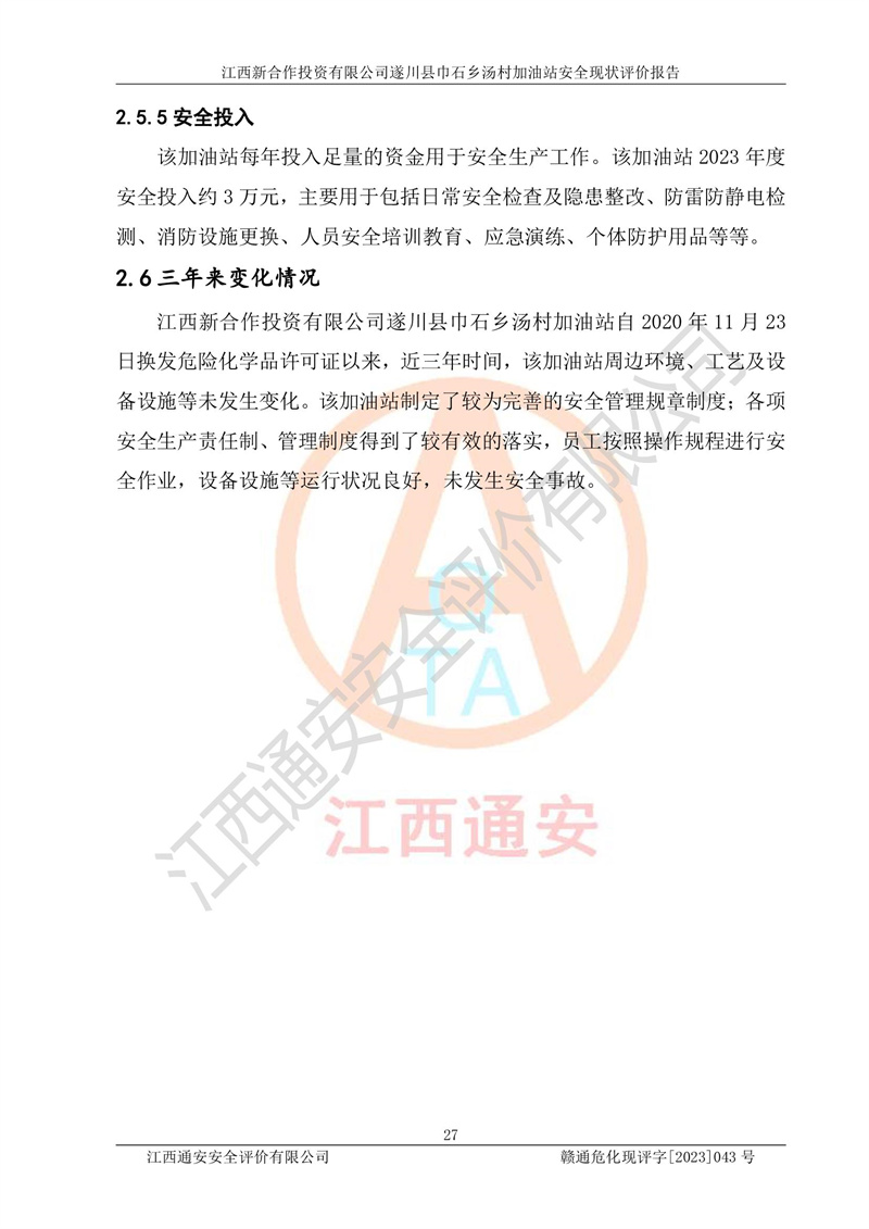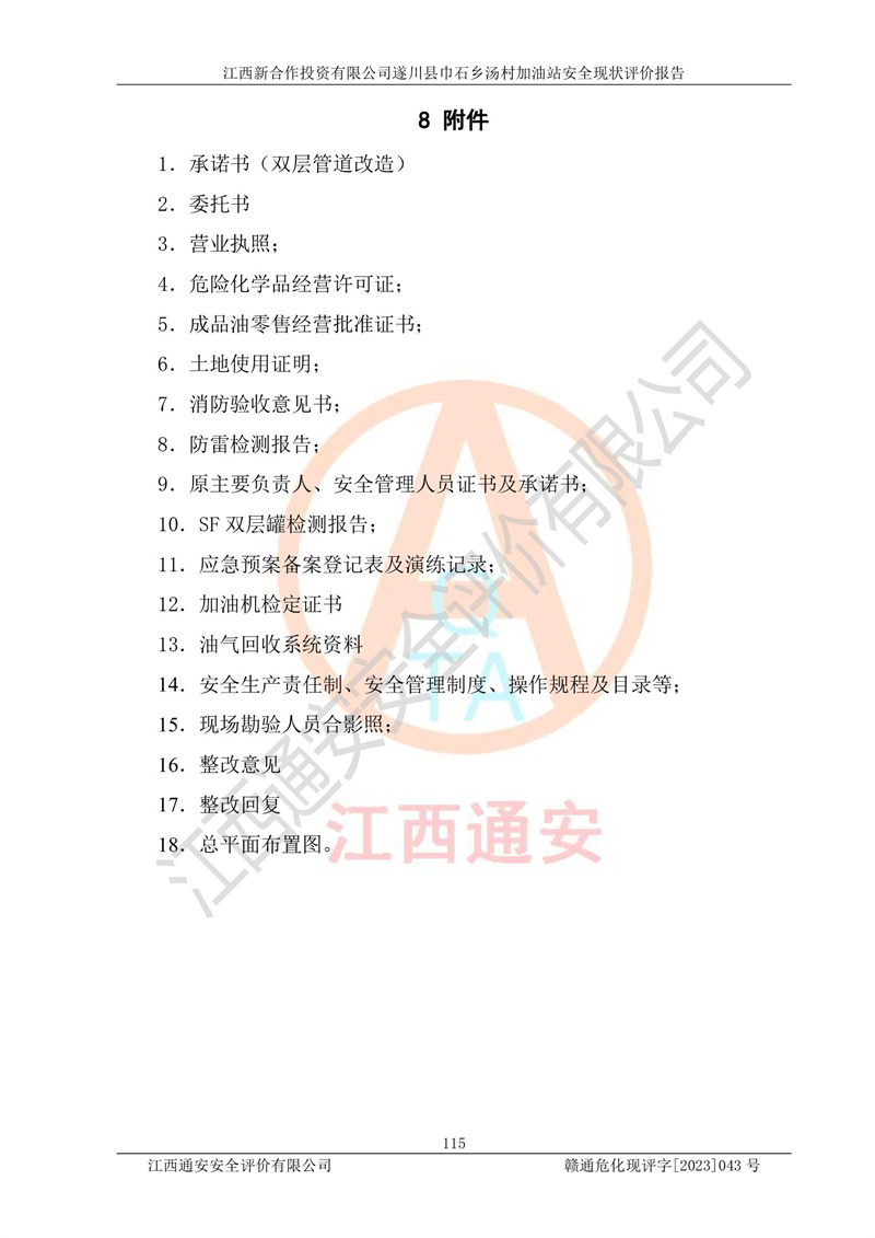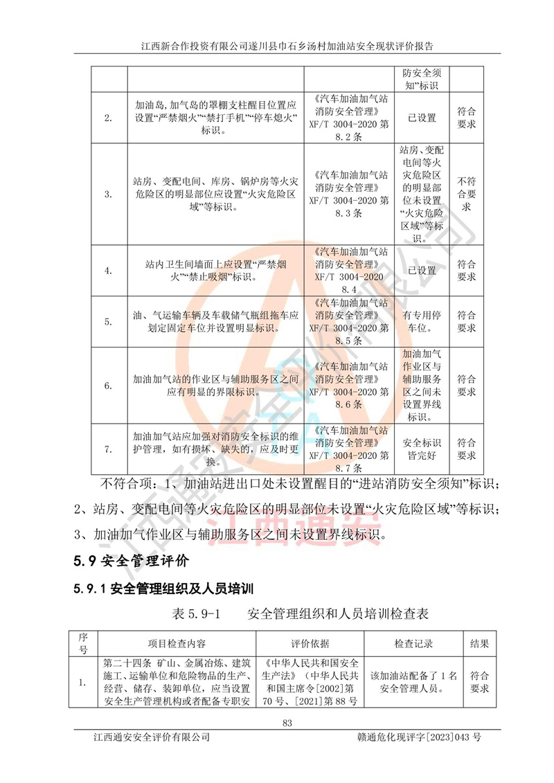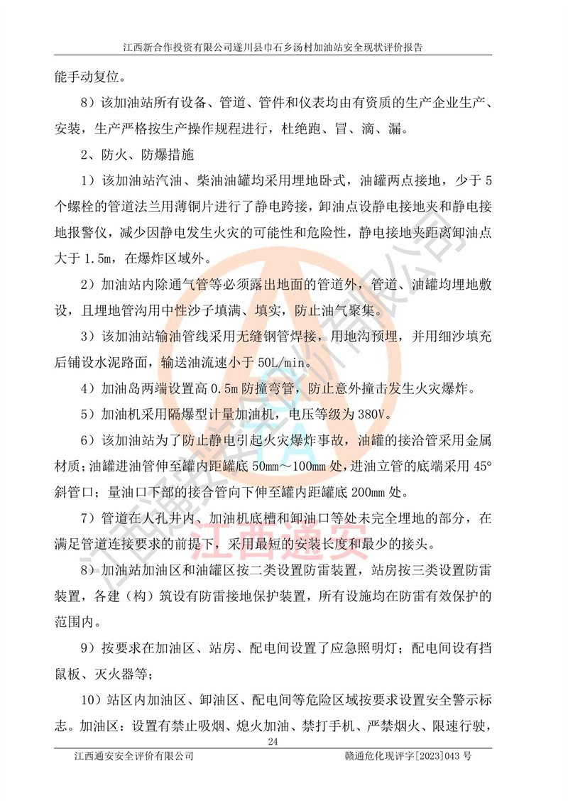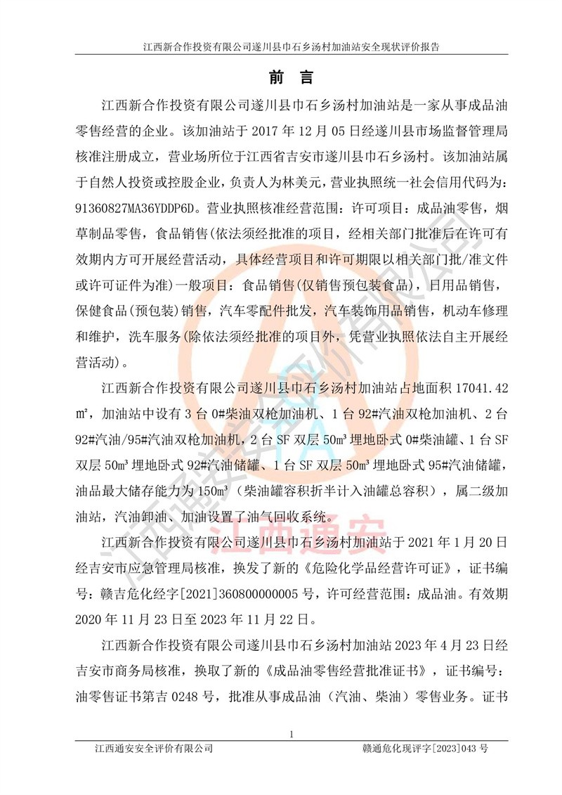 评价报告名称 | 江西新合作投资有限公司遂川县巾石乡汤村加油站安全现状评价报告 | |||