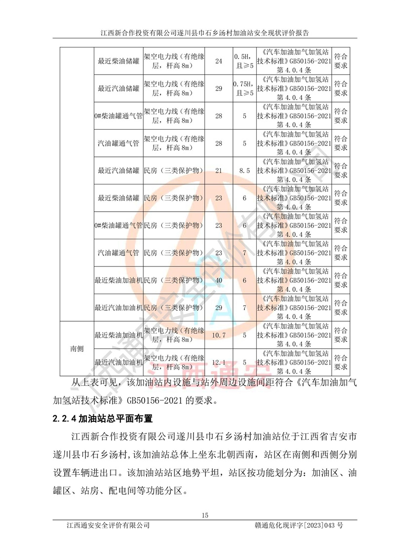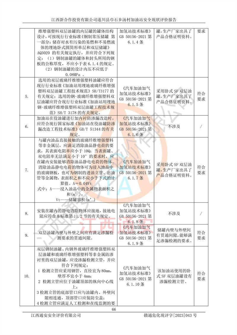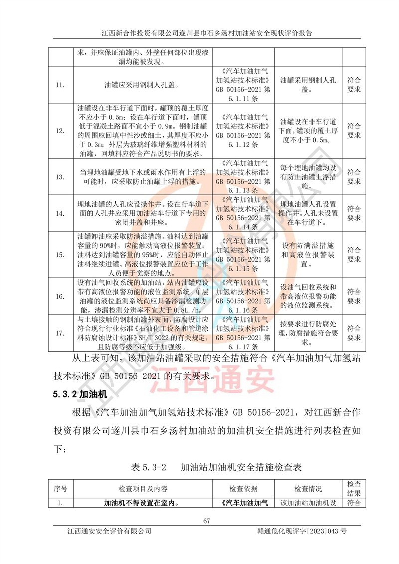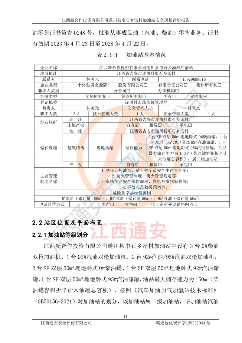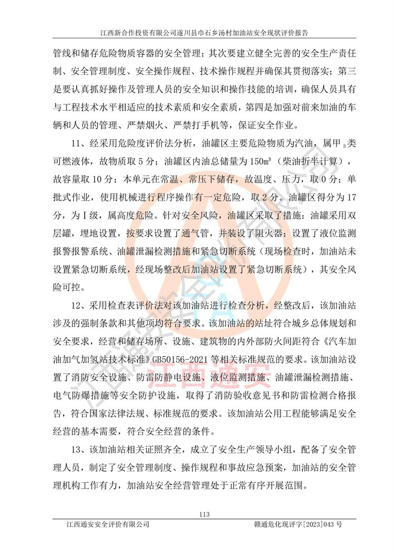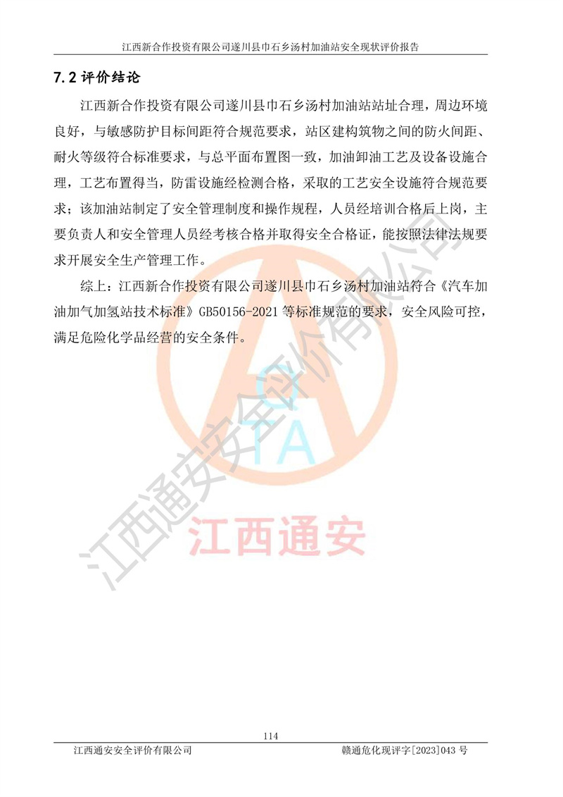 评价结论 | 江西新合作投资有限公司遂川县巾石乡汤村加油站符合《汽车加油加气加氢站技术标准》GB50156-2021等标准规范的要求,安全风险可控,满足危险化学品经营的安全条件。 | |||