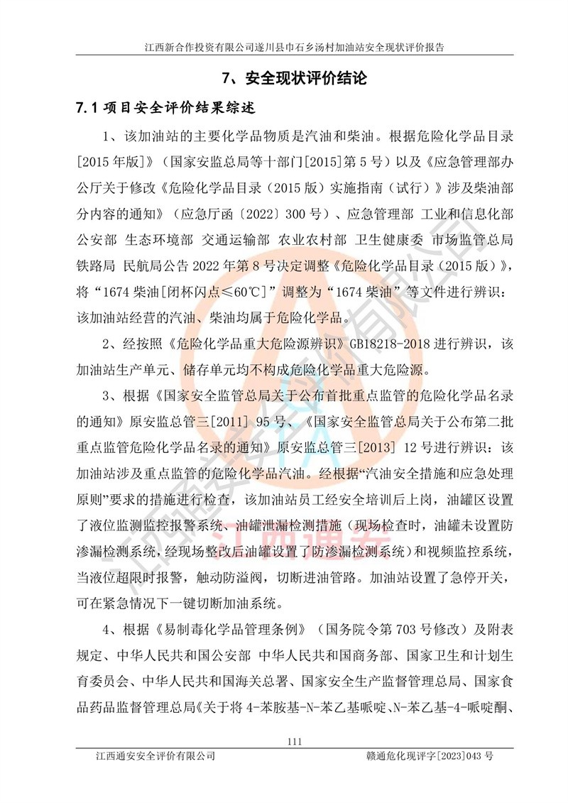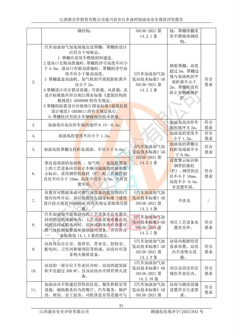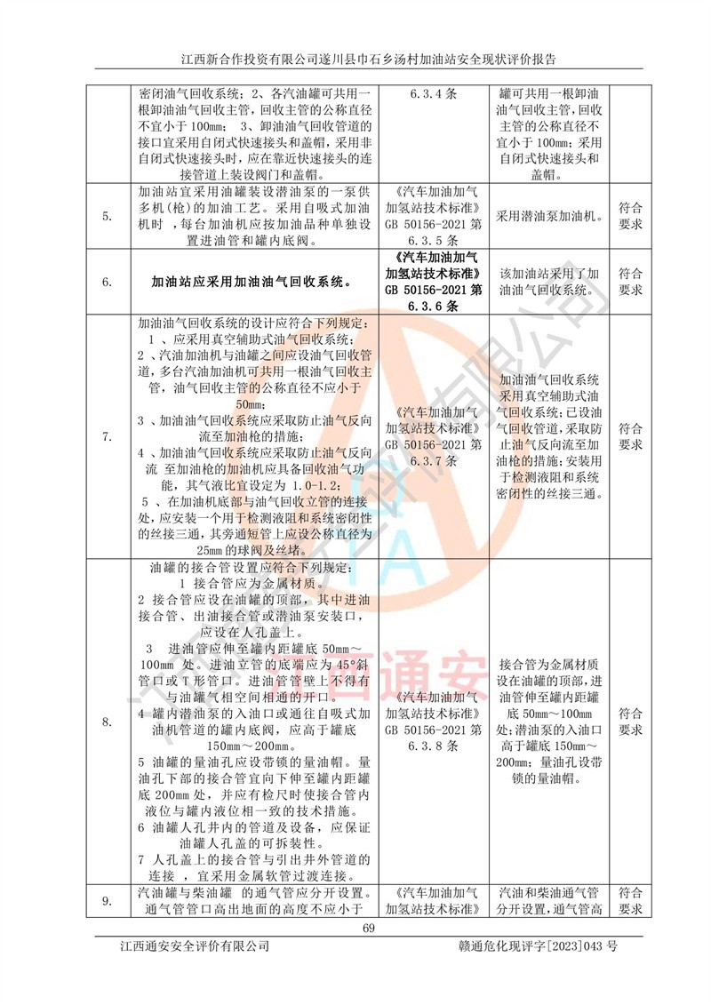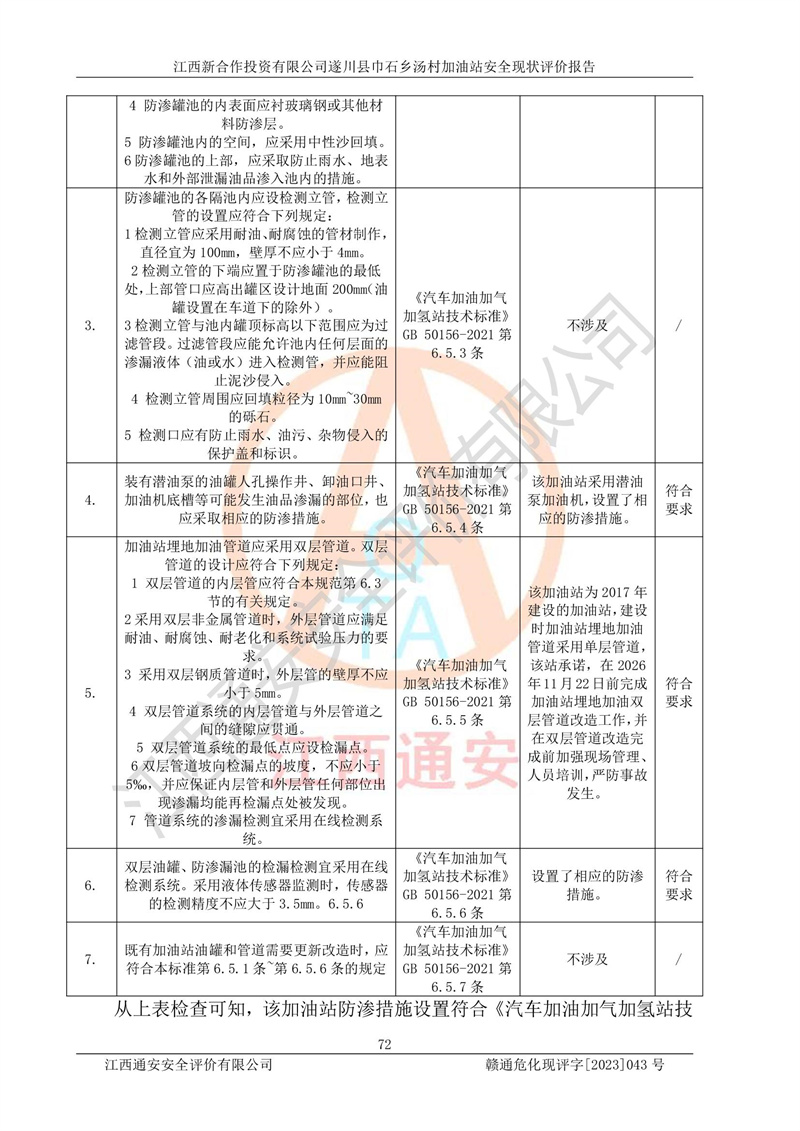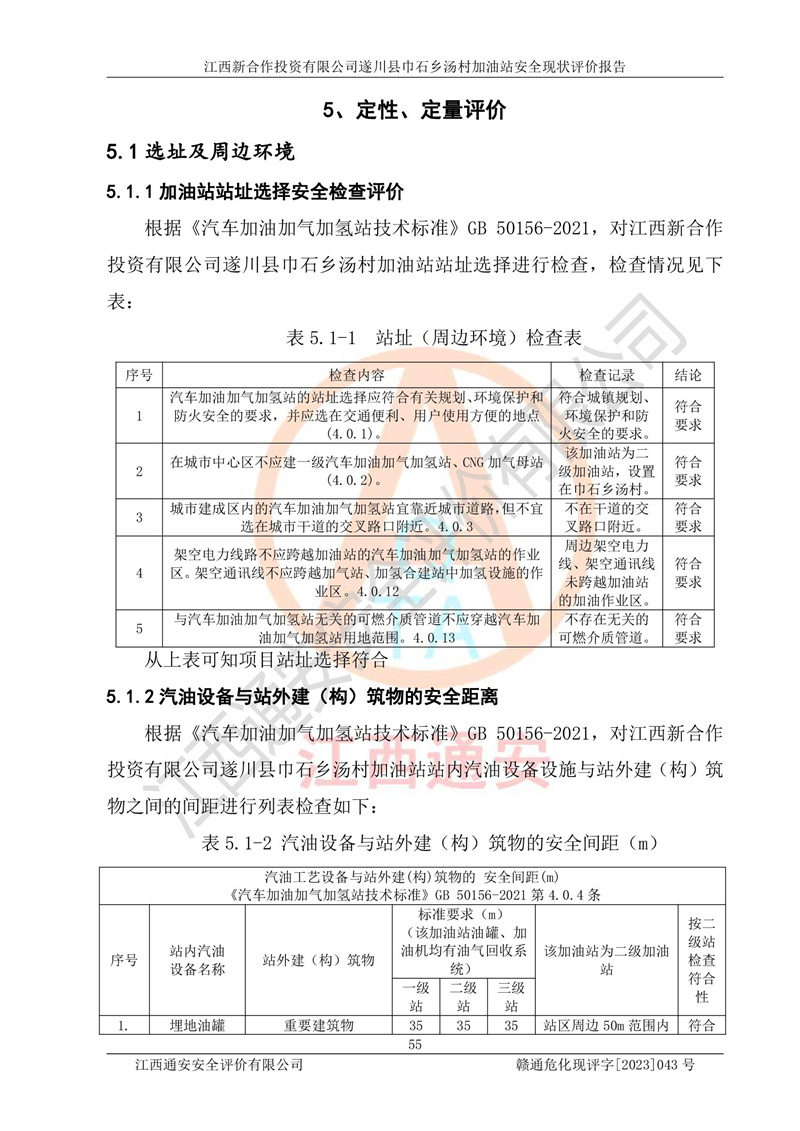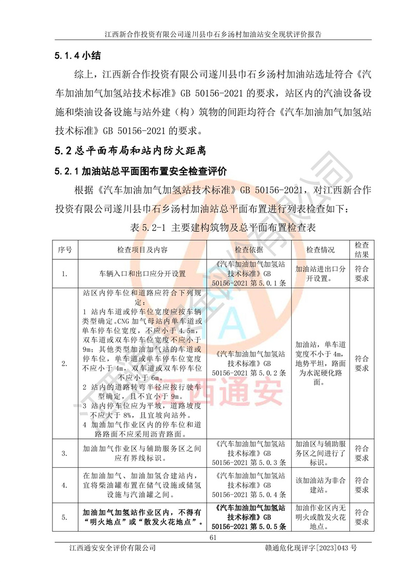 评价结论 | 江西新合作投资有限公司遂川县巾石乡汤村加油站符合《汽车加油加气加氢站技术标准》GB50156-2021等标准规范的要求,安全风险可控,满足危险化学品经营的安全条件。 | |||