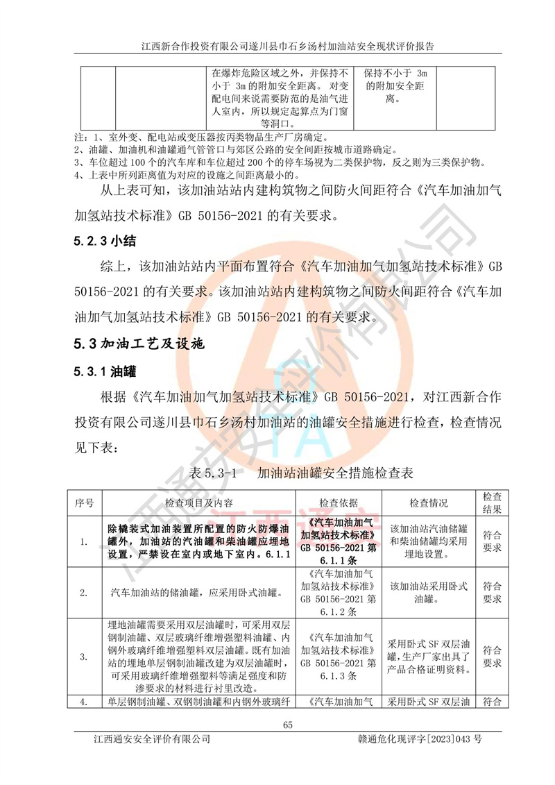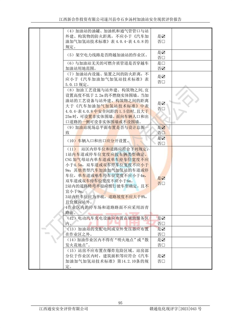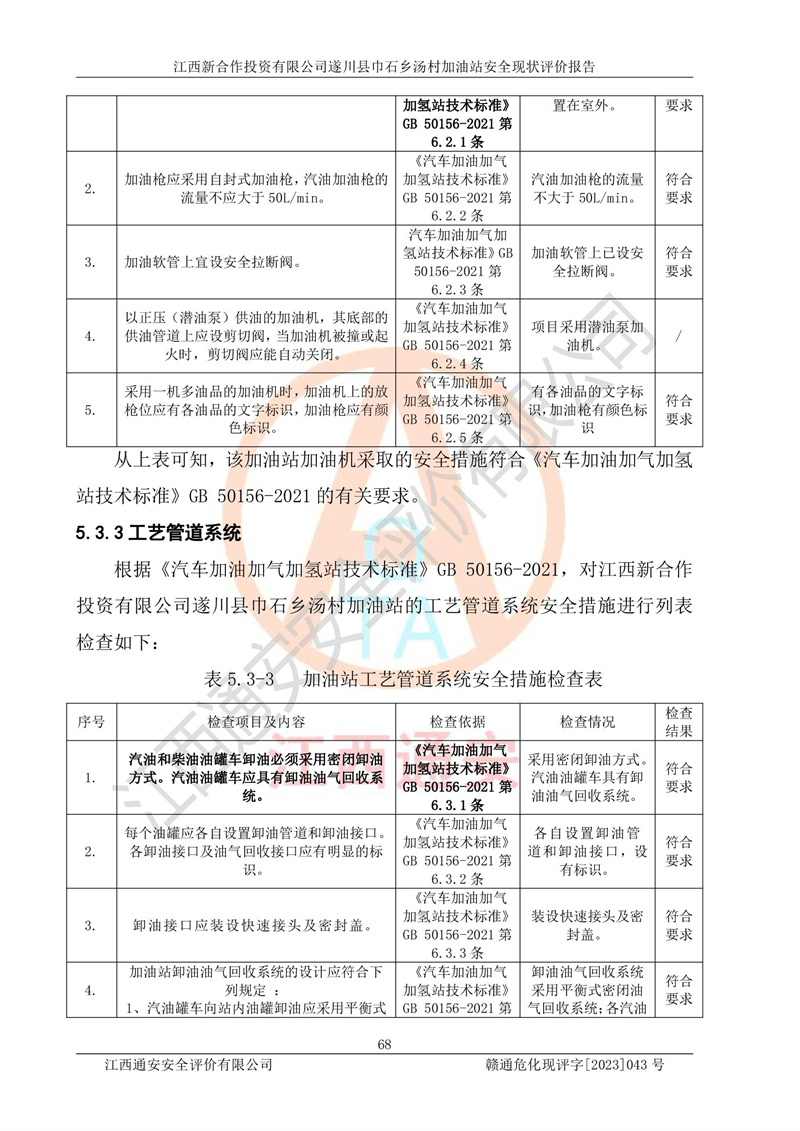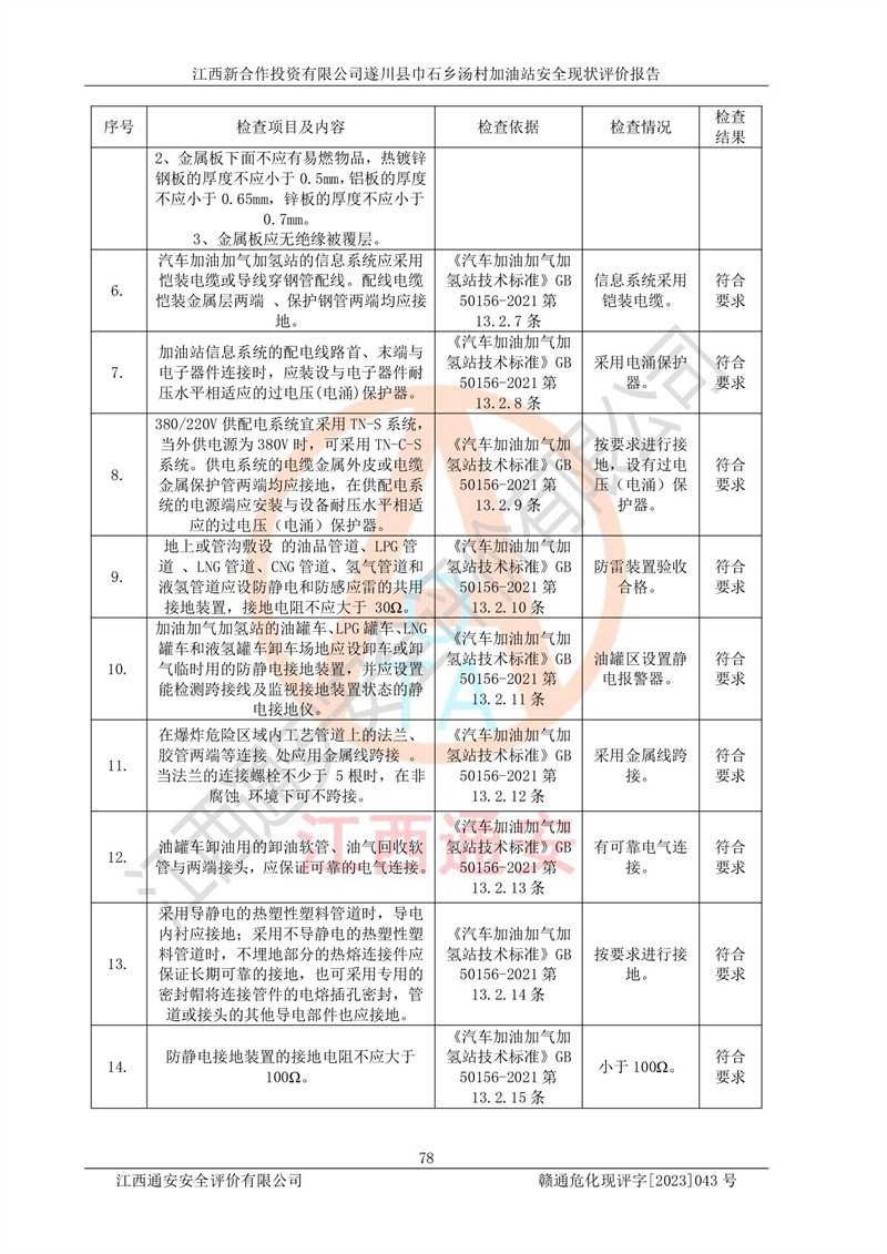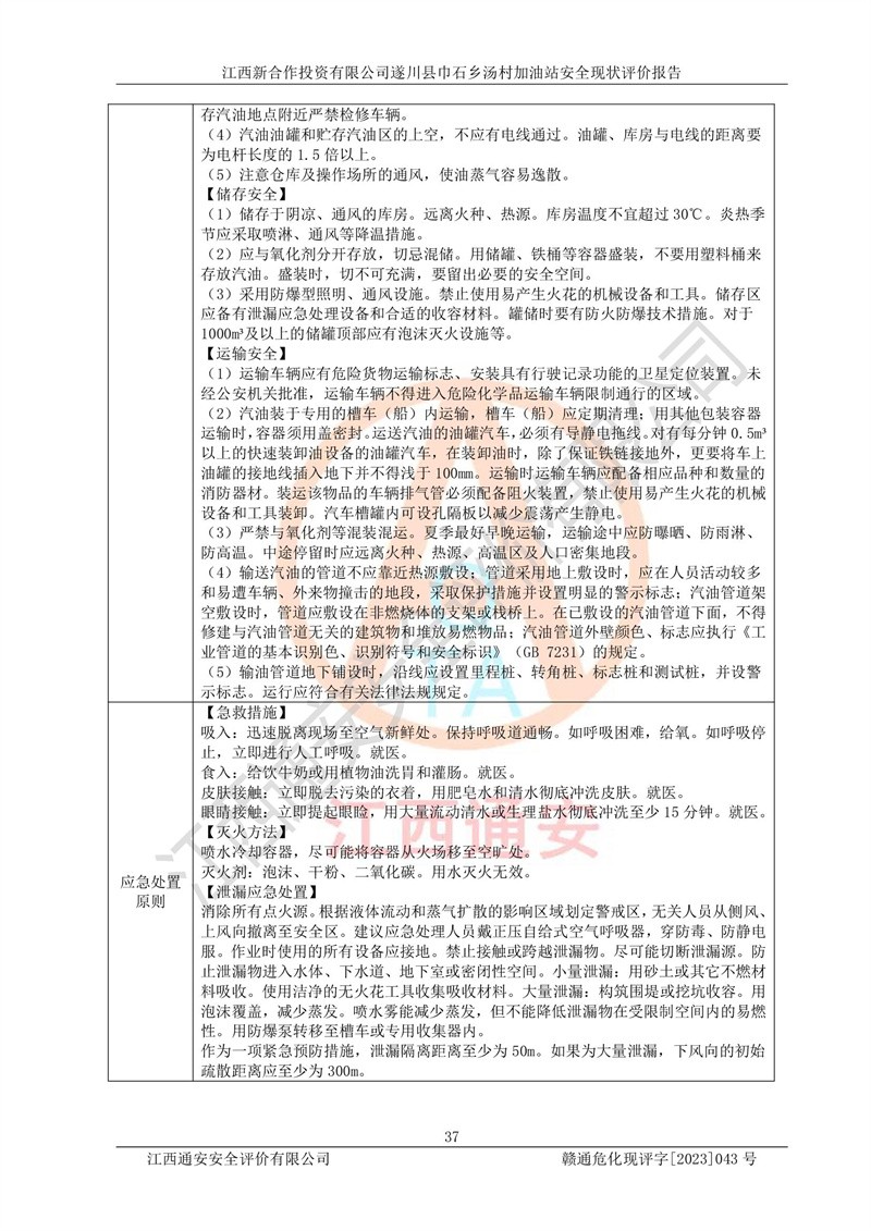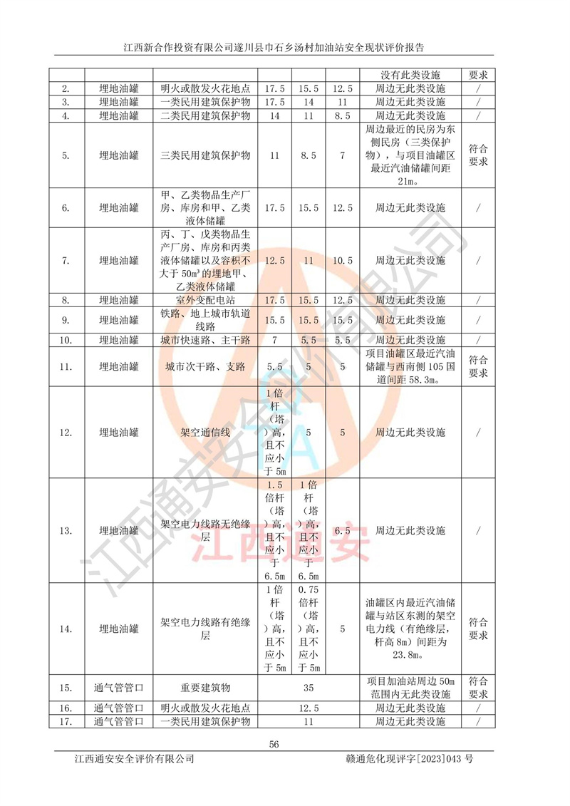 评价结论 | 江西新合作投资有限公司遂川县巾石乡汤村加油站符合《汽车加油加气加氢站技术标准》GB50156-2021等标准规范的要求,安全风险可控,满足危险化学品经营的安全条件。 | |||