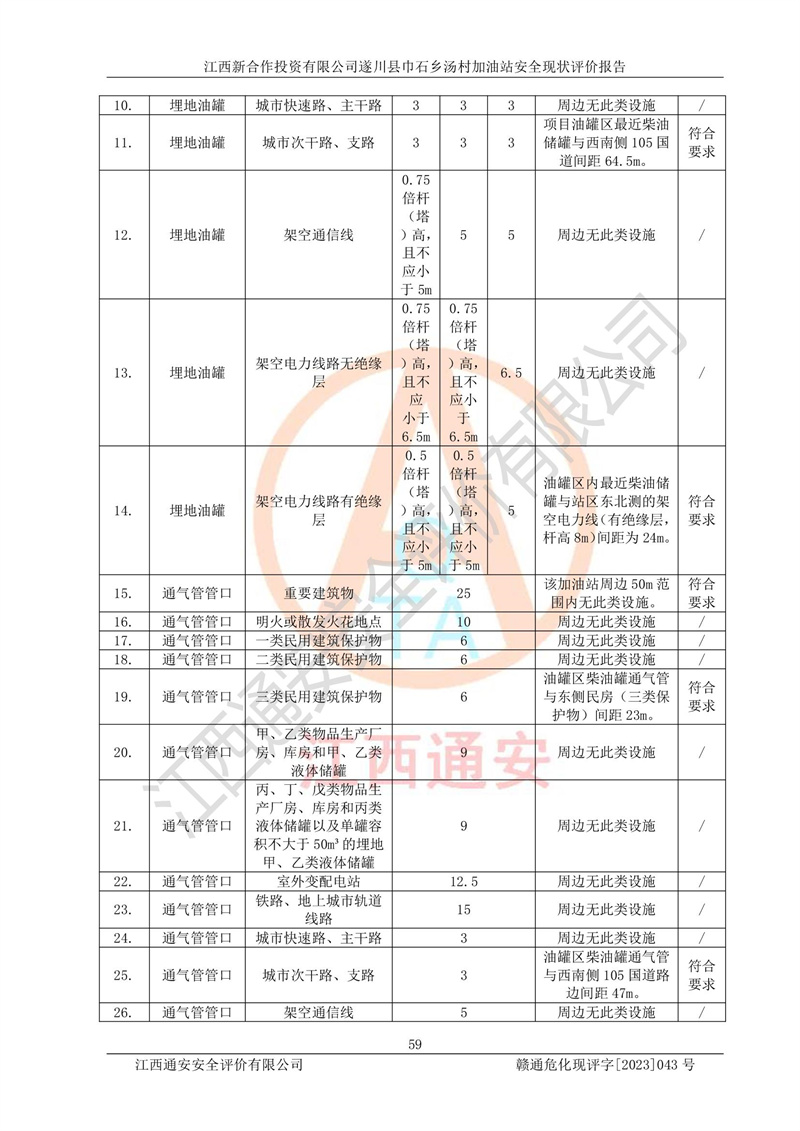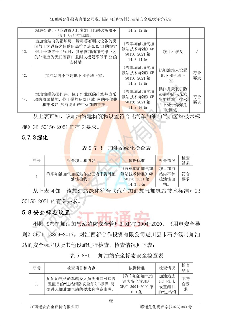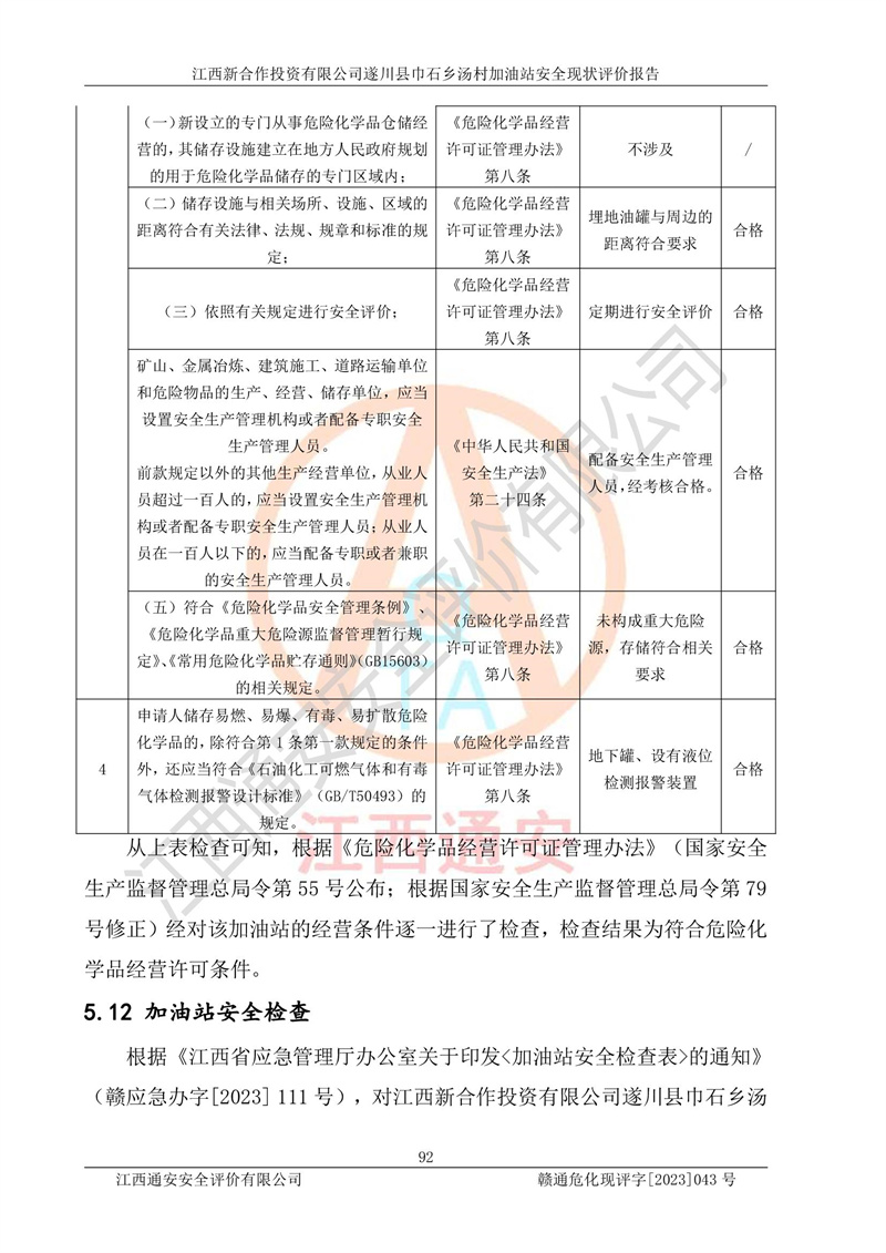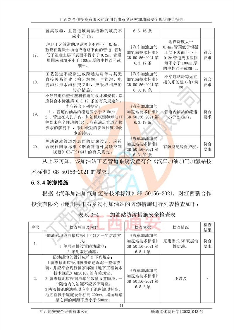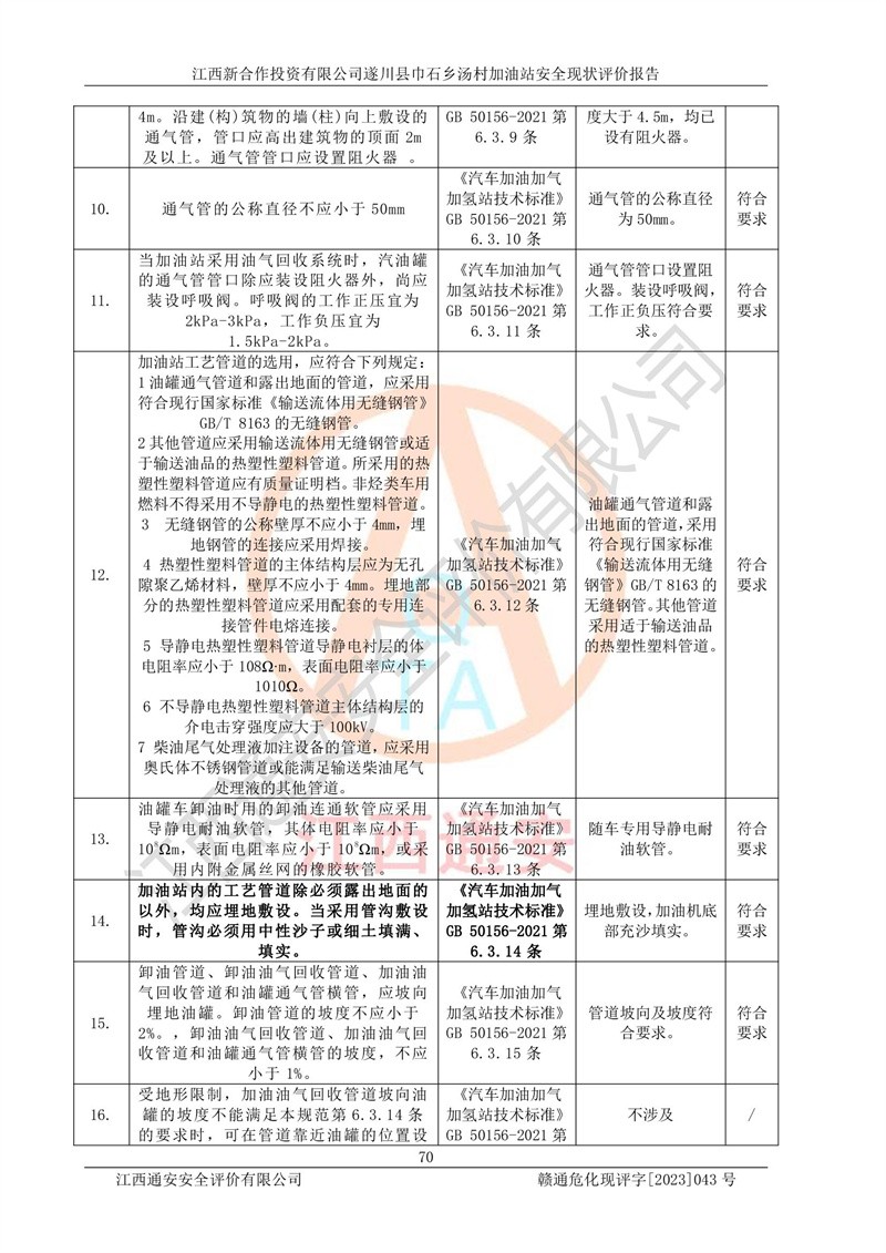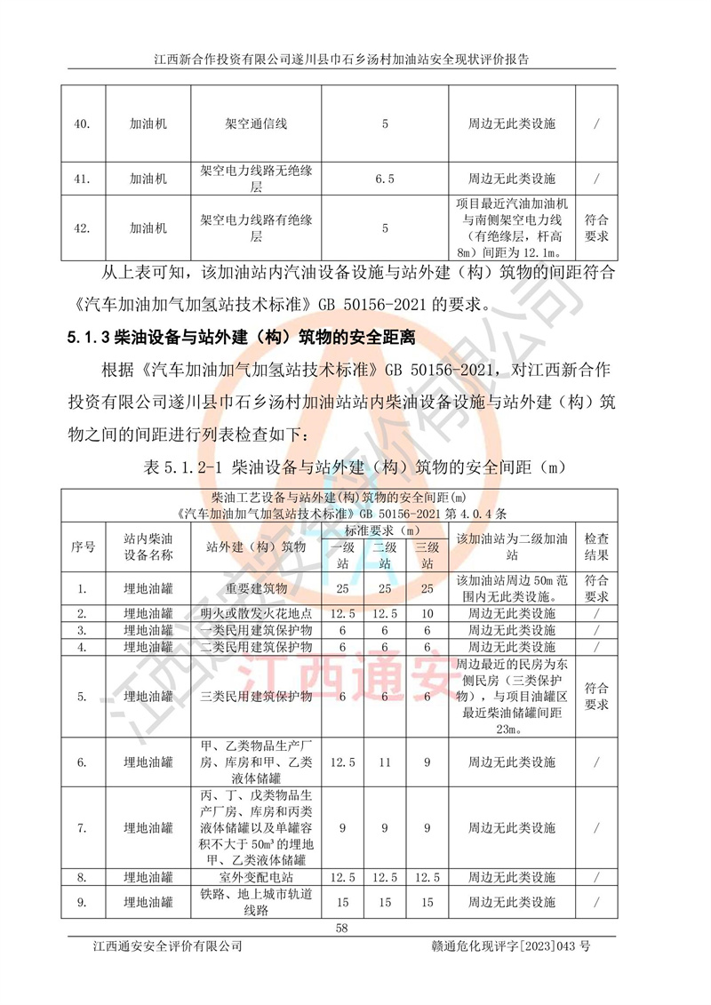 评价结论 | 江西新合作投资有限公司遂川县巾石乡汤村加油站符合《汽车加油加气加氢站技术标准》GB50156-2021等标准规范的要求,安全风险可控,满足危险化学品经营的安全条件。 | |||