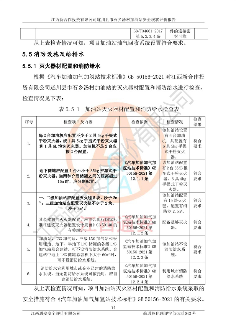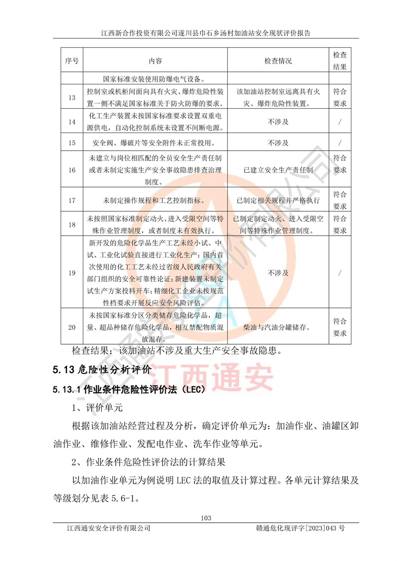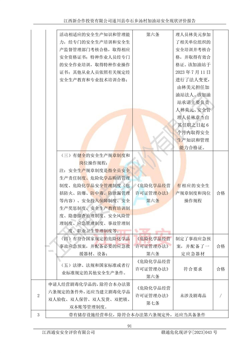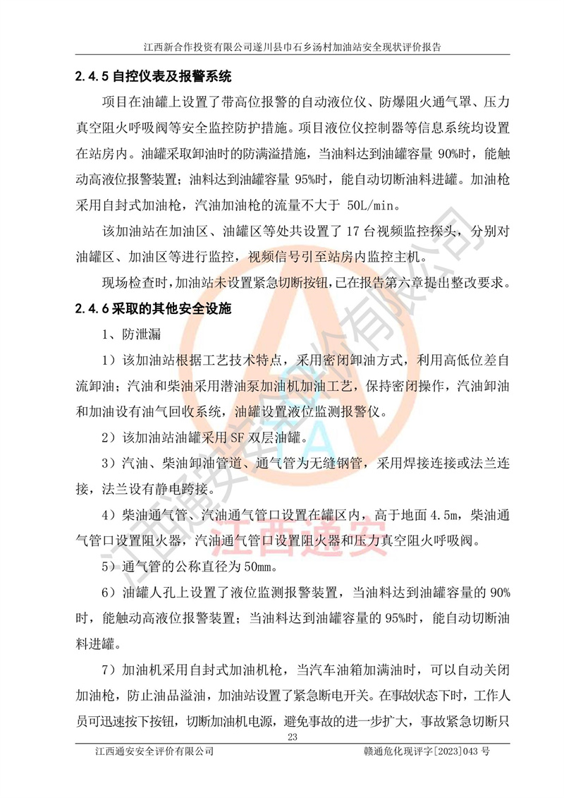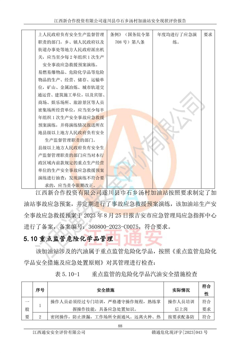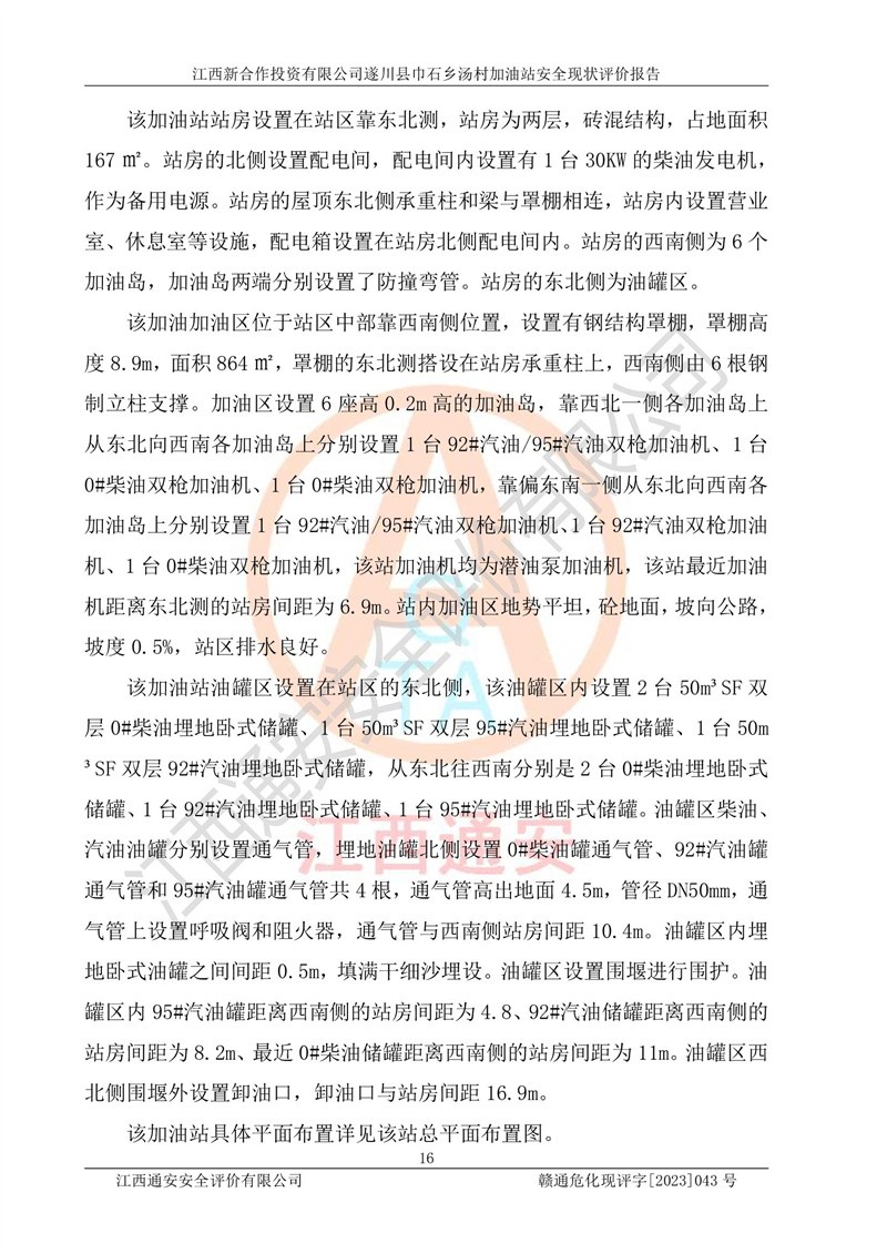 评价结论 | 江西新合作投资有限公司遂川县巾石乡汤村加油站符合《汽车加油加气加氢站技术标准》GB50156-2021等标准规范的要求,安全风险可控,满足危险化学品经营的安全条件。 | |||