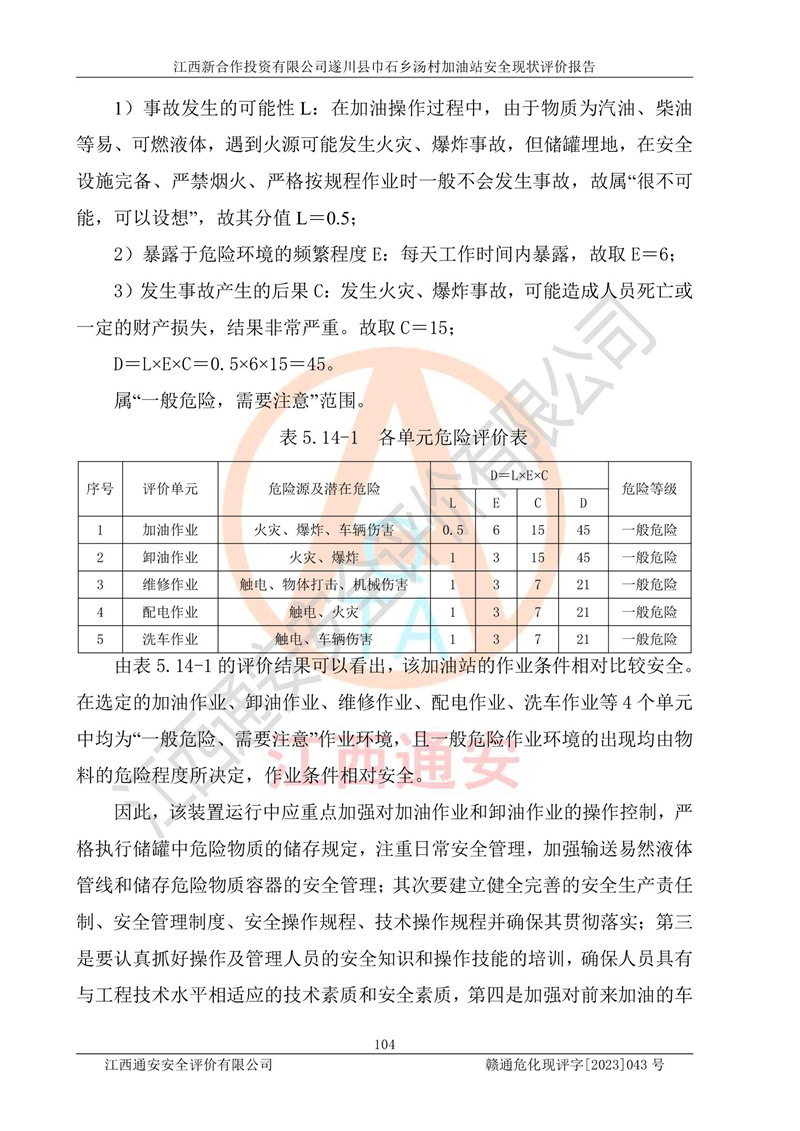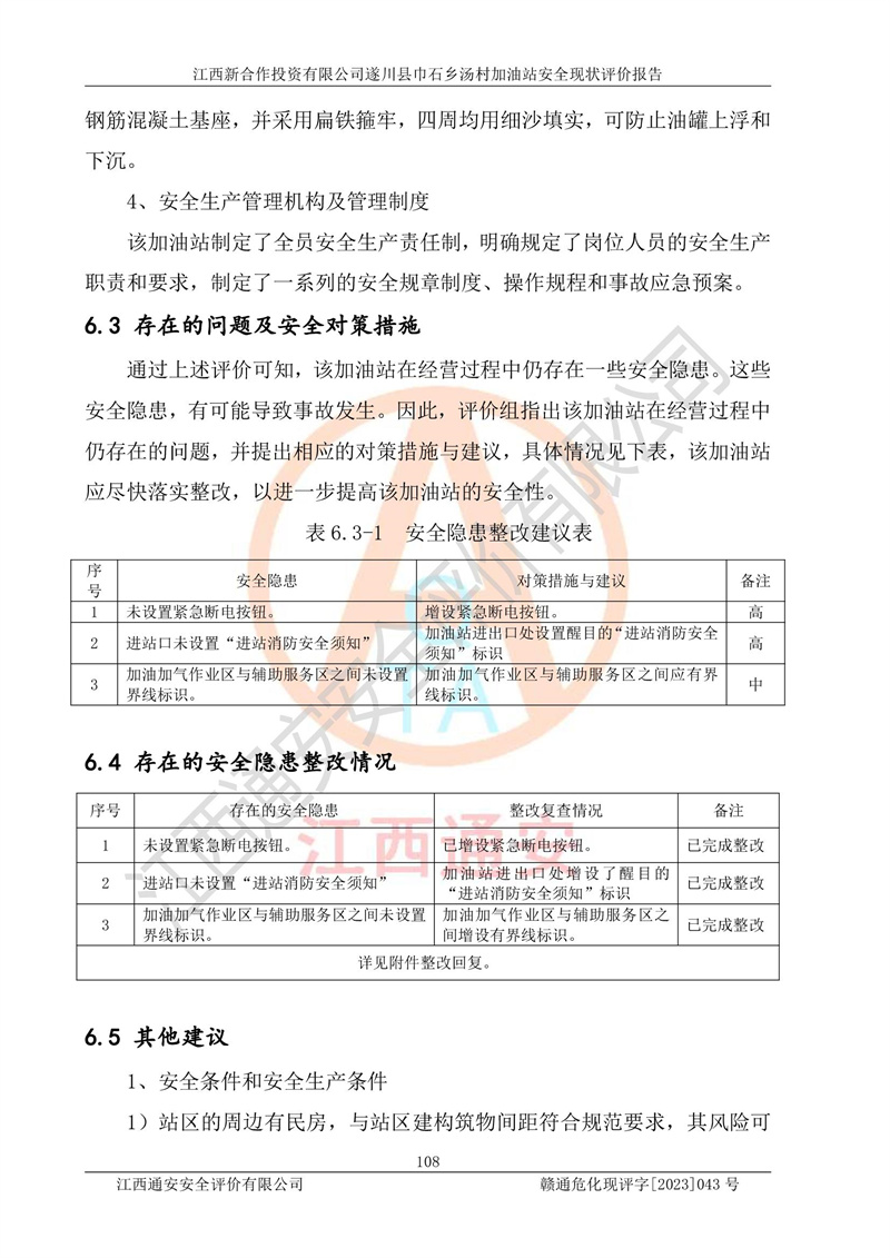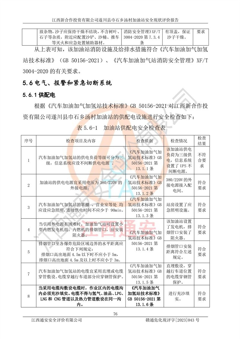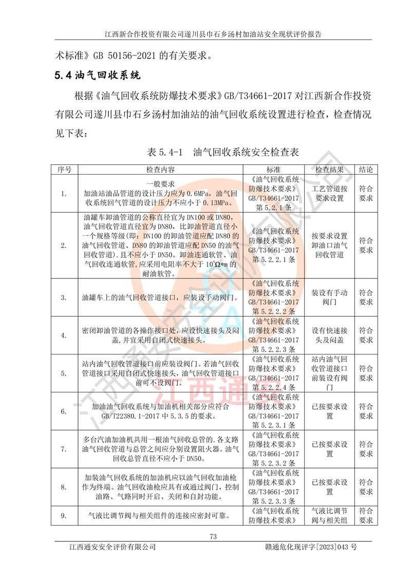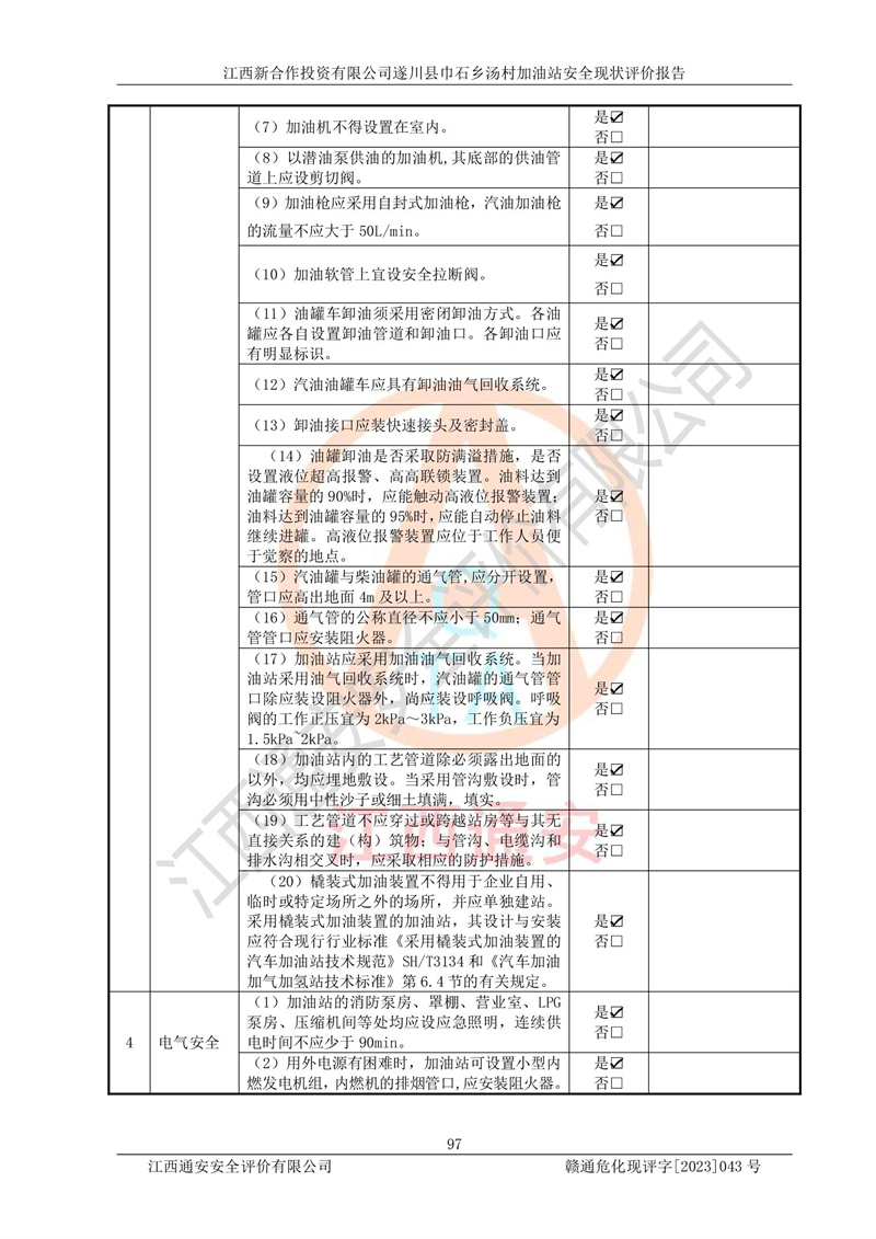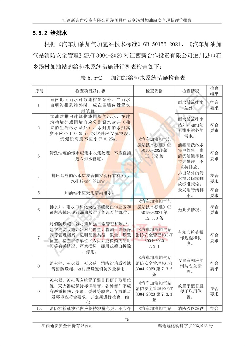 评价结论 | 江西新合作投资有限公司遂川县巾石乡汤村加油站符合《汽车加油加气加氢站技术标准》GB50156-2021等标准规范的要求,安全风险可控,满足危险化学品经营的安全条件。 | |||
