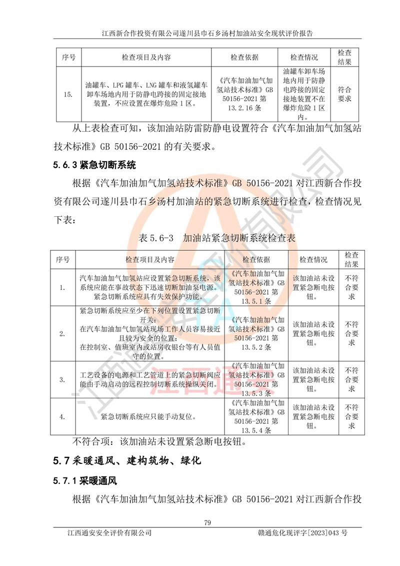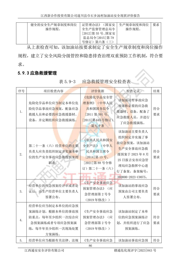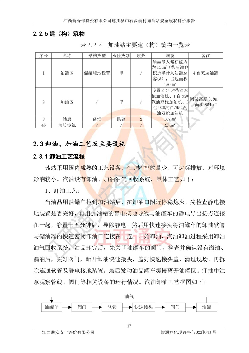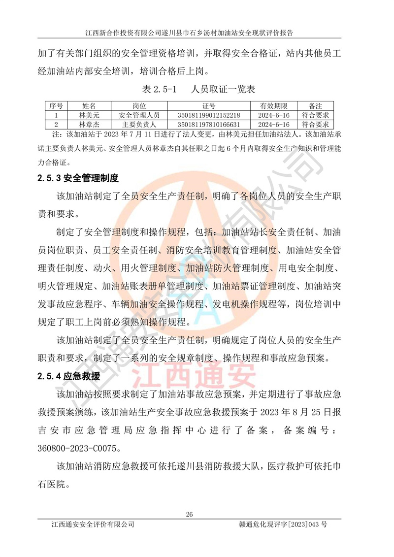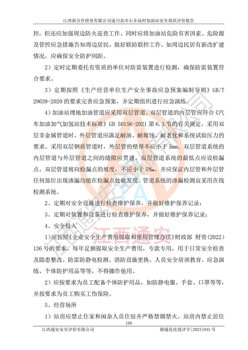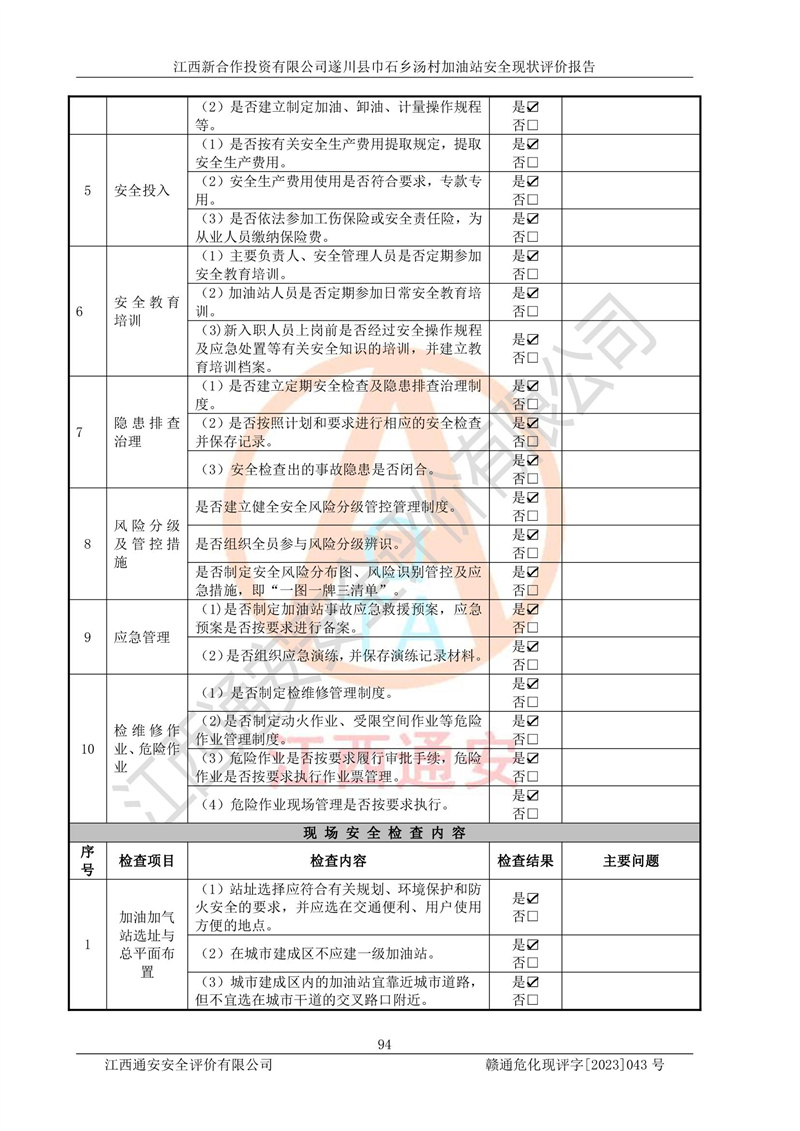 评价结论 | 江西新合作投资有限公司遂川县巾石乡汤村加油站符合《汽车加油加气加氢站技术标准》GB50156-2021等标准规范的要求,安全风险可控,满足危险化学品经营的安全条件。 | |||