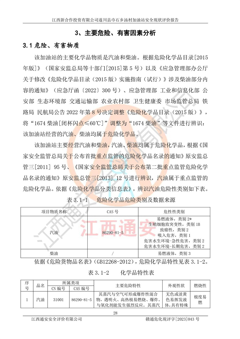 项目简介 | 江西新合作投资有限公司遂川县巾石乡汤村加油站是一家从事成品油零售经营的企业。该加油站于2017年12月05日经遂川县市场监督管理局核准注册成立,营业场所位于江西省吉安市遂川县巾石乡汤村。该加油站属于自然人投资或控股企业,负责人为林美元,营业执照统一社会信用代码为:91360827MA36YDDP6D。营业执照核准经营范围:许可项目:成品油零售,烟草制品零售,食品销售(依法须经批准的项目,经相关部门批准后在许可**期内方可开展经营活动,具体经营项目和许可期限以相关部门批/准文件或许可证件为准)一般项目:食品销售(仅销售预包装食品),日用品销售,保健食品(预包装)销售,汽车零配件批发,汽车装饰用品销售,机动车修理和维护,洗车服务(除依法须经批准的项目外,凭营业执照依法自主开展经营活动)。 江西新合作投资有限公司遂川县巾石乡汤村加油站占地面积17041.42㎡,加油站中设有3台0#柴油双枪加油机、1台92#汽油双枪加油机、2台92#汽油/95#汽油双枪加油机,2台SF双层50m³埋地卧式0#柴油罐、1台SF双层50m³埋地卧式92#汽油储罐、1台SF双层50m³埋地卧式95#汽油储罐,油品*大储存能力为150m³(柴油罐容积折半计入油罐总容积),属二级加油站,汽油卸油、加油设置了油气回收系统。 江西新合作投资有限公司遂川县巾石乡汤村加油站于2021年1月20日经吉安市应急管理局核准,换发了新的《危险化学品经营许可证》,证书编号:赣吉危化经字[2021]360800000005号,许可经营范围:成品油。**期2020年11月23日至2023年11月22日。 江西新合作投资有限公司遂川县巾石乡汤村加油站2023年4月23日经吉安市商务局核准,换取了新的《成品油零售经营批准证书》,证书编号:油零售证书第吉0248号,批准从事成品油(汽油、柴油)零售业务。证书**期2023年4月23日至2028年4月22日日。 项目生产过程中涉及的危险化学品有:汽油、柴油等。 项目各生产和储存单元均未构成危险化学品重大危险源。 | |||