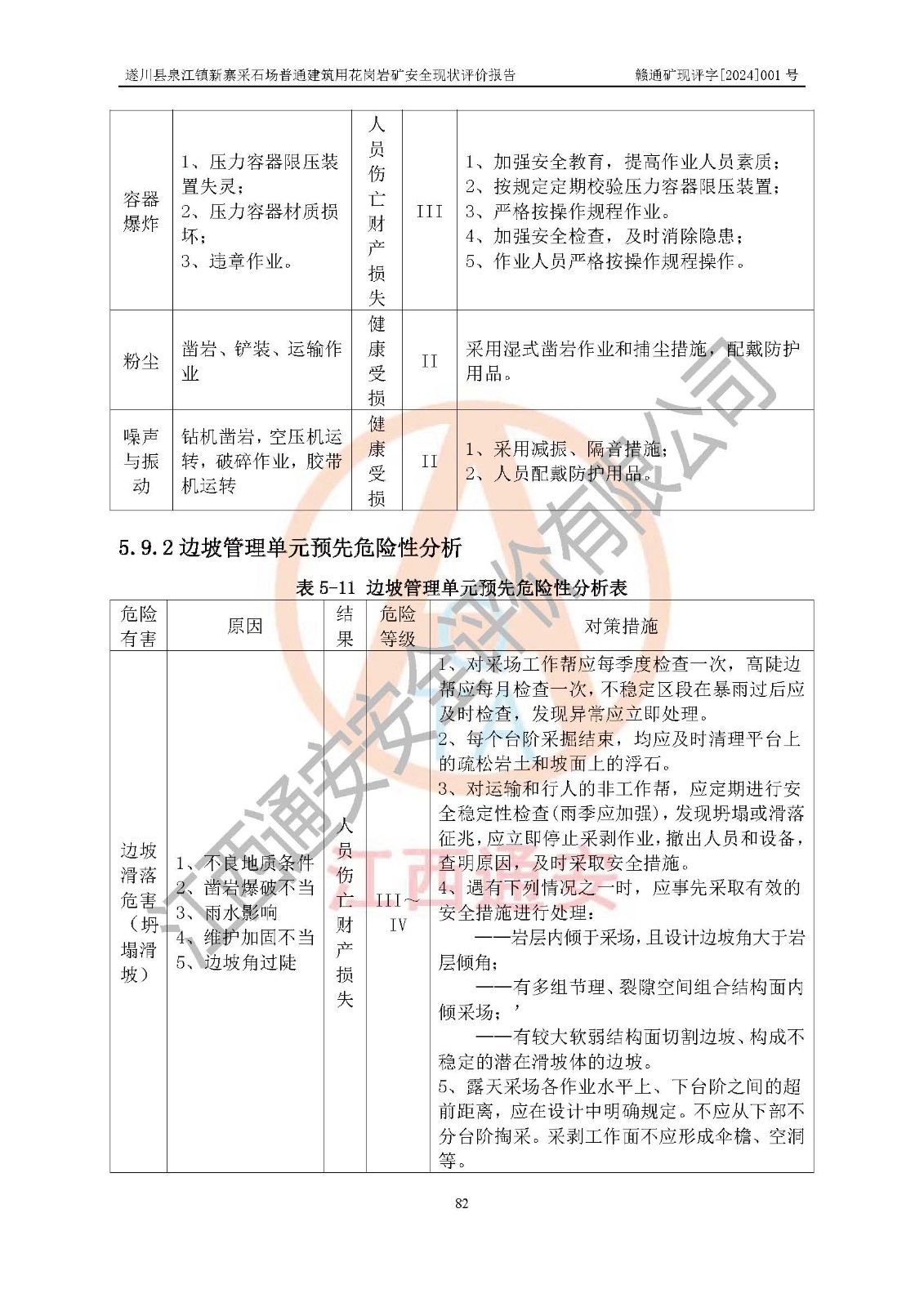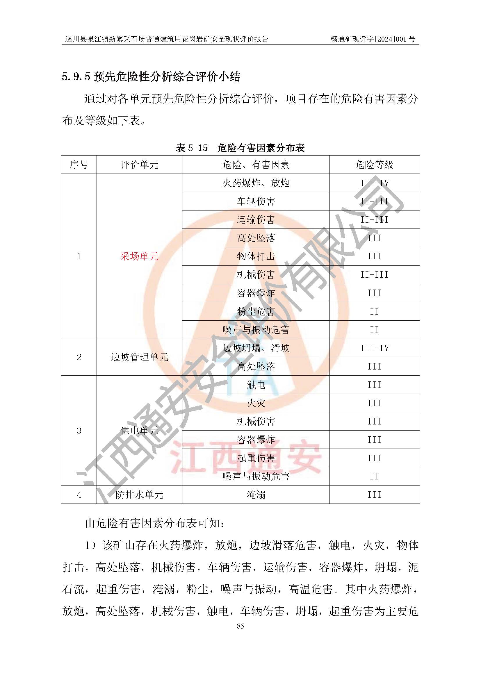 其它 | 1、该评价项目中存在的主要危险因素:火药爆炸,放炮,边坡滑落危害,触电,火灾,物体打击,高处坠落,机械伤害,**伤害,运输伤害,容器爆炸,坍塌,泥石流,起重伤害,淹溺,粉尘,噪声与振动,高温危害。其中火药爆炸,放炮,高处坠落,机械伤害,触电,**伤害,坍塌,起重伤害为主要危险有害因素。 2、该评价项目中存在的有害因素包括:粉尘、噪声与振动、不良作业环境,如高温、雷击对矿山人员的伤害和其他不利的环境因素等。 3、该露天矿山为非金属露天矿山,无瓦斯和自燃发火危险,矿区范围内及周边无较大水系,矿区水文地质条件Ⅲ类复杂类型,该露天矿山采用山坡露天对建筑用花岗岩进行开采,使用民用爆破器材,爆破由江西省高端爆破工程有限公司一体化服务;不使用有毒有害危险化学品药剂。综合上述分析,本评价项目不构成重大危险源。 上述主要危险、有害因素在采取本报告第六章中提出的安全对策措施后,能得到**控制。该项目从安全生产角度符合**有关安全生产法律、法规、规章和技术标准的要求。 | ||||