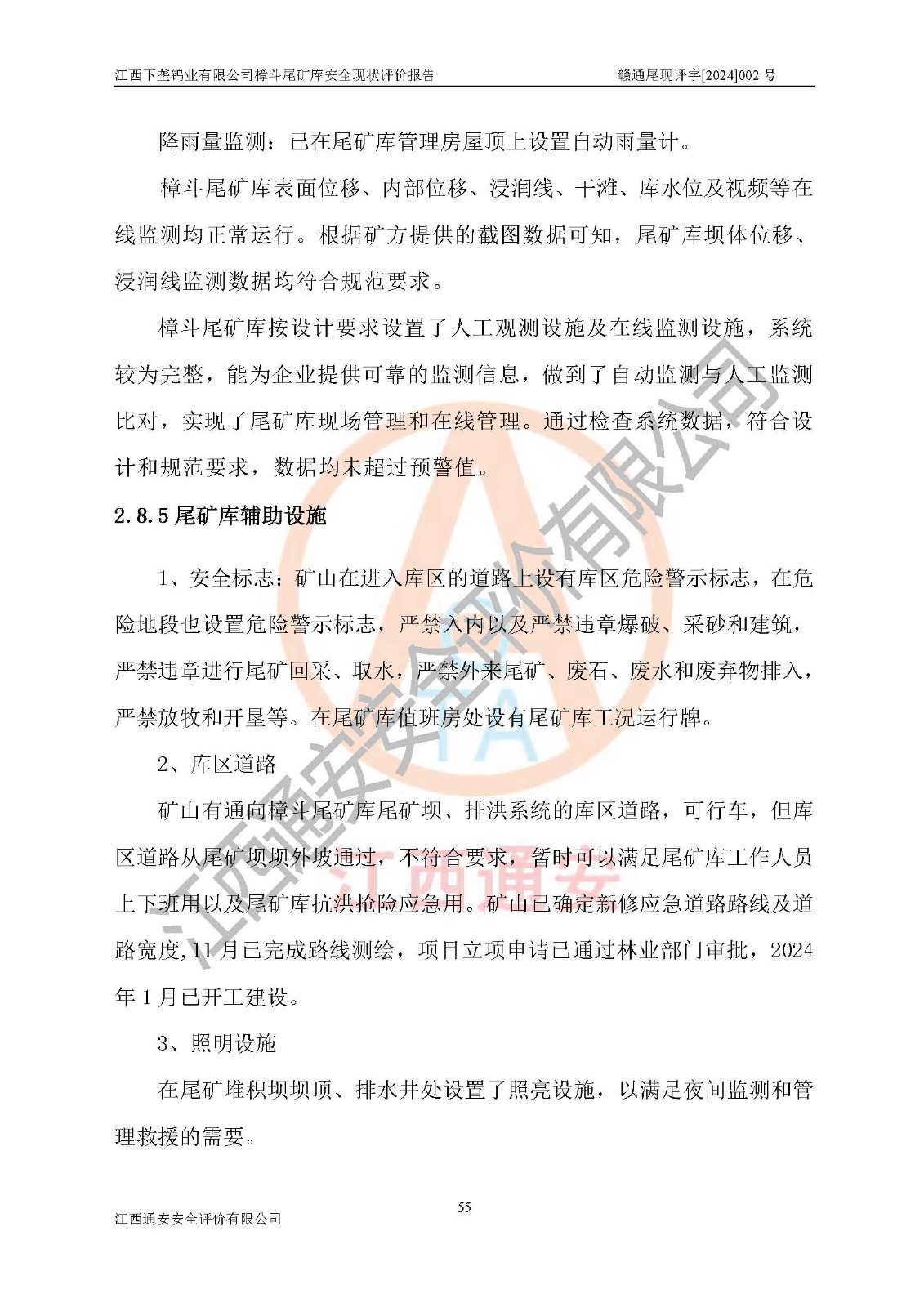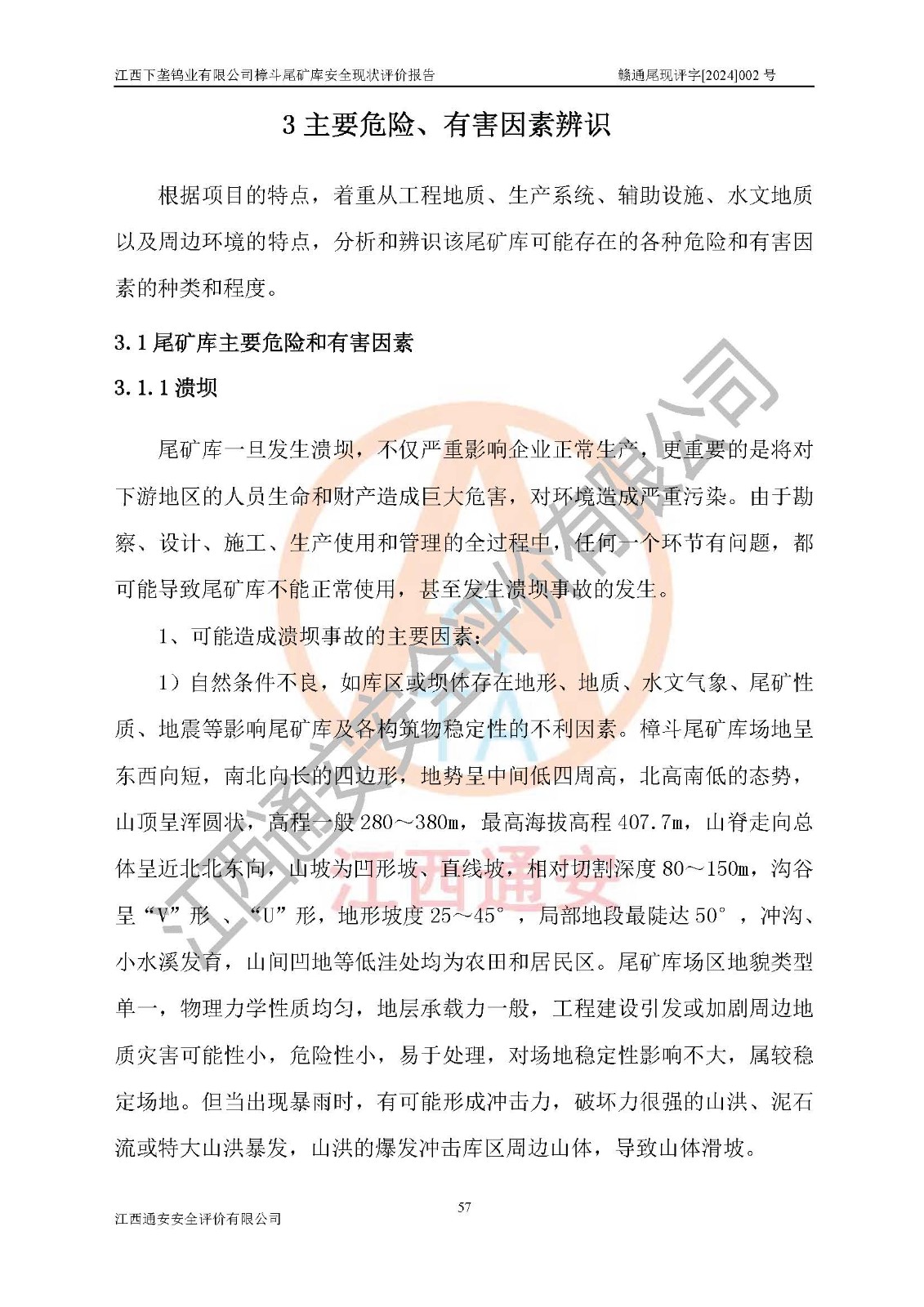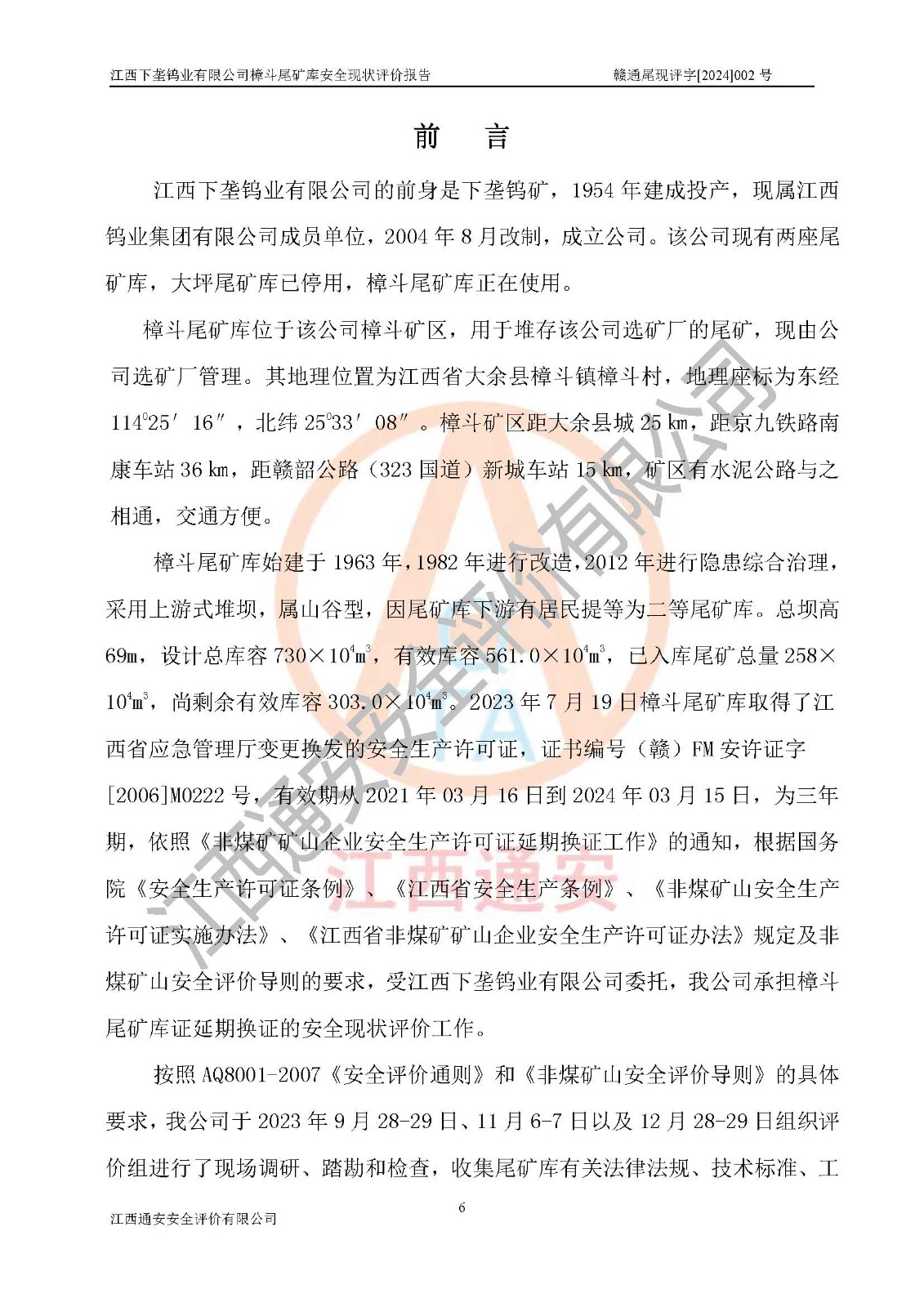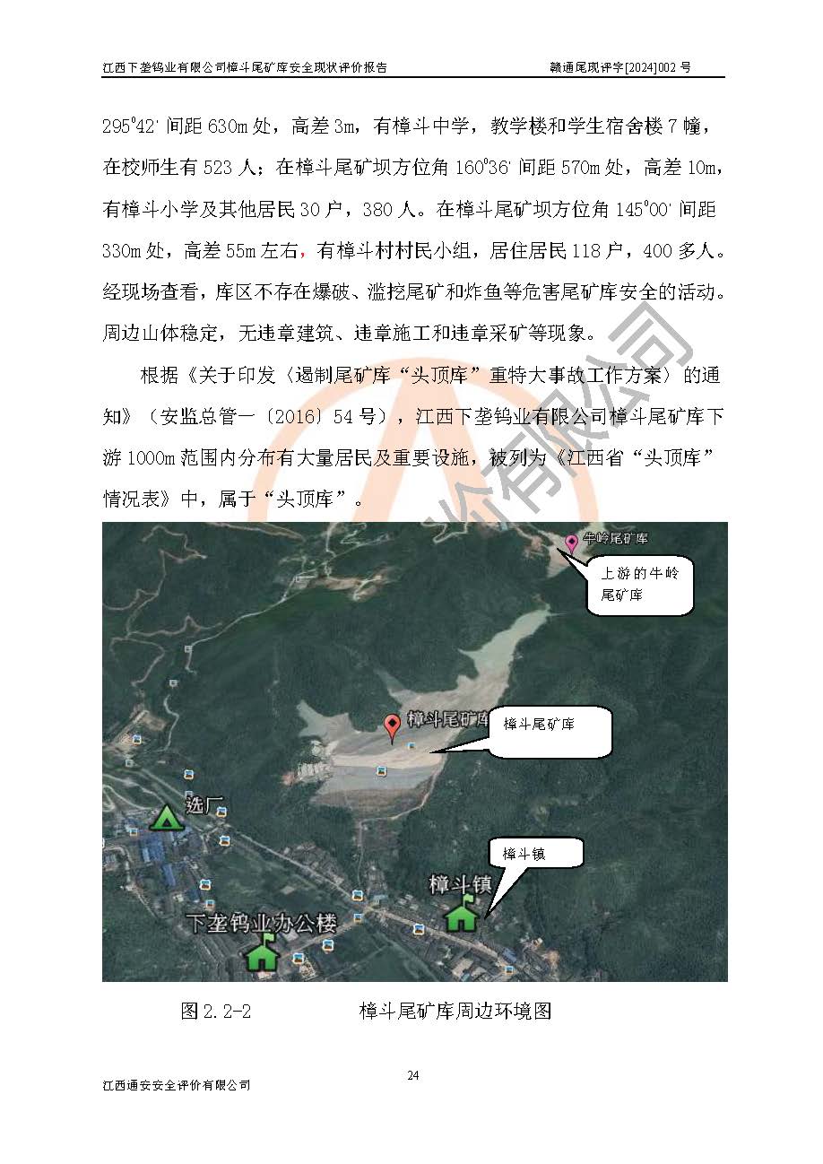 项目简介 | 江西下垄钨业有限公司的前身是下垄钨矿,1954年建成投产,现属江西钨业集团有限公司成员单位,2004年8月改制,成立公司。该公司现有两座尾矿库,大坪尾矿库已停用,樟斗尾矿库正在使用。 樟斗尾矿库位于该公司樟斗矿区,用于堆存该公司选矿厂的尾矿,现由公司选矿厂管理。其地理位置为江西省大余县樟斗镇樟斗村,地理座标为东经114025′16″,北纬25033′08″。樟斗矿区距大余县城25㎞,距京九铁路南康车站36㎞,距赣韶公路(323国道)新城车站15㎞,矿区有水泥公路与之相通,交通方便。 樟斗尾矿库始建于1963年,1982年进行改造,2012年进行隐患综合治理,采用上游式堆坝,属山谷型,因尾矿库下游有居民提等为二等尾矿库。总坝高69m,设计总库容730×104m3,**库容561.0×104m3,已入库尾矿总量258×104m3,尚剩余**库容303.0×104m3。2023年7月19日樟斗尾矿库取得了江西省应急管理厅变更换发的安全生产许可证,证书编号(赣)FM安许证字[2006]M0222号,**期从2021年03月16日到2024年03月15日,为三年期,依照《非煤矿矿山企业安全生产许可证延期换证工作》的通知,根据***《安全生产许可证条例》、《江西省安全生产条例》、《非煤矿山安全生产许可证实施办法》、《江西省非煤矿矿山企业安全生产许可证办法》规定及非煤矿山安全评价导则的要求,受江西下垄钨业有限公司委托,我公司承担樟斗尾矿库证延期换证的安全现状评价工作。 | |||