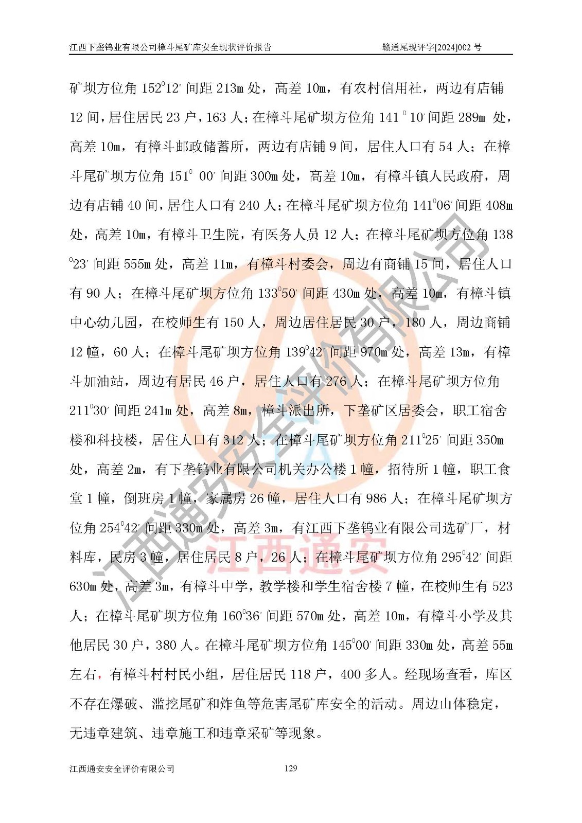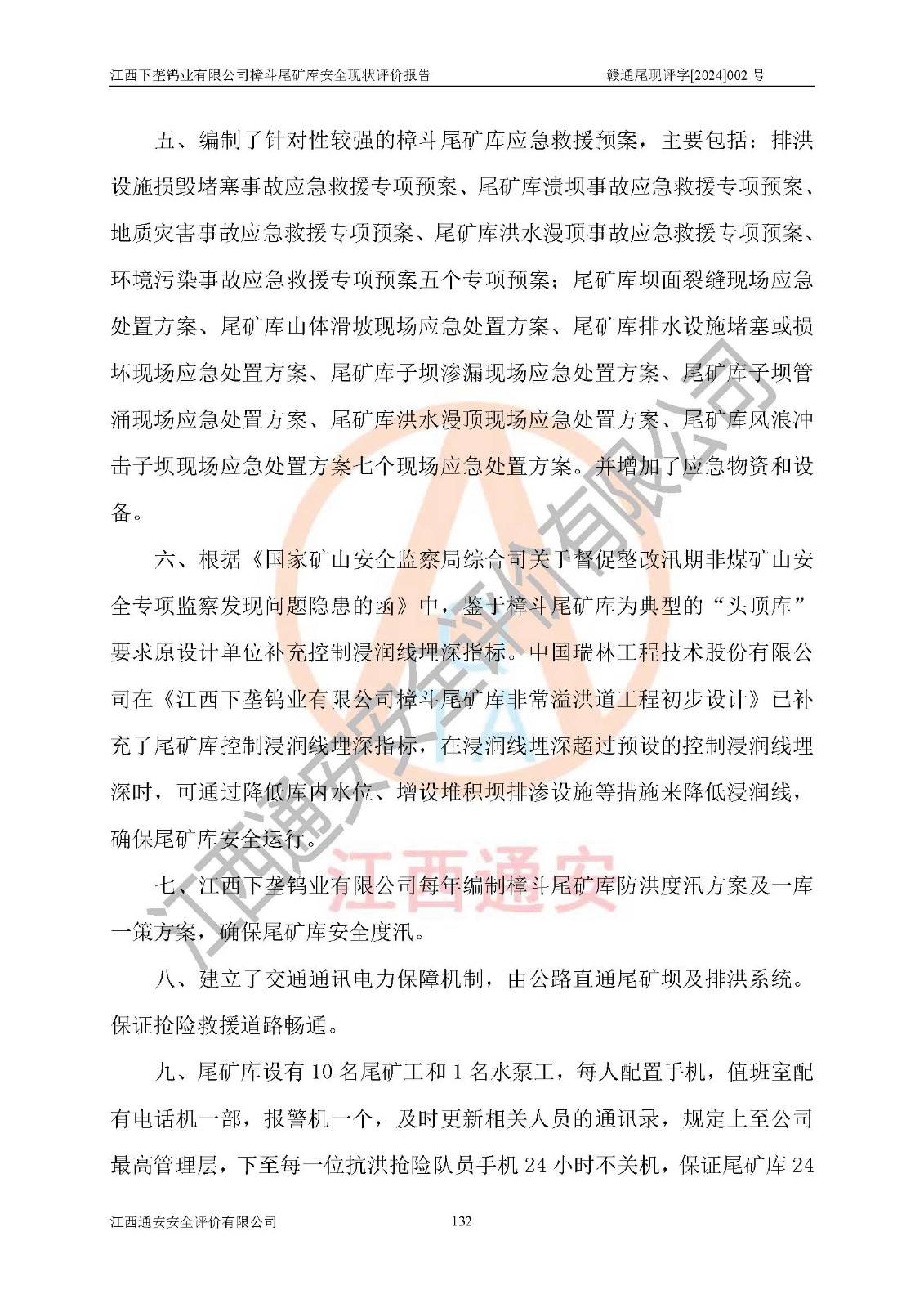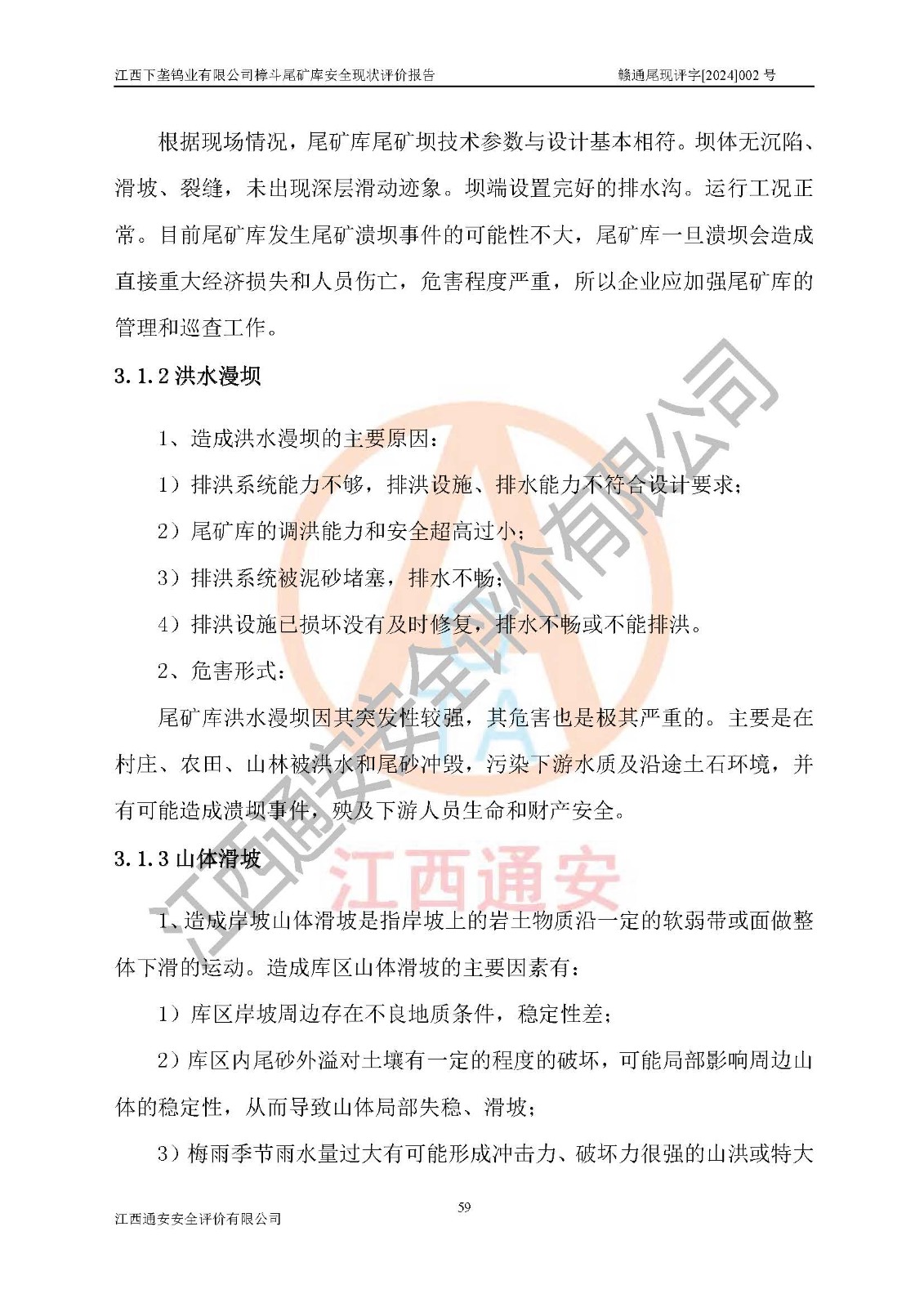 项目简介 | 江西下垄钨业有限公司的前身是下垄钨矿,1954年建成投产,现属江西钨业集团有限公司成员单位,2004年8月改制,成立公司。该公司现有两座尾矿库,大坪尾矿库已停用,樟斗尾矿库正在使用。 樟斗尾矿库位于该公司樟斗矿区,用于堆存该公司选矿厂的尾矿,现由公司选矿厂管理。其地理位置为江西省大余县樟斗镇樟斗村,地理座标为东经114025′16″,北纬25033′08″。樟斗矿区距大余县城25㎞,距京九铁路南康车站36㎞,距赣韶公路(323国道)新城车站15㎞,矿区有水泥公路与之相通,交通方便。 樟斗尾矿库始建于1963年,1982年进行改造,2012年进行隐患综合治理,采用上游式堆坝,属山谷型,因尾矿库下游有居民提等为二等尾矿库。总坝高69m,设计总库容730×104m3,**库容561.0×104m3,已入库尾矿总量258×104m3,尚剩余**库容303.0×104m3。2023年7月19日樟斗尾矿库取得了江西省应急管理厅变更换发的安全生产许可证,证书编号(赣)FM安许证字[2006]M0222号,**期从2021年03月16日到2024年03月15日,为三年期,依照《非煤矿矿山企业安全生产许可证延期换证工作》的通知,根据***《安全生产许可证条例》、《江西省安全生产条例》、《非煤矿山安全生产许可证实施办法》、《江西省非煤矿矿山企业安全生产许可证办法》规定及非煤矿山安全评价导则的要求,受江西下垄钨业有限公司委托,我公司承担樟斗尾矿库证延期换证的安全现状评价工作。 | |||
