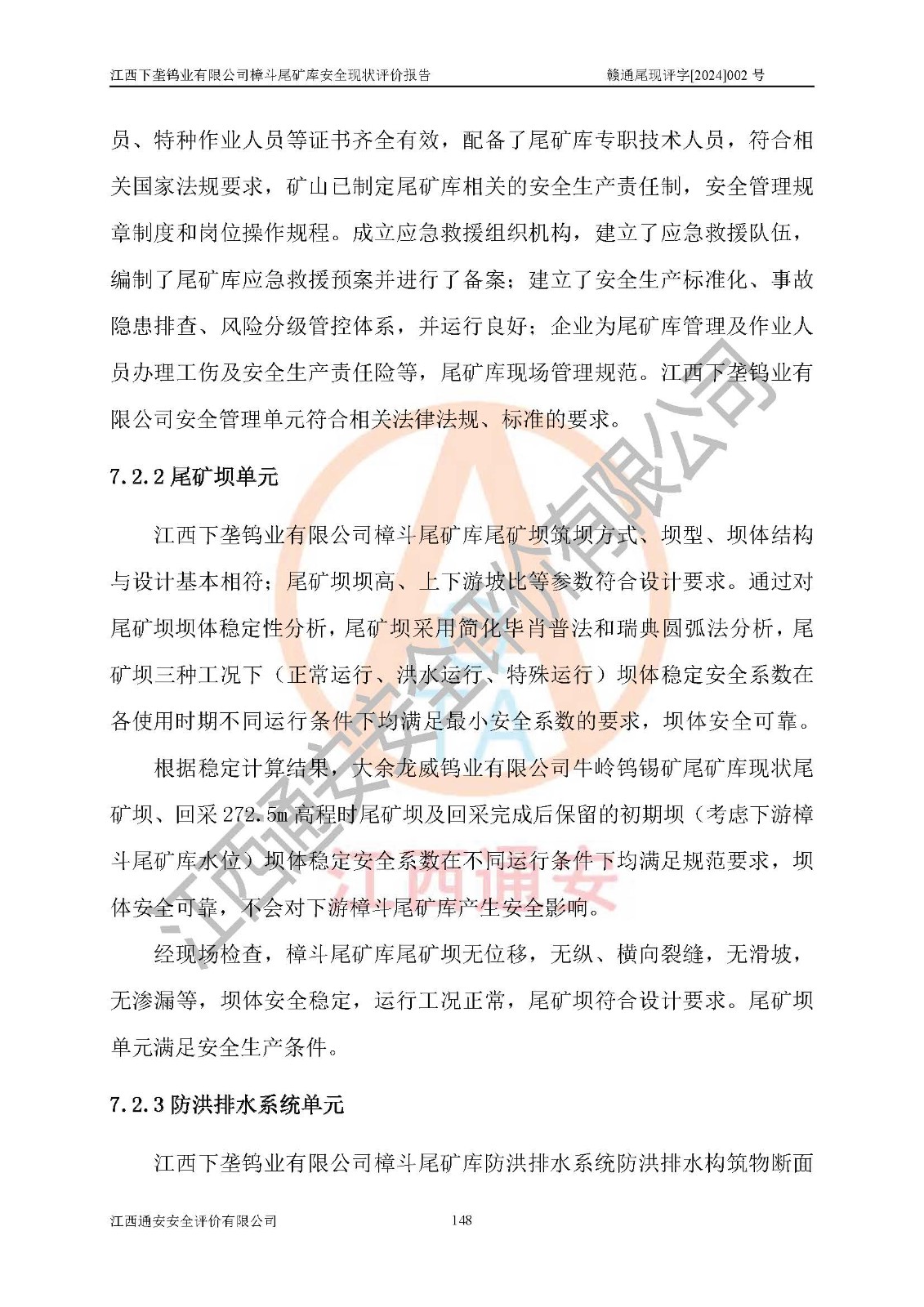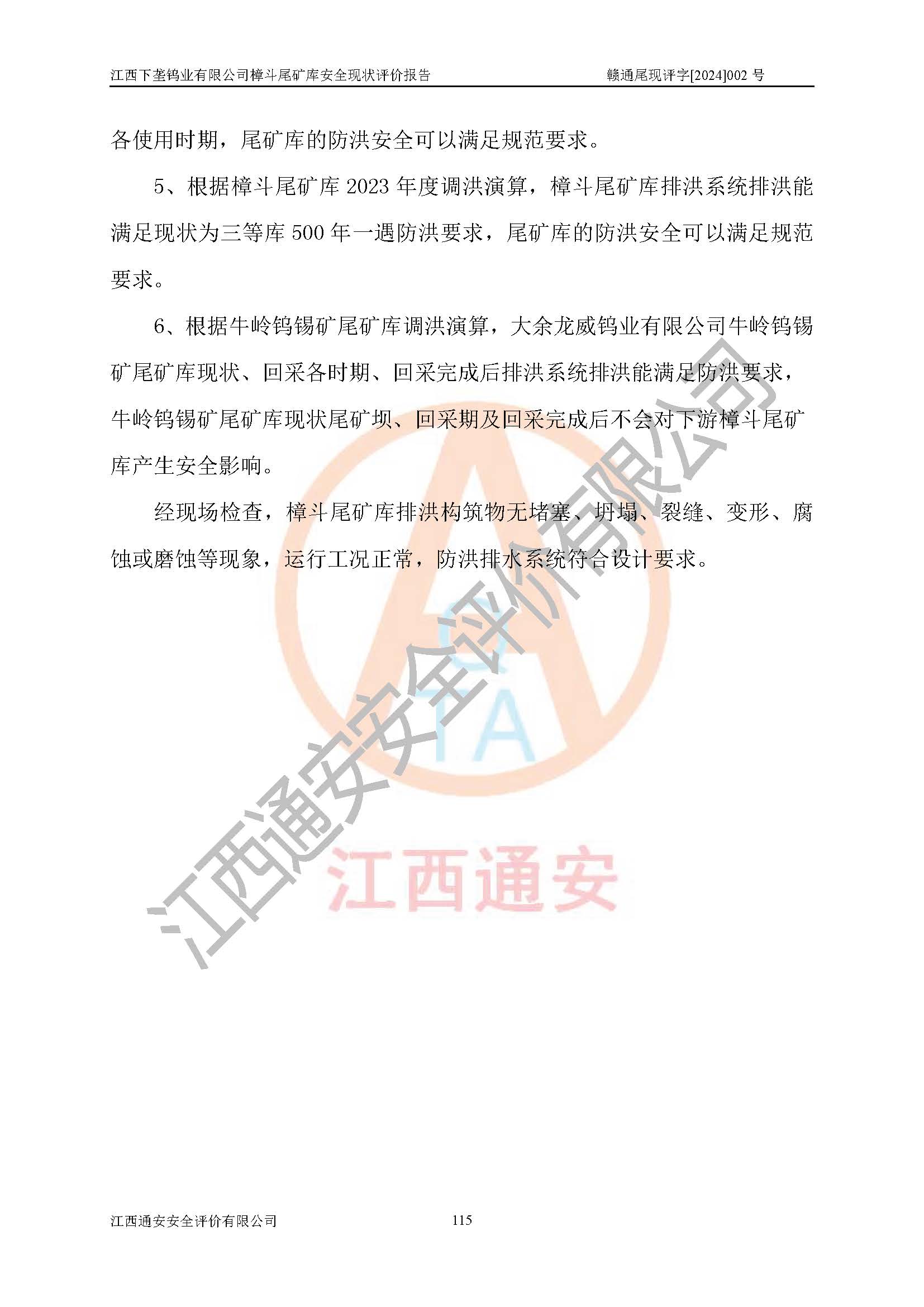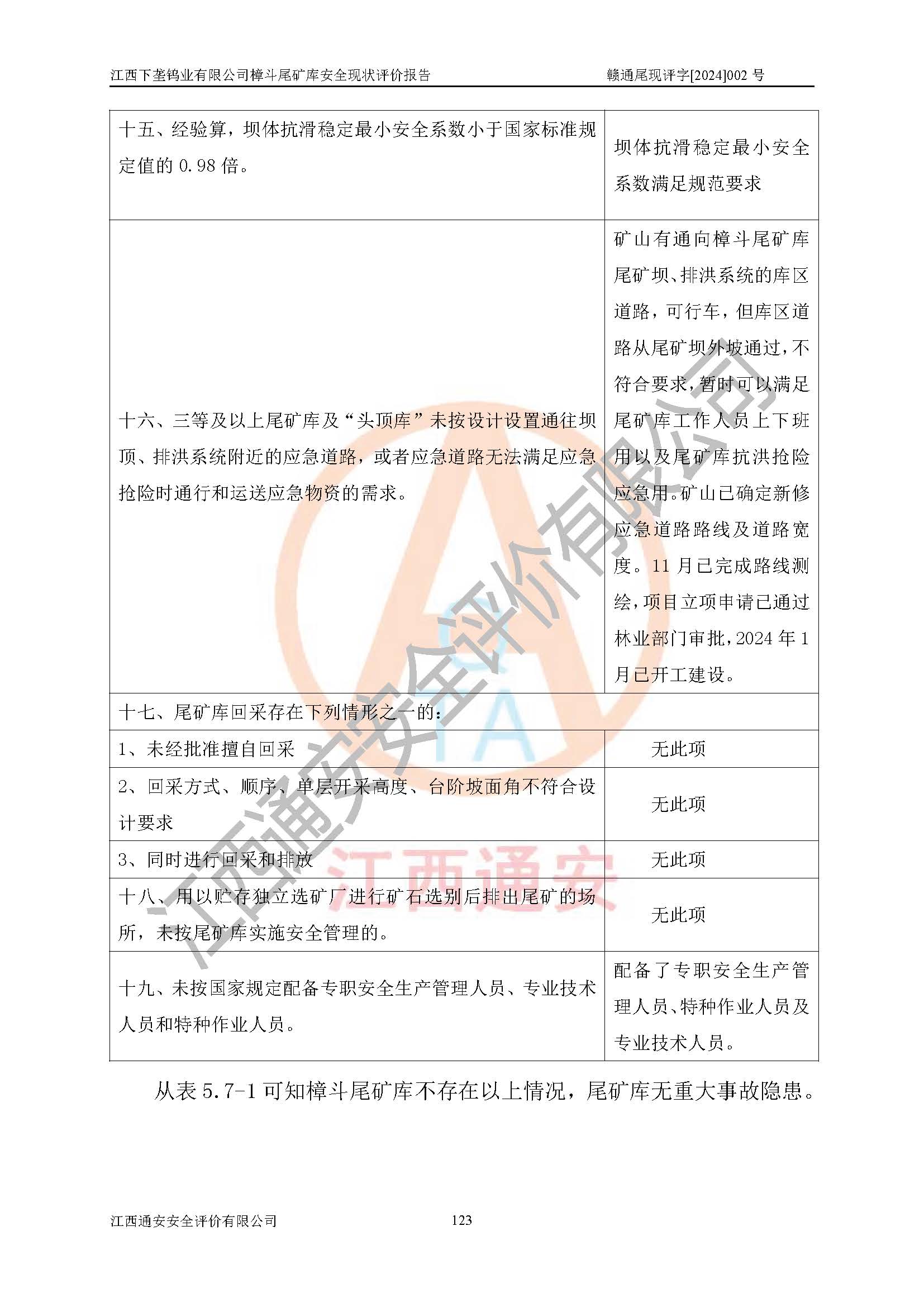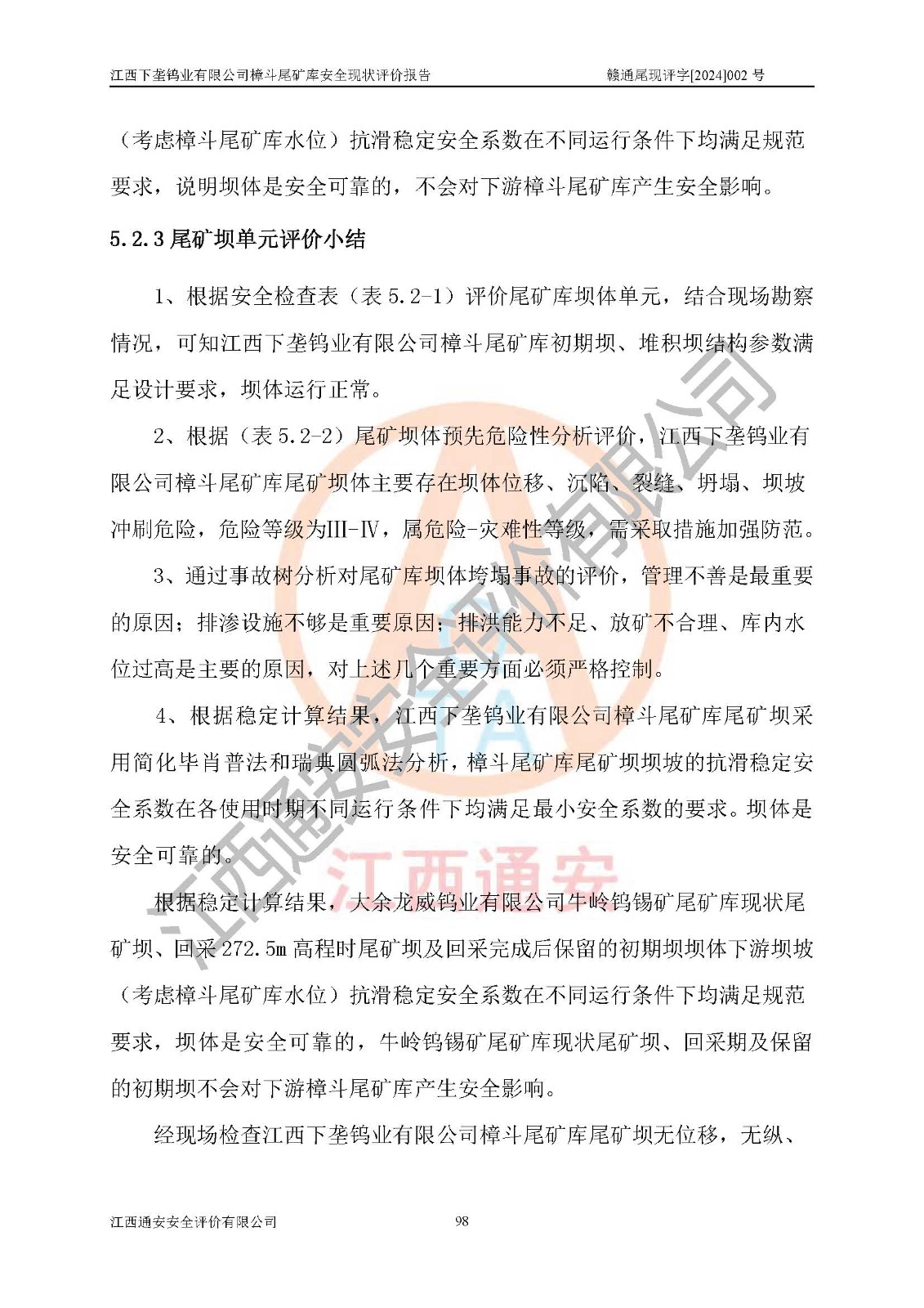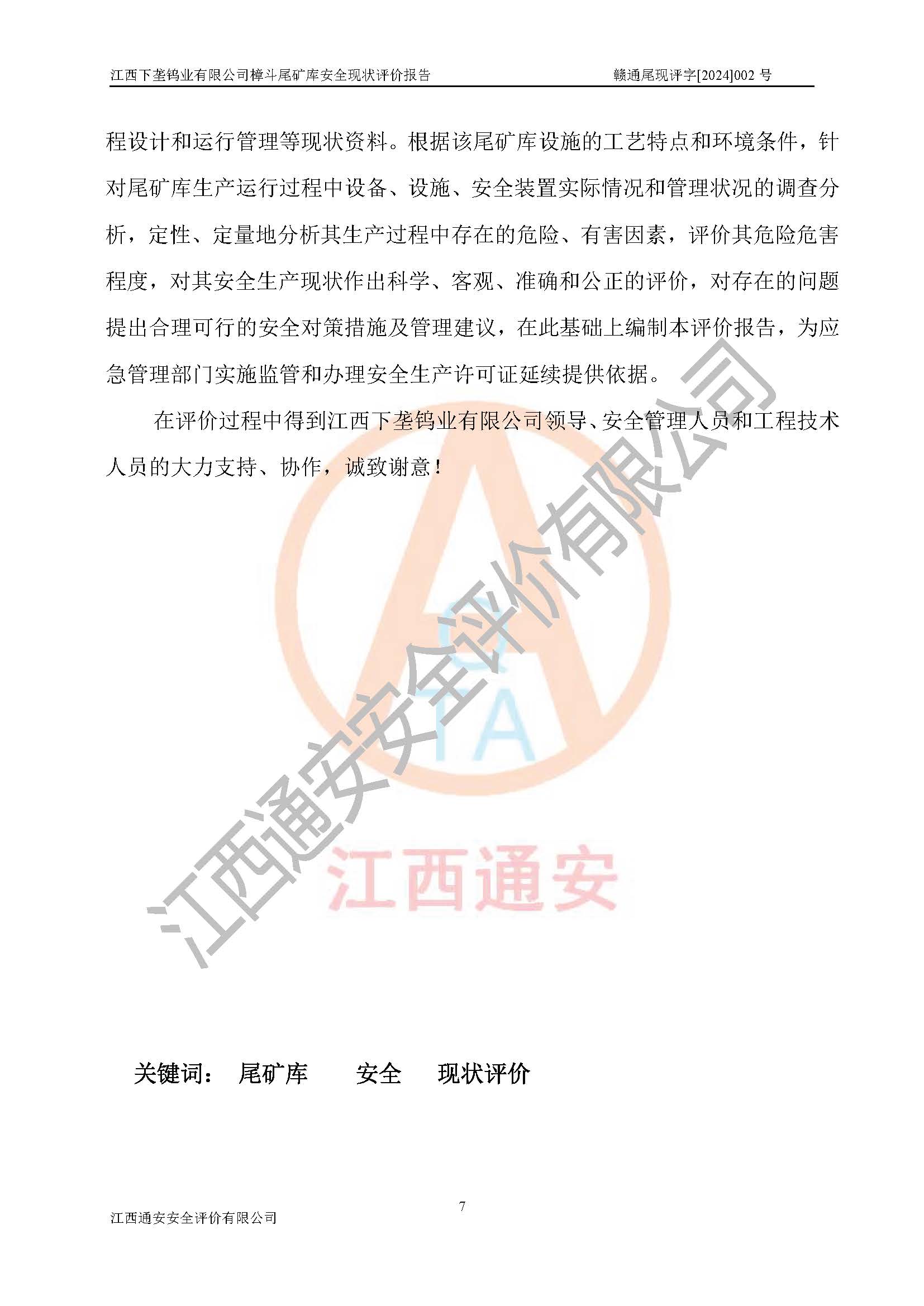 评价结论 | 江西下垄钨业有限公司樟斗尾矿库安全生产条件较好,为正常库,具备继续生产运行的安全生产条件。 | |||