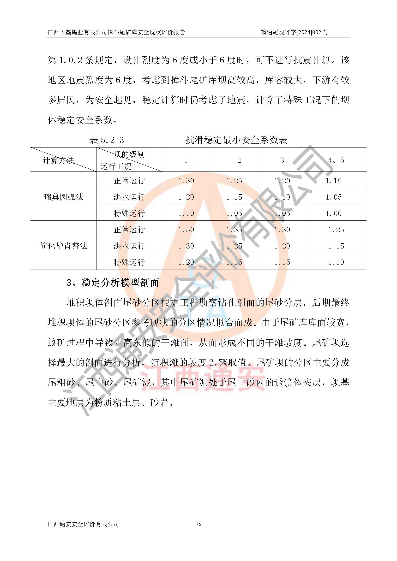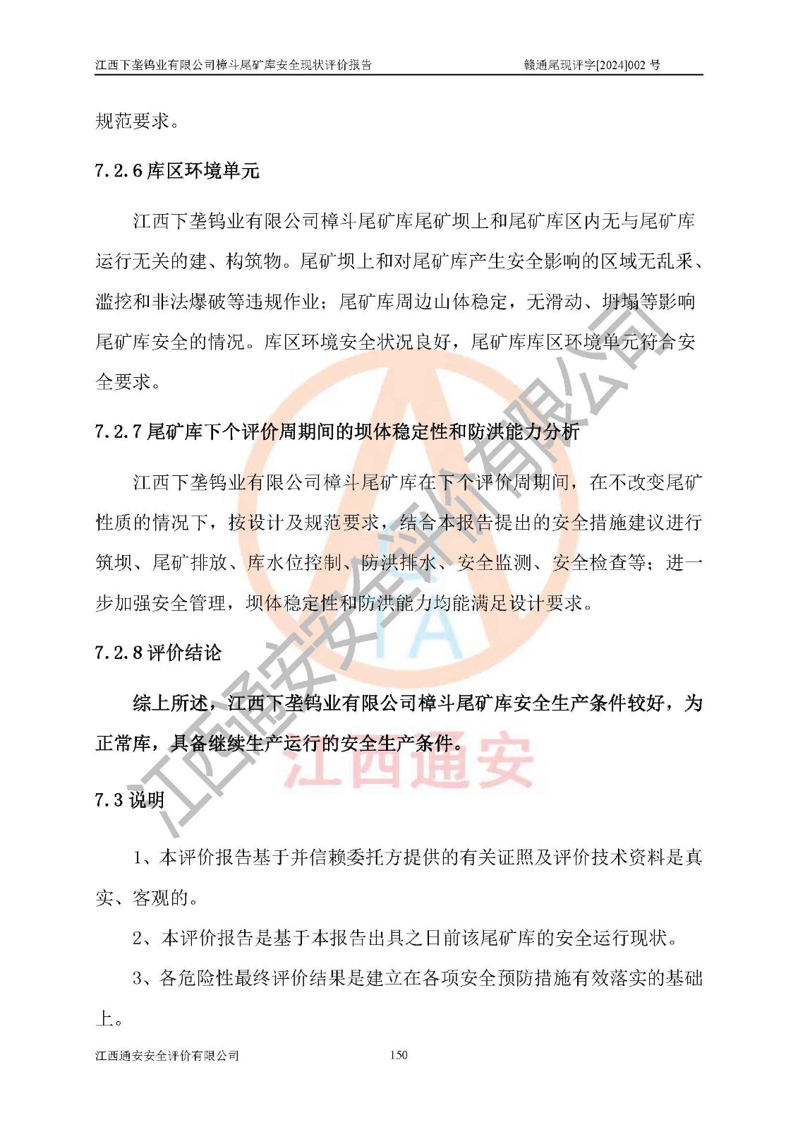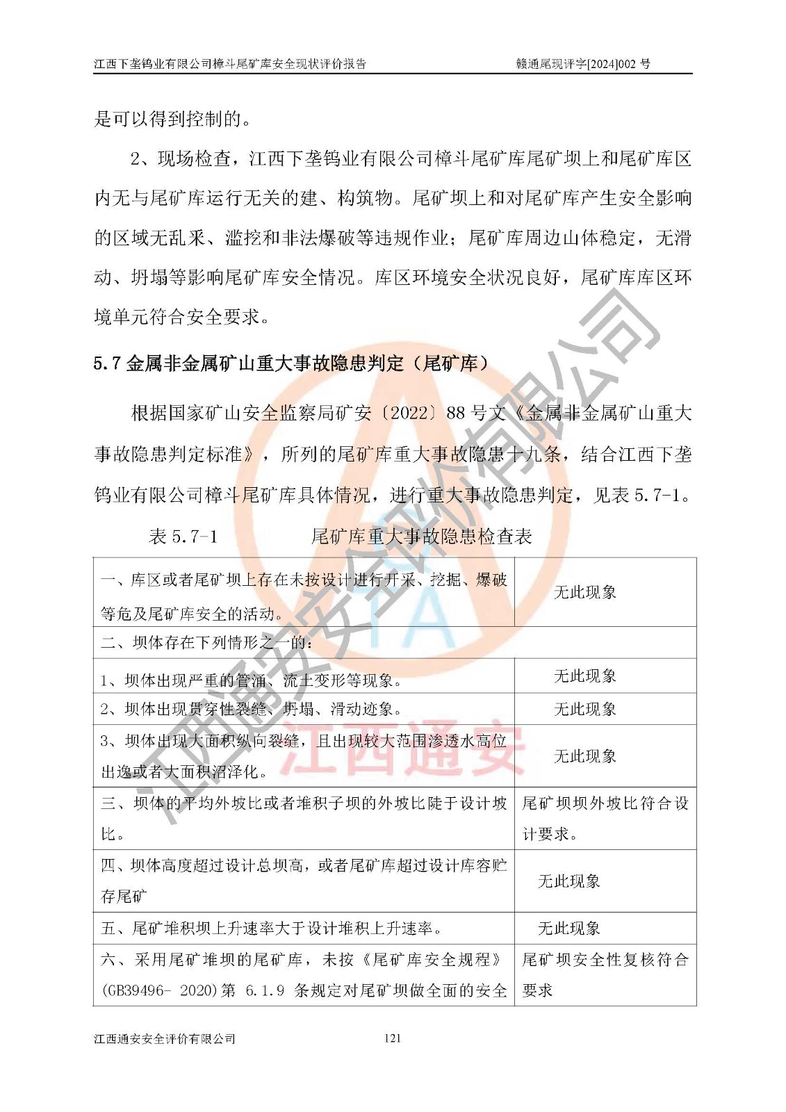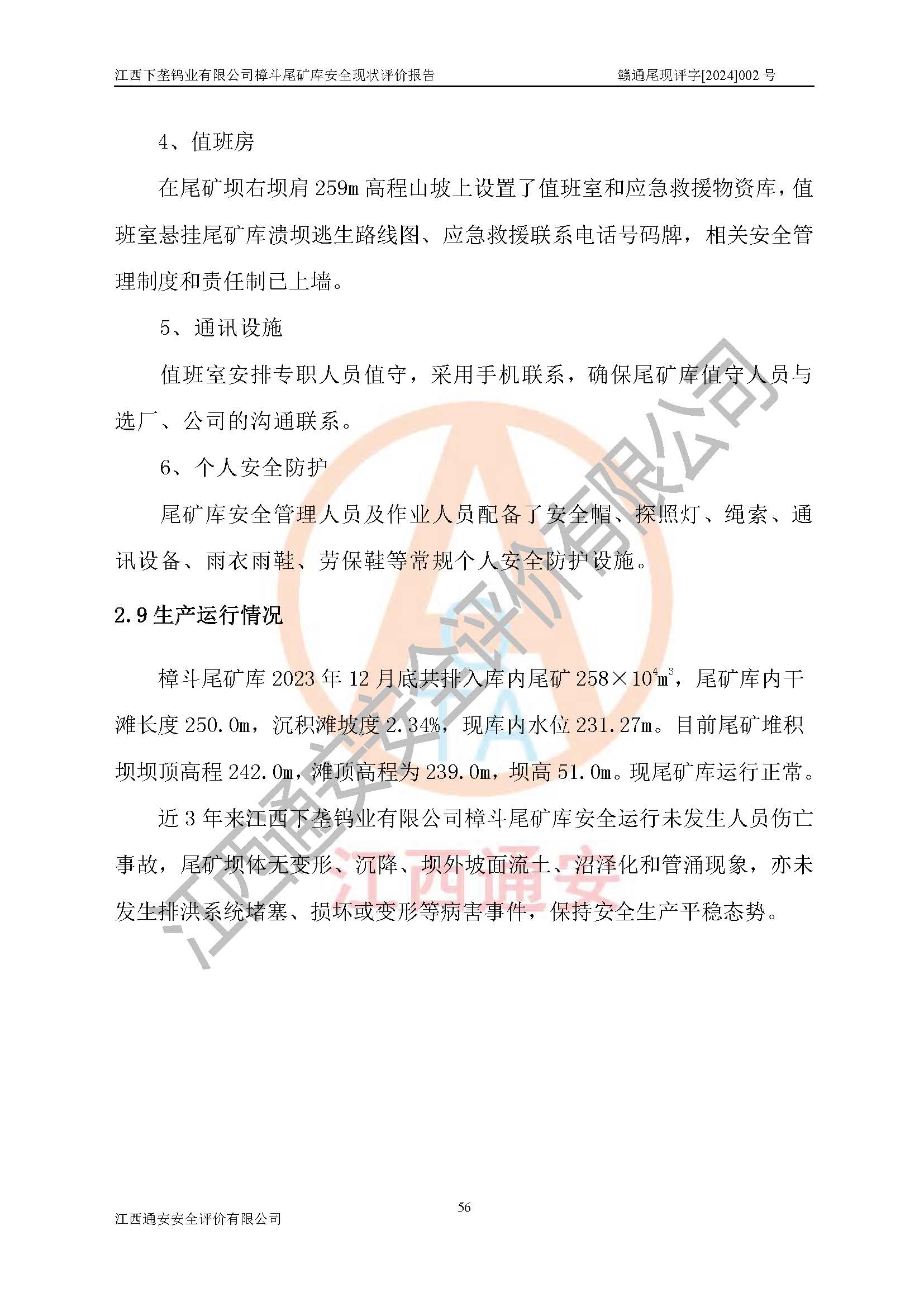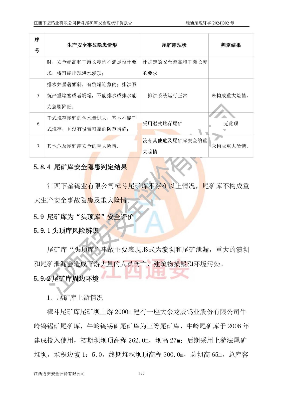 评价结论 | 江西下垄钨业有限公司樟斗尾矿库安全生产条件较好,为正常库,具备继续生产运行的安全生产条件。 | |||