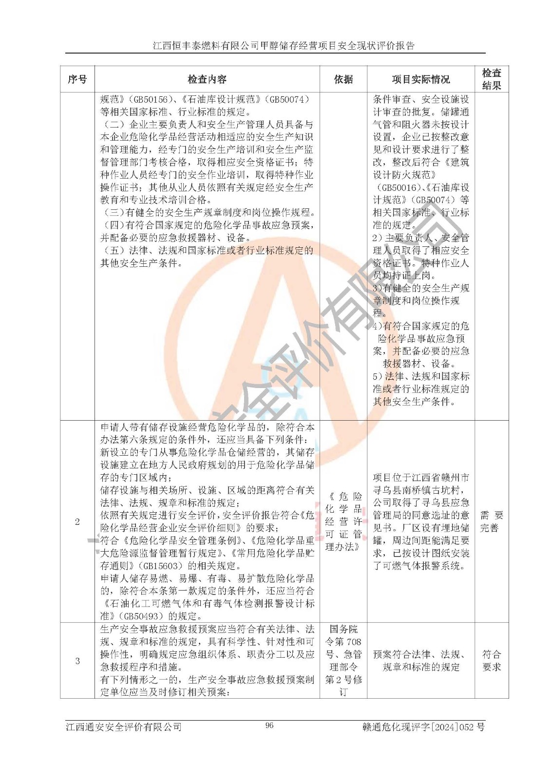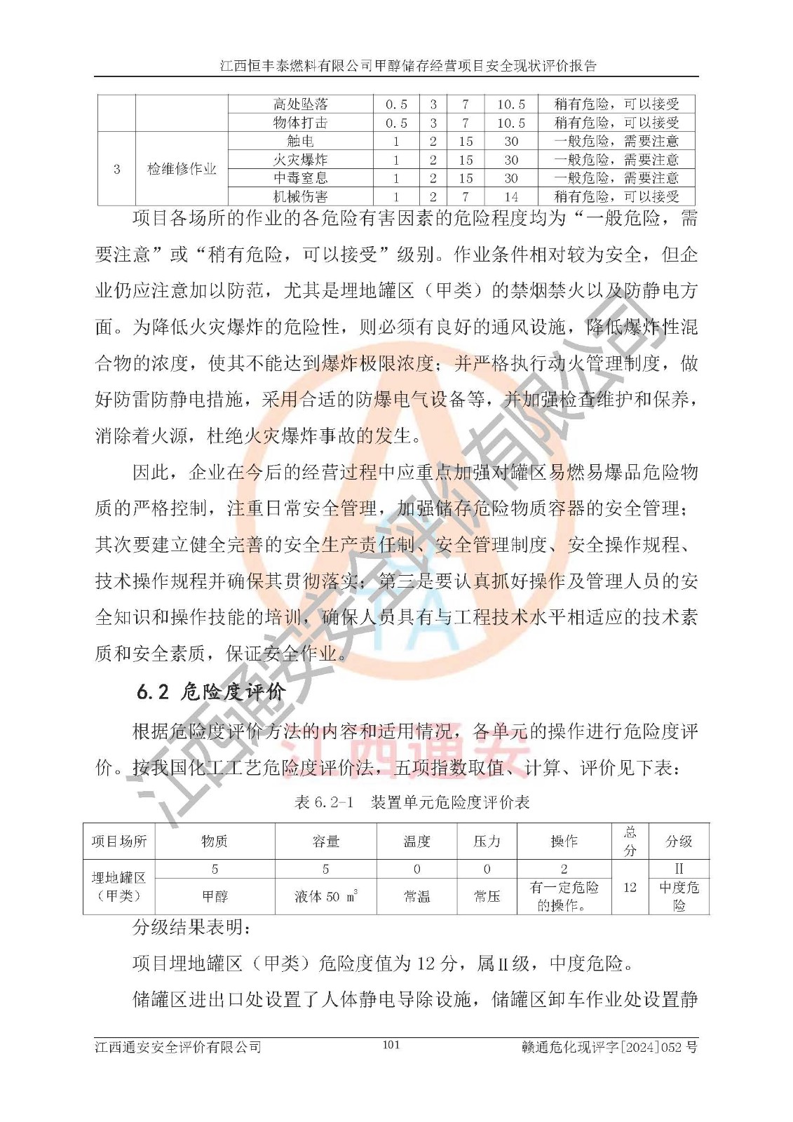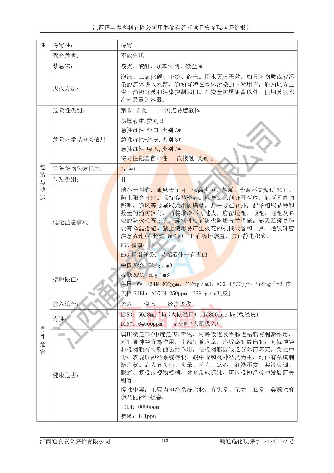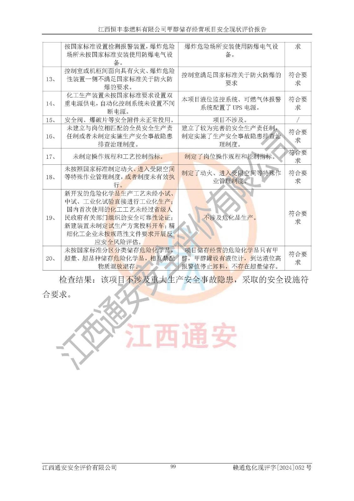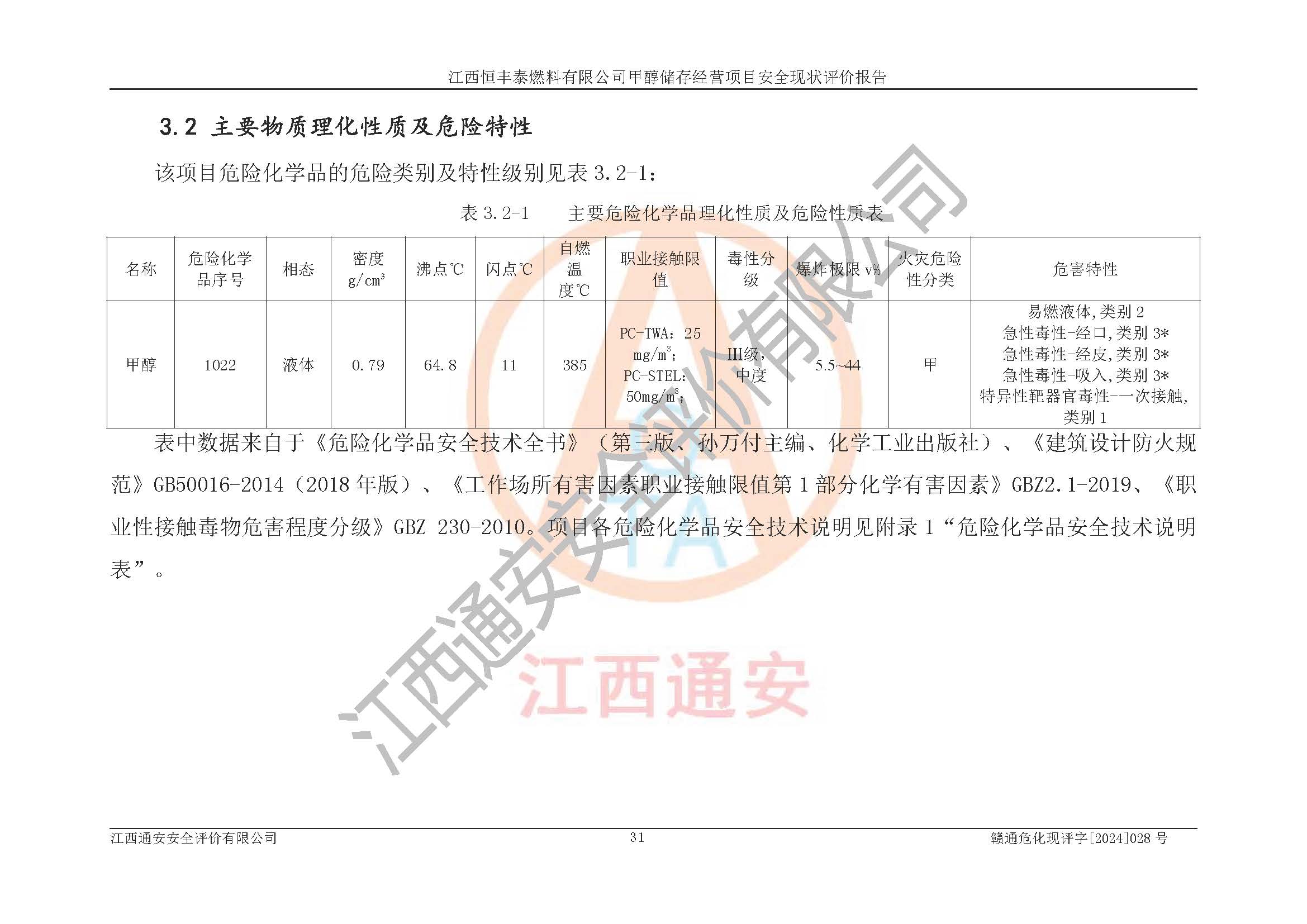 一、安全状况综合评述 通过对江西恒丰泰燃料有限公司甲醇储存经营项目的危险、有害因素辨识和定性、定量评价结果如下∶ 1、主要危险、危害因素辨识结果 项目在生产过程中存在的主要危险有:火灾爆炸、中毒窒息、触电、机械伤害、高处坠落、物体打击、**伤害、淹溺、灼烫等,存在的主要危害因素有:化学因素、物理因素(噪声、高温等)等,同时存在人为失误和管理缺陷。应重点防范的主要危险为火灾与爆炸。 2、危险化学品辨识结果 经辨识,该项目涉及的甲醇属于危险化学品,甲醇属于重点监管的危险化学品和特别管控危险化学品,项目不涉及监控化学品、易制毒化学品、易制爆危险化学品、剧毒化学品和高毒物品等危险化学品。 3、危险化学品重大危险源辨识结果 根据《危险化学品重大危险源辨识》(GB18218-2018)辨识,江西恒丰泰燃料有限公司甲醇储存经营项目不构成危险化学品重大危险源。 4、重点监管危险化工工艺辨识结果 根据《**安全监管总局关于公布首批重点监管的危险化学品名录的通知》安监总管三[2011] 95号、《**安全监管总局关于公布第二批重点监管危险化学品名录的通知》安监总管三[2013] 12号进行辨识,本项目不涉及重点监管的危险化工工艺。 5、作业条件危险性分析结果: 甲醇罐区卸车作业、装桶作业、检维修作业等单元危险程度均为“一般危险,需要注意”或“稍有危险,可以接受”级别。作业条件相对安全。 6、危险度评价结果: 甲醇储罐区属中度危险。 7、采用检查表评价法对项目外部安全条件、总图运输、危险化学品储运设施、采取的防火防爆措施、常规安全防护设施、“两重点一重大”安全措施及安全管理进行定性评价,评价结果如下: (1)该项目选址符合城乡总体规划和安全要求,甲醇经营和储存场所与库外建构筑物的距离符合有关标准、规范的要求。外部安全距离内无GB36894-2018中第3.1条所列的防护目标。 (2)总图布置分区明确,布局合理,满足规范要求。 (3)该项目无**明令淘汰的工艺,设备、设施与工艺条件、内部介质相适应,储罐的附件经整改后符合安全设施设计和规范的要求。 (4)该项目消防安全设施设置符合规范要求。 (5)该项目电气安全设施能满足安全要求,按要求设置了防雷接地设施,并经检测合格。防火防爆设施、液位监测措施、甲醇防泄漏设施、电气防爆措施等安全防护设施符合**法律法规、标准规范的要求。 (6)该项目公用工程能够满足安全经营的基本需要,符合安全经营的条件。 (7)该项目不涉及重大生产安全事故隐患,安全生产条件符合要求。 (8)公司成立了安全生产**小组,配备了安全管理人员,制定了安全管理制度、操作规程和事故应急预案,公司的安全管理机构工作有力,安全经营管理处于正常有序开展范围。 四、评价结论 江西恒丰泰燃料有限公司甲醇储存经营项目的安全设施及安全管理符合法律、法规、标准的要求,安全风险是受控制的,其风险程度是可以接受的,满足项目危险化学品储存和经营的安全条件。 |