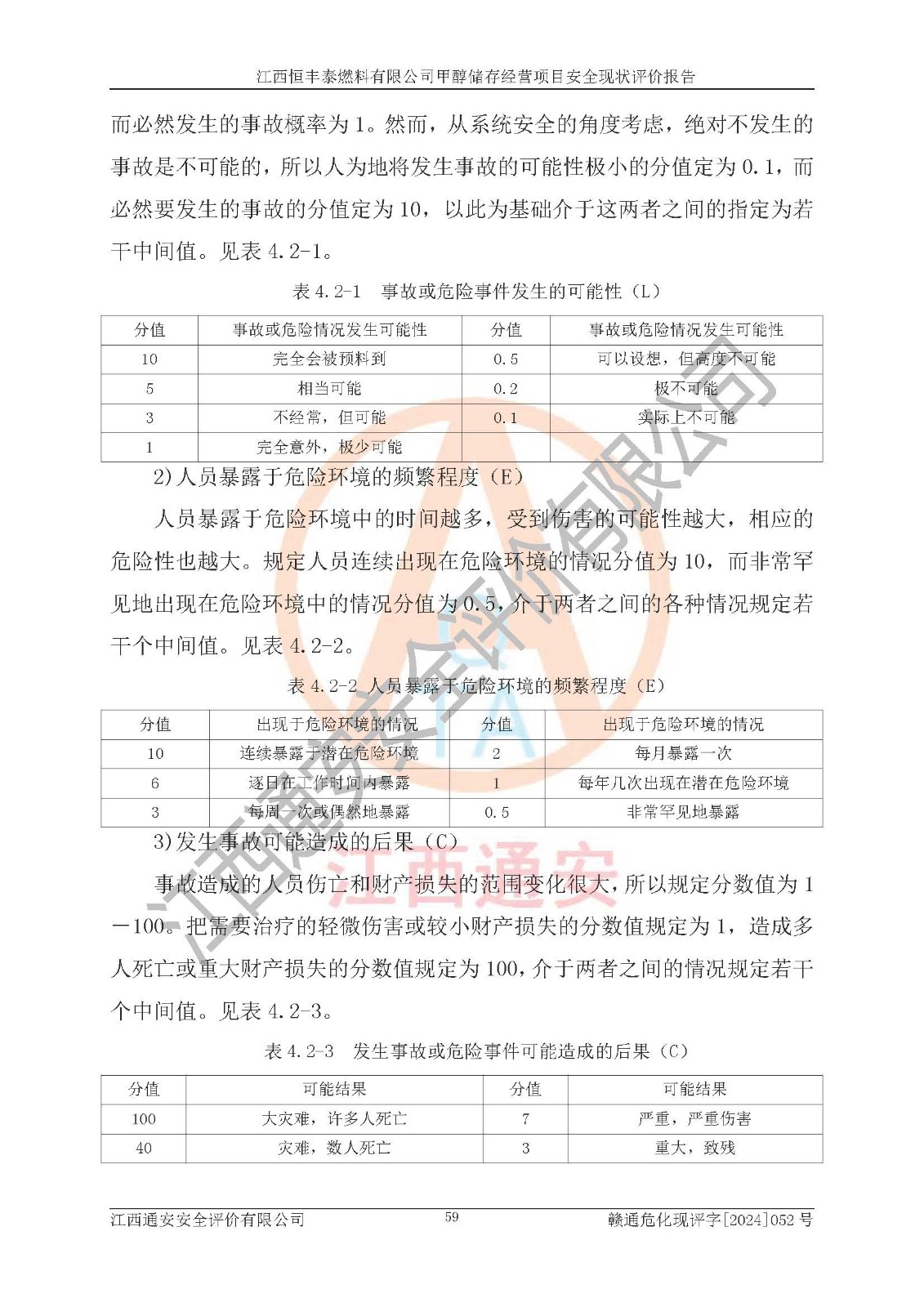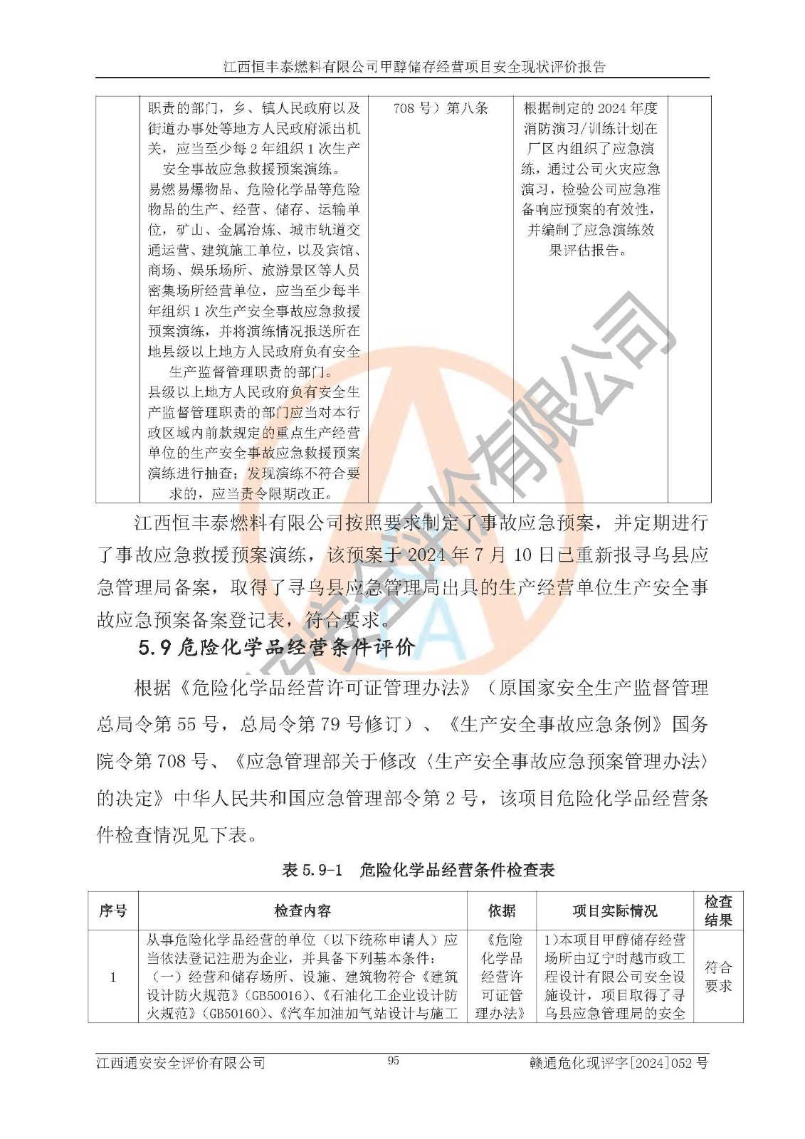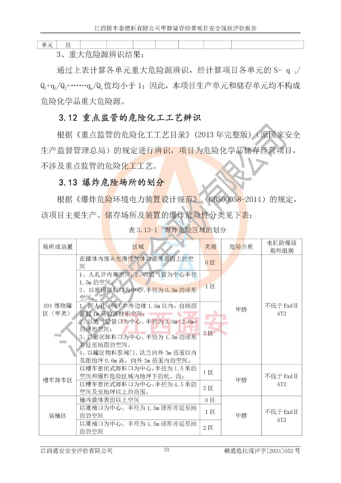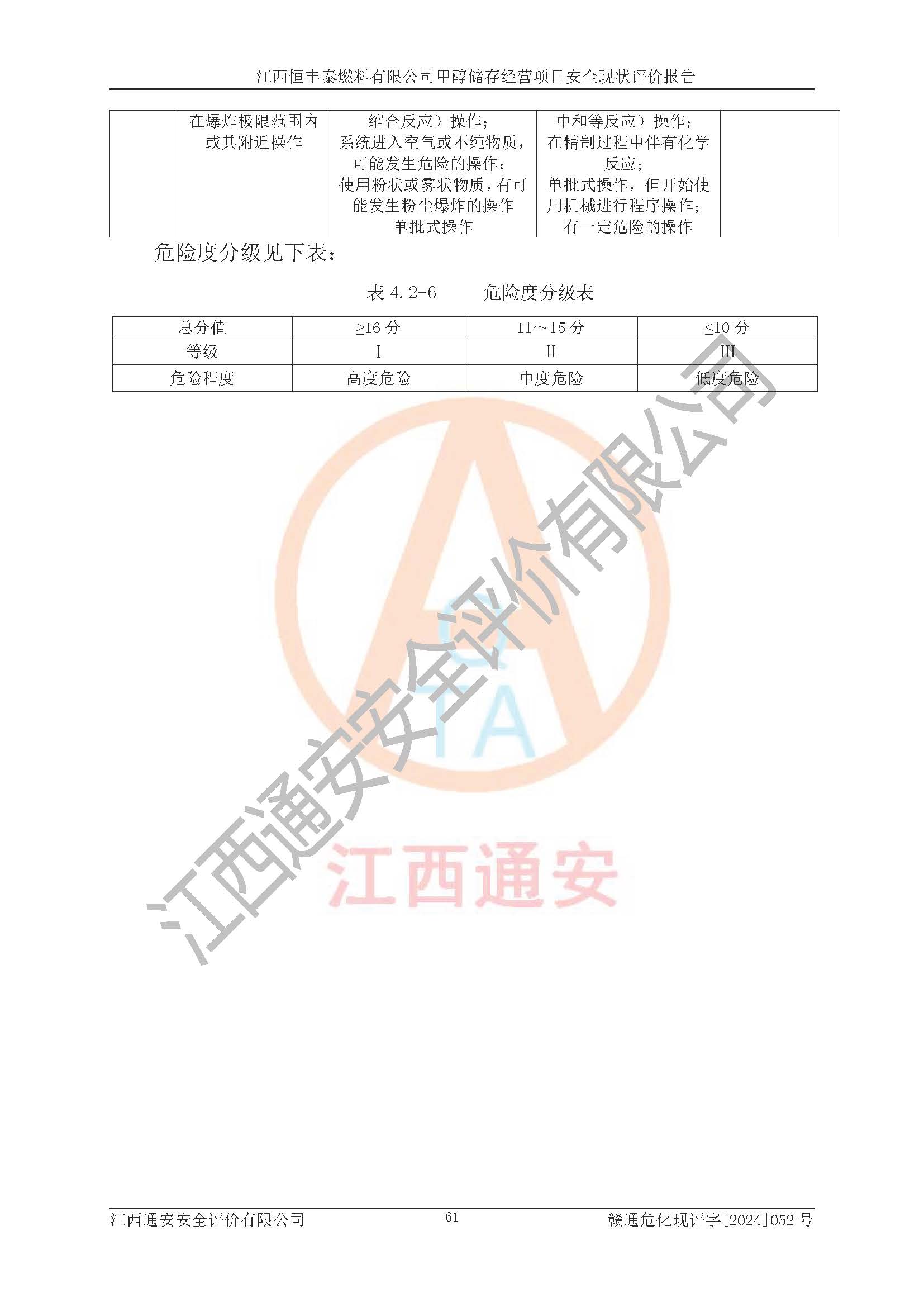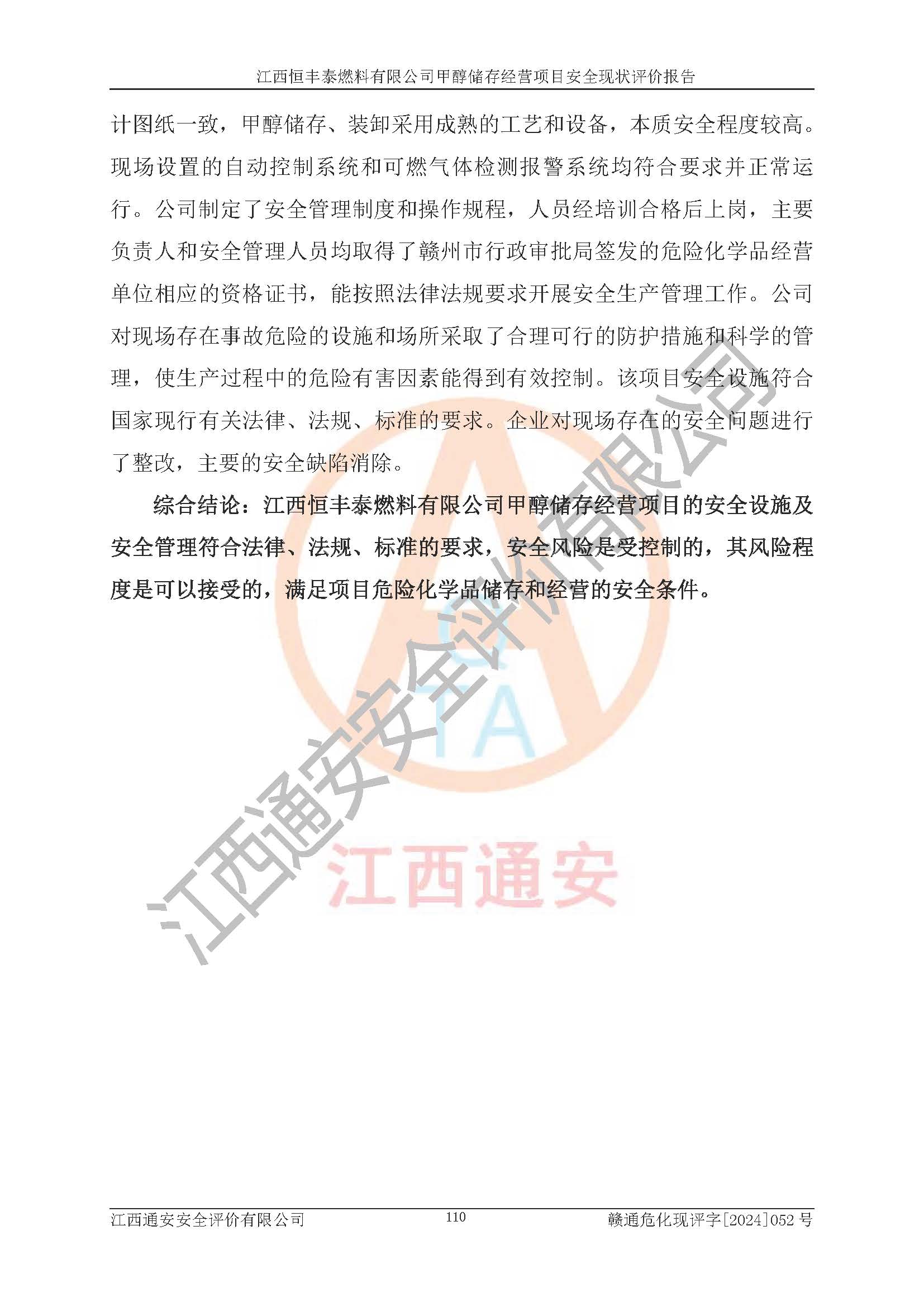 一、安全状况综合评述 通过对江西恒丰泰燃料有限公司甲醇储存经营项目的危险、有害因素辨识和定性、定量评价结果如下∶ 1、主要危险、危害因素辨识结果 项目在生产过程中存在的主要危险有:火灾爆炸、中毒窒息、触电、机械伤害、高处坠落、物体打击、**伤害、淹溺、灼烫等,存在的主要危害因素有:化学因素、物理因素(噪声、高温等)等,同时存在人为失误和管理缺陷。应重点防范的主要危险为火灾与爆炸。 2、危险化学品辨识结果 经辨识,该项目涉及的甲醇属于危险化学品,甲醇属于重点监管的危险化学品和特别管控危险化学品,项目不涉及监控化学品、易制毒化学品、易制爆危险化学品、剧毒化学品和高毒物品等危险化学品。 3、危险化学品重大危险源辨识结果 根据《危险化学品重大危险源辨识》(GB18218-2018)辨识,江西恒丰泰燃料有限公司甲醇储存经营项目不构成危险化学品重大危险源。 4、重点监管危险化工工艺辨识结果 根据《**安全监管总局关于公布首批重点监管的危险化学品名录的通知》安监总管三[2011] 95号、《**安全监管总局关于公布第二批重点监管危险化学品名录的通知》安监总管三[2013] 12号进行辨识,本项目不涉及重点监管的危险化工工艺。 5、作业条件危险性分析结果: 甲醇罐区卸车作业、装桶作业、检维修作业等单元危险程度均为“一般危险,需要注意”或“稍有危险,可以接受”级别。作业条件相对安全。 6、危险度评价结果: 甲醇储罐区属中度危险。 7、采用检查表评价法对项目外部安全条件、总图运输、危险化学品储运设施、采取的防火防爆措施、常规安全防护设施、“两重点一重大”安全措施及安全管理进行定性评价,评价结果如下: (1)该项目选址符合城乡总体规划和安全要求,甲醇经营和储存场所与库外建构筑物的距离符合有关标准、规范的要求。外部安全距离内无GB36894-2018中第3.1条所列的防护目标。 (2)总图布置分区明确,布局合理,满足规范要求。 (3)该项目无**明令淘汰的工艺,设备、设施与工艺条件、内部介质相适应,储罐的附件经整改后符合安全设施设计和规范的要求。 (4)该项目消防安全设施设置符合规范要求。 (5)该项目电气安全设施能满足安全要求,按要求设置了防雷接地设施,并经检测合格。防火防爆设施、液位监测措施、甲醇防泄漏设施、电气防爆措施等安全防护设施符合**法律法规、标准规范的要求。 (6)该项目公用工程能够满足安全经营的基本需要,符合安全经营的条件。 (7)该项目不涉及重大生产安全事故隐患,安全生产条件符合要求。 (8)公司成立了安全生产**小组,配备了安全管理人员,制定了安全管理制度、操作规程和事故应急预案,公司的安全管理机构工作有力,安全经营管理处于正常有序开展范围。 四、评价结论 江西恒丰泰燃料有限公司甲醇储存经营项目的安全设施及安全管理符合法律、法规、标准的要求,安全风险是受控制的,其风险程度是可以接受的,满足项目危险化学品储存和经营的安全条件。 |