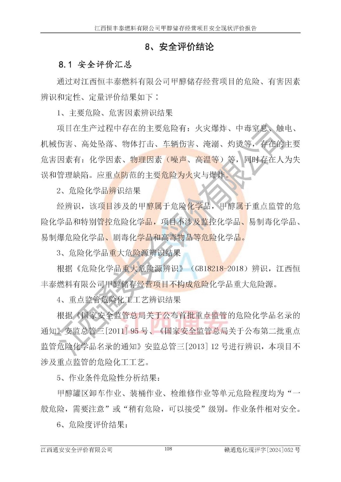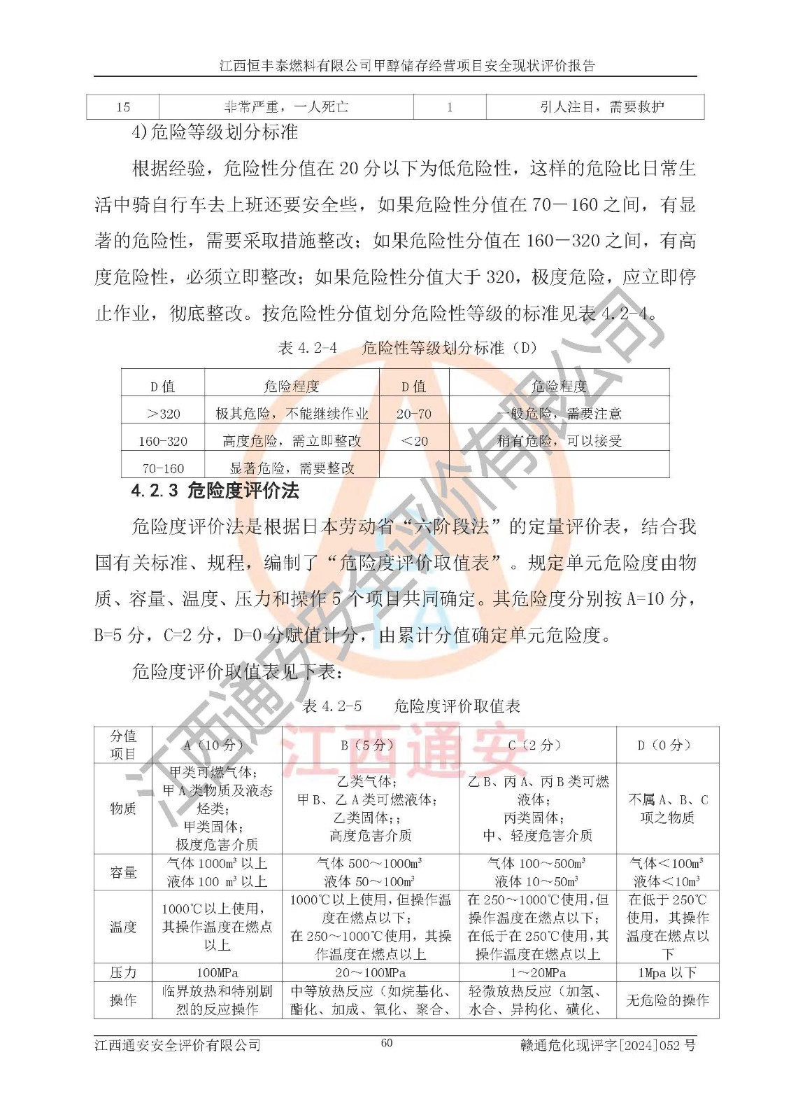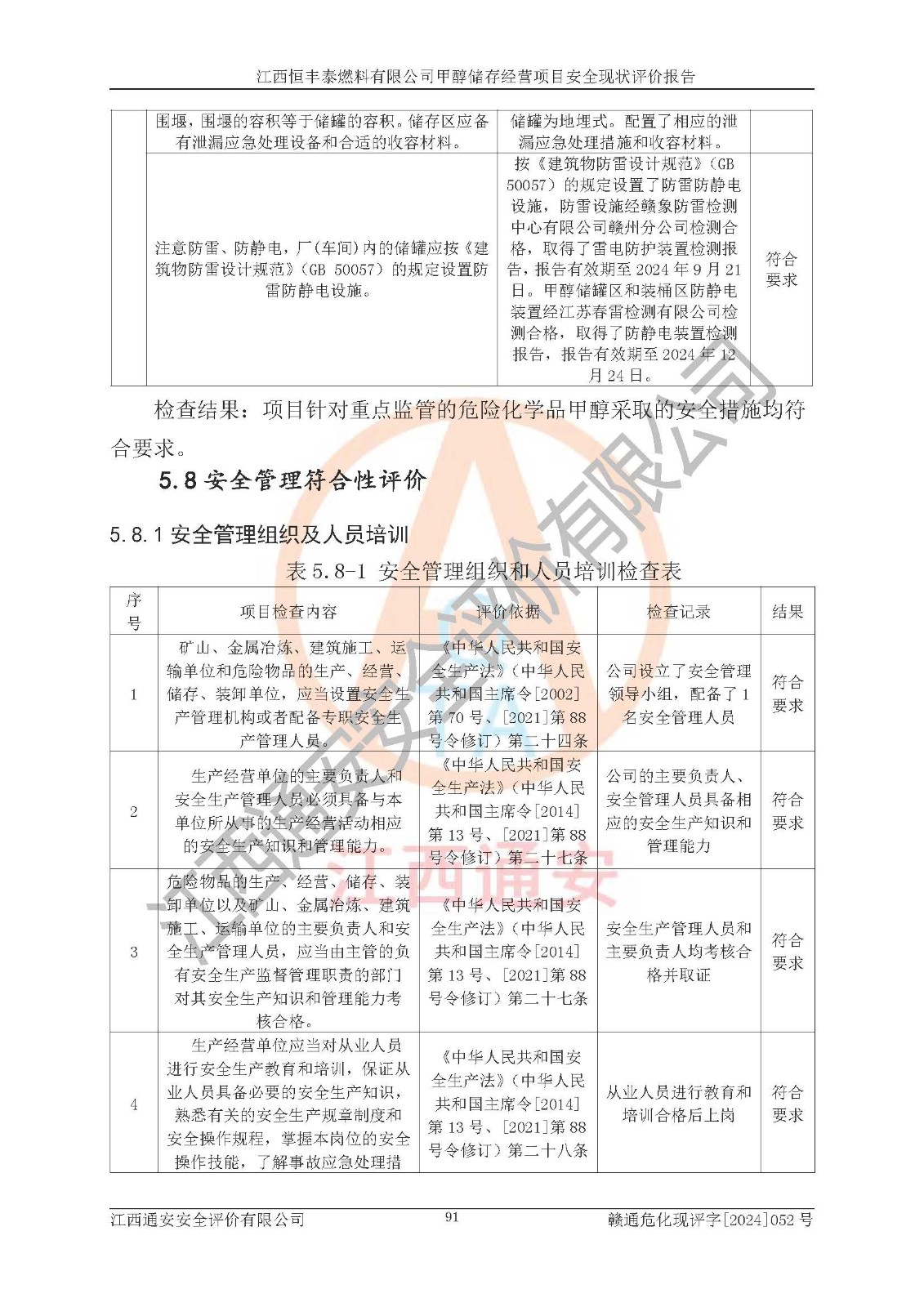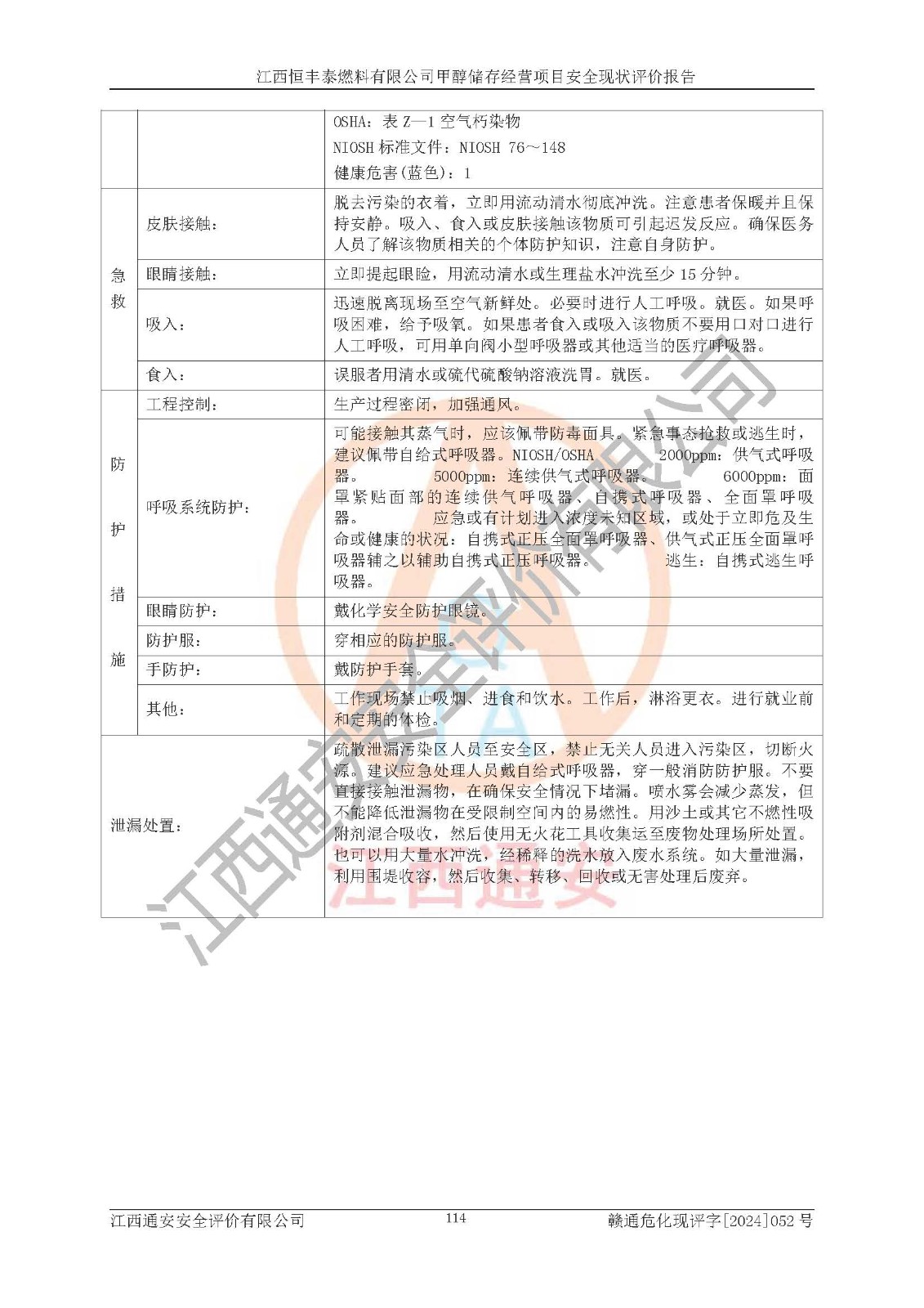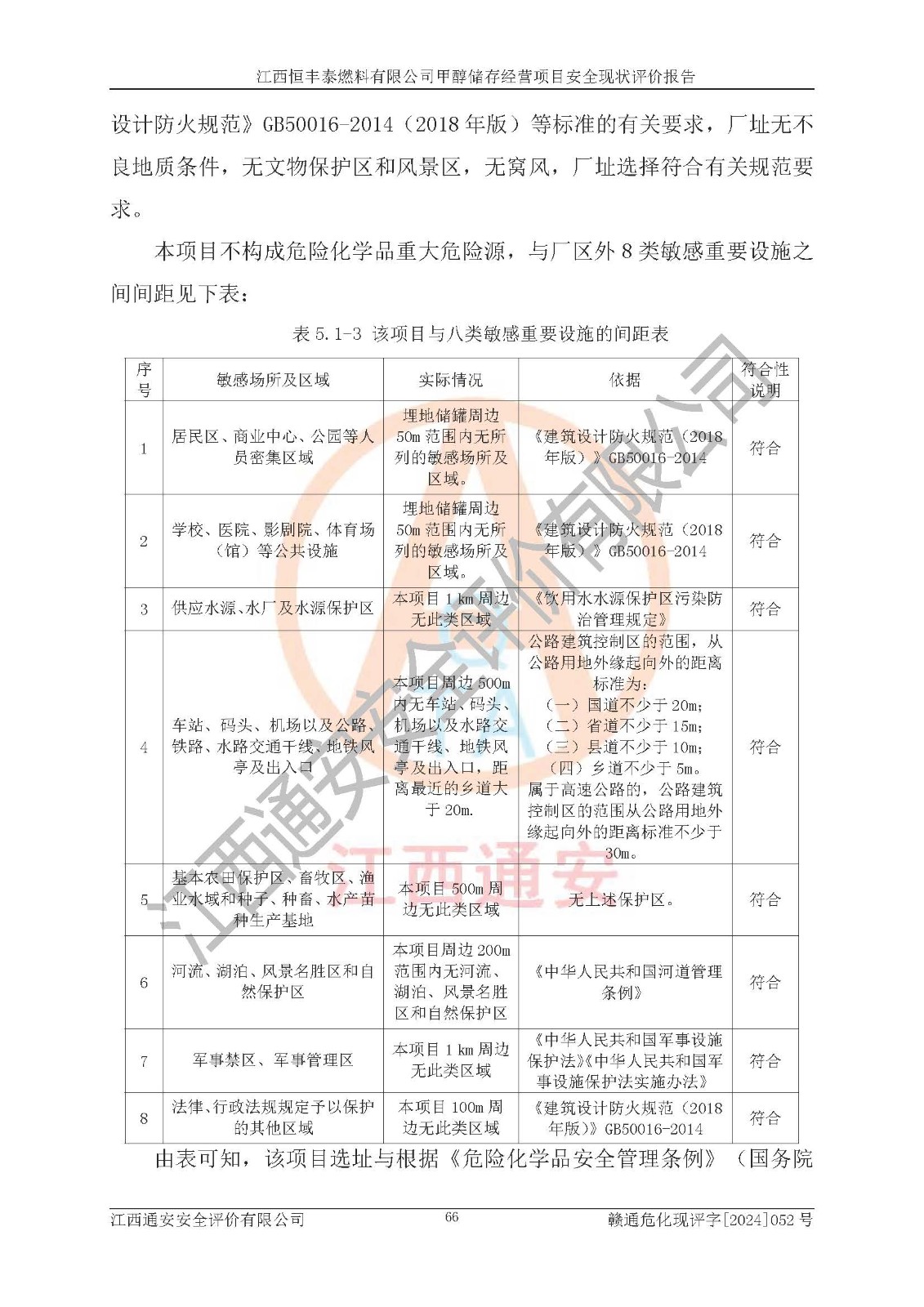 一、安全状况综合评述 通过对江西恒丰泰燃料有限公司甲醇储存经营项目的危险、有害因素辨识和定性、定量评价结果如下∶ 1、主要危险、危害因素辨识结果 项目在生产过程中存在的主要危险有:火灾爆炸、中毒窒息、触电、机械伤害、高处坠落、物体打击、**伤害、淹溺、灼烫等,存在的主要危害因素有:化学因素、物理因素(噪声、高温等)等,同时存在人为失误和管理缺陷。应重点防范的主要危险为火灾与爆炸。 2、危险化学品辨识结果 经辨识,该项目涉及的甲醇属于危险化学品,甲醇属于重点监管的危险化学品和特别管控危险化学品,项目不涉及监控化学品、易制毒化学品、易制爆危险化学品、剧毒化学品和高毒物品等危险化学品。 3、危险化学品重大危险源辨识结果 根据《危险化学品重大危险源辨识》(GB18218-2018)辨识,江西恒丰泰燃料有限公司甲醇储存经营项目不构成危险化学品重大危险源。 4、重点监管危险化工工艺辨识结果 根据《**安全监管总局关于公布首批重点监管的危险化学品名录的通知》安监总管三[2011] 95号、《**安全监管总局关于公布第二批重点监管危险化学品名录的通知》安监总管三[2013] 12号进行辨识,本项目不涉及重点监管的危险化工工艺。 5、作业条件危险性分析结果: 甲醇罐区卸车作业、装桶作业、检维修作业等单元危险程度均为“一般危险,需要注意”或“稍有危险,可以接受”级别。作业条件相对安全。 6、危险度评价结果: 甲醇储罐区属中度危险。 7、采用检查表评价法对项目外部安全条件、总图运输、危险化学品储运设施、采取的防火防爆措施、常规安全防护设施、“两重点一重大”安全措施及安全管理进行定性评价,评价结果如下: (1)该项目选址符合城乡总体规划和安全要求,甲醇经营和储存场所与库外建构筑物的距离符合有关标准、规范的要求。外部安全距离内无GB36894-2018中第3.1条所列的防护目标。 (2)总图布置分区明确,布局合理,满足规范要求。 (3)该项目无**明令淘汰的工艺,设备、设施与工艺条件、内部介质相适应,储罐的附件经整改后符合安全设施设计和规范的要求。 (4)该项目消防安全设施设置符合规范要求。 (5)该项目电气安全设施能满足安全要求,按要求设置了防雷接地设施,并经检测合格。防火防爆设施、液位监测措施、甲醇防泄漏设施、电气防爆措施等安全防护设施符合**法律法规、标准规范的要求。 (6)该项目公用工程能够满足安全经营的基本需要,符合安全经营的条件。 (7)该项目不涉及重大生产安全事故隐患,安全生产条件符合要求。 (8)公司成立了安全生产**小组,配备了安全管理人员,制定了安全管理制度、操作规程和事故应急预案,公司的安全管理机构工作有力,安全经营管理处于正常有序开展范围。 四、评价结论 江西恒丰泰燃料有限公司甲醇储存经营项目的安全设施及安全管理符合法律、法规、标准的要求,安全风险是受控制的,其风险程度是可以接受的,满足项目危险化学品储存和经营的安全条件。 |