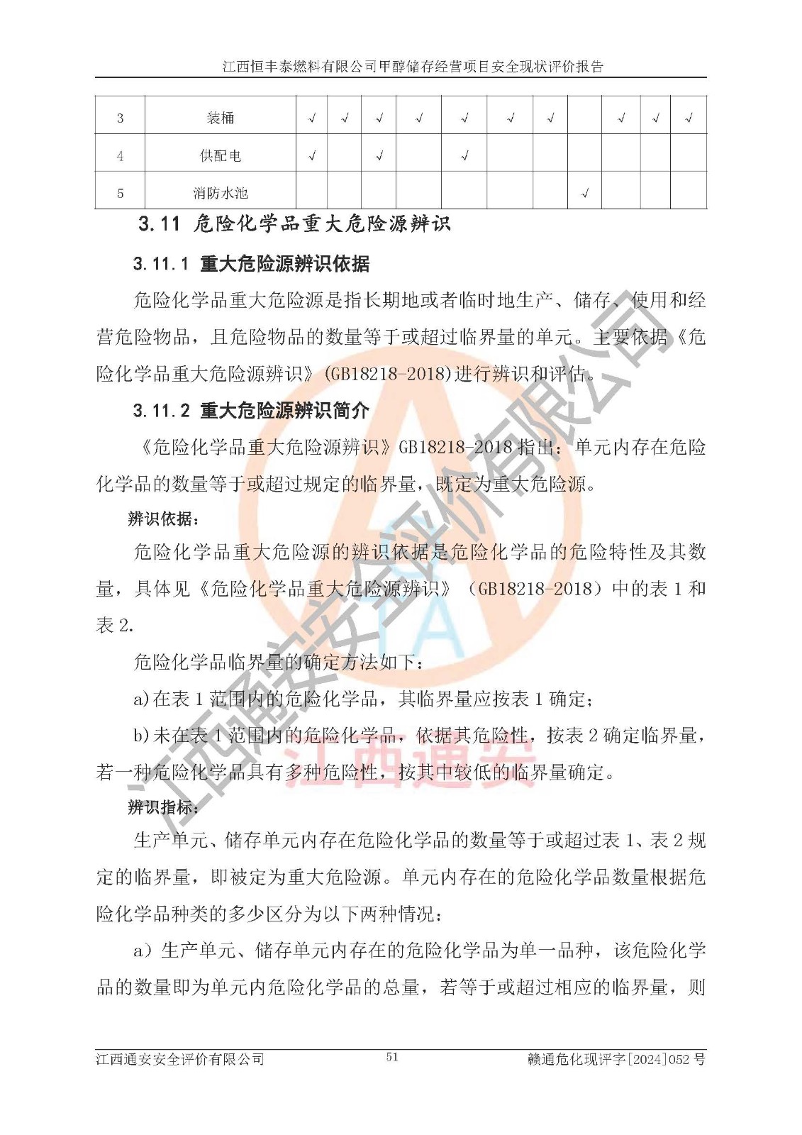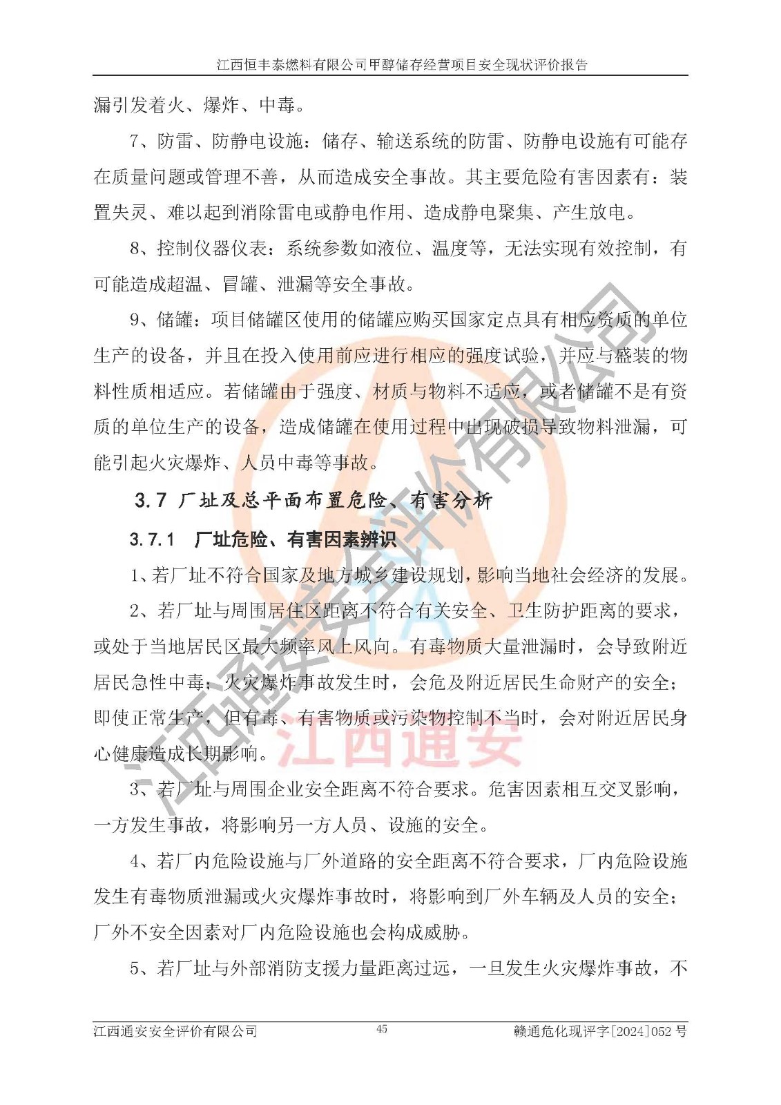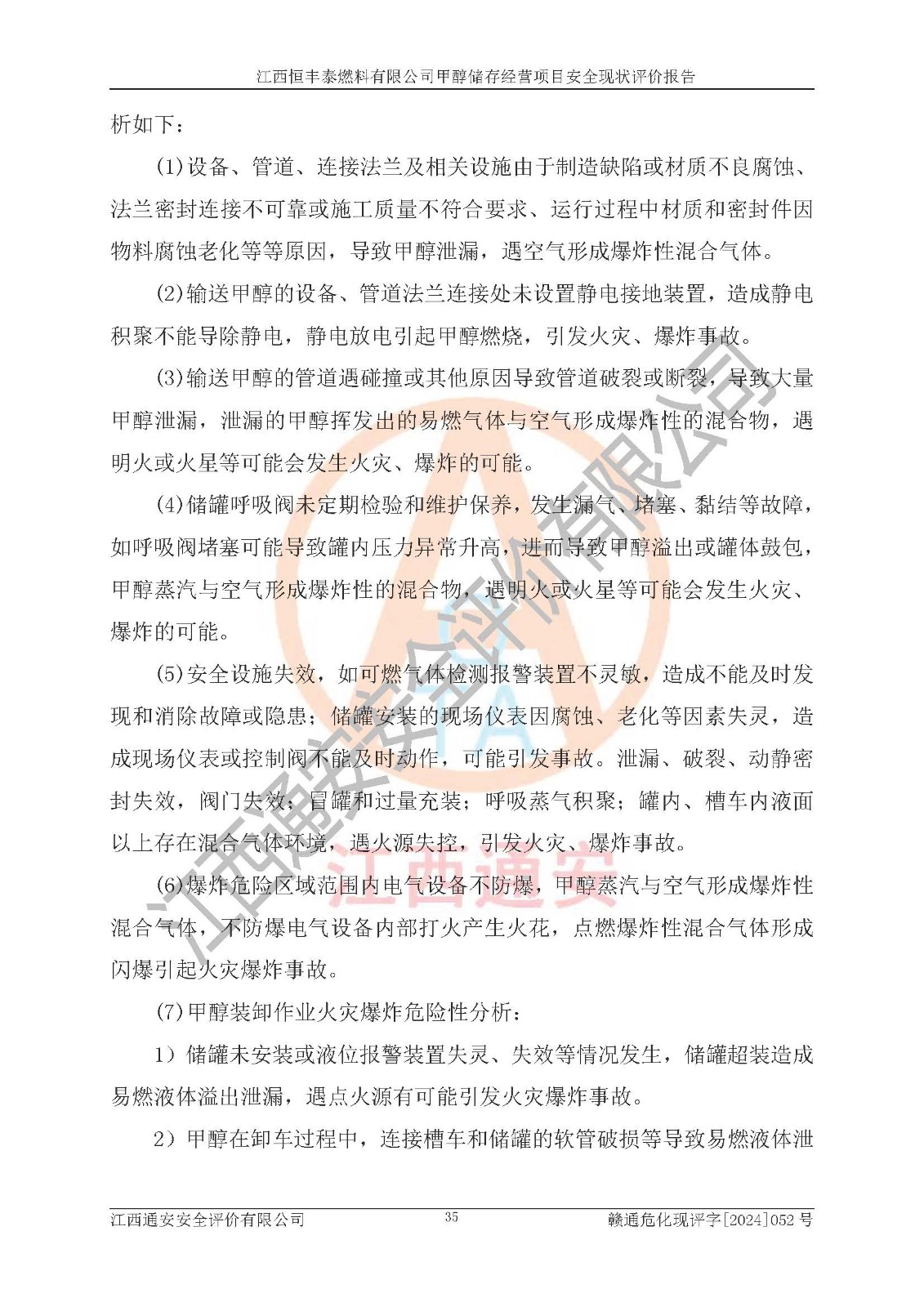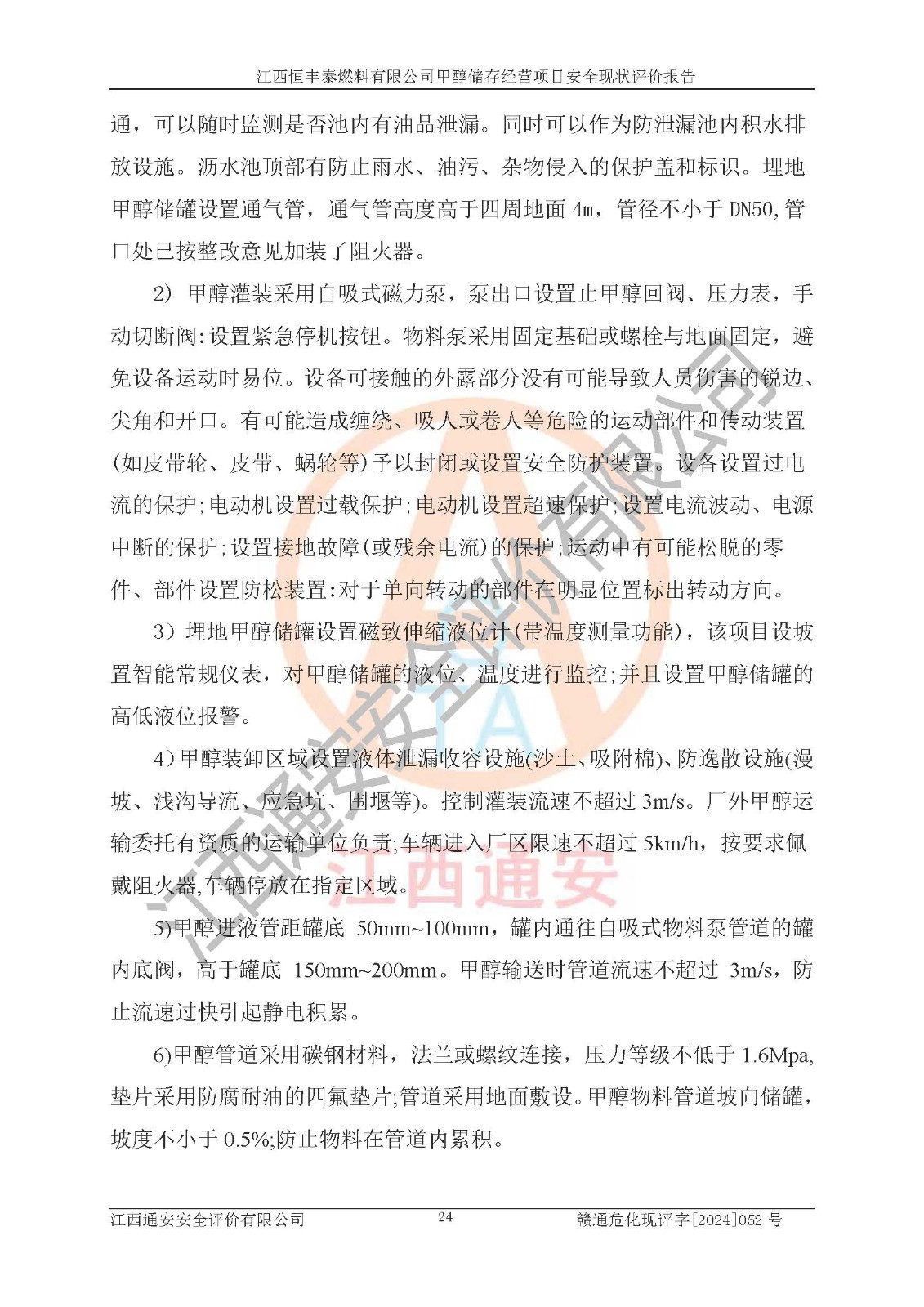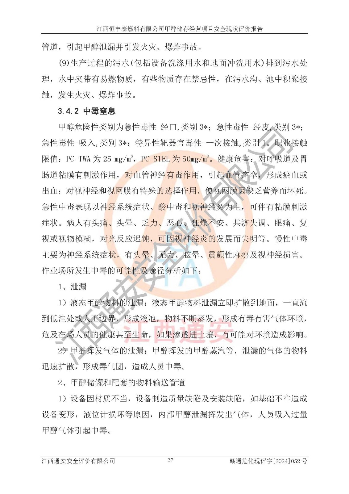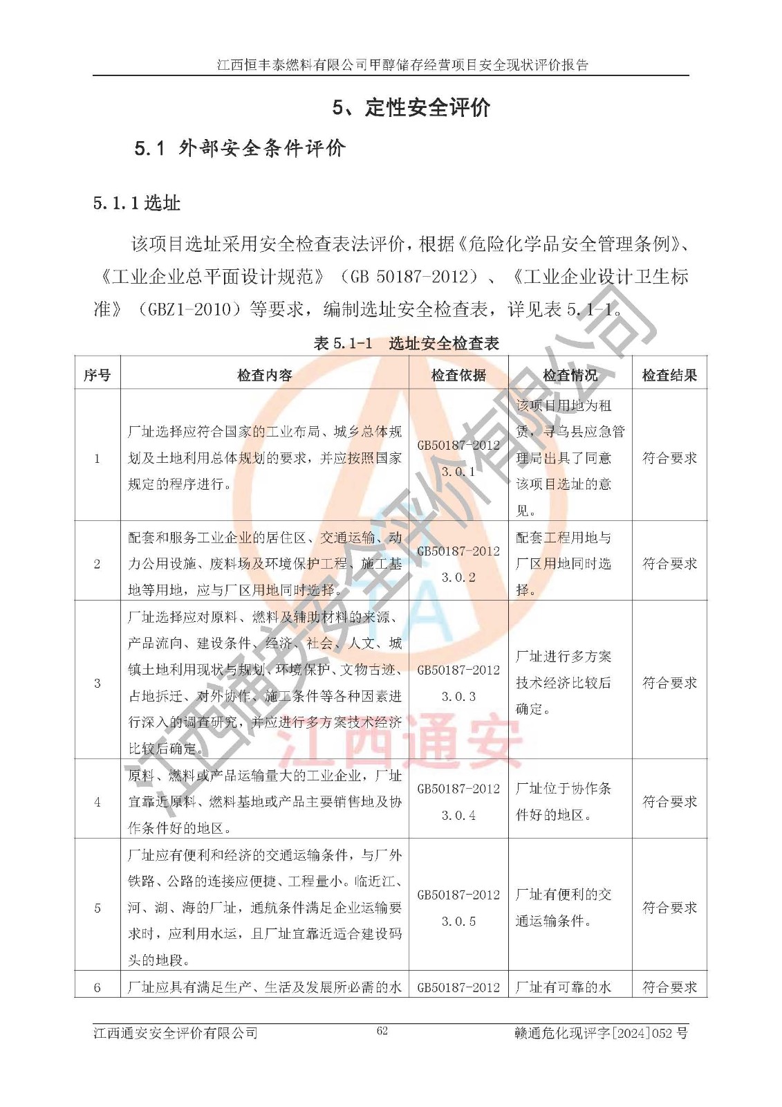 一、安全状况综合评述 通过对江西恒丰泰燃料有限公司甲醇储存经营项目的危险、有害因素辨识和定性、定量评价结果如下∶ 1、主要危险、危害因素辨识结果 项目在生产过程中存在的主要危险有:火灾爆炸、中毒窒息、触电、机械伤害、高处坠落、物体打击、**伤害、淹溺、灼烫等,存在的主要危害因素有:化学因素、物理因素(噪声、高温等)等,同时存在人为失误和管理缺陷。应重点防范的主要危险为火灾与爆炸。 2、危险化学品辨识结果 经辨识,该项目涉及的甲醇属于危险化学品,甲醇属于重点监管的危险化学品和特别管控危险化学品,项目不涉及监控化学品、易制毒化学品、易制爆危险化学品、剧毒化学品和高毒物品等危险化学品。 3、危险化学品重大危险源辨识结果 根据《危险化学品重大危险源辨识》(GB18218-2018)辨识,江西恒丰泰燃料有限公司甲醇储存经营项目不构成危险化学品重大危险源。 4、重点监管危险化工工艺辨识结果 根据《**安全监管总局关于公布首批重点监管的危险化学品名录的通知》安监总管三[2011] 95号、《**安全监管总局关于公布第二批重点监管危险化学品名录的通知》安监总管三[2013] 12号进行辨识,本项目不涉及重点监管的危险化工工艺。 5、作业条件危险性分析结果: 甲醇罐区卸车作业、装桶作业、检维修作业等单元危险程度均为“一般危险,需要注意”或“稍有危险,可以接受”级别。作业条件相对安全。 6、危险度评价结果: 甲醇储罐区属中度危险。 7、采用检查表评价法对项目外部安全条件、总图运输、危险化学品储运设施、采取的防火防爆措施、常规安全防护设施、“两重点一重大”安全措施及安全管理进行定性评价,评价结果如下: (1)该项目选址符合城乡总体规划和安全要求,甲醇经营和储存场所与库外建构筑物的距离符合有关标准、规范的要求。外部安全距离内无GB36894-2018中第3.1条所列的防护目标。 (2)总图布置分区明确,布局合理,满足规范要求。 (3)该项目无**明令淘汰的工艺,设备、设施与工艺条件、内部介质相适应,储罐的附件经整改后符合安全设施设计和规范的要求。 (4)该项目消防安全设施设置符合规范要求。 (5)该项目电气安全设施能满足安全要求,按要求设置了防雷接地设施,并经检测合格。防火防爆设施、液位监测措施、甲醇防泄漏设施、电气防爆措施等安全防护设施符合**法律法规、标准规范的要求。 (6)该项目公用工程能够满足安全经营的基本需要,符合安全经营的条件。 (7)该项目不涉及重大生产安全事故隐患,安全生产条件符合要求。 (8)公司成立了安全生产**小组,配备了安全管理人员,制定了安全管理制度、操作规程和事故应急预案,公司的安全管理机构工作有力,安全经营管理处于正常有序开展范围。 四、评价结论 江西恒丰泰燃料有限公司甲醇储存经营项目的安全设施及安全管理符合法律、法规、标准的要求,安全风险是受控制的,其风险程度是可以接受的,满足项目危险化学品储存和经营的安全条件。 |