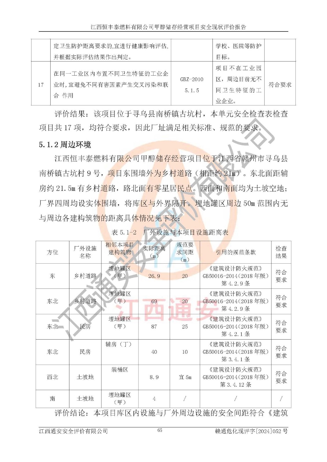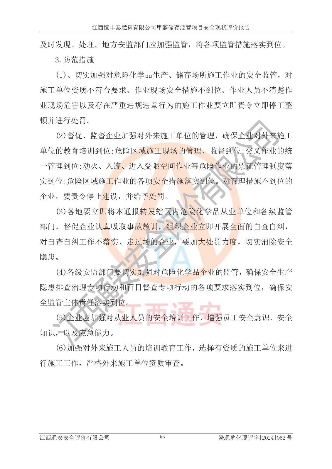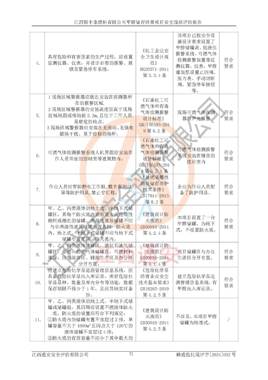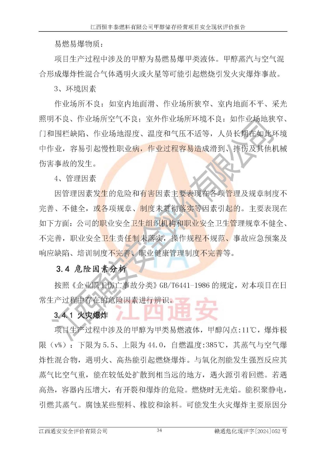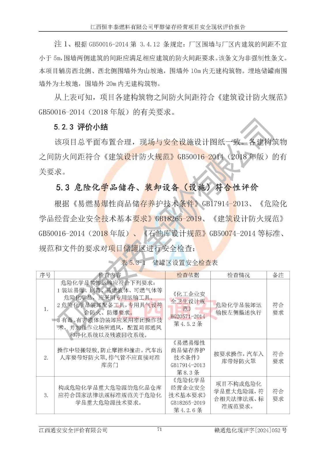 一、安全状况综合评述 通过对江西恒丰泰燃料有限公司甲醇储存经营项目的危险、有害因素辨识和定性、定量评价结果如下∶ 1、主要危险、危害因素辨识结果 项目在生产过程中存在的主要危险有:火灾爆炸、中毒窒息、触电、机械伤害、高处坠落、物体打击、**伤害、淹溺、灼烫等,存在的主要危害因素有:化学因素、物理因素(噪声、高温等)等,同时存在人为失误和管理缺陷。应重点防范的主要危险为火灾与爆炸。 2、危险化学品辨识结果 经辨识,该项目涉及的甲醇属于危险化学品,甲醇属于重点监管的危险化学品和特别管控危险化学品,项目不涉及监控化学品、易制毒化学品、易制爆危险化学品、剧毒化学品和高毒物品等危险化学品。 3、危险化学品重大危险源辨识结果 根据《危险化学品重大危险源辨识》(GB18218-2018)辨识,江西恒丰泰燃料有限公司甲醇储存经营项目不构成危险化学品重大危险源。 4、重点监管危险化工工艺辨识结果 根据《**安全监管总局关于公布首批重点监管的危险化学品名录的通知》安监总管三[2011] 95号、《**安全监管总局关于公布第二批重点监管危险化学品名录的通知》安监总管三[2013] 12号进行辨识,本项目不涉及重点监管的危险化工工艺。 5、作业条件危险性分析结果: 甲醇罐区卸车作业、装桶作业、检维修作业等单元危险程度均为“一般危险,需要注意”或“稍有危险,可以接受”级别。作业条件相对安全。 6、危险度评价结果: 甲醇储罐区属中度危险。 7、采用检查表评价法对项目外部安全条件、总图运输、危险化学品储运设施、采取的防火防爆措施、常规安全防护设施、“两重点一重大”安全措施及安全管理进行定性评价,评价结果如下: (1)该项目选址符合城乡总体规划和安全要求,甲醇经营和储存场所与库外建构筑物的距离符合有关标准、规范的要求。外部安全距离内无GB36894-2018中第3.1条所列的防护目标。 (2)总图布置分区明确,布局合理,满足规范要求。 (3)该项目无**明令淘汰的工艺,设备、设施与工艺条件、内部介质相适应,储罐的附件经整改后符合安全设施设计和规范的要求。 (4)该项目消防安全设施设置符合规范要求。 (5)该项目电气安全设施能满足安全要求,按要求设置了防雷接地设施,并经检测合格。防火防爆设施、液位监测措施、甲醇防泄漏设施、电气防爆措施等安全防护设施符合**法律法规、标准规范的要求。 (6)该项目公用工程能够满足安全经营的基本需要,符合安全经营的条件。 (7)该项目不涉及重大生产安全事故隐患,安全生产条件符合要求。 (8)公司成立了安全生产**小组,配备了安全管理人员,制定了安全管理制度、操作规程和事故应急预案,公司的安全管理机构工作有力,安全经营管理处于正常有序开展范围。 四、评价结论 江西恒丰泰燃料有限公司甲醇储存经营项目的安全设施及安全管理符合法律、法规、标准的要求,安全风险是受控制的,其风险程度是可以接受的,满足项目危险化学品储存和经营的安全条件。 |
