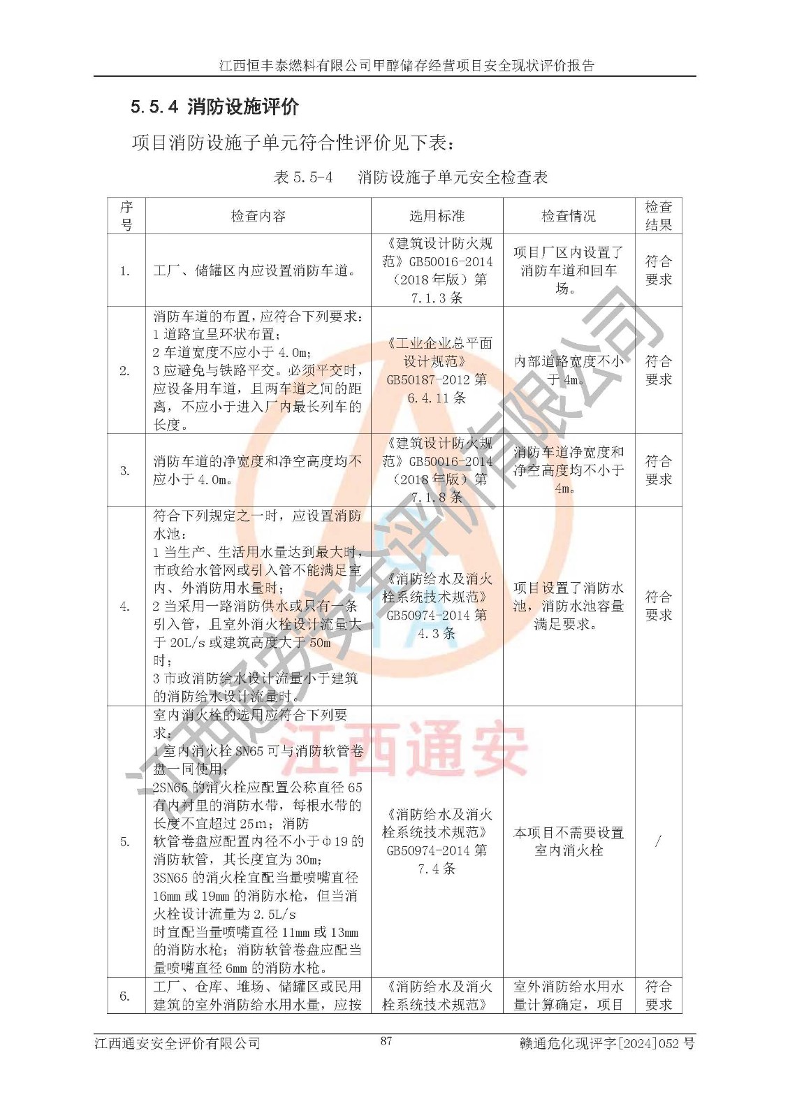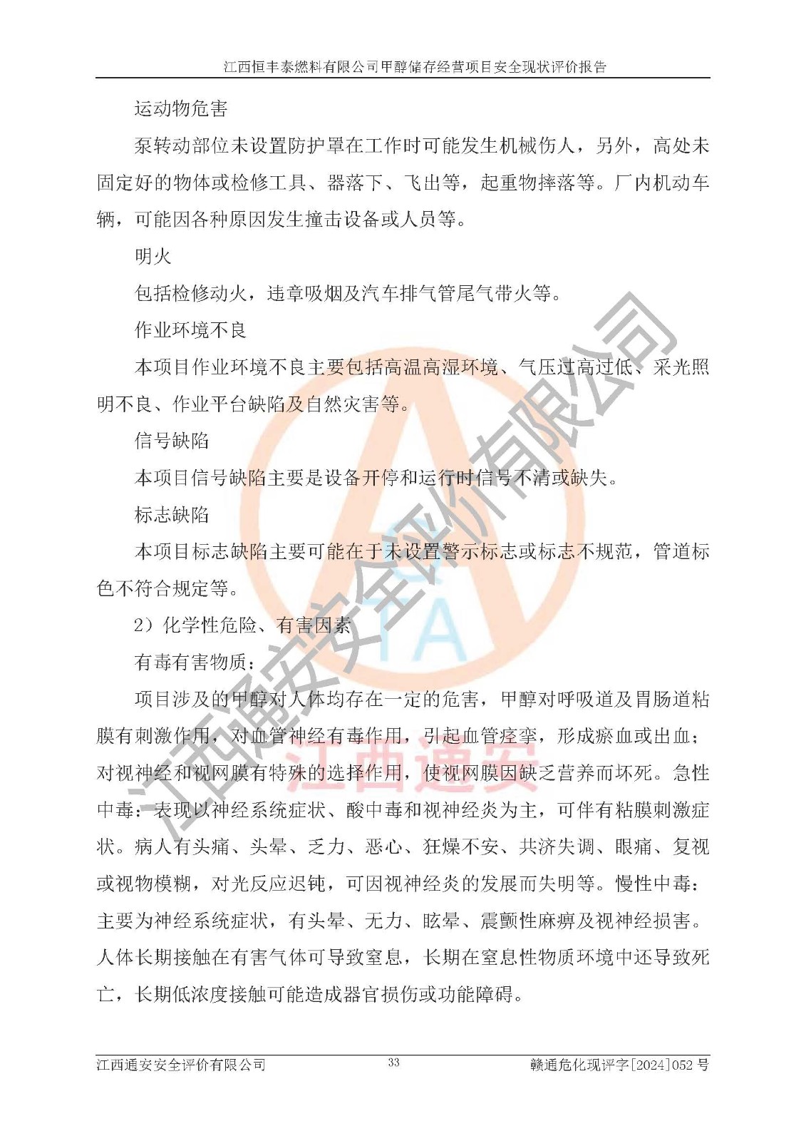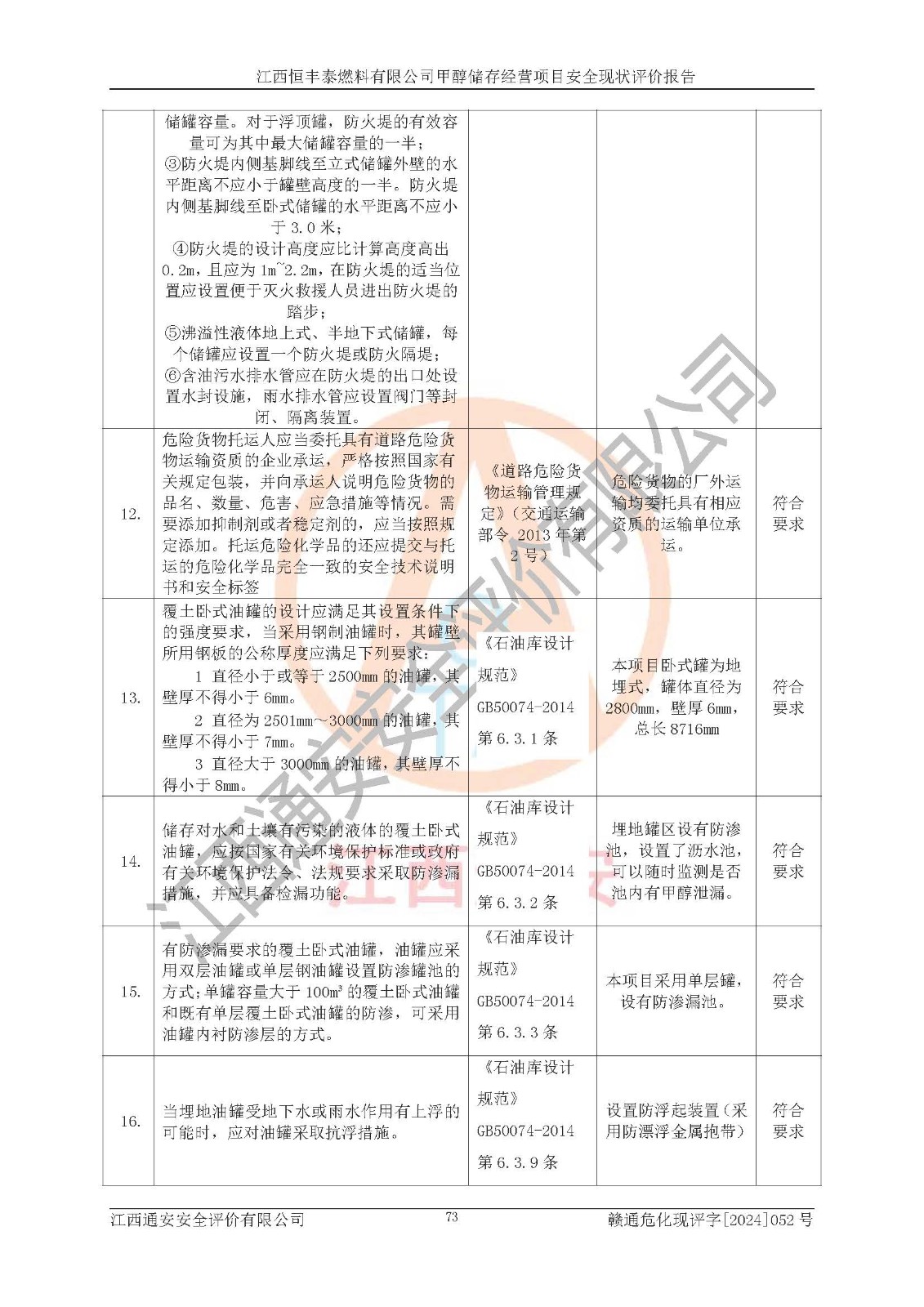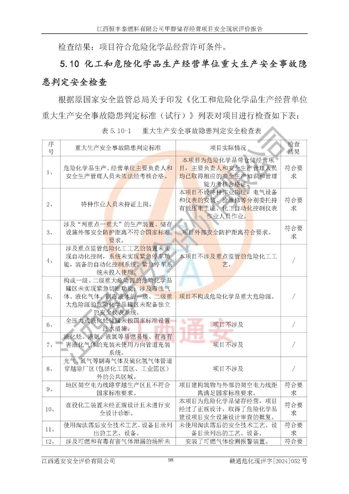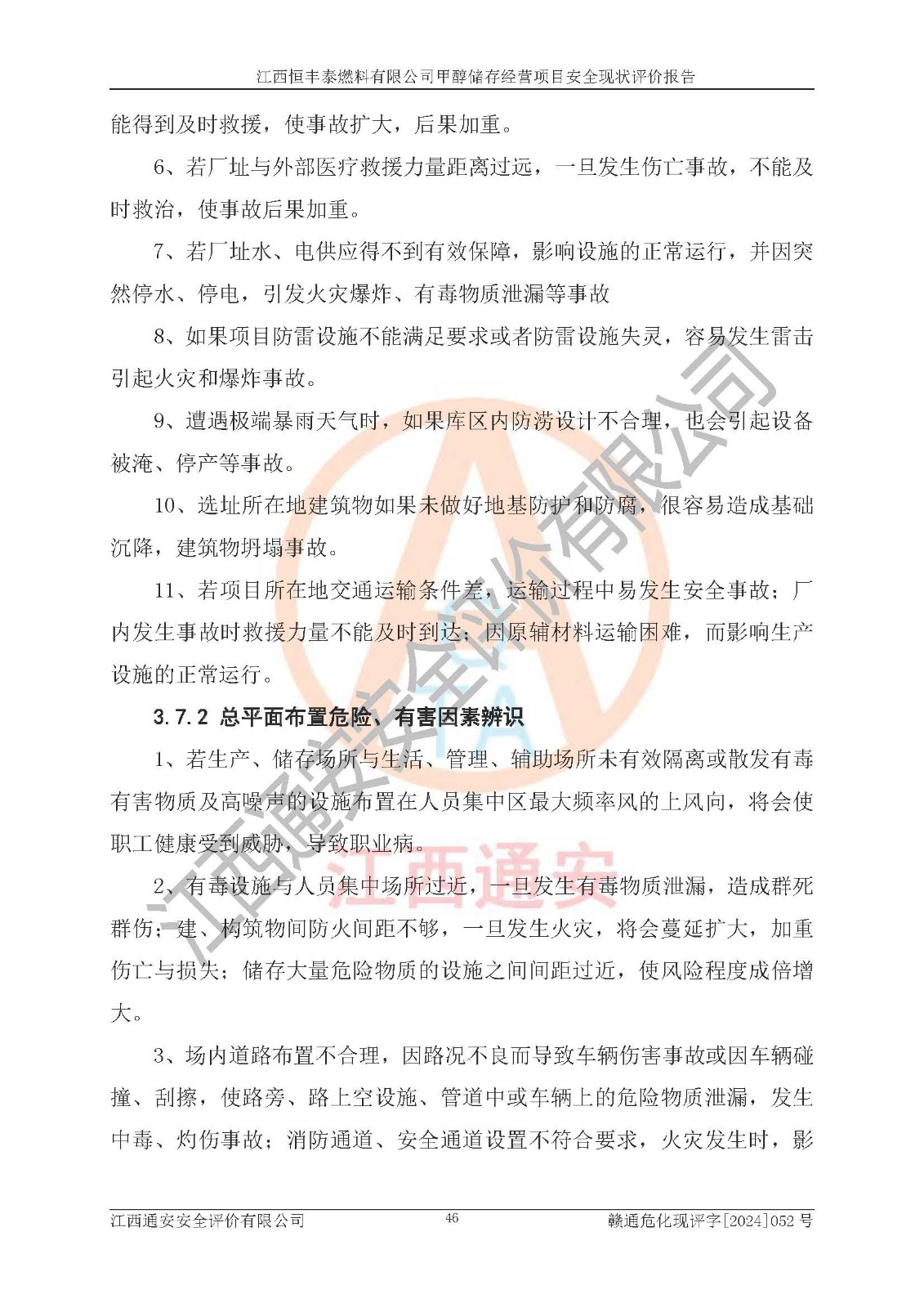 一、安全状况综合评述 通过对江西恒丰泰燃料有限公司甲醇储存经营项目的危险、有害因素辨识和定性、定量评价结果如下∶ 1、主要危险、危害因素辨识结果 项目在生产过程中存在的主要危险有:火灾爆炸、中毒窒息、触电、机械伤害、高处坠落、物体打击、**伤害、淹溺、灼烫等,存在的主要危害因素有:化学因素、物理因素(噪声、高温等)等,同时存在人为失误和管理缺陷。应重点防范的主要危险为火灾与爆炸。 2、危险化学品辨识结果 经辨识,该项目涉及的甲醇属于危险化学品,甲醇属于重点监管的危险化学品和特别管控危险化学品,项目不涉及监控化学品、易制毒化学品、易制爆危险化学品、剧毒化学品和高毒物品等危险化学品。 3、危险化学品重大危险源辨识结果 根据《危险化学品重大危险源辨识》(GB18218-2018)辨识,江西恒丰泰燃料有限公司甲醇储存经营项目不构成危险化学品重大危险源。 4、重点监管危险化工工艺辨识结果 根据《**安全监管总局关于公布首批重点监管的危险化学品名录的通知》安监总管三[2011] 95号、《**安全监管总局关于公布第二批重点监管危险化学品名录的通知》安监总管三[2013] 12号进行辨识,本项目不涉及重点监管的危险化工工艺。 5、作业条件危险性分析结果: 甲醇罐区卸车作业、装桶作业、检维修作业等单元危险程度均为“一般危险,需要注意”或“稍有危险,可以接受”级别。作业条件相对安全。 6、危险度评价结果: 甲醇储罐区属中度危险。 7、采用检查表评价法对项目外部安全条件、总图运输、危险化学品储运设施、采取的防火防爆措施、常规安全防护设施、“两重点一重大”安全措施及安全管理进行定性评价,评价结果如下: (1)该项目选址符合城乡总体规划和安全要求,甲醇经营和储存场所与库外建构筑物的距离符合有关标准、规范的要求。外部安全距离内无GB36894-2018中第3.1条所列的防护目标。 (2)总图布置分区明确,布局合理,满足规范要求。 (3)该项目无**明令淘汰的工艺,设备、设施与工艺条件、内部介质相适应,储罐的附件经整改后符合安全设施设计和规范的要求。 (4)该项目消防安全设施设置符合规范要求。 (5)该项目电气安全设施能满足安全要求,按要求设置了防雷接地设施,并经检测合格。防火防爆设施、液位监测措施、甲醇防泄漏设施、电气防爆措施等安全防护设施符合**法律法规、标准规范的要求。 (6)该项目公用工程能够满足安全经营的基本需要,符合安全经营的条件。 (7)该项目不涉及重大生产安全事故隐患,安全生产条件符合要求。 (8)公司成立了安全生产**小组,配备了安全管理人员,制定了安全管理制度、操作规程和事故应急预案,公司的安全管理机构工作有力,安全经营管理处于正常有序开展范围。 四、评价结论 江西恒丰泰燃料有限公司甲醇储存经营项目的安全设施及安全管理符合法律、法规、标准的要求,安全风险是受控制的,其风险程度是可以接受的,满足项目危险化学品储存和经营的安全条件。 |