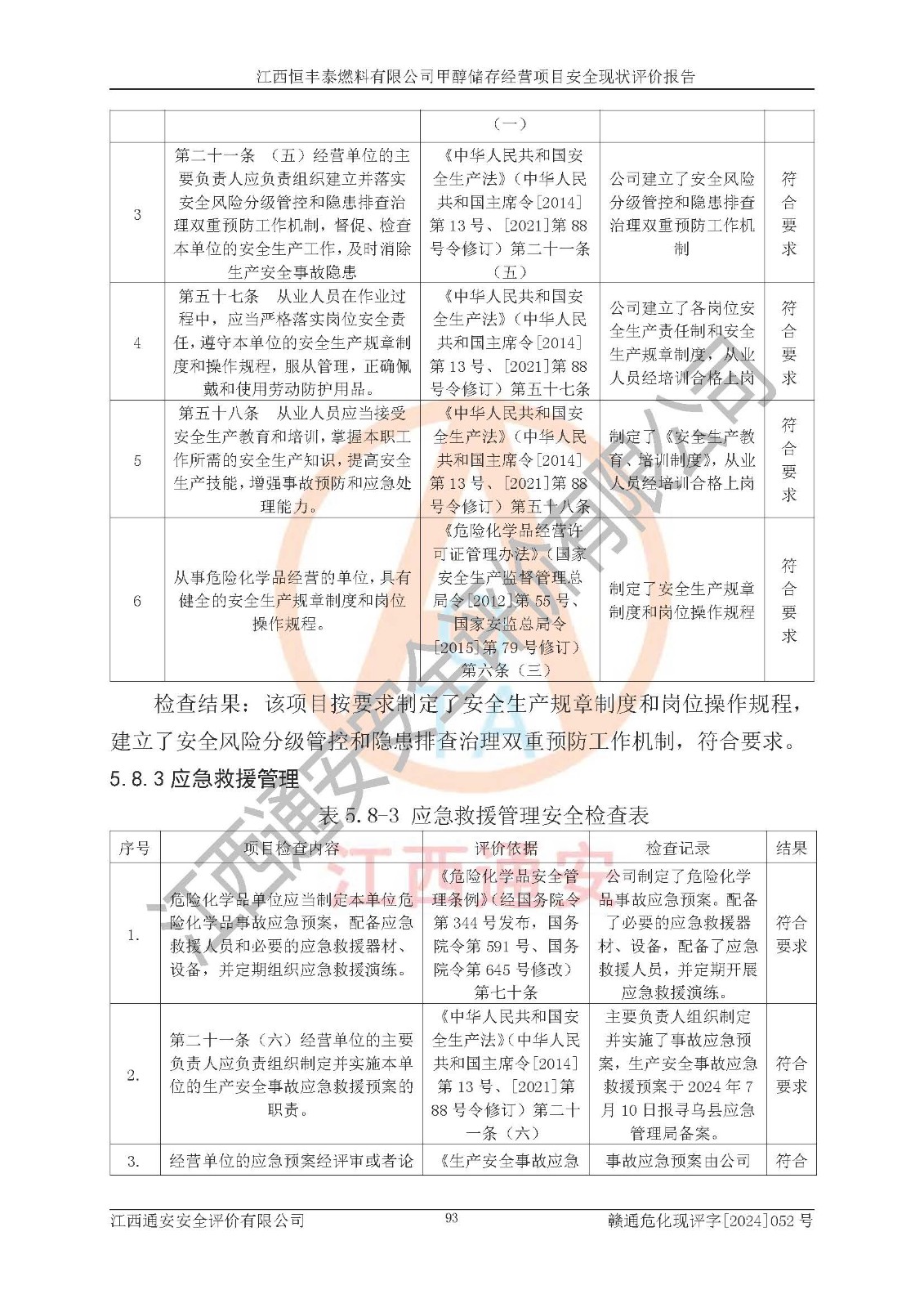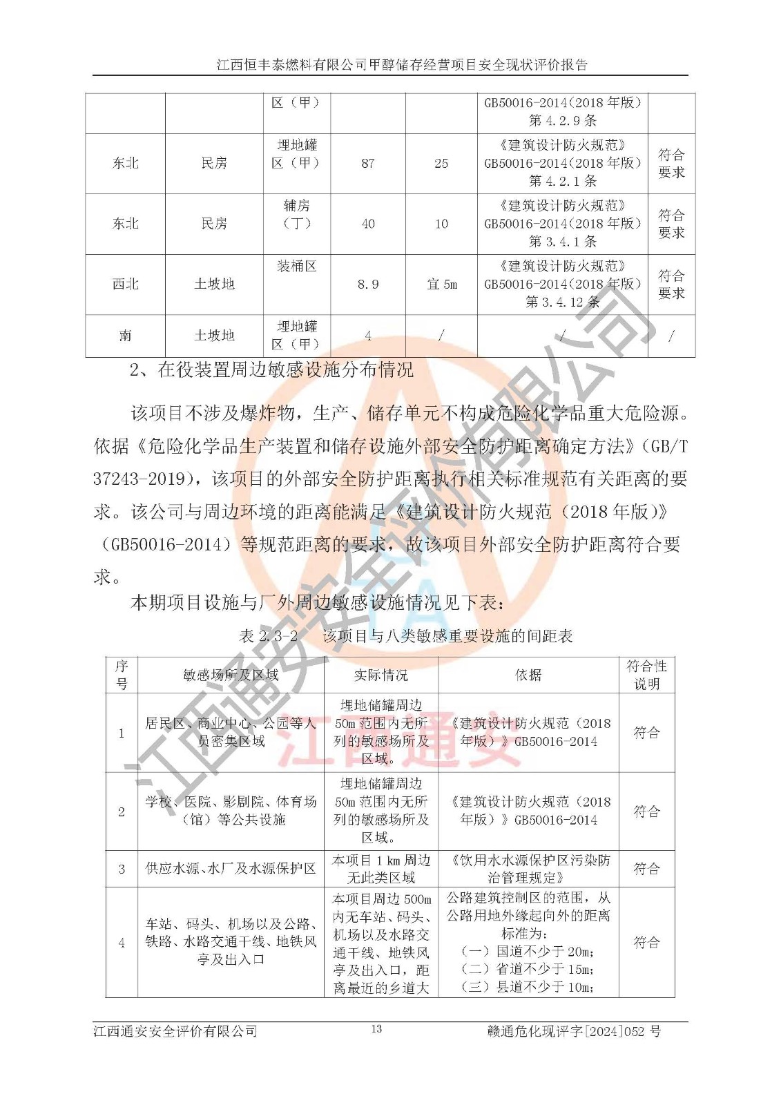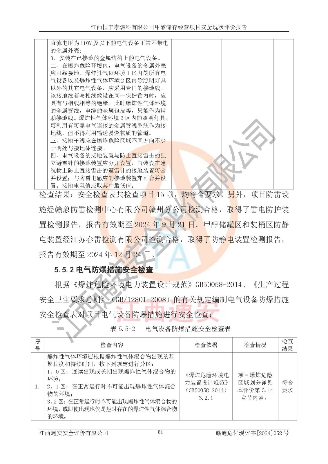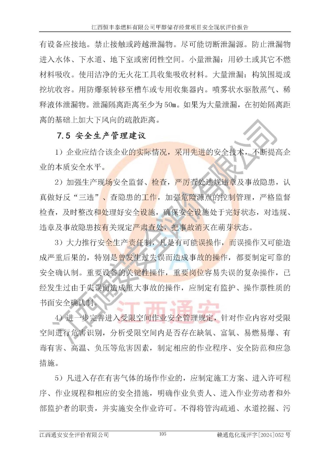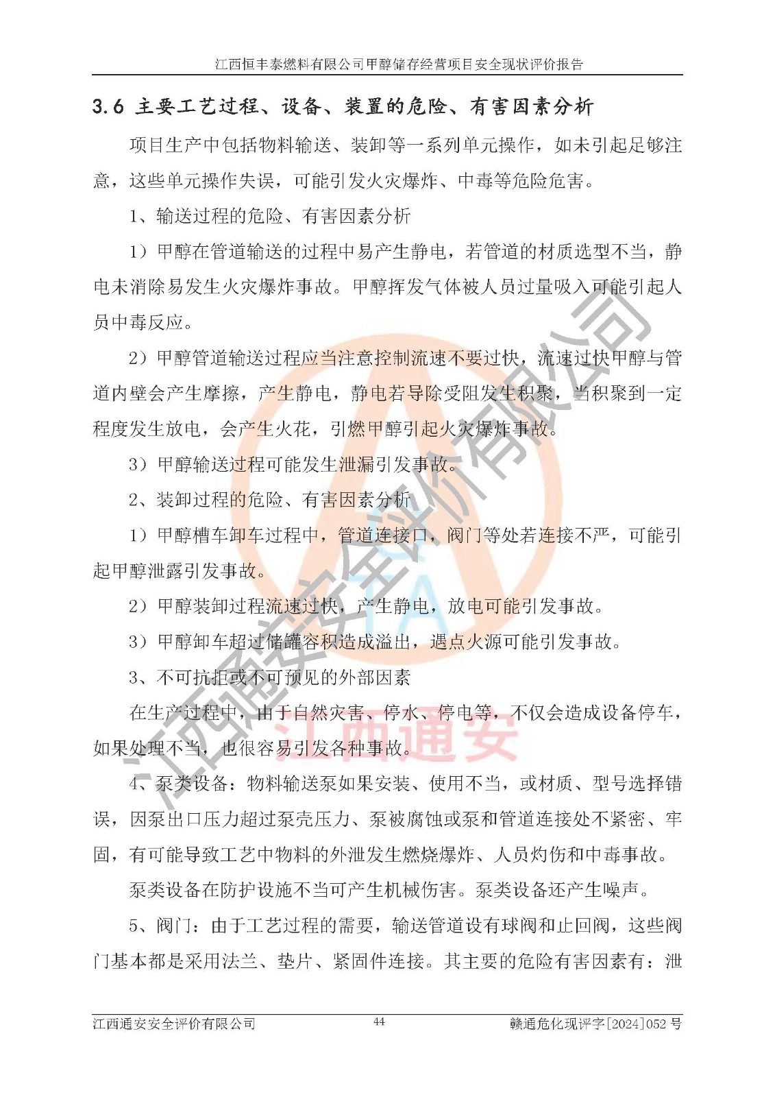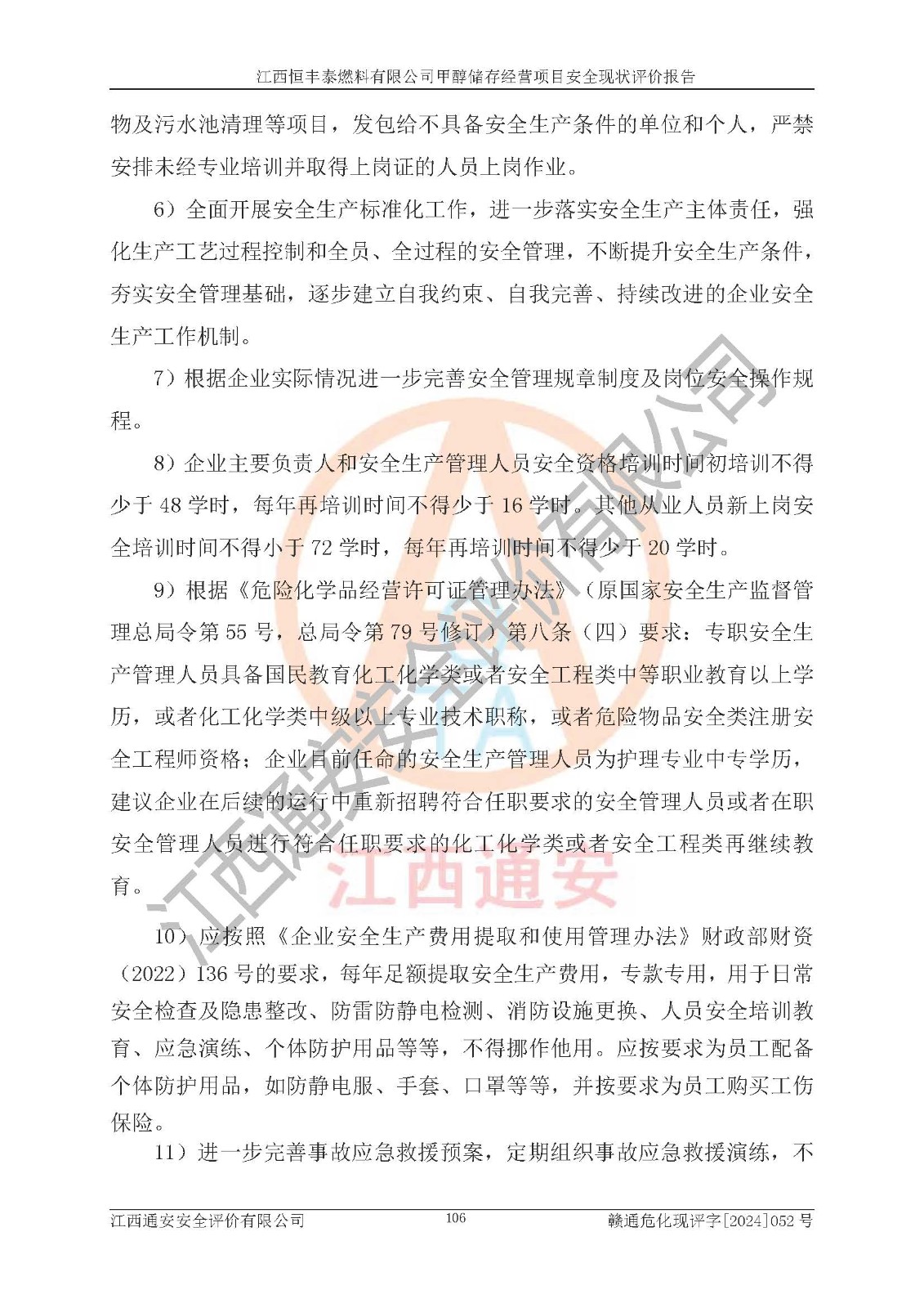 一、安全状况综合评述 通过对江西恒丰泰燃料有限公司甲醇储存经营项目的危险、有害因素辨识和定性、定量评价结果如下∶ 1、主要危险、危害因素辨识结果 项目在生产过程中存在的主要危险有:火灾爆炸、中毒窒息、触电、机械伤害、高处坠落、物体打击、**伤害、淹溺、灼烫等,存在的主要危害因素有:化学因素、物理因素(噪声、高温等)等,同时存在人为失误和管理缺陷。应重点防范的主要危险为火灾与爆炸。 2、危险化学品辨识结果 经辨识,该项目涉及的甲醇属于危险化学品,甲醇属于重点监管的危险化学品和特别管控危险化学品,项目不涉及监控化学品、易制毒化学品、易制爆危险化学品、剧毒化学品和高毒物品等危险化学品。 3、危险化学品重大危险源辨识结果 根据《危险化学品重大危险源辨识》(GB18218-2018)辨识,江西恒丰泰燃料有限公司甲醇储存经营项目不构成危险化学品重大危险源。 4、重点监管危险化工工艺辨识结果 根据《**安全监管总局关于公布首批重点监管的危险化学品名录的通知》安监总管三[2011] 95号、《**安全监管总局关于公布第二批重点监管危险化学品名录的通知》安监总管三[2013] 12号进行辨识,本项目不涉及重点监管的危险化工工艺。 5、作业条件危险性分析结果: 甲醇罐区卸车作业、装桶作业、检维修作业等单元危险程度均为“一般危险,需要注意”或“稍有危险,可以接受”级别。作业条件相对安全。 6、危险度评价结果: 甲醇储罐区属中度危险。 7、采用检查表评价法对项目外部安全条件、总图运输、危险化学品储运设施、采取的防火防爆措施、常规安全防护设施、“两重点一重大”安全措施及安全管理进行定性评价,评价结果如下: (1)该项目选址符合城乡总体规划和安全要求,甲醇经营和储存场所与库外建构筑物的距离符合有关标准、规范的要求。外部安全距离内无GB36894-2018中第3.1条所列的防护目标。 (2)总图布置分区明确,布局合理,满足规范要求。 (3)该项目无**明令淘汰的工艺,设备、设施与工艺条件、内部介质相适应,储罐的附件经整改后符合安全设施设计和规范的要求。 (4)该项目消防安全设施设置符合规范要求。 (5)该项目电气安全设施能满足安全要求,按要求设置了防雷接地设施,并经检测合格。防火防爆设施、液位监测措施、甲醇防泄漏设施、电气防爆措施等安全防护设施符合**法律法规、标准规范的要求。 (6)该项目公用工程能够满足安全经营的基本需要,符合安全经营的条件。 (7)该项目不涉及重大生产安全事故隐患,安全生产条件符合要求。 (8)公司成立了安全生产**小组,配备了安全管理人员,制定了安全管理制度、操作规程和事故应急预案,公司的安全管理机构工作有力,安全经营管理处于正常有序开展范围。 四、评价结论 江西恒丰泰燃料有限公司甲醇储存经营项目的安全设施及安全管理符合法律、法规、标准的要求,安全风险是受控制的,其风险程度是可以接受的,满足项目危险化学品储存和经营的安全条件。 |