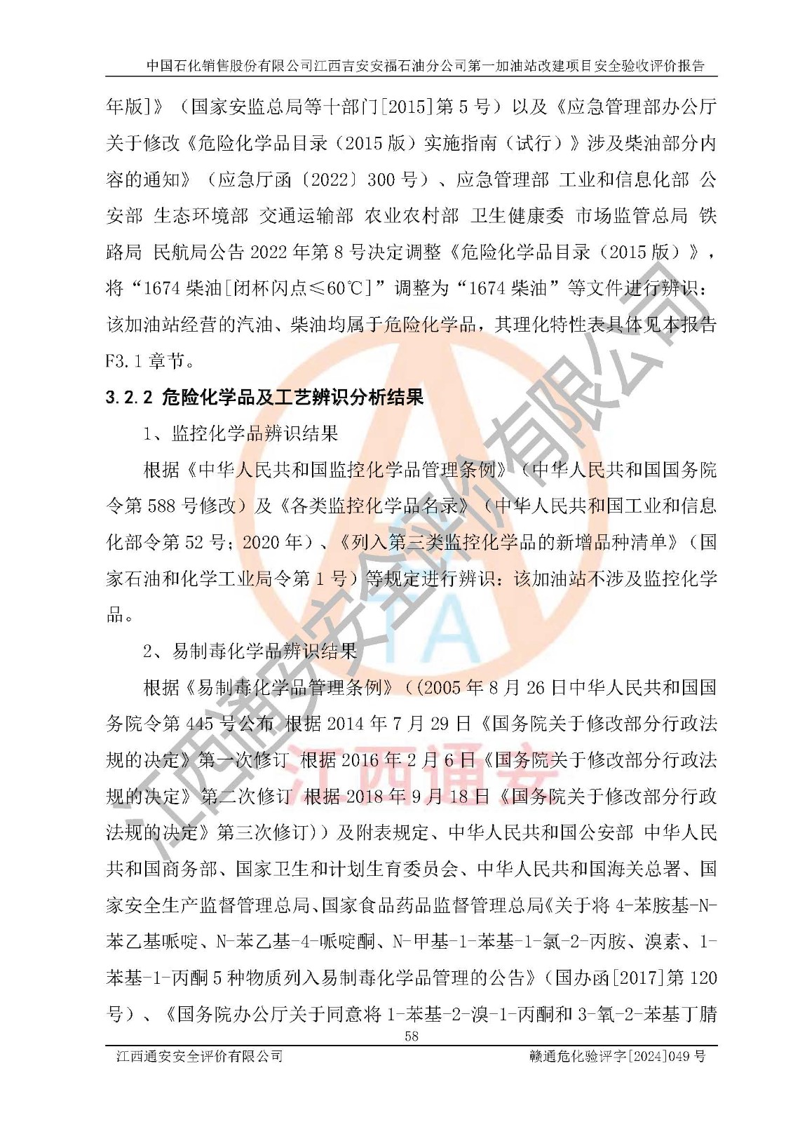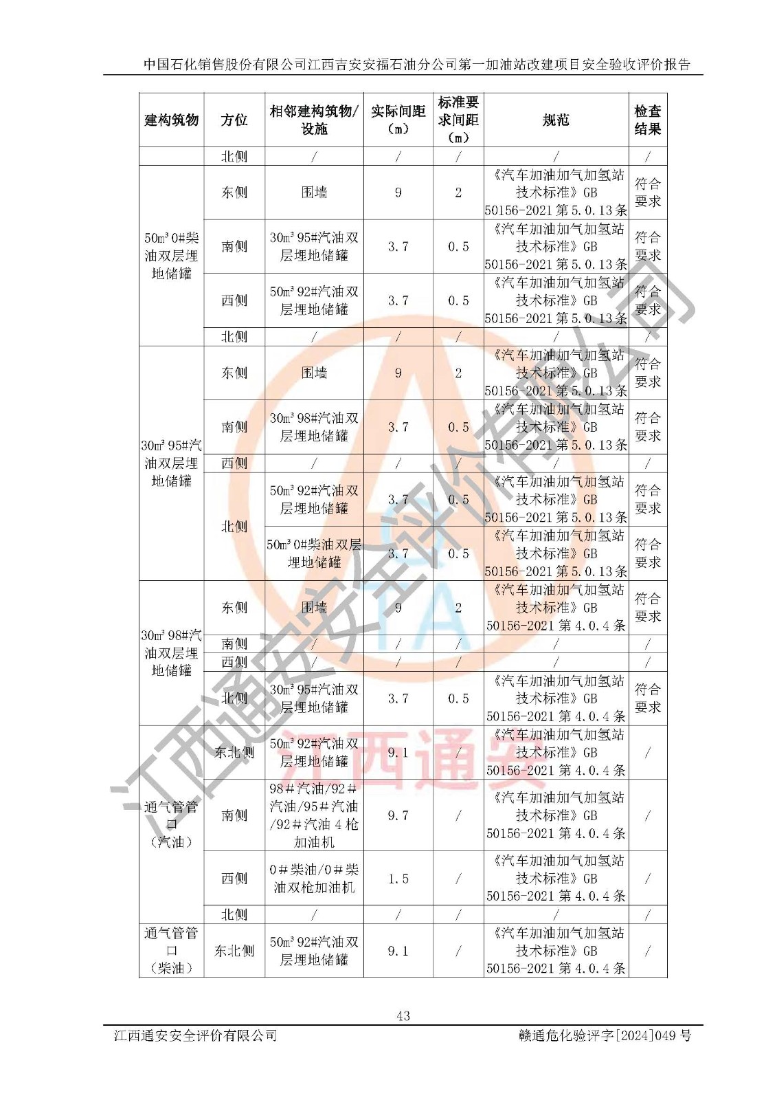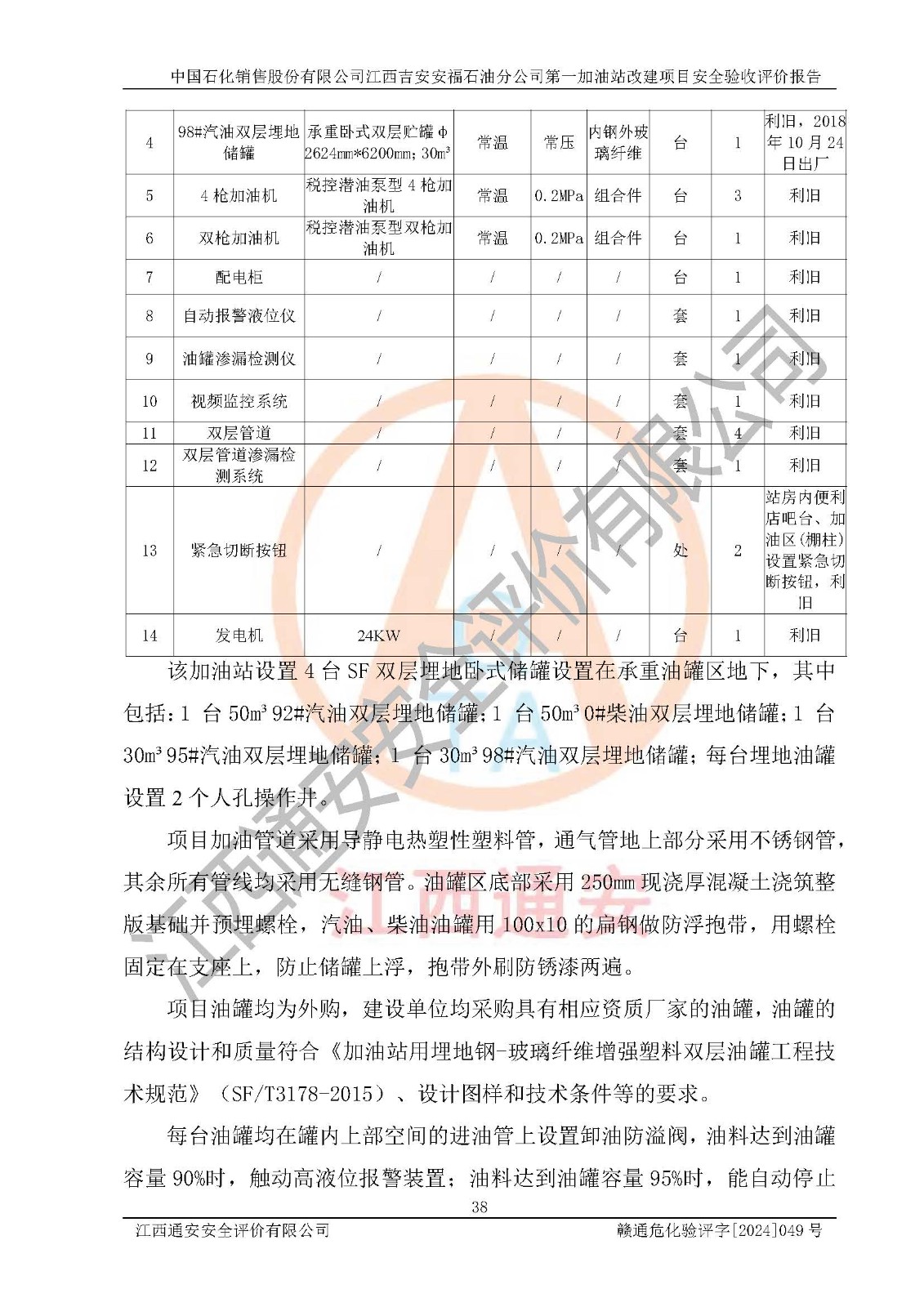 项目简介 | 中国石化销售股份有限公司江西吉安安福石油分公司**加油站成立于1994年4月12日,类型:外商投资企业分公司;负责人:彭璐;经营场所为江西省吉安市安福县城安莲路一**。该公司营业执照经营范围:许可项目:危险化学品经营,成品油仓储,成品油零售,成品油零售(不含危险化学品),**类增值电信业务,第二类增值电信业务,第三类医疗器械经营,出版物零售,**代理业务,***零售,发电业务、输电业务,供(配)电业务,互联网直播技术服务,酒类经营,食品销售,小食杂,网络文化经营,药品零售,燃气经营,烟草制品零售,出版物批发,旅游业务,住宿服务,餐饮服务,港口经营,保税仓库经营,保税物流中心经营(依法须经批准的项目,经相关部门批准后在许可**期内方可开展经营活动,具体经营项目和许可期限以有关部门批准文件或许可证件为准)一般项目:成品油批发(不含危险化学品),办公设备销售,电池销售,成品油仓储(不含危险化学品),轮胎销售,**类医疗器械销售,第二类医疗器械销售,低温仓储(不含危险化学品等需许可批准的项目),电动自行车销售,宠物食品及用品批发,电动汽车充电基础设施运营,非电力家用器具销售,化妆品批发,化妆品零售,个人卫生用品销售,会议及展览服务,金银制品销售,集中式**充电站,普通货物仓储服务(不含危险化学品等需许可批准的项目),人力资源服务(不含职业中介活动、劳务派遣服务),食品互联网销售(仅销售预包装食品),食用农产品销售,外卖递送服务,消毒剂销售(不含危险化学品),新能源汽车换电设施销售,站用加氧及储氢设施销售,钟表销售,**化学产品销售(不含危险化学品),保健食品(预包装)销售,针纺织品销售,服装服饰零售,日用品销售,五金产品零售,家用电器销售,单用途商业预付卡代理销售、电子产品销售,润滑油销售,石油制品销售,(不含危险化学品),户外用品销售,汽车销售,摩托车及零配件批发。摩托车及零配件零售,农副产品销售,化肥销售,农用薄膜销售,安防设备销售,礼品花卉销售,计算机软硬件及辅助设备零售,橡胶制品销售,机械设备销售,珠宝首饰批发,玩具销售,乐器批发,乐器零售,家具销售,建筑材料销售,机动车充电销售,技术服务、技术开发,技术咨询、技术交流、技术**,技术推广,机动车修理和维护,物业管理,停车场服务,居民日常生活服务,票务代理服务,广告制作,广告发布,广告设计、代理,洗车服务,信息咨询服务(不含许可类信息咨询服务),软件开发,货物进出口,食品进出口,技术进出口,进出口代理,汽车装饰用品销售,租赁服务(不含许可类租赁服务),小微型客车租赁经营服务(依法须经批准的项目,经相关部门批准后方可开展经营活动)。 该加油站于2024年4月29日经吉安市商务局核准变更换发成品油零售经营批准证书,证书编号:油零售证书第吉0338号。**期由2024年4月29日至2029年4月28日。于2022年12月23日由安福县应急管理局延期发放危险化学品经营许可证,证书编号:赣吉安经(甲)【2013】000095。**期由2022年12月23日至2025年12月22日。 为提升优化加油站的整体布局,在保障加油站站内设施与站外建(构)筑物安全间距条件下,更好满足运营服务的需求,中国石化销售股份有限公司江西吉安安福石油分公司**加油站决定在原址基础上进行改建,并于2023年5月4日获得安福县发展和改革委员会盖章的《江西省企业投资项目备案通知书》,同意该站在原址上改建。 该加油站改建前设有4个SF双层埋地储罐,分别为:1台50m³92#汽油双层埋地储罐,1台30m³的95#汽油双层埋地储罐;1 台50m³的0#柴油双层埋地储罐;1台30m³的98#汽油双层埋地储罐,柴油折半后总容积为 135 m³,属二级加油站。设有3台4枪潜油泵加油机,1台双枪潜油泵加油机,分别为:1台92#汽油/98#汽油/92#汽油/95#汽油4枪加油机,1台0#柴油/0#柴油双枪加油机,1台92#汽油/95#汽油/92#汽油/95#汽油4枪加油机,1台98#汽油/92#汽油/95#汽油/92#汽油4枪加油机。 改建后情况如下:将油罐区从站房左侧埋地移位至罩棚右侧承重埋地,洗车机从站区出口处移位至站区**处。型号大小不变,位置发生改变,加油站内其他设施利旧。更换后设置4台SF双层埋地储罐,其中包括:1台50m³92#汽油双层埋地储罐,1台30m³的95#汽油双层埋地储罐;1 台50m³的0#柴油双层埋地储罐;1台30m³的98#汽油双层埋地储罐,柴油折半后总容积为 135 m³,属二级加油站,加油站等级未发生变化。设有3台4枪潜油泵加油机,1台双枪潜油泵加油机,分别为:1台92#汽油/98#汽油/92#汽油/95#汽油4枪加油机,1台0#柴油/0#柴油双枪加油机,1台92#汽油/95#汽油/92#汽油/95#汽油4枪加油机,1台98#汽油/92#汽油/95#汽油/92#汽油4枪加油机。 中国石化销售股份有限公司江西吉安安福石油分公司**加油站2023年8月委托江西赣安安全生产科学技术咨询服务中心编制《中国石化销售股份有限公司江西吉安安福石油分公司**加油站改建项目安全预评价报告》,并于2023年8月29日取得《危险化学品建设项目安全条件备案告知意见书》(安福危化项目安条审字[2023]01号)。 中国石化销售股份有限公司江西吉安安福石油分公司**加油站2023年9月委托天津中德工程设计有限公司编制《中国石化销售股份有限公司江西吉安安福石油分公司**加油站改建项目安全设施设计》,并于2023年11月23日取得《危险化学品建设项目安全设施设计审查意见书》(安福危化项目安设审字〔2023〕01号)。 | ||||