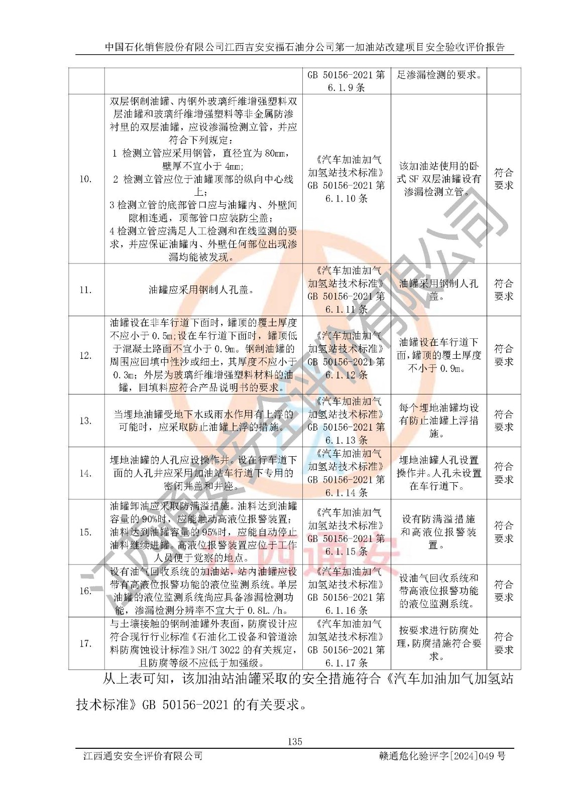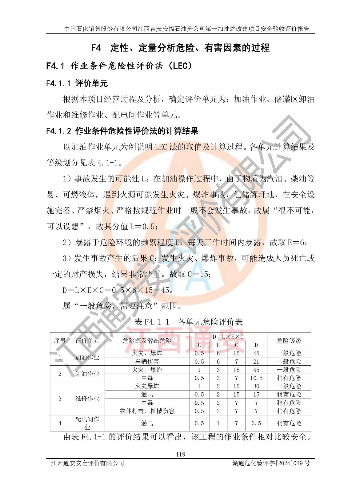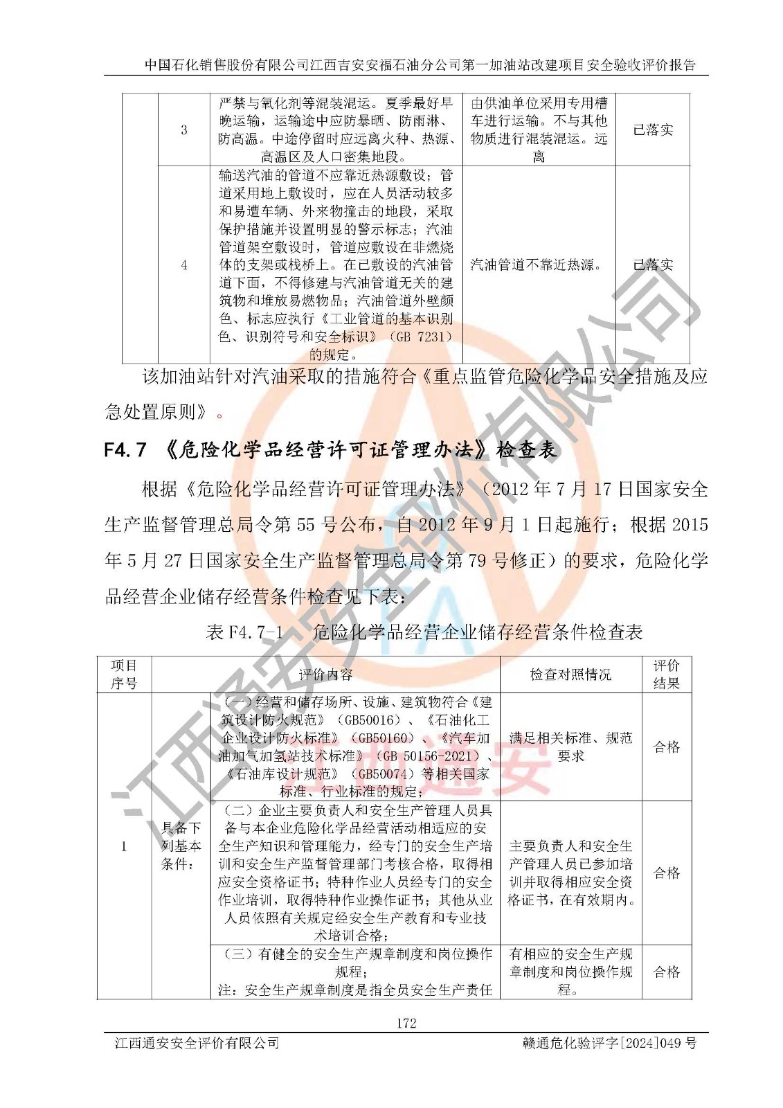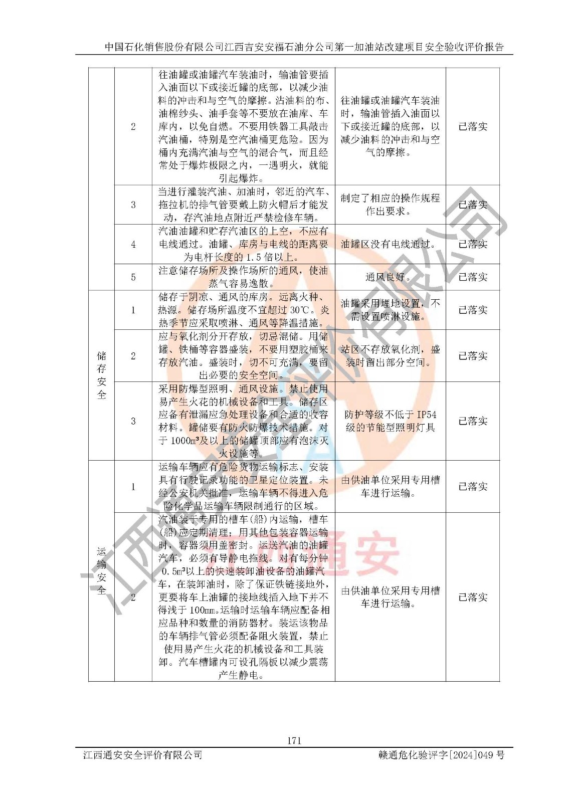 其它 | 在对该项目危险、有害因素辨识分析的基础上,运用安全检查表、预作业条件危险性分析法、危险度评价、重大事故后果分析结果等评价方法对该项目进行了分析评价,评价结果如下: 1、该项目位于江西省吉安市安福县城安莲路一**,符合当地规划,与周边环境的距离符合有关标准、规范的要求。 2、总图布置分区明确,布局合理,各建构筑物的防火间距满足规范要求。 3、该项目无**明令淘汰的工艺,设备、设施与工艺条件、内部介质相适应,特种设备及设施较齐全,按规定设置防雷、防静电接地,爆炸危险环境加油机按要求采用防爆型,符合相关标准规范要求。 5、企业设置了安全生产管理机构,配备了专职安全生产管理人员,建立了安全生产责任制和安全生产管理制度,编制了岗位操作规程,编制了生产安全事故应急预案,人员经过相应的培训,企业的安全生产管理正常。 6、作业条件危险性评价结果:在选定的评价单元中,作业危险程度均为“一般危险、需要注意”、“稍有危险,可以接受”作业环境,作业条件相对安全。 7、危险度评价结果:汽油储罐的危险程度为**危险。其设置了高液位远传报警系统,渗漏检测报警系统,埋地加油管道采用双层管道等,可以满足安全生产条件要求。 评价结论: 中国石化销售股份有限公司江西吉安安福石油分公司**加油站工艺设备和安全设施运行正常,安全管理机制运行正常,安全设施、措施达到设计要求和预期结果,可以满足建设项目安全生产的要求,安全生产管理**,项目具备**有关安全生产法律、法规、部门规章及标准规范要求的安全条件,符合经营和储存危险化学品的安全条件要求,具备安全验收的要求。 | ||||
