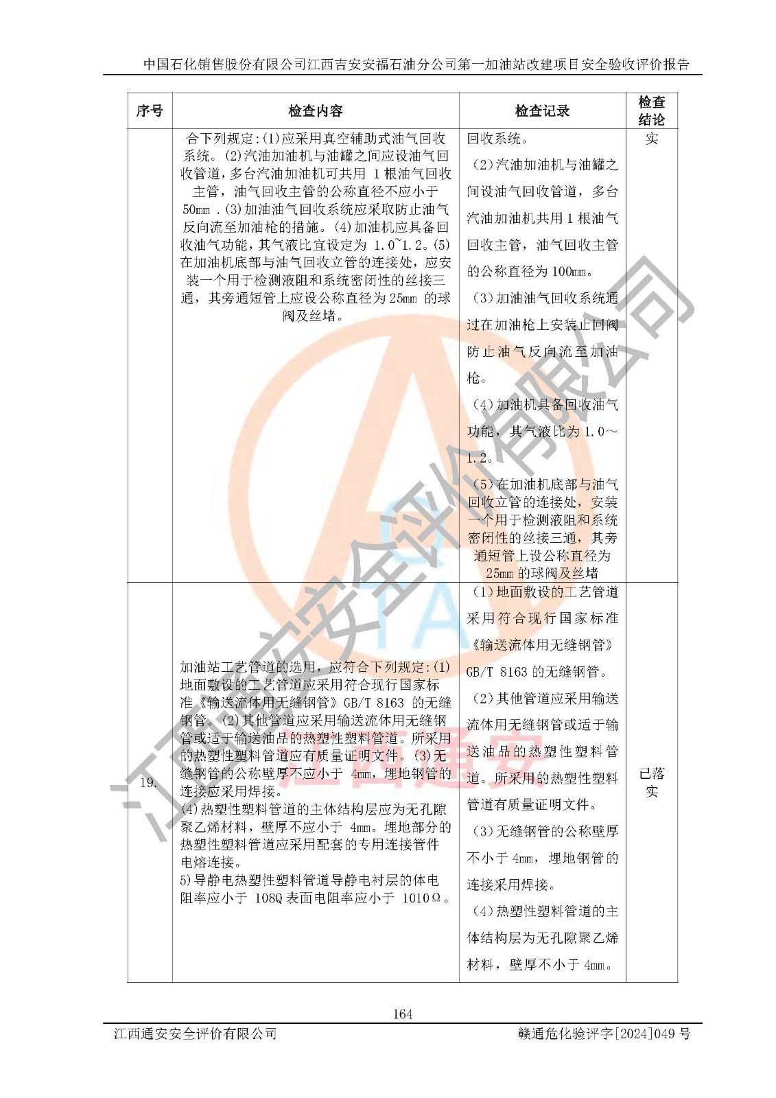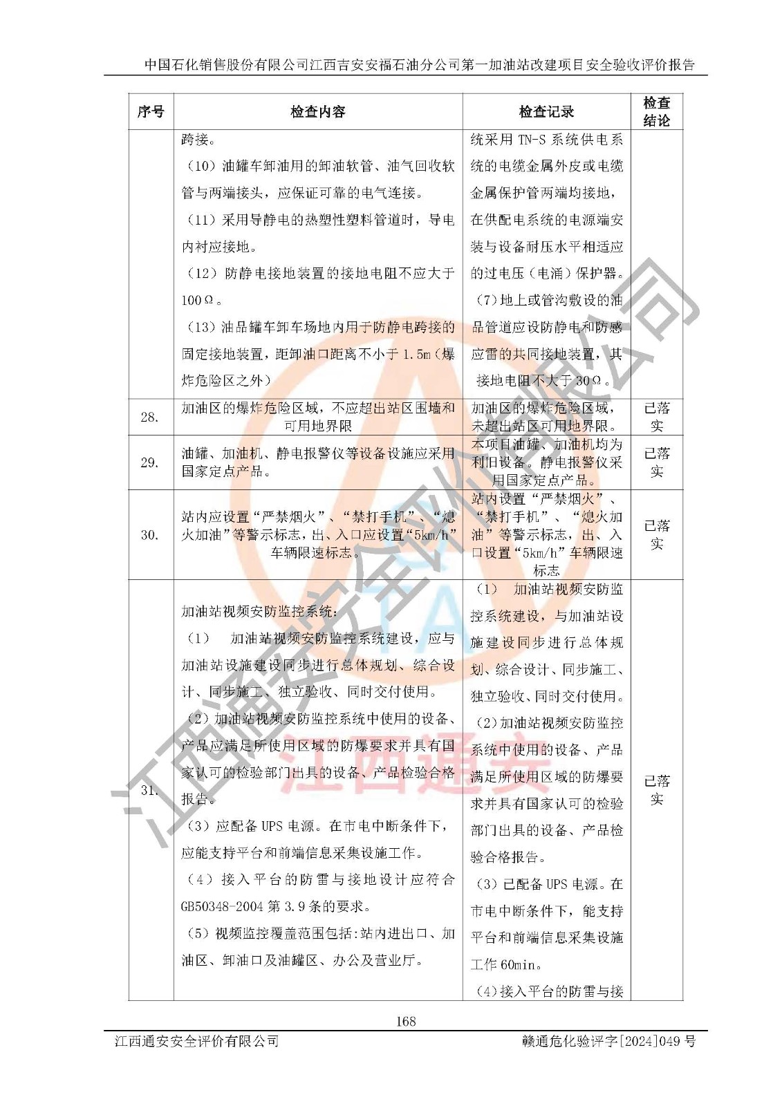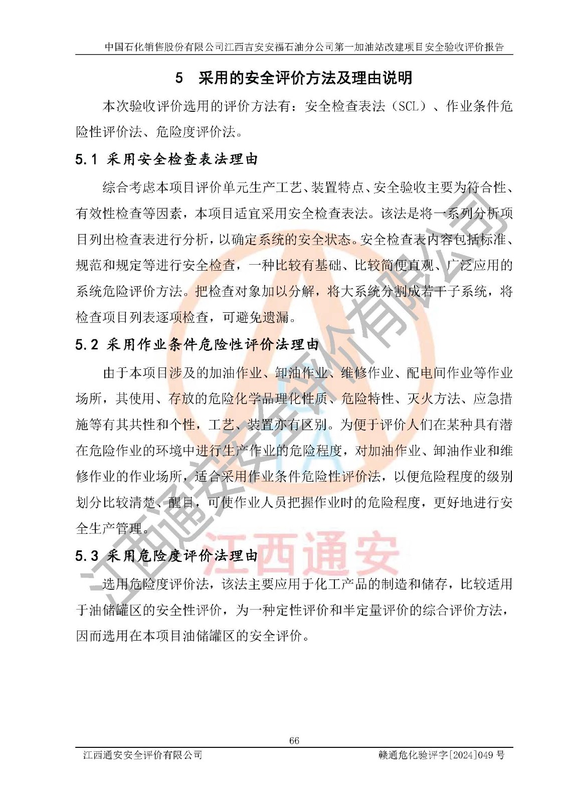其它 | 在对该项目危险、有害因素辨识分析的基础上,运用安全检查表、预作业条件危险性分析法、危险度评价、重大事故后果分析结果等评价方法对该项目进行了分析评价,评价结果如下: 1、该项目位于江西省吉安市安福县城安莲路一**,符合当地规划,与周边环境的距离符合有关标准、规范的要求。 2、总图布置分区明确,布局合理,各建构筑物的防火间距满足规范要求。 3、该项目无**明令淘汰的工艺,设备、设施与工艺条件、内部介质相适应,特种设备及设施较齐全,按规定设置防雷、防静电接地,爆炸危险环境加油机按要求采用防爆型,符合相关标准规范要求。 5、企业设置了安全生产管理机构,配备了专职安全生产管理人员,建立了安全生产责任制和安全生产管理制度,编制了岗位操作规程,编制了生产安全事故应急预案,人员经过相应的培训,企业的安全生产管理正常。 6、作业条件危险性评价结果:在选定的评价单元中,作业危险程度均为“一般危险、需要注意”、“稍有危险,可以接受”作业环境,作业条件相对安全。 7、危险度评价结果:汽油储罐的危险程度为**危险。其设置了高液位远传报警系统,渗漏检测报警系统,埋地加油管道采用双层管道等,可以满足安全生产条件要求。 评价结论: 中国石化销售股份有限公司江西吉安安福石油分公司**加油站工艺设备和安全设施运行正常,安全管理机制运行正常,安全设施、措施达到设计要求和预期结果,可以满足建设项目安全生产的要求,安全生产管理**,项目具备**有关安全生产法律、法规、部门规章及标准规范要求的安全条件,符合经营和储存危险化学品的安全条件要求,具备安全验收的要求。 | ||||