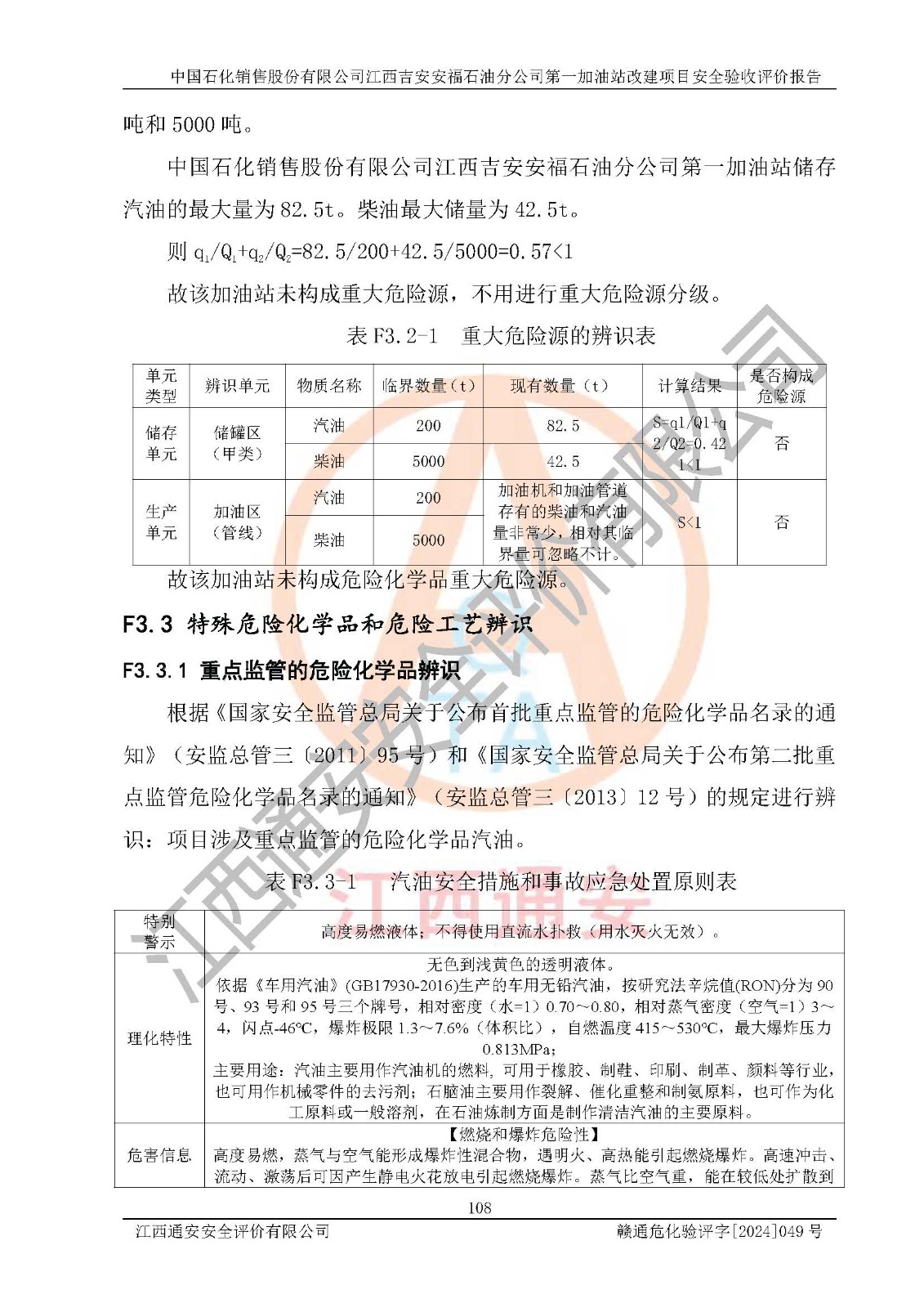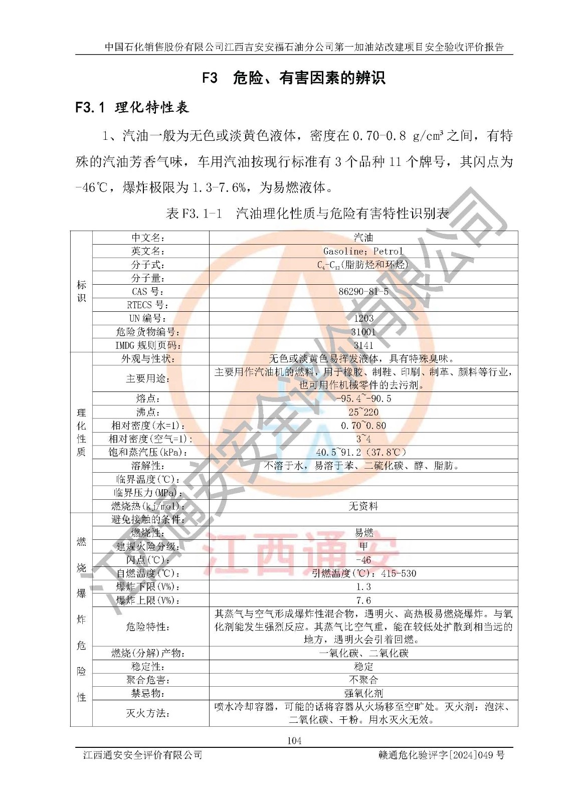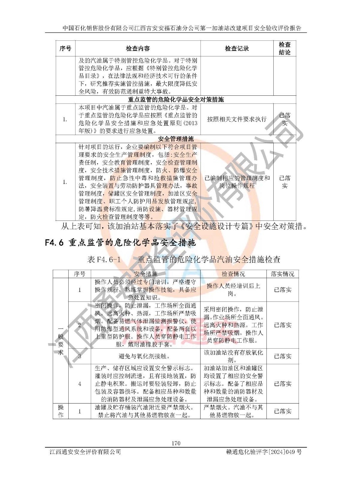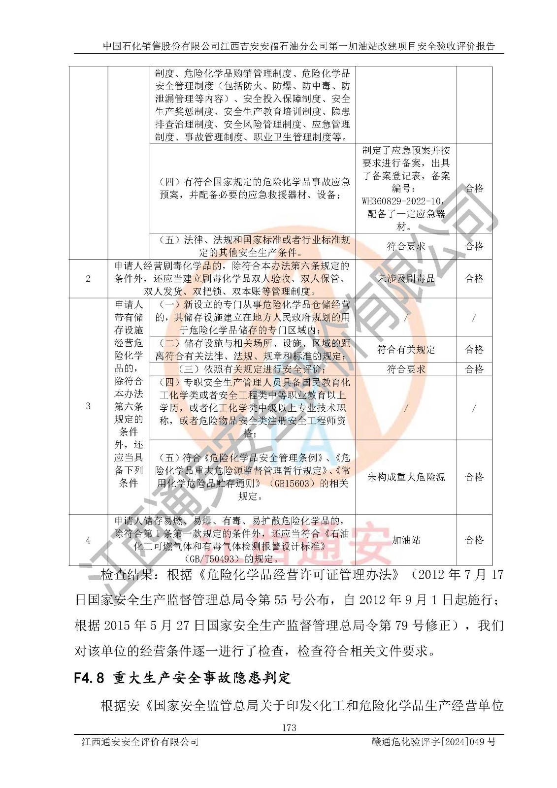 其它 | 在对该项目危险、有害因素辨识分析的基础上,运用安全检查表、预作业条件危险性分析法、危险度评价、重大事故后果分析结果等评价方法对该项目进行了分析评价,评价结果如下: 1、该项目位于江西省吉安市安福县城安莲路一**,符合当地规划,与周边环境的距离符合有关标准、规范的要求。 2、总图布置分区明确,布局合理,各建构筑物的防火间距满足规范要求。 3、该项目无**明令淘汰的工艺,设备、设施与工艺条件、内部介质相适应,特种设备及设施较齐全,按规定设置防雷、防静电接地,爆炸危险环境加油机按要求采用防爆型,符合相关标准规范要求。 5、企业设置了安全生产管理机构,配备了专职安全生产管理人员,建立了安全生产责任制和安全生产管理制度,编制了岗位操作规程,编制了生产安全事故应急预案,人员经过相应的培训,企业的安全生产管理正常。 6、作业条件危险性评价结果:在选定的评价单元中,作业危险程度均为“一般危险、需要注意”、“稍有危险,可以接受”作业环境,作业条件相对安全。 7、危险度评价结果:汽油储罐的危险程度为**危险。其设置了高液位远传报警系统,渗漏检测报警系统,埋地加油管道采用双层管道等,可以满足安全生产条件要求。 评价结论: 中国石化销售股份有限公司江西吉安安福石油分公司**加油站工艺设备和安全设施运行正常,安全管理机制运行正常,安全设施、措施达到设计要求和预期结果,可以满足建设项目安全生产的要求,安全生产管理**,项目具备**有关安全生产法律、法规、部门规章及标准规范要求的安全条件,符合经营和储存危险化学品的安全条件要求,具备安全验收的要求。 | ||||