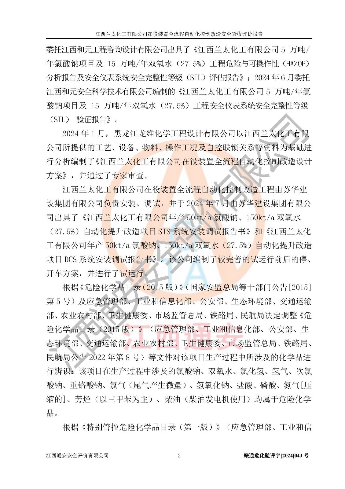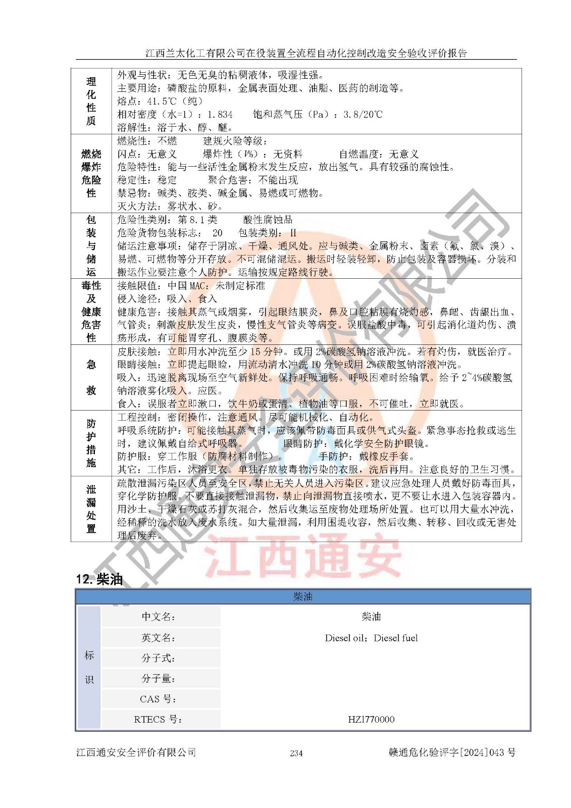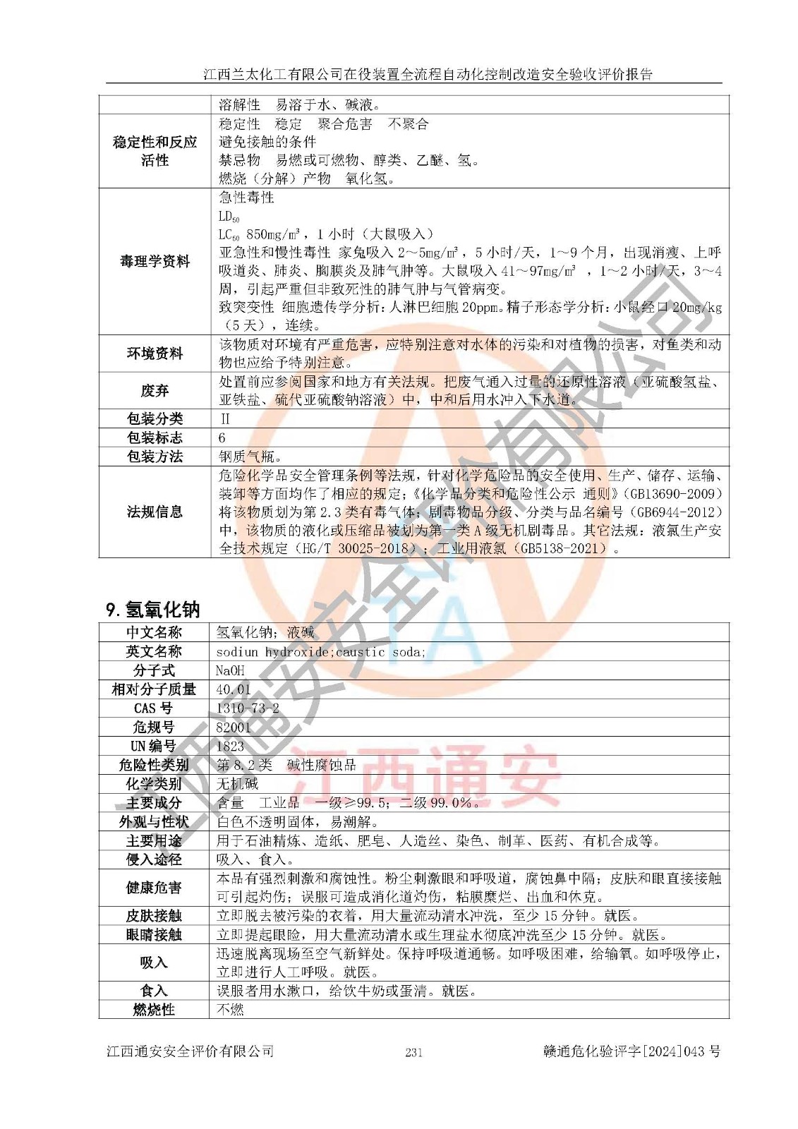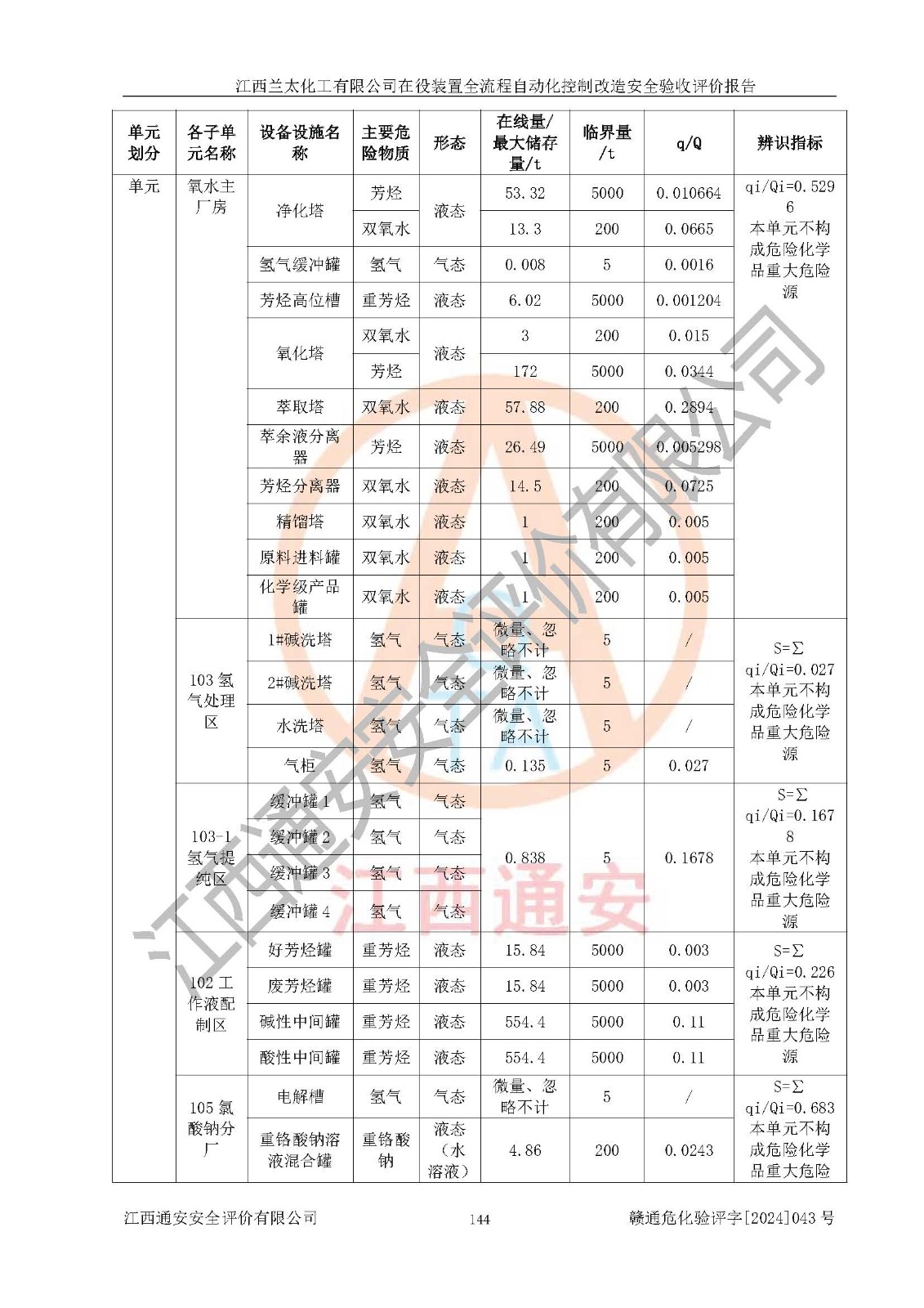 江西兰太化工有限公司于2008年5月成立,公司位于江西省吉安市新干县盐化工业城北区,公司法人**:李威。公司类型:有限责任公司(自然人投资或控股)。江西兰太化工有限公司是一家氯酸钠、双氧水产品的生产、销售(凭许可证**期限经营);化工产品(不含化学危险品及易制毒化学品)批发及零售;进出口经营权。(依法须经批准的项目经相关部门批准后方可开展经营活动)的有限责任公司。 江西兰太化工有限公司现有安全生产许可证**期至2024年8月30日,证书编号:(赣) WH 安许证字【2012】 0714 号,许可范围:氯酸钠 (50kt/a ) 、双氧水 (27.5%、 35% 、50% ,折合 27.5% 、150kt/a )。 项目生产过程中涉及的物料和成品中属于危险化学品的有:氯酸钠、双氧水、氯化氢、氢气、次氯酸钠、重铬酸钠、氯气(尾气产生微量)、氢氧化钠、盐酸、磷酸、氮气[压缩的]、芳烃(以**苯为主)、柴油(柴油发电机使用)等。项目涉及的盐酸属于第三类易制毒化学品。不涉及的重点监管的危险化学品。该工程涉及的氯气(尾气产生微量)属于剧毒化学品。该工程涉及的氯气(尾气产生微量)、重铬酸钠属于高毒物品。该工程涉及的重铬酸钠、氯酸钠、双氧水属于易制爆化学品。项目氯酸钠生产过程中的电解反应和双氧水生产过程的氢化反应、过氧化反应均为重点监管的危险化工工艺。公司201罐区构成三级危险化学品重大危险源,202氯酸钠危险化学品仓库、205氯酸钠危险化学品仓库、206氯酸钠危险化学品仓库分别构成四级危险化学品重大危险源。 |