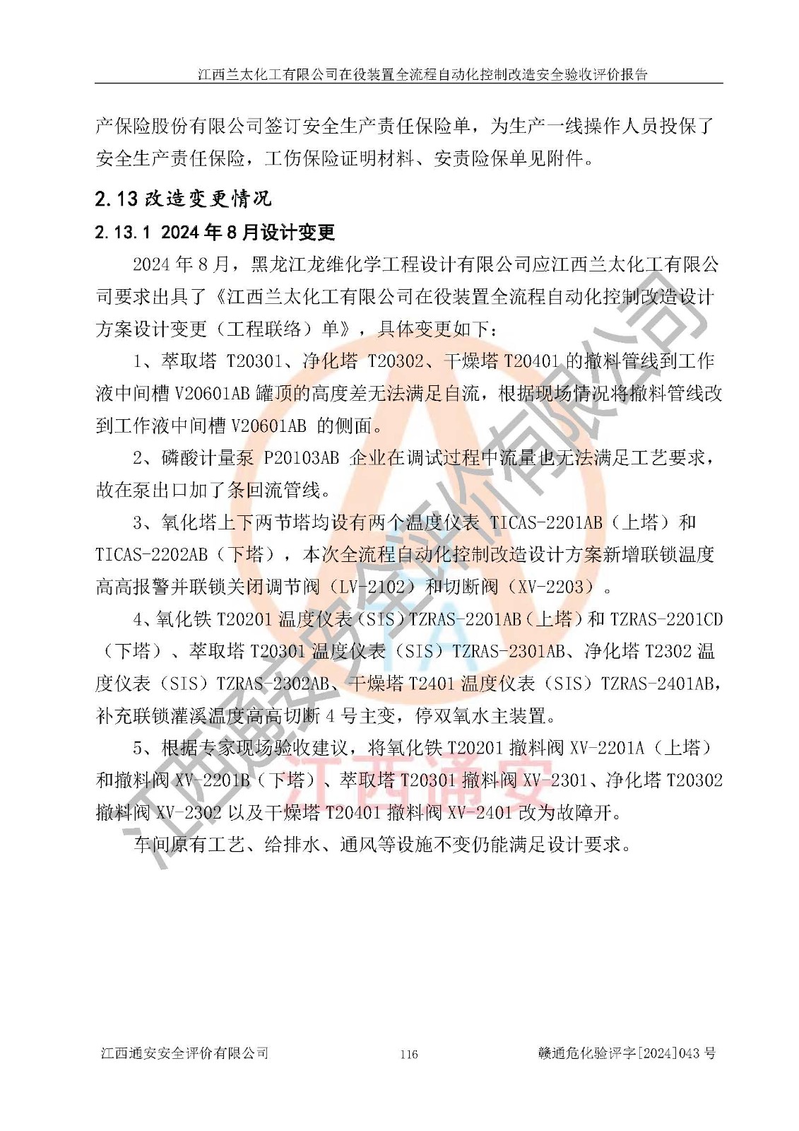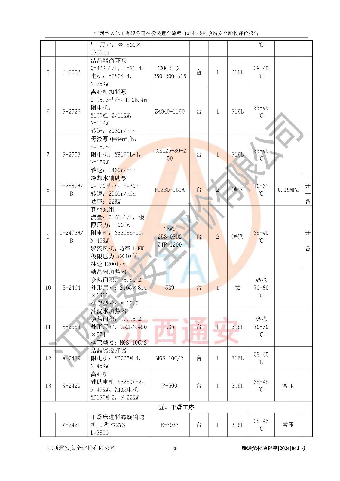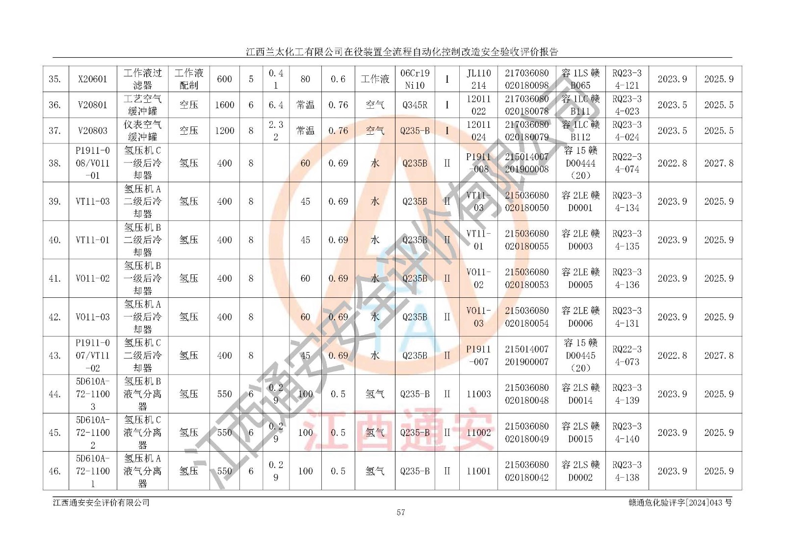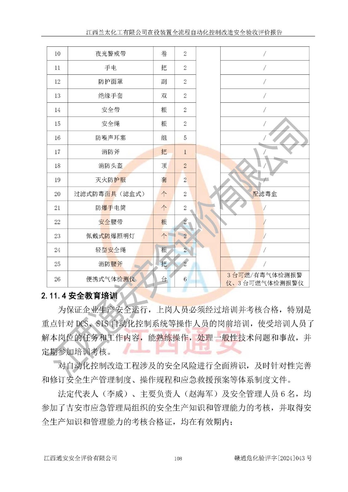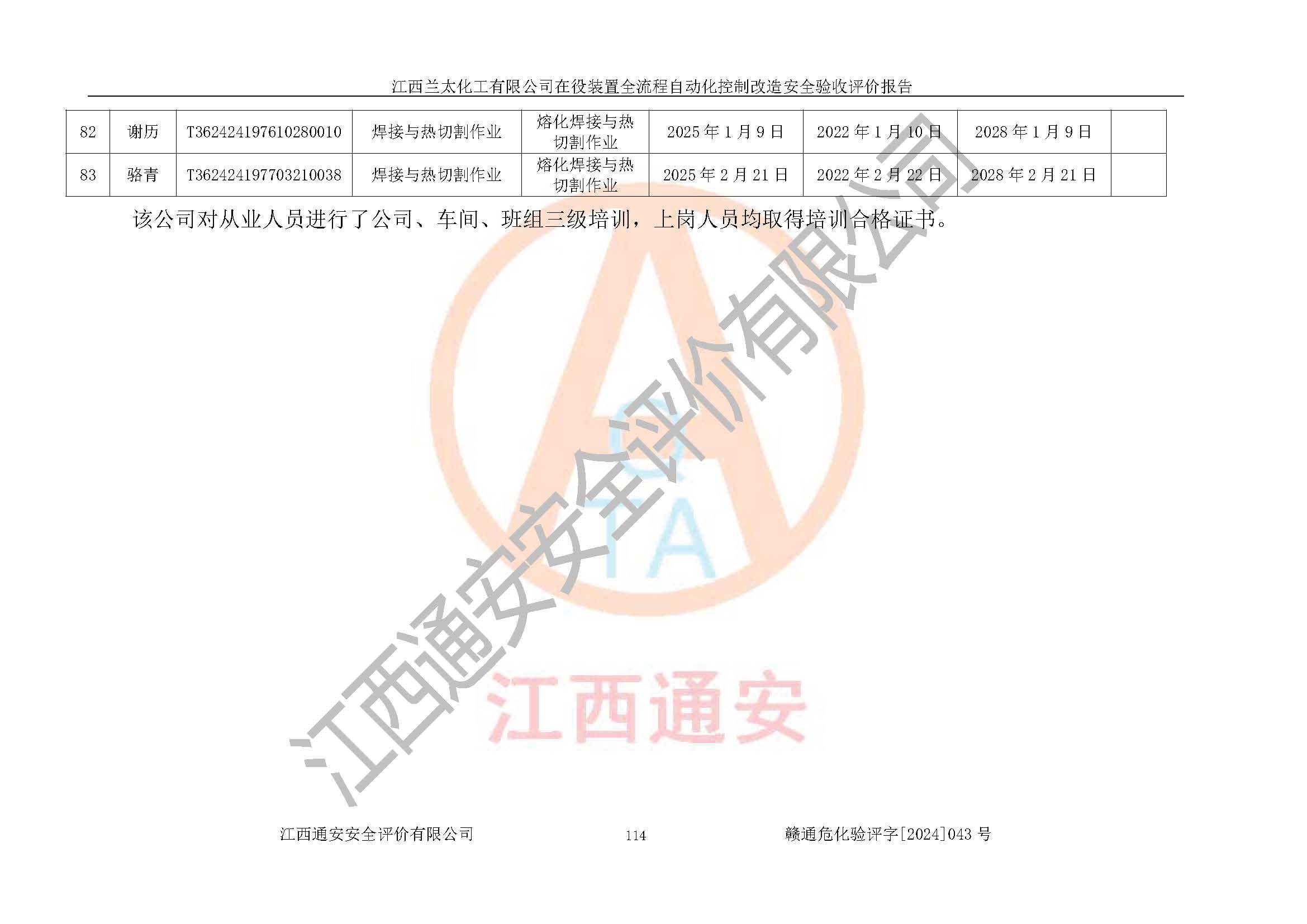 江西兰太化工有限公司于2008年5月成立,公司位于江西省吉安市新干县盐化工业城北区,公司法人**:李威。公司类型:有限责任公司(自然人投资或控股)。江西兰太化工有限公司是一家氯酸钠、双氧水产品的生产、销售(凭许可证**期限经营);化工产品(不含化学危险品及易制毒化学品)批发及零售;进出口经营权。(依法须经批准的项目经相关部门批准后方可开展经营活动)的有限责任公司。 江西兰太化工有限公司现有安全生产许可证**期至2024年8月30日,证书编号:(赣) WH 安许证字【2012】 0714 号,许可范围:氯酸钠 (50kt/a ) 、双氧水 (27.5%、 35% 、50% ,折合 27.5% 、150kt/a )。 项目生产过程中涉及的物料和成品中属于危险化学品的有:氯酸钠、双氧水、氯化氢、氢气、次氯酸钠、重铬酸钠、氯气(尾气产生微量)、氢氧化钠、盐酸、磷酸、氮气[压缩的]、芳烃(以**苯为主)、柴油(柴油发电机使用)等。项目涉及的盐酸属于第三类易制毒化学品。不涉及的重点监管的危险化学品。该工程涉及的氯气(尾气产生微量)属于剧毒化学品。该工程涉及的氯气(尾气产生微量)、重铬酸钠属于高毒物品。该工程涉及的重铬酸钠、氯酸钠、双氧水属于易制爆化学品。项目氯酸钠生产过程中的电解反应和双氧水生产过程的氢化反应、过氧化反应均为重点监管的危险化工工艺。公司201罐区构成三级危险化学品重大危险源,202氯酸钠危险化学品仓库、205氯酸钠危险化学品仓库、206氯酸钠危险化学品仓库分别构成四级危险化学品重大危险源。 |