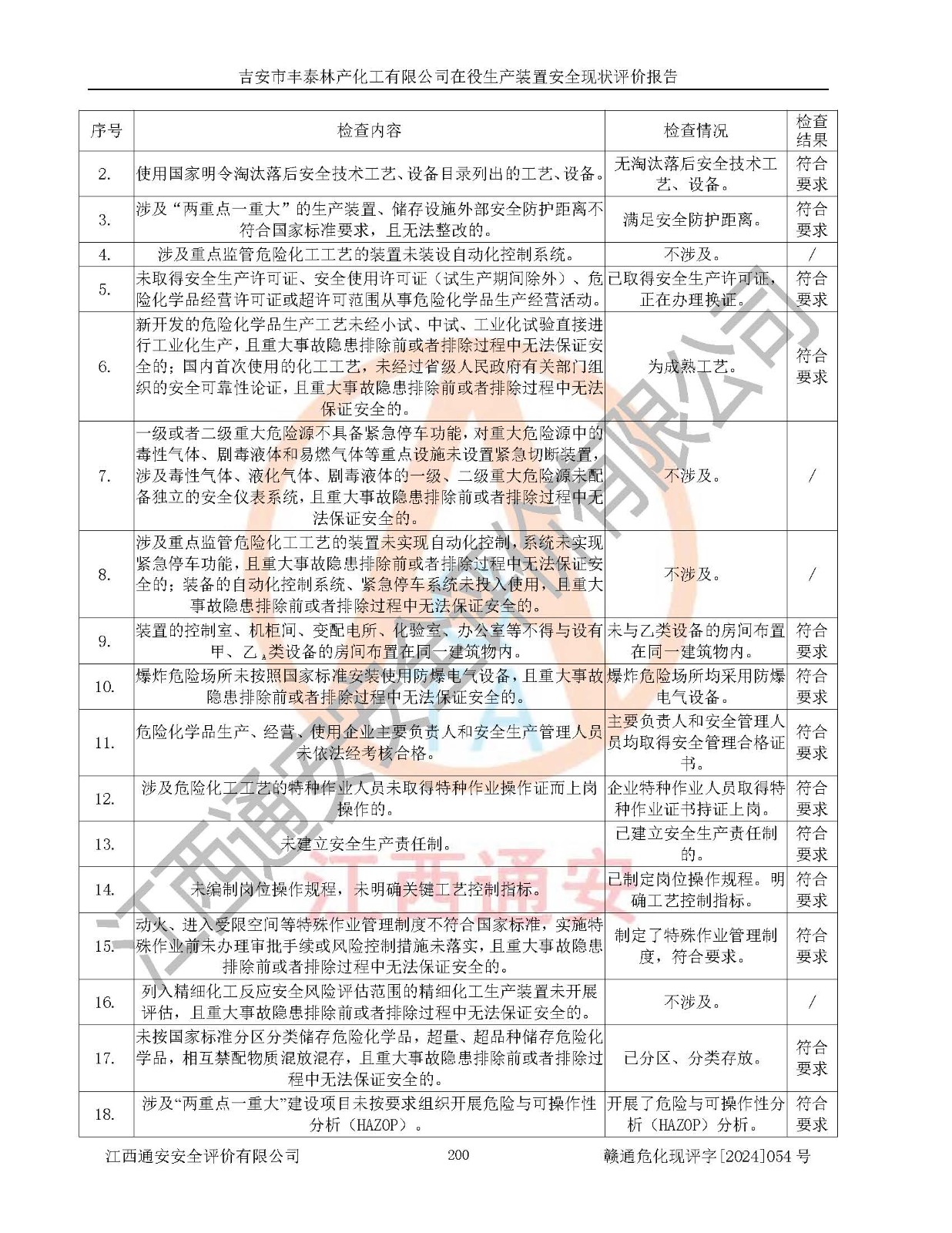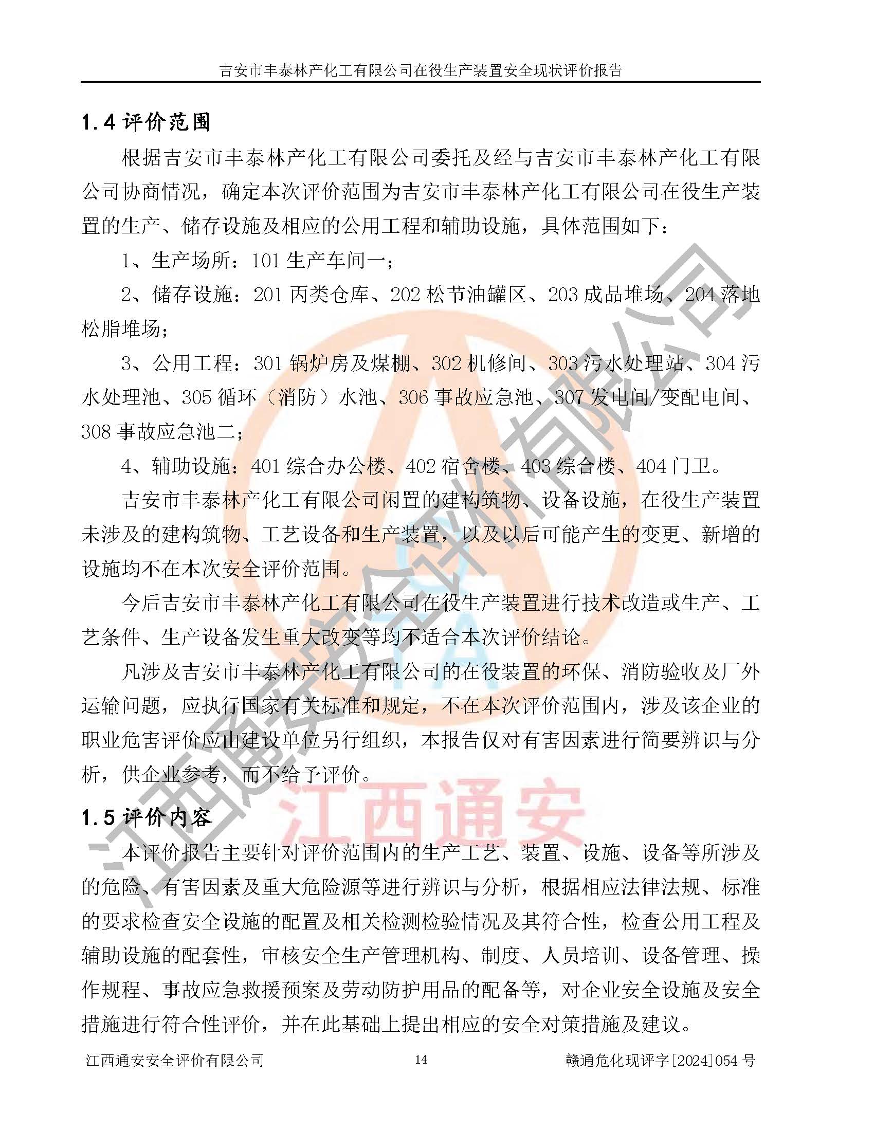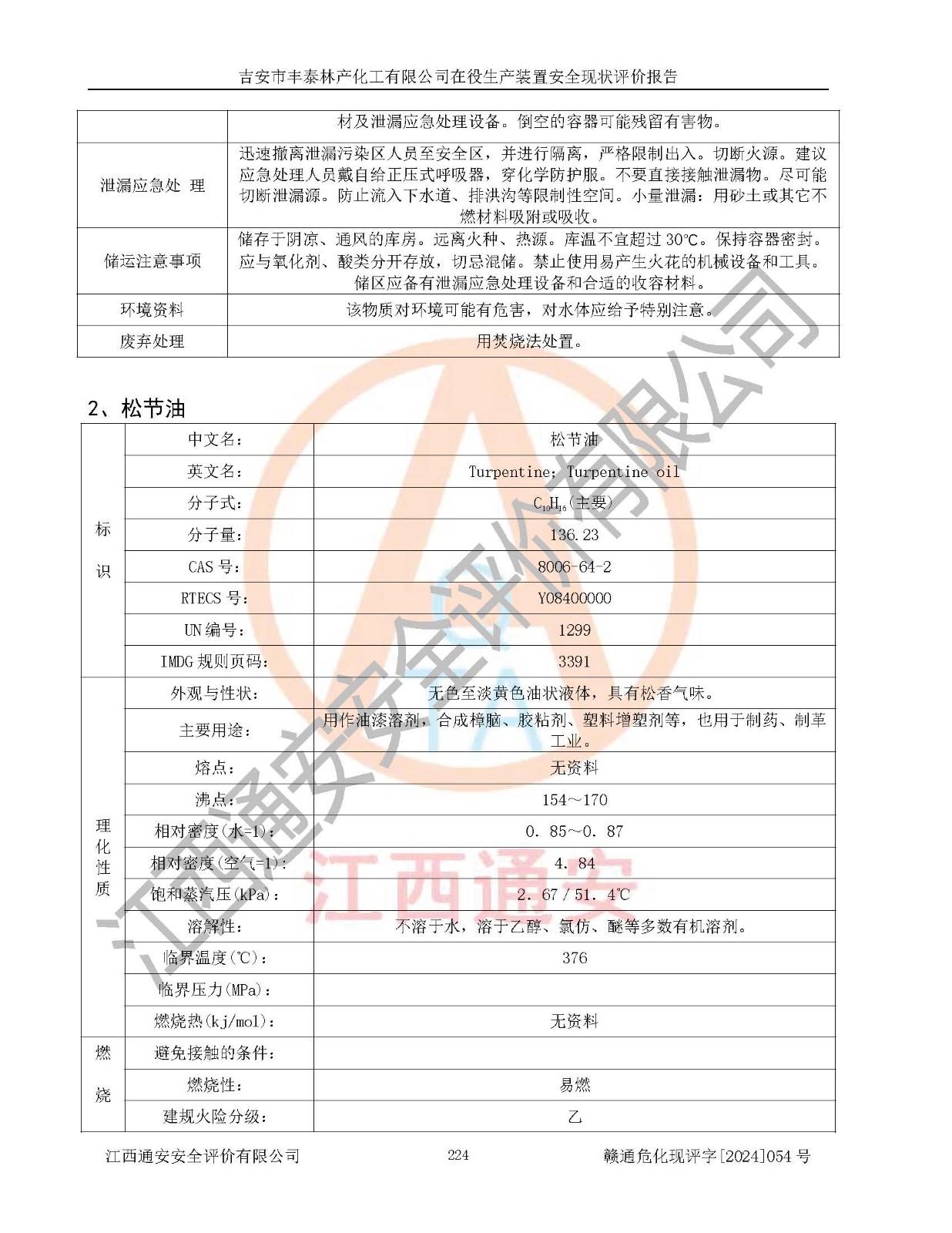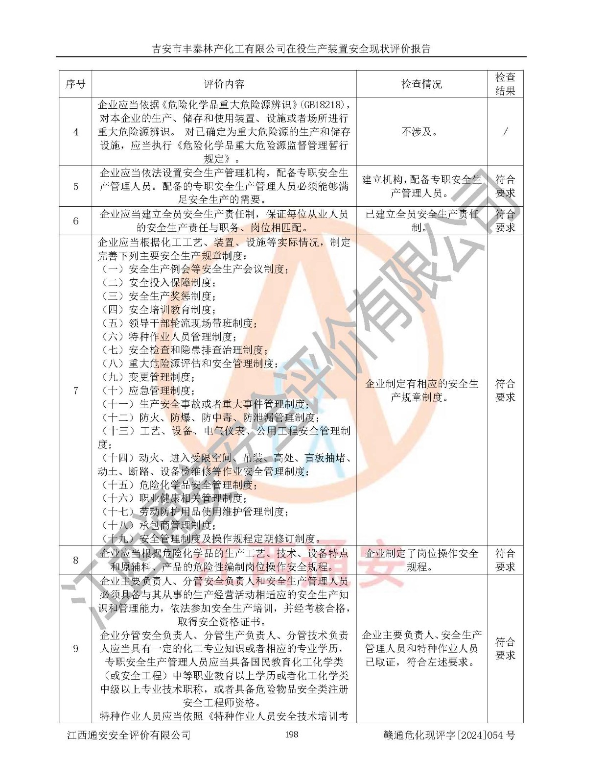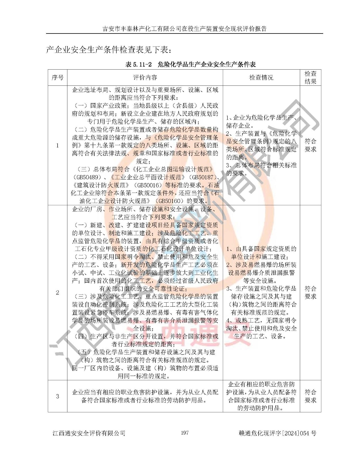 评价结论 | 评价结论:本报告认为,吉安市丰泰林产化工有限公司在役生产装置现场情况与设计图纸一致,有关从业人员资格符合《江西省危险化学品安全专项整治三年行动实施方案》要求,安全设施及安全管理符合**及有关部门关于安全生产法律法规、标准的要求,安全设施正常投用且运行**,安全风险是可以控制的,其风险程度是可以接受的,安全现状符合安全生产条件,能够满足安全生产的要求。 | |||