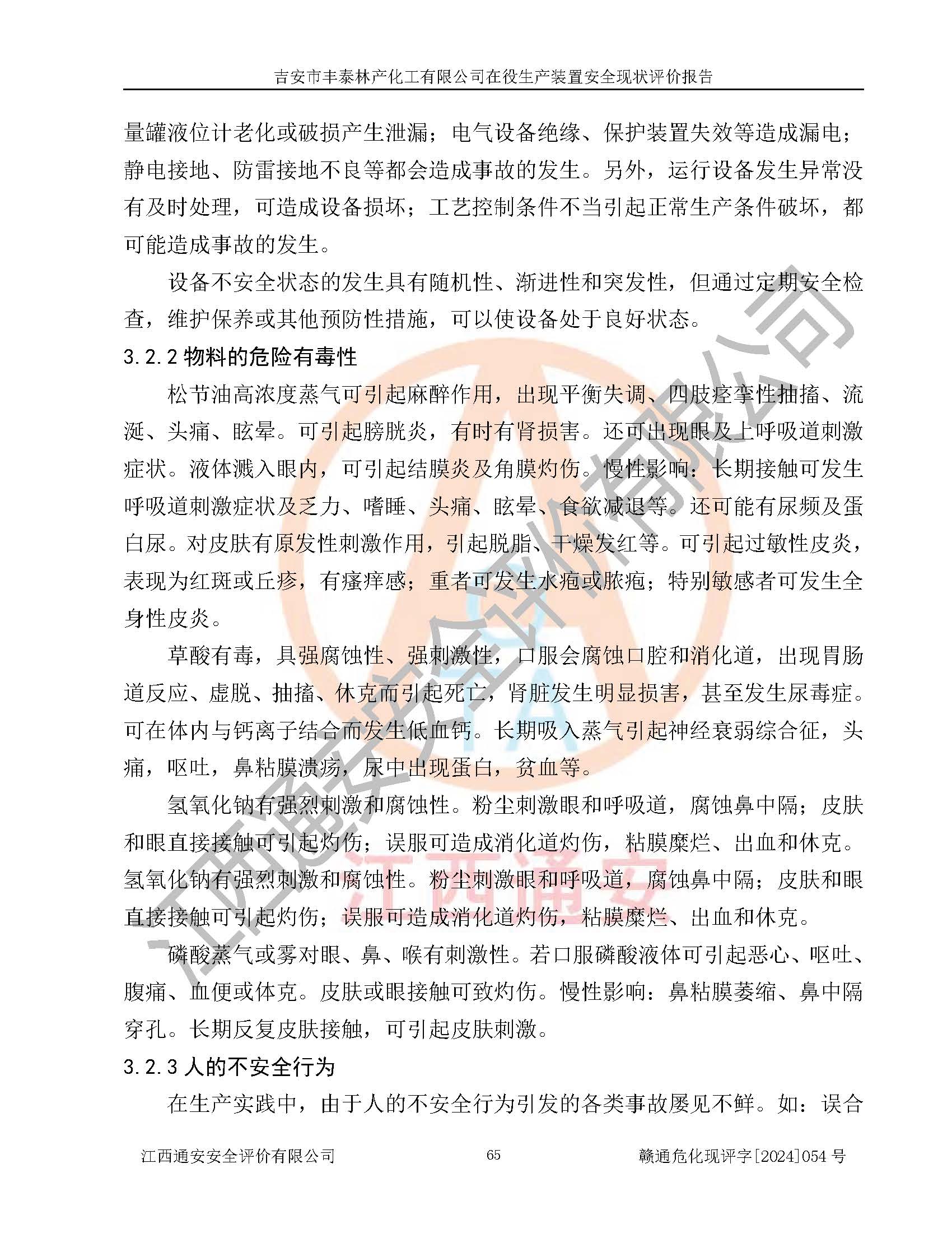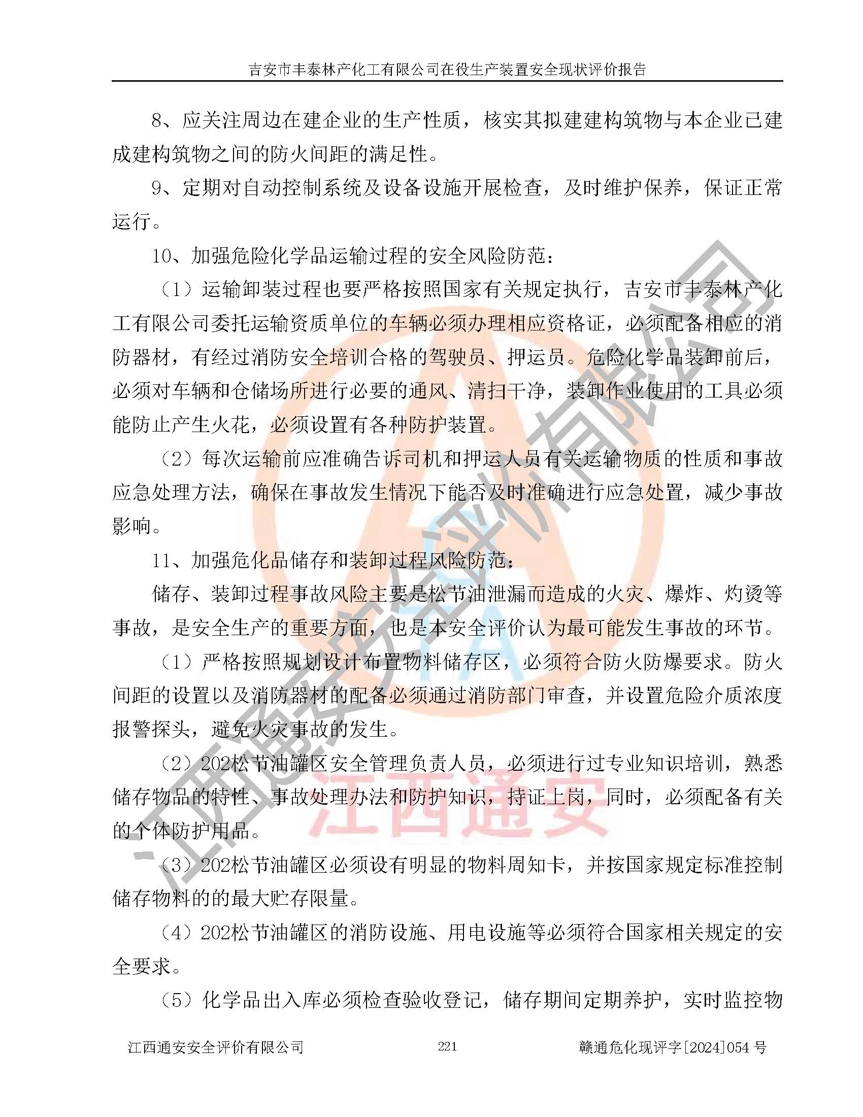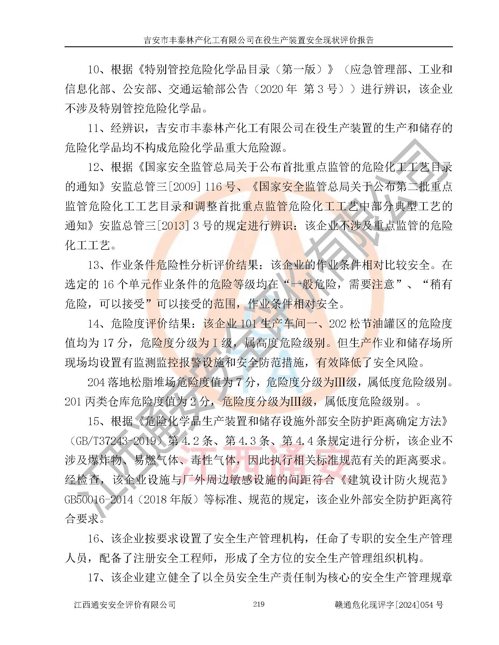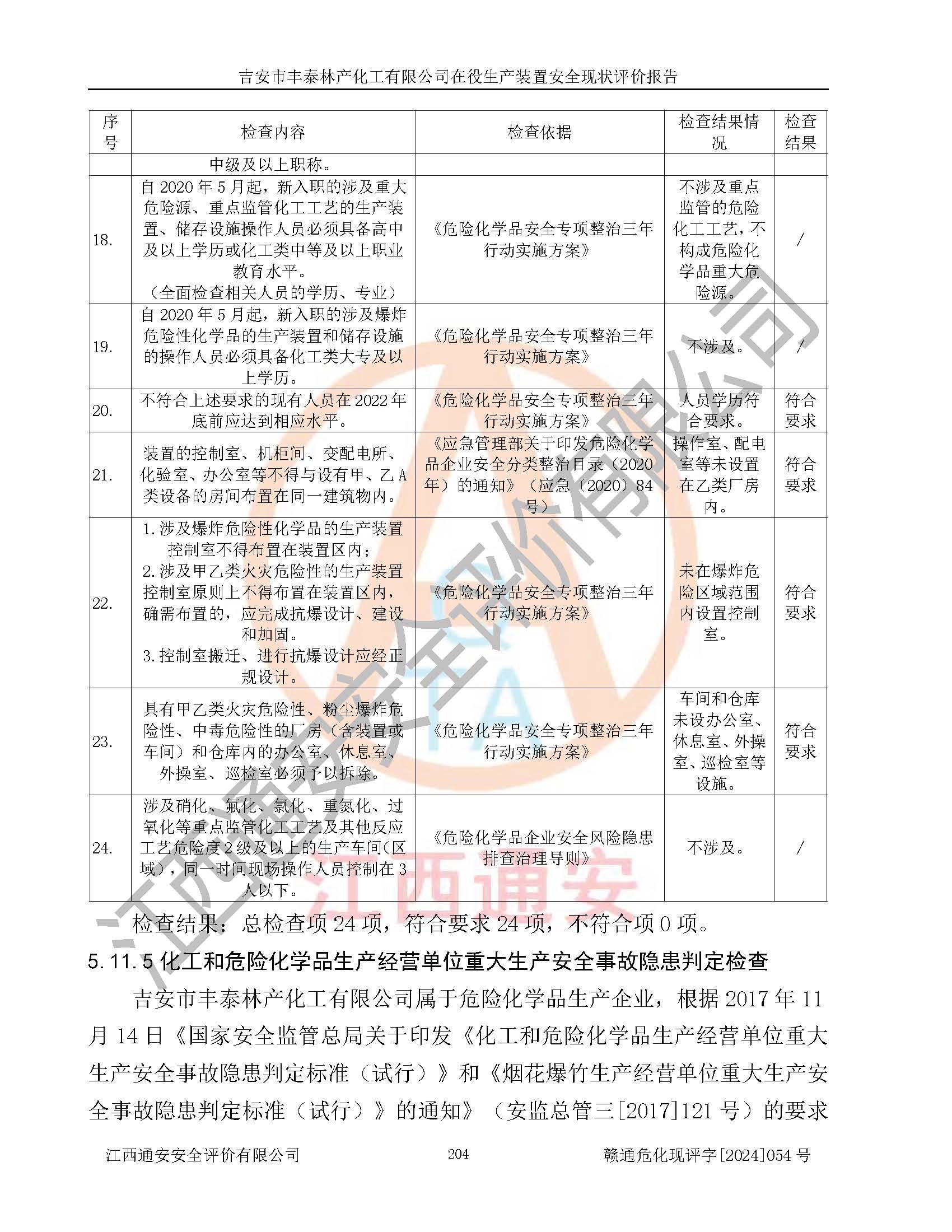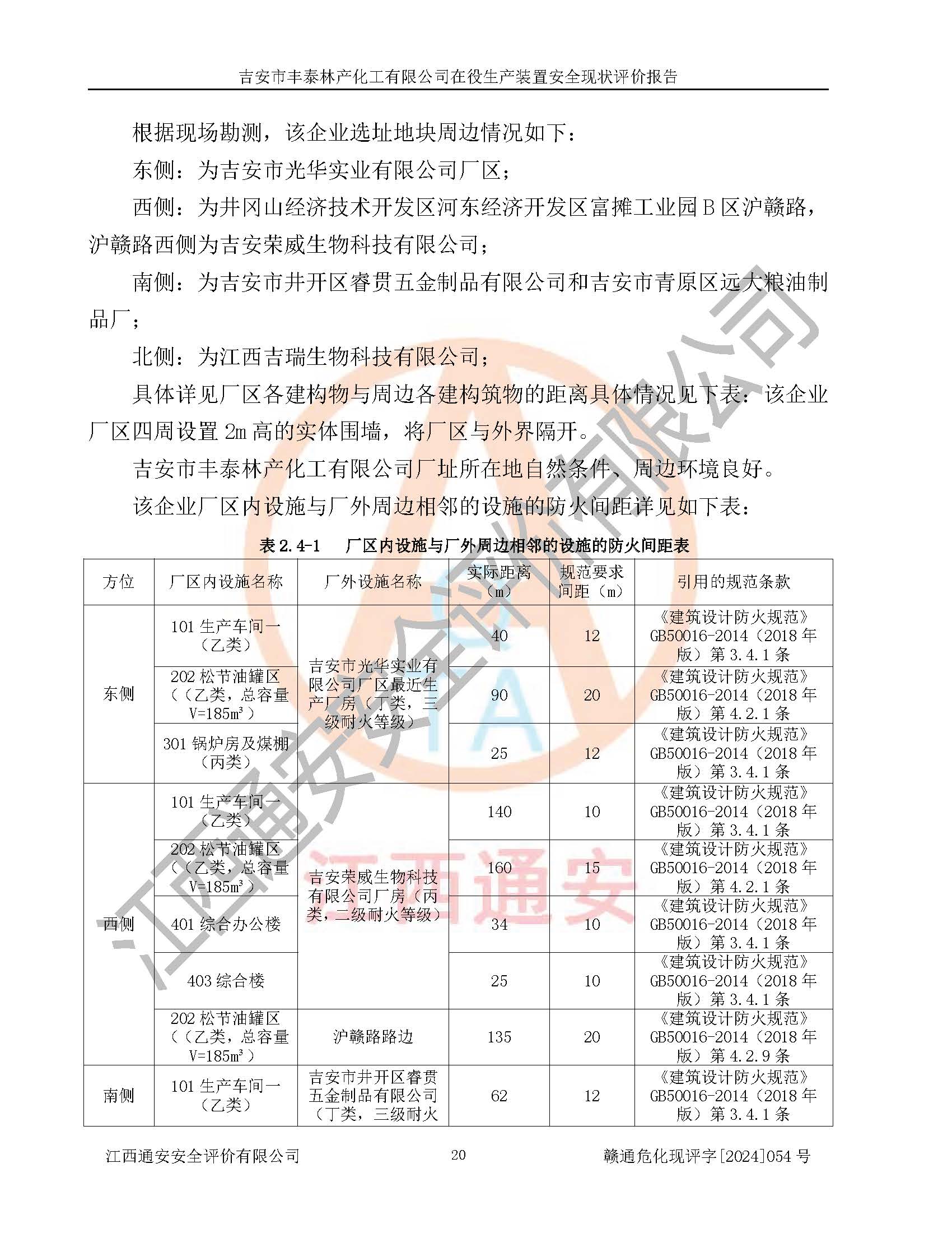 评价结论 | 评价结论:本报告认为,吉安市丰泰林产化工有限公司在役生产装置现场情况与设计图纸一致,有关从业人员资格符合《江西省危险化学品安全专项整治三年行动实施方案》要求,安全设施及安全管理符合**及有关部门关于安全生产法律法规、标准的要求,安全设施正常投用且运行**,安全风险是可以控制的,其风险程度是可以接受的,安全现状符合安全生产条件,能够满足安全生产的要求。 | |||