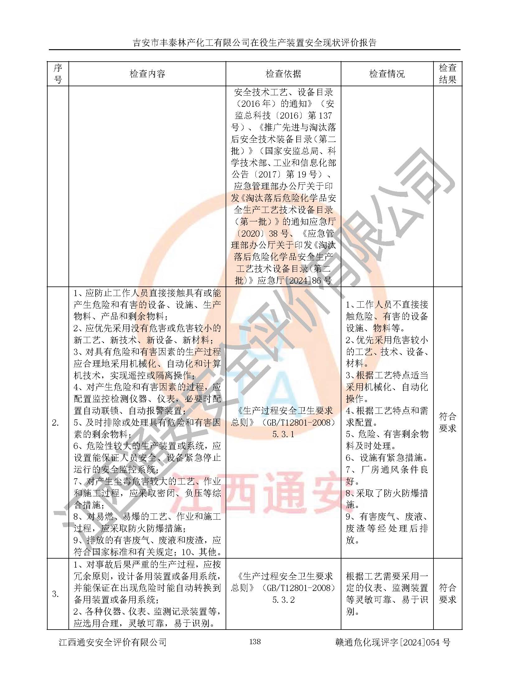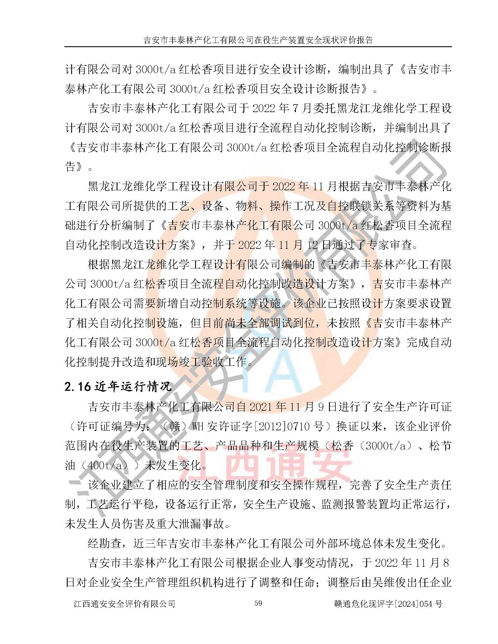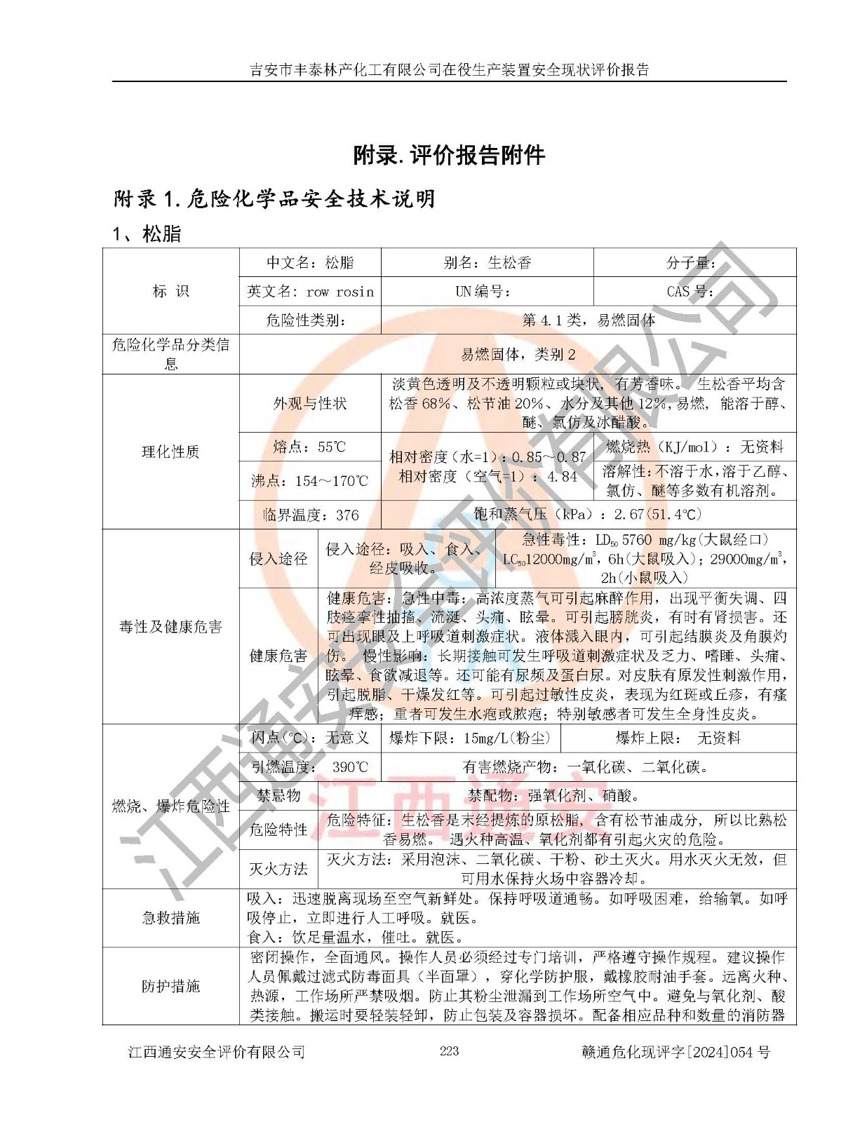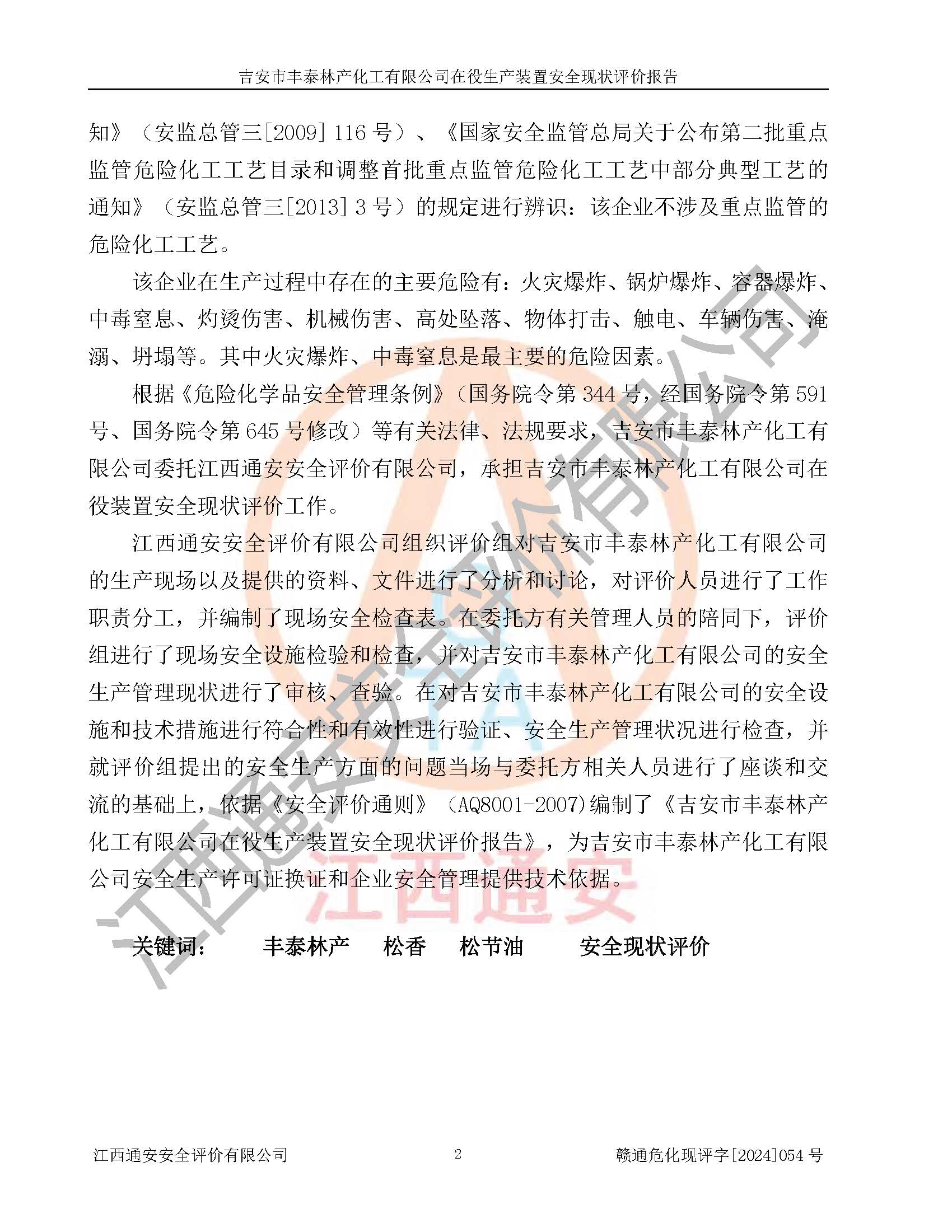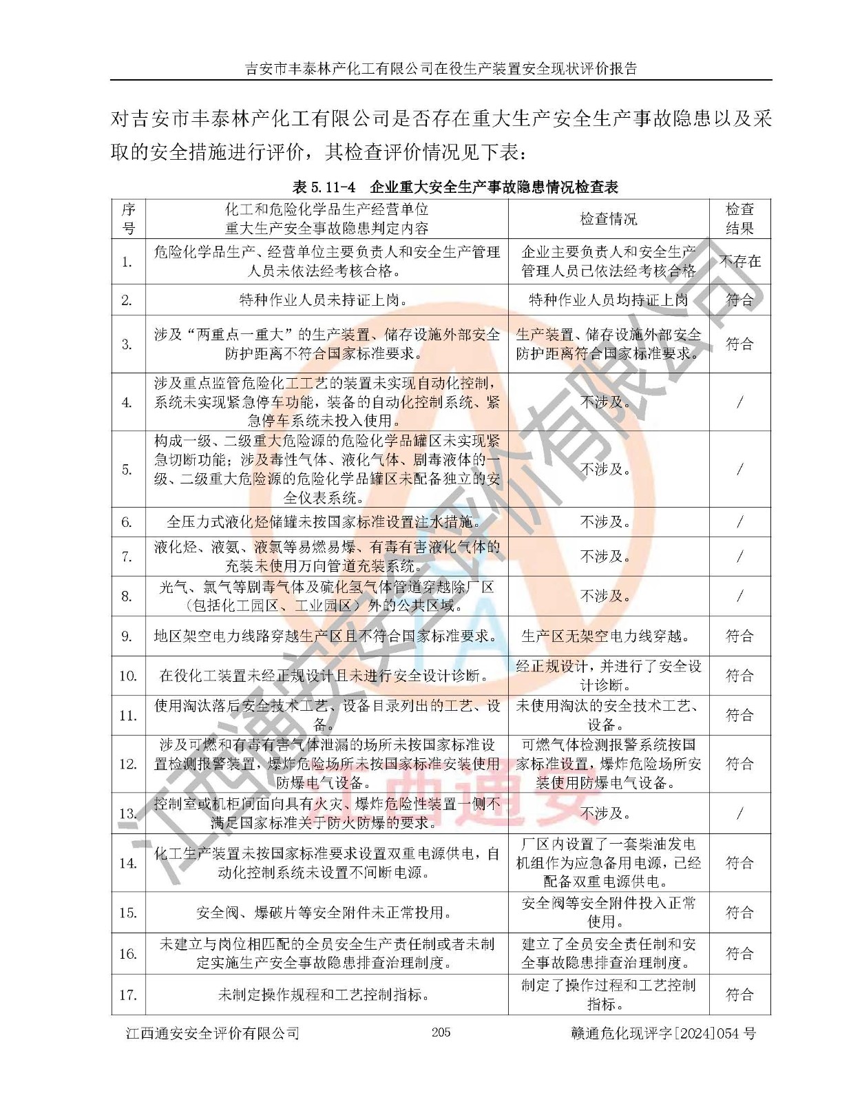 评价结论 | 评价结论:本报告认为,吉安市丰泰林产化工有限公司在役生产装置现场情况与设计图纸一致,有关从业人员资格符合《江西省危险化学品安全专项整治三年行动实施方案》要求,安全设施及安全管理符合**及有关部门关于安全生产法律法规、标准的要求,安全设施正常投用且运行**,安全风险是可以控制的,其风险程度是可以接受的,安全现状符合安全生产条件,能够满足安全生产的要求。 | |||