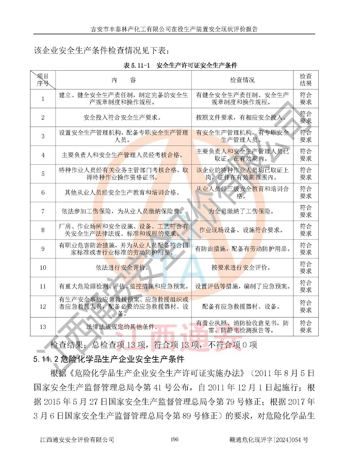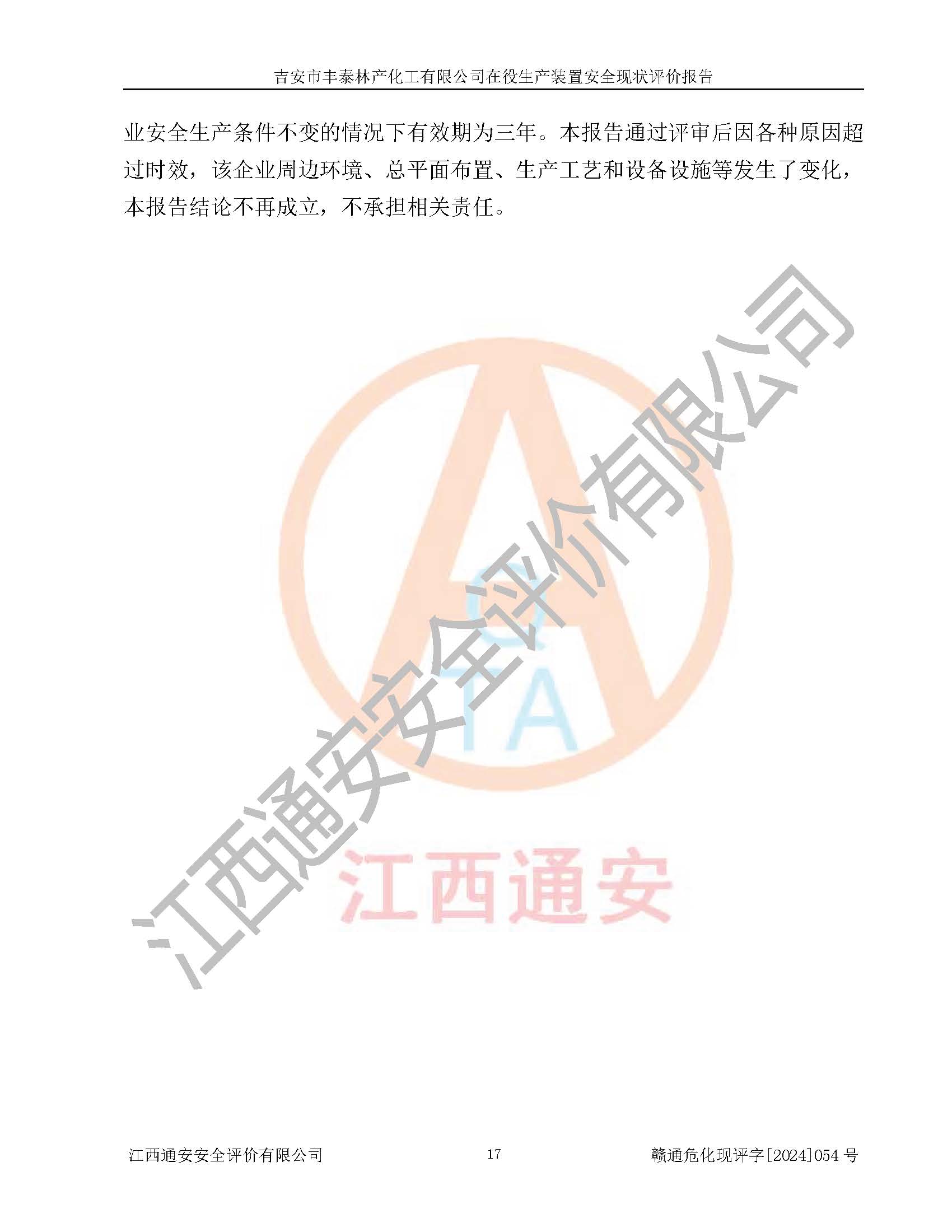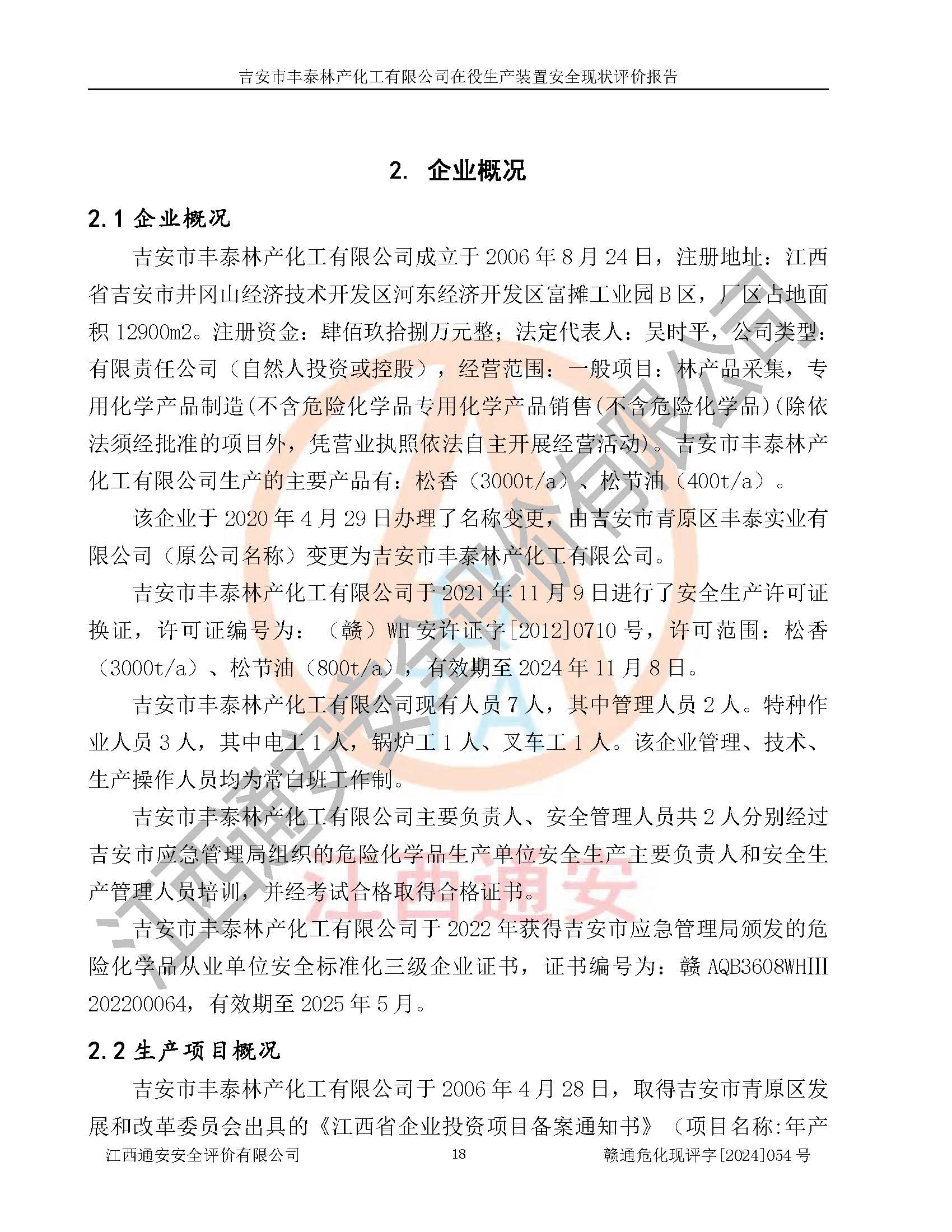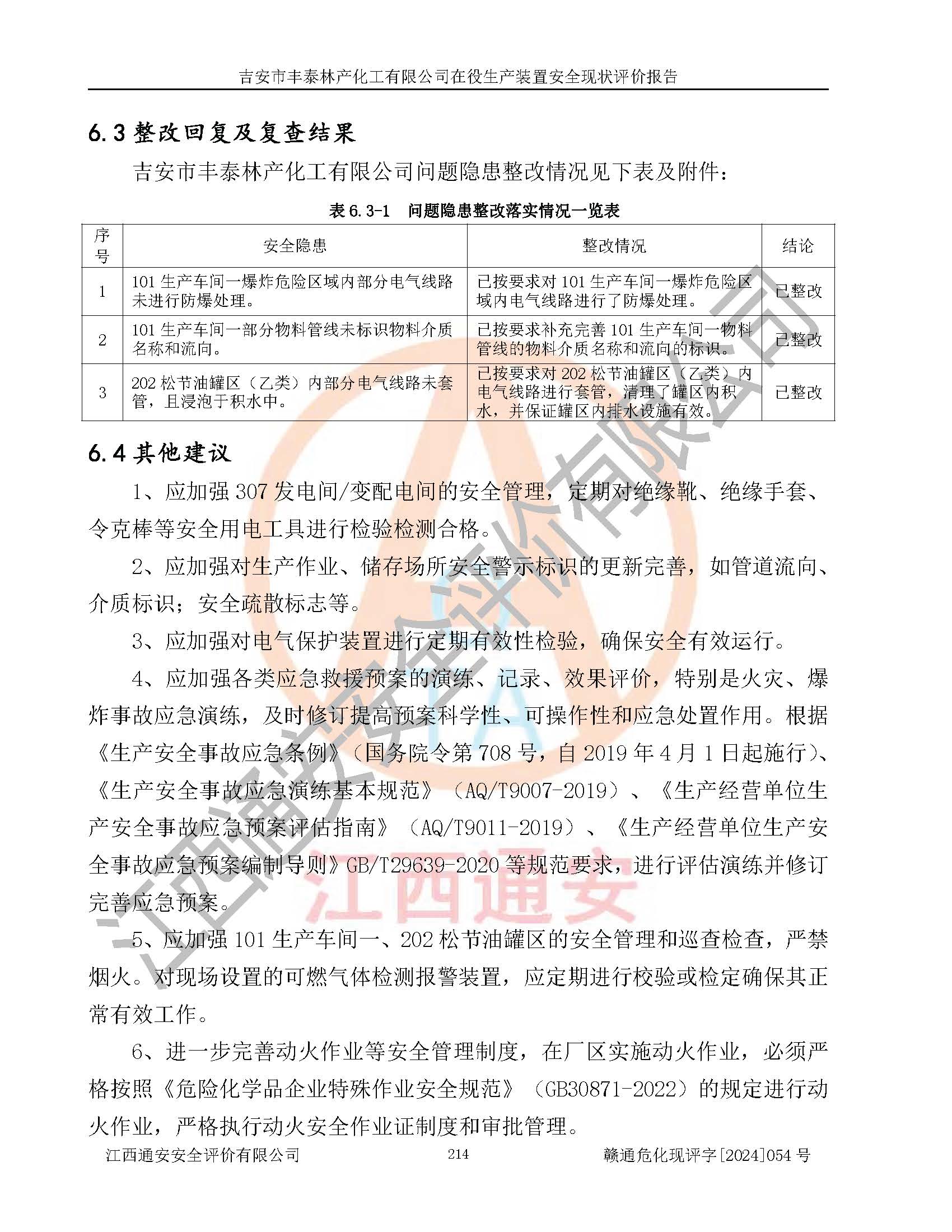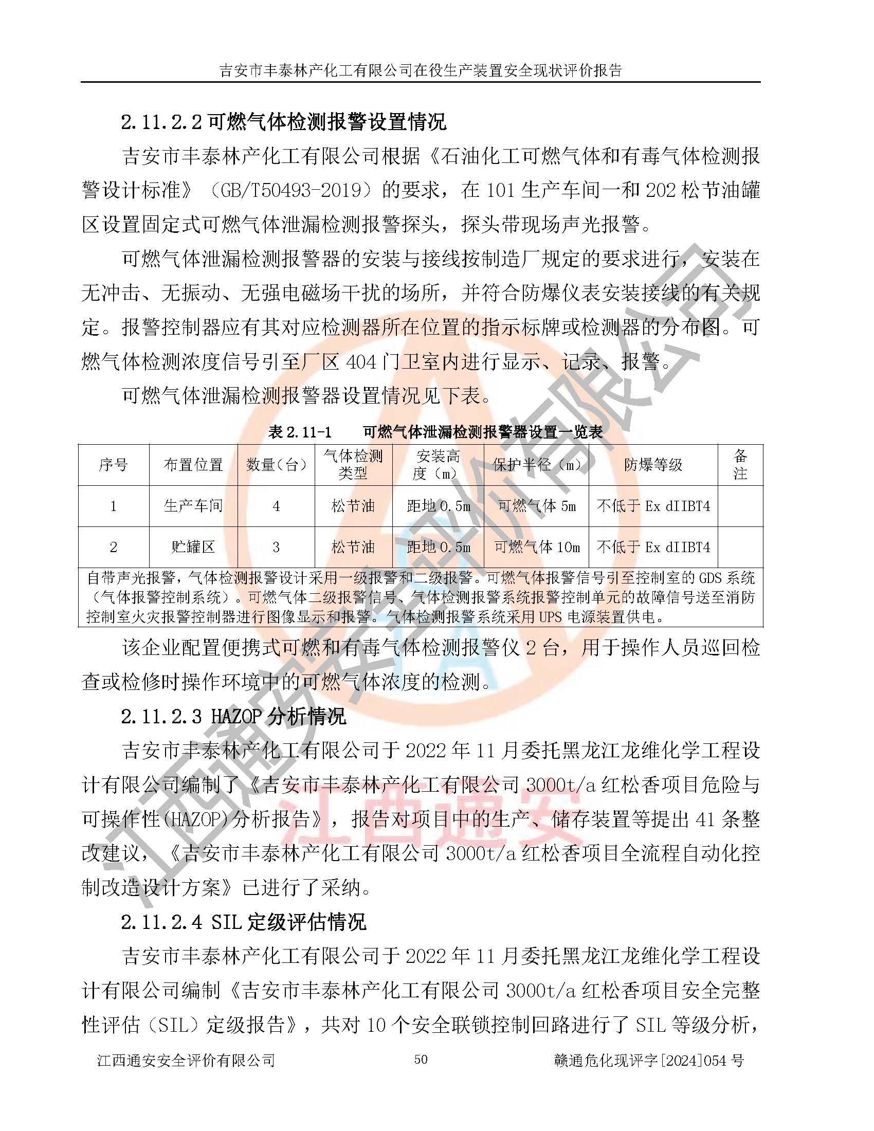 评价结论 | 评价结论:本报告认为,吉安市丰泰林产化工有限公司在役生产装置现场情况与设计图纸一致,有关从业人员资格符合《江西省危险化学品安全专项整治三年行动实施方案》要求,安全设施及安全管理符合**及有关部门关于安全生产法律法规、标准的要求,安全设施正常投用且运行**,安全风险是可以控制的,其风险程度是可以接受的,安全现状符合安全生产条件,能够满足安全生产的要求。 | |||