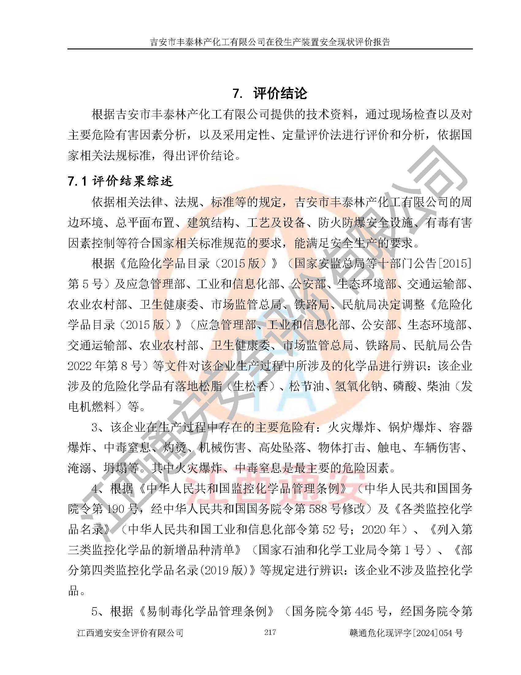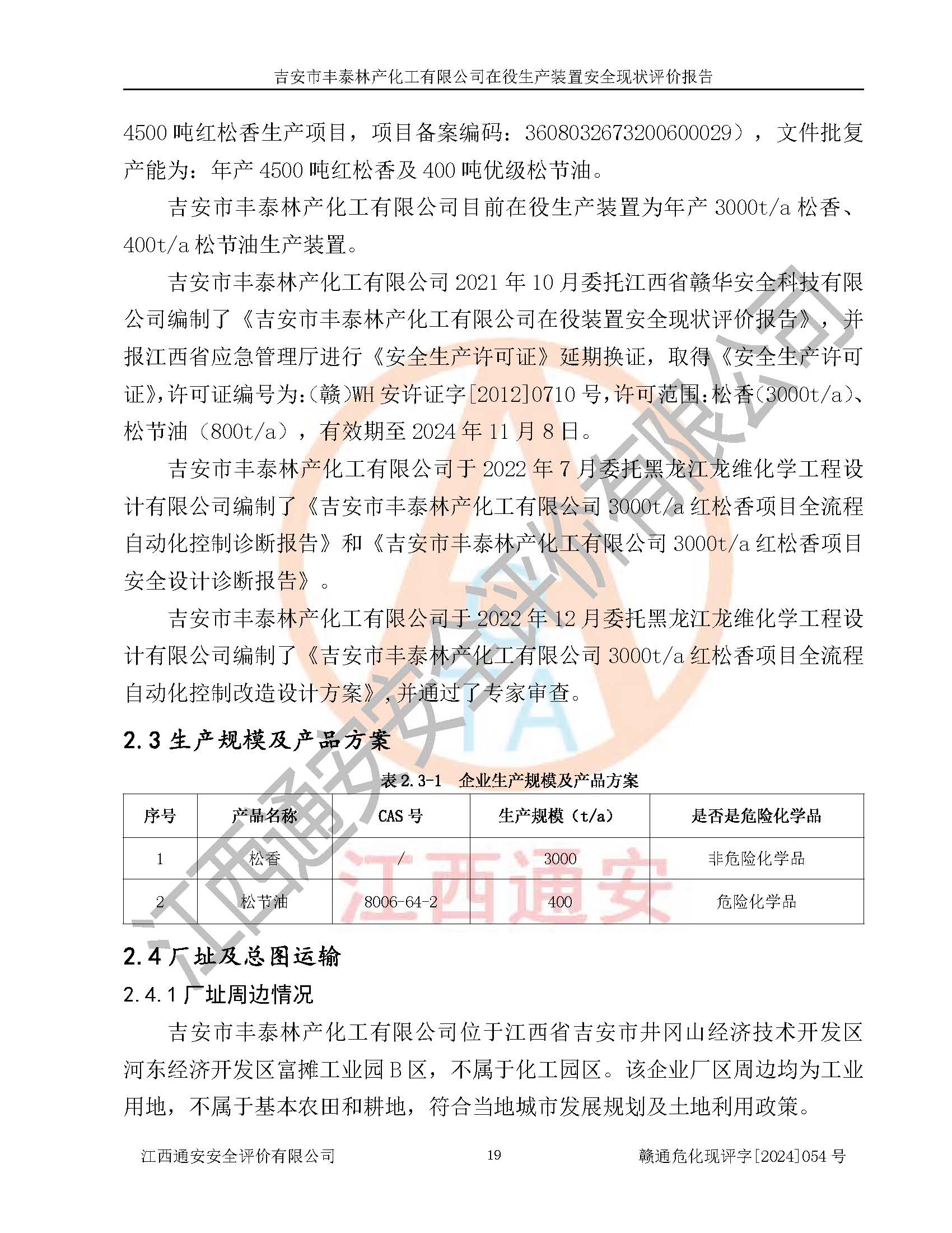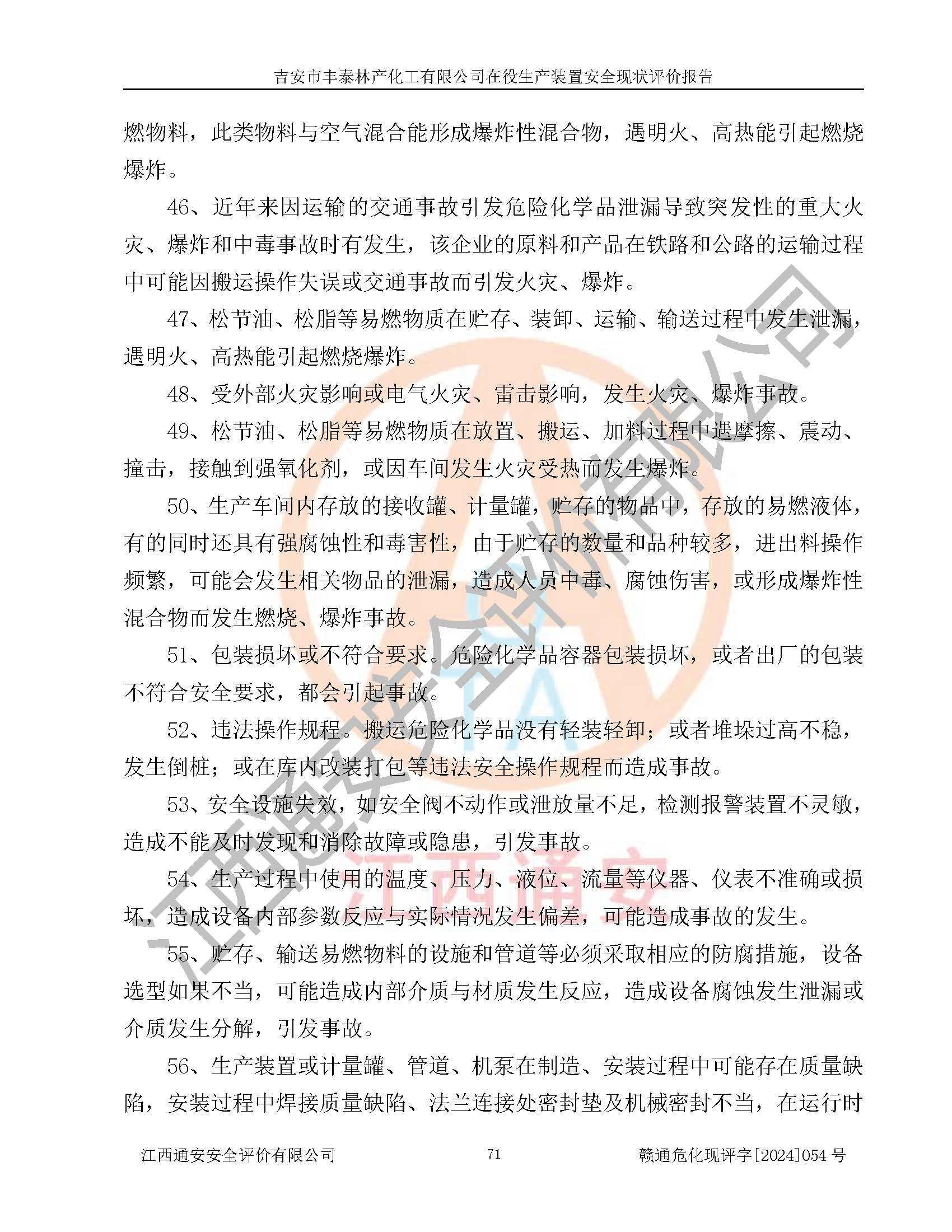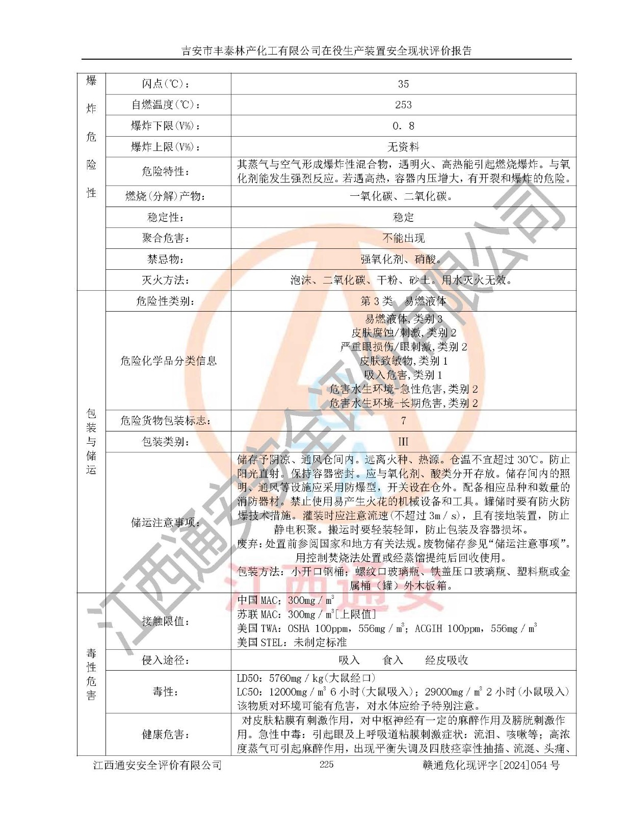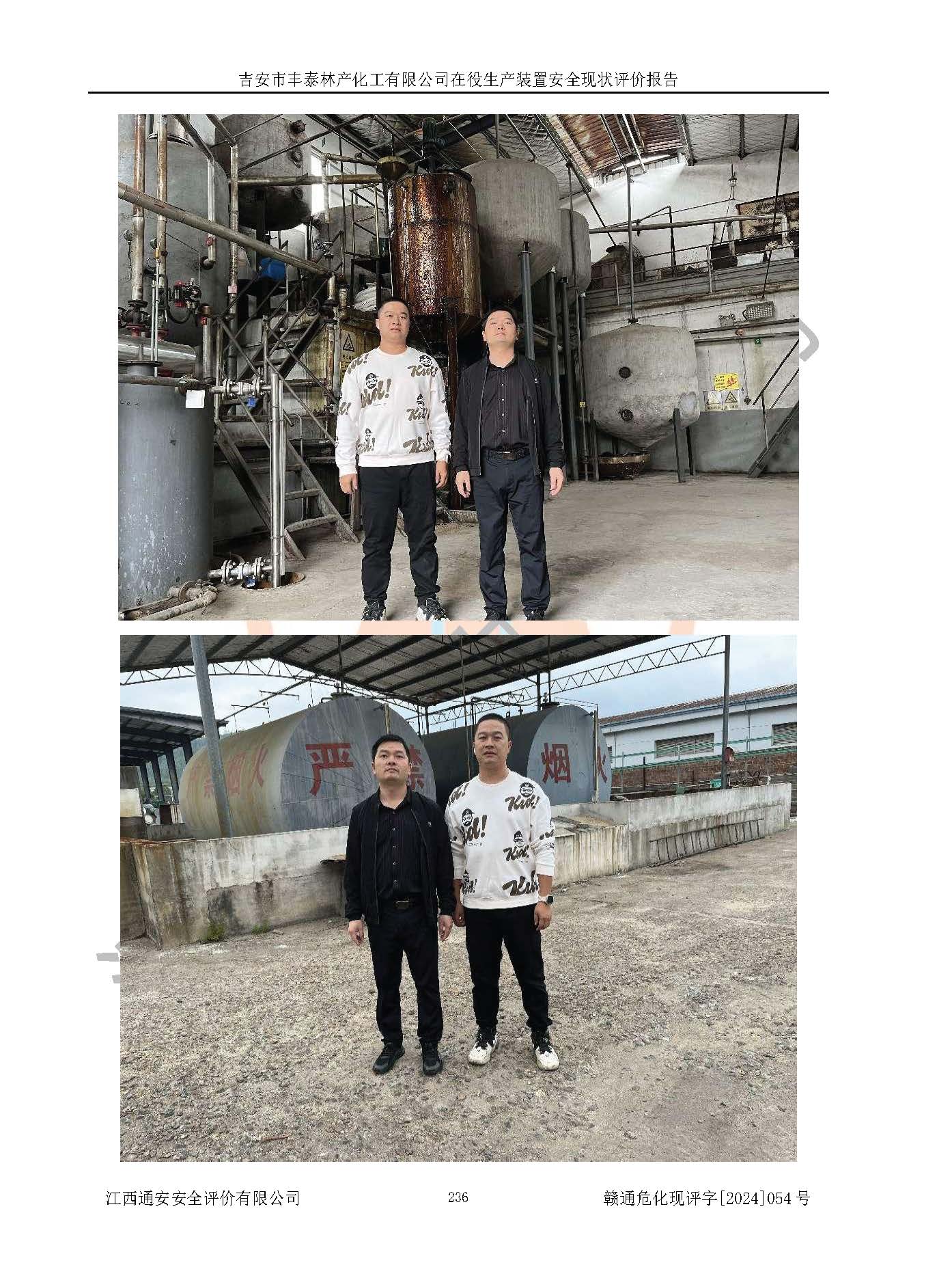 评价结论 | 评价结论:本报告认为,吉安市丰泰林产化工有限公司在役生产装置现场情况与设计图纸一致,有关从业人员资格符合《江西省危险化学品安全专项整治三年行动实施方案》要求,安全设施及安全管理符合**及有关部门关于安全生产法律法规、标准的要求,安全设施正常投用且运行**,安全风险是可以控制的,其风险程度是可以接受的,安全现状符合安全生产条件,能够满足安全生产的要求。 | |||