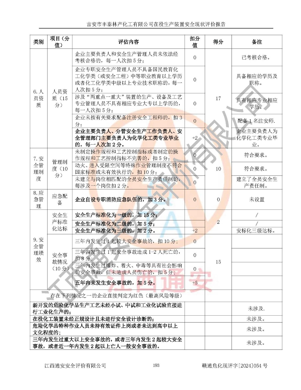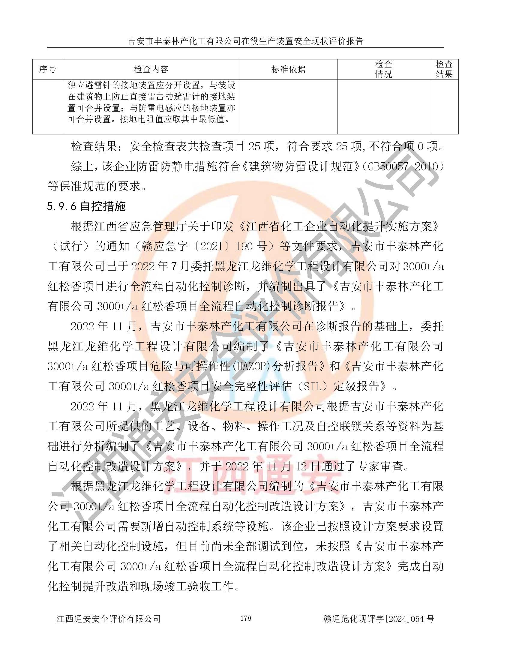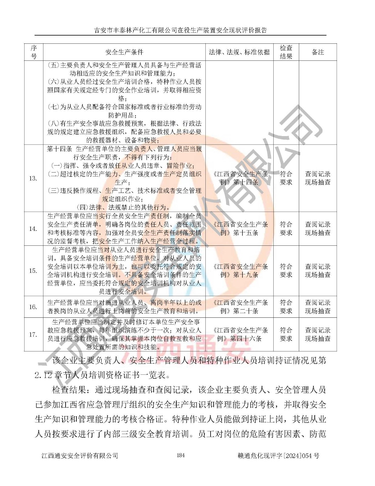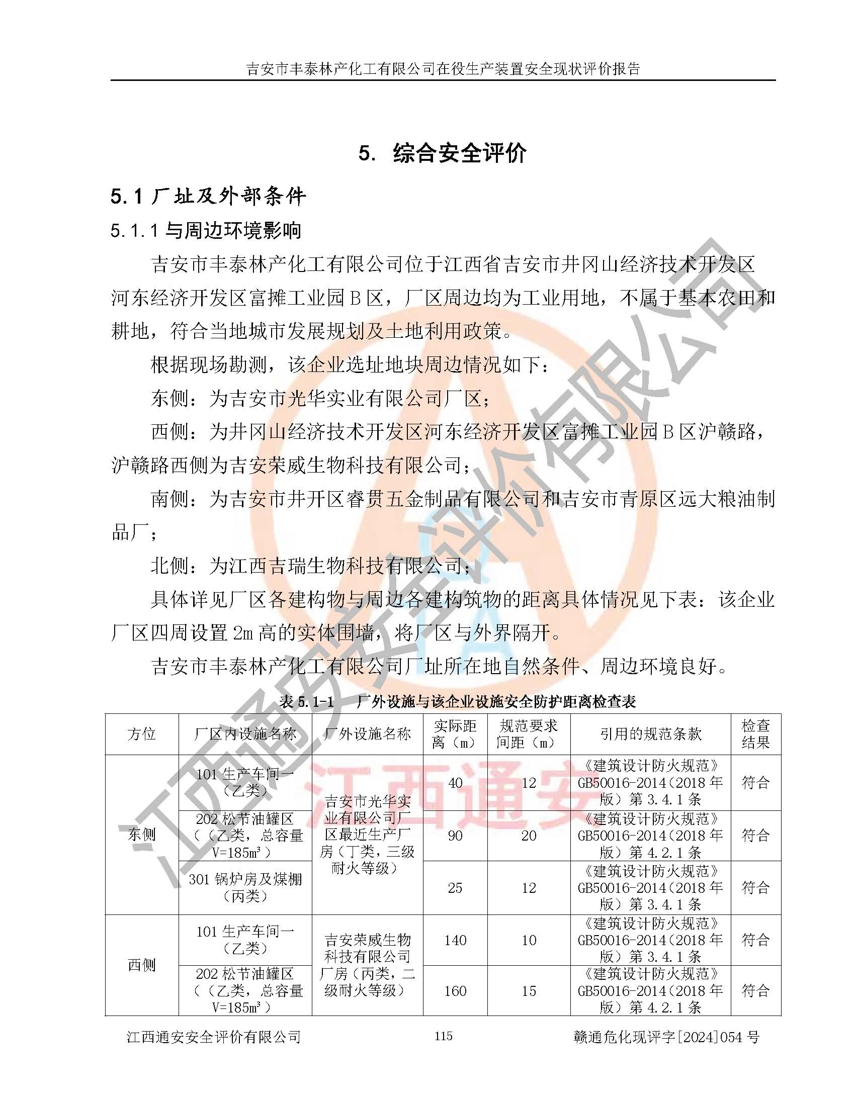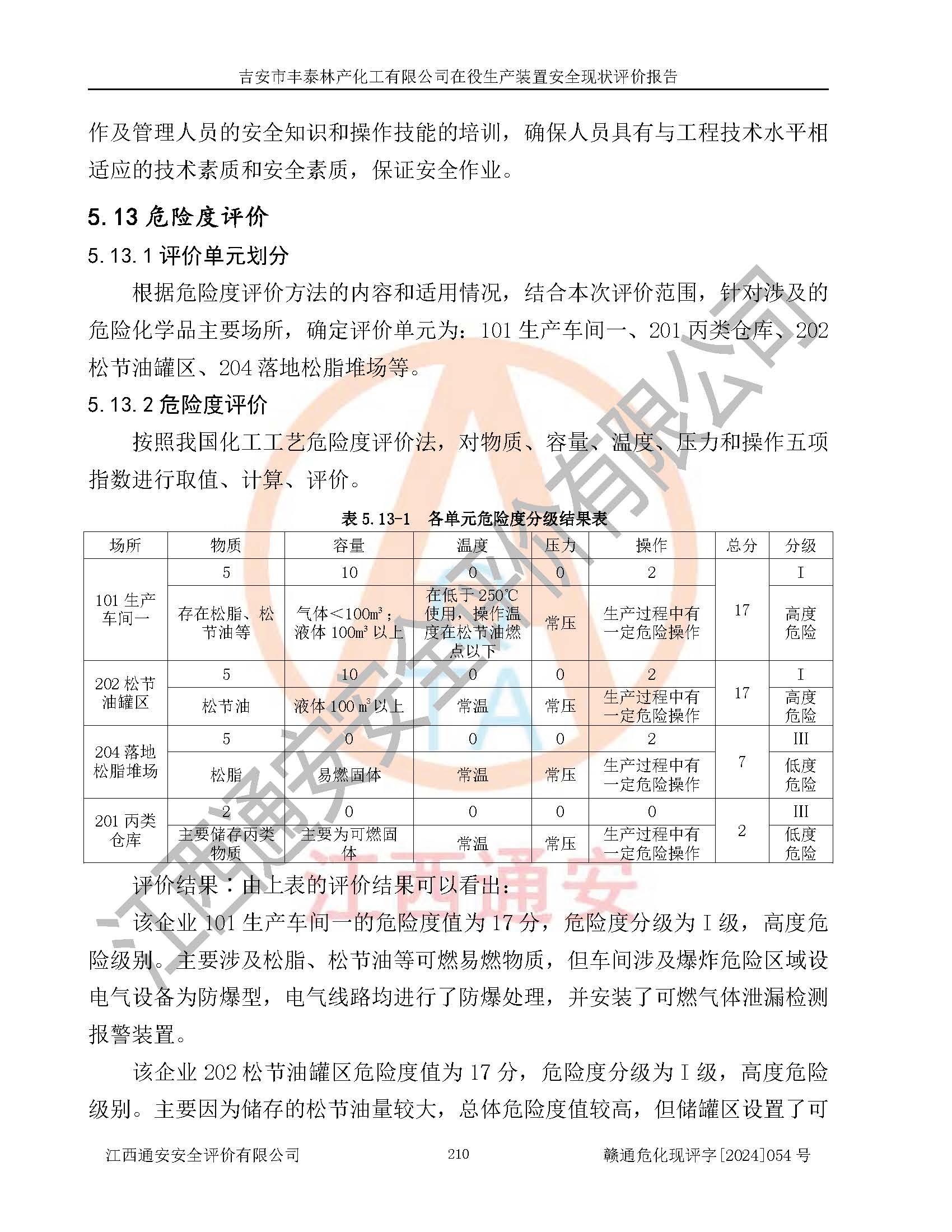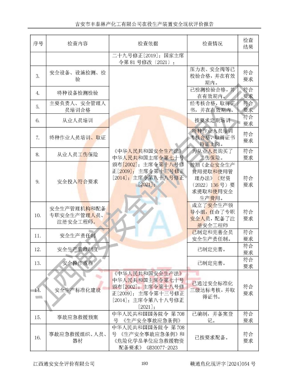 评价结论 | 评价结论:本报告认为,吉安市丰泰林产化工有限公司在役生产装置现场情况与设计图纸一致,有关从业人员资格符合《江西省危险化学品安全专项整治三年行动实施方案》要求,安全设施及安全管理符合**及有关部门关于安全生产法律法规、标准的要求,安全设施正常投用且运行**,安全风险是可以控制的,其风险程度是可以接受的,安全现状符合安全生产条件,能够满足安全生产的要求。 | |||