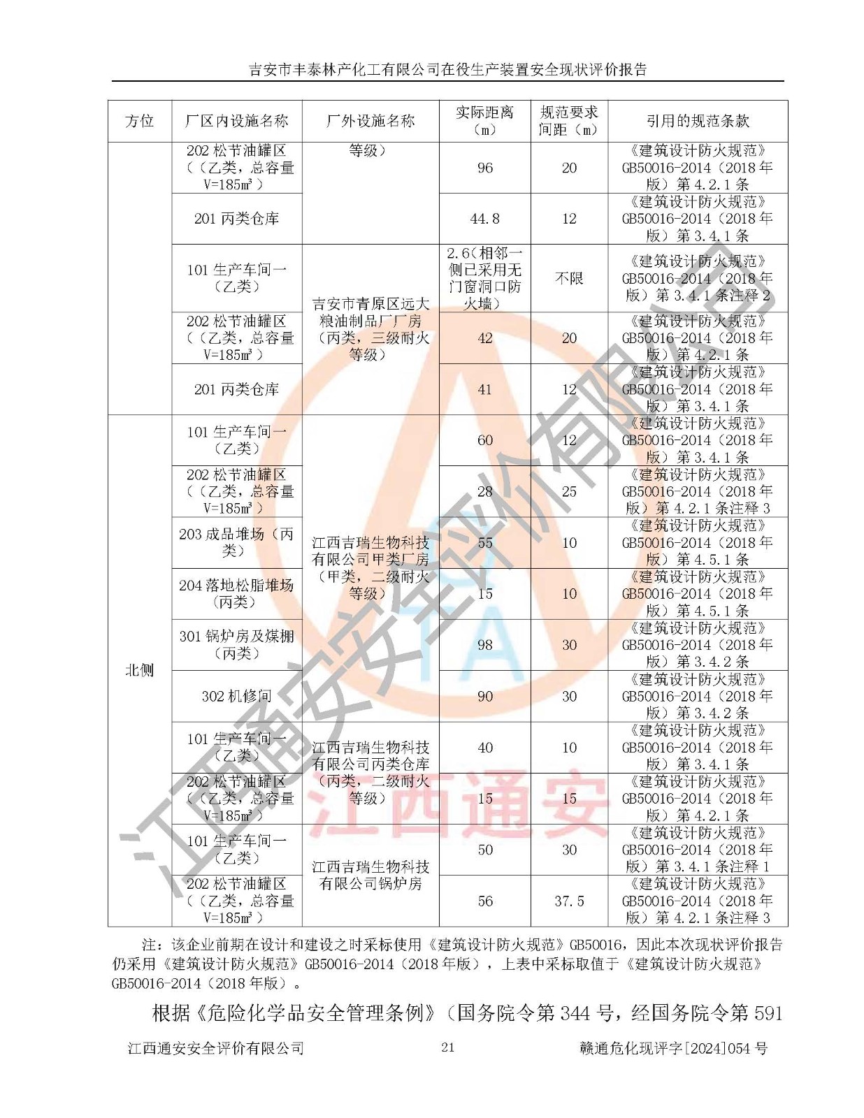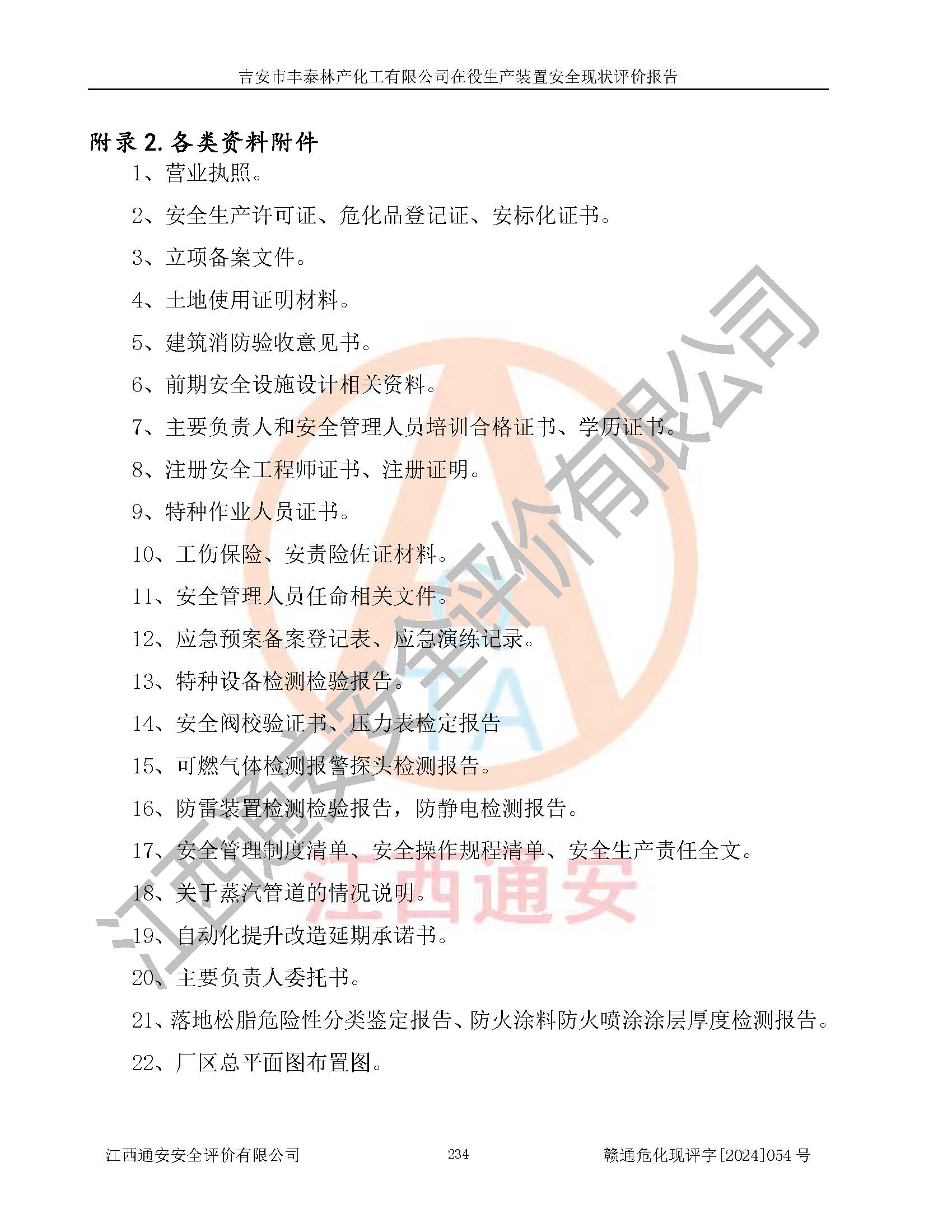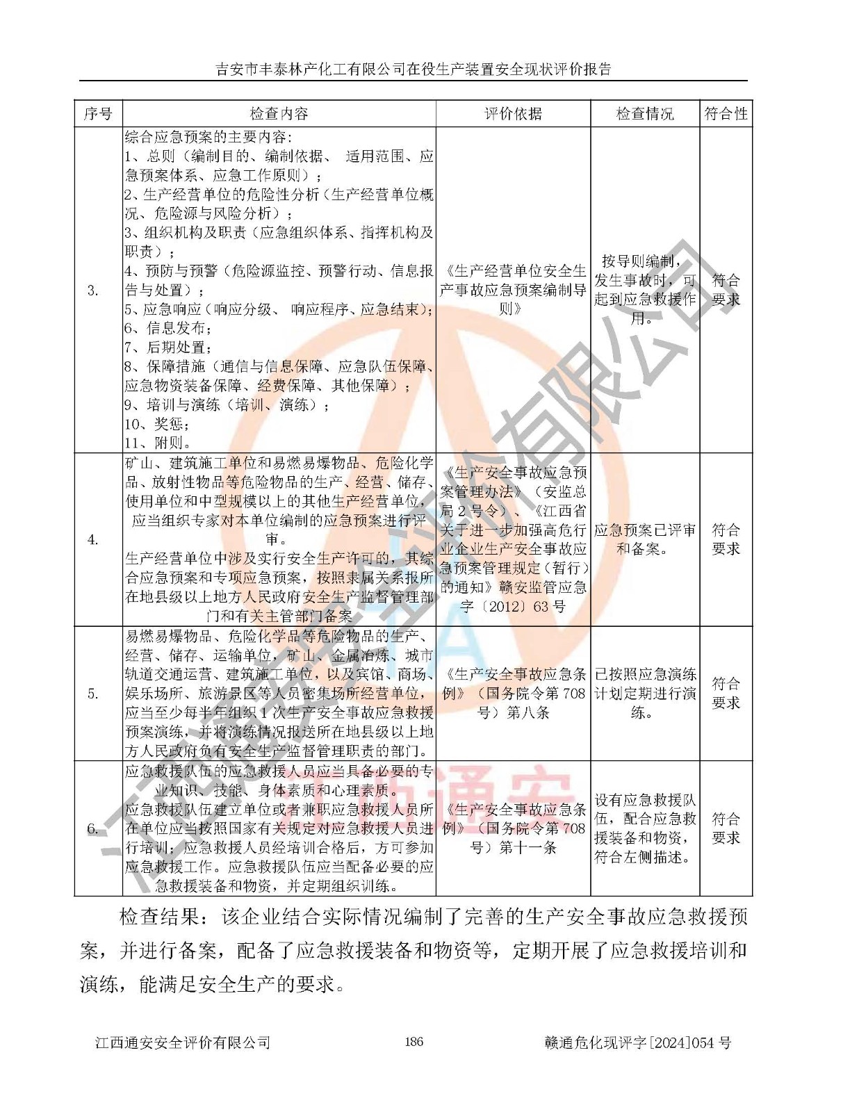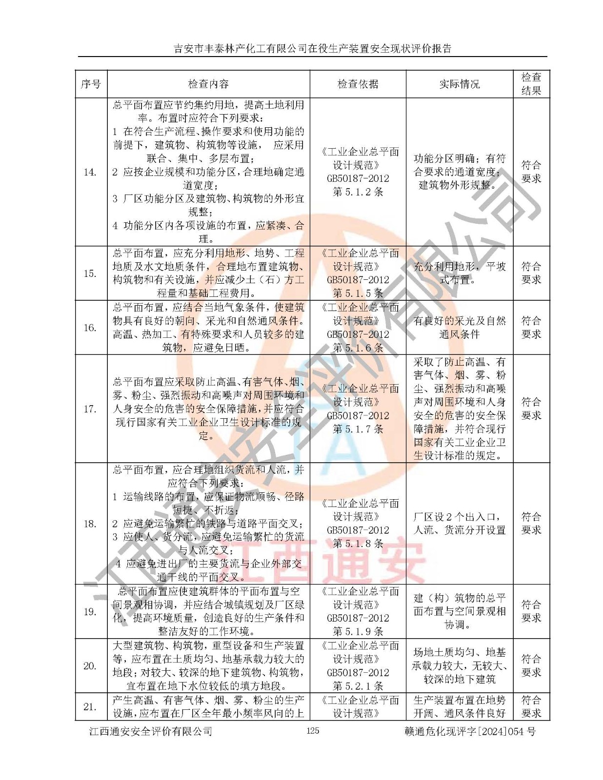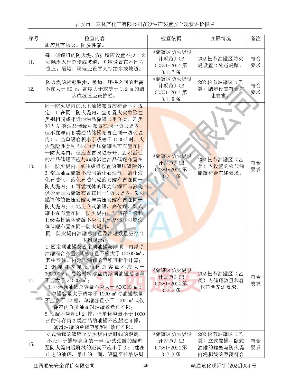 评价结论 | 评价结论:本报告认为,吉安市丰泰林产化工有限公司在役生产装置现场情况与设计图纸一致,有关从业人员资格符合《江西省危险化学品安全专项整治三年行动实施方案》要求,安全设施及安全管理符合**及有关部门关于安全生产法律法规、标准的要求,安全设施正常投用且运行**,安全风险是可以控制的,其风险程度是可以接受的,安全现状符合安全生产条件,能够满足安全生产的要求。 | |||