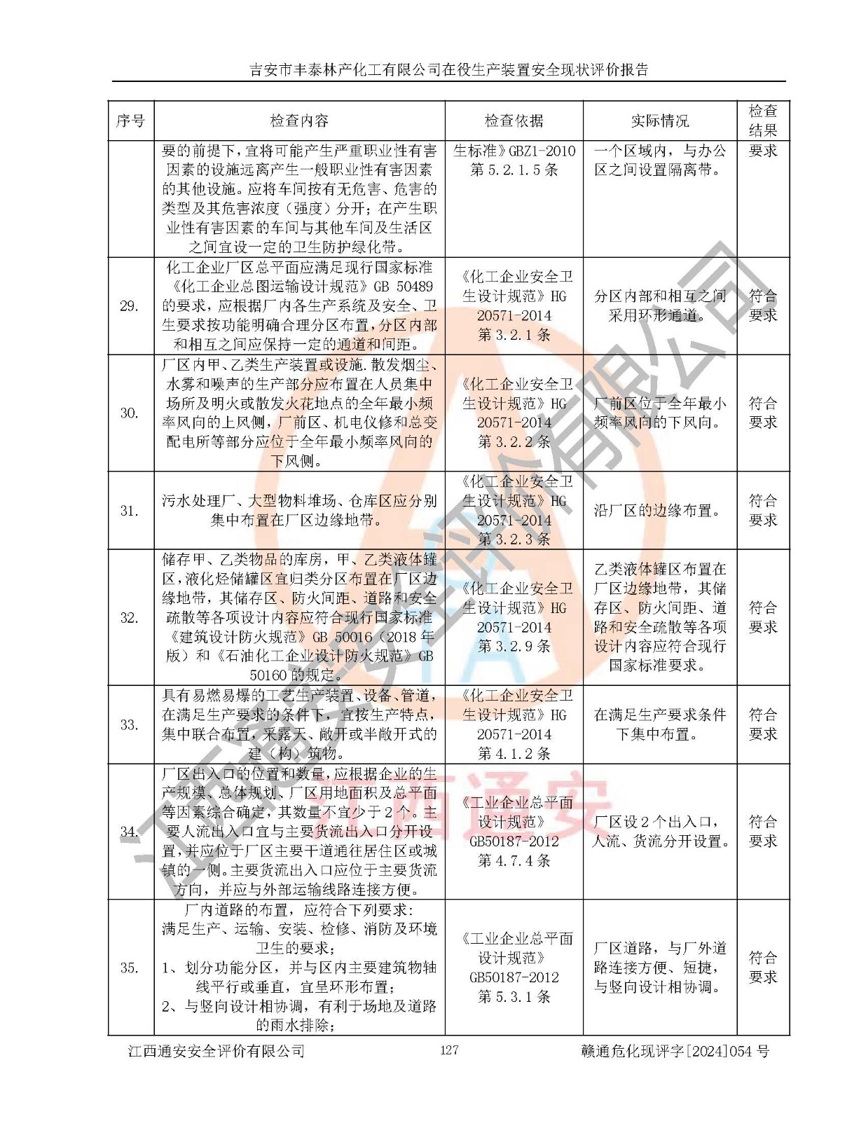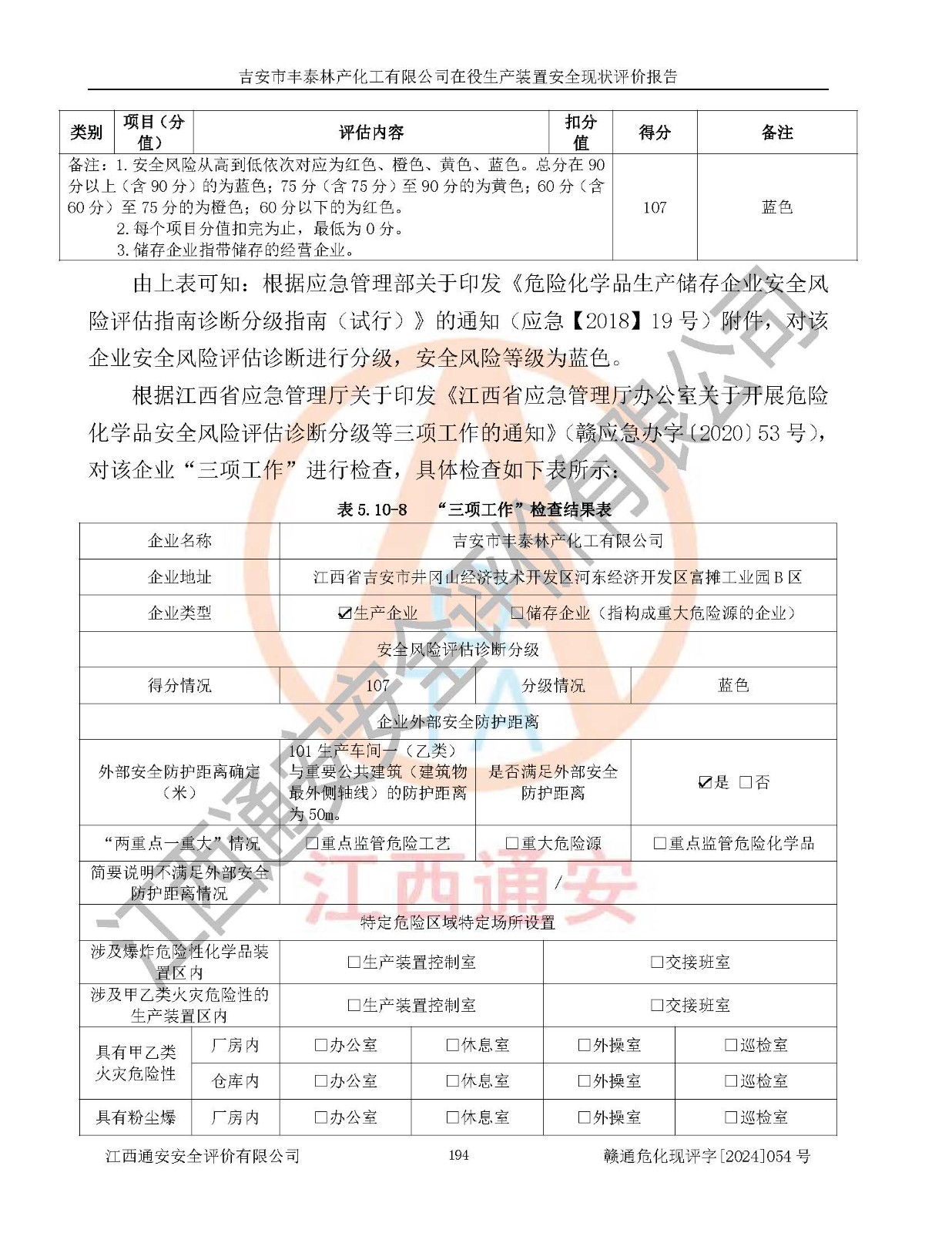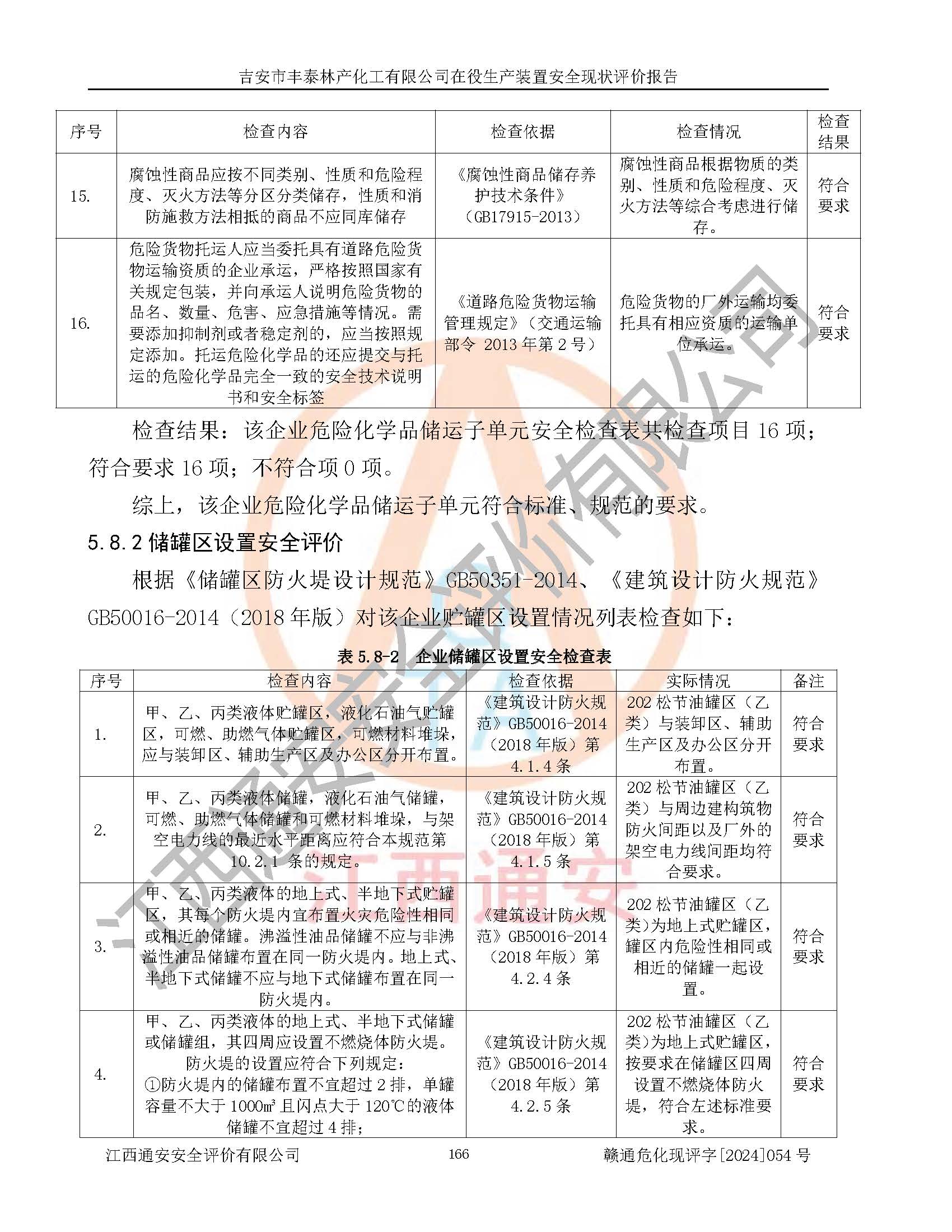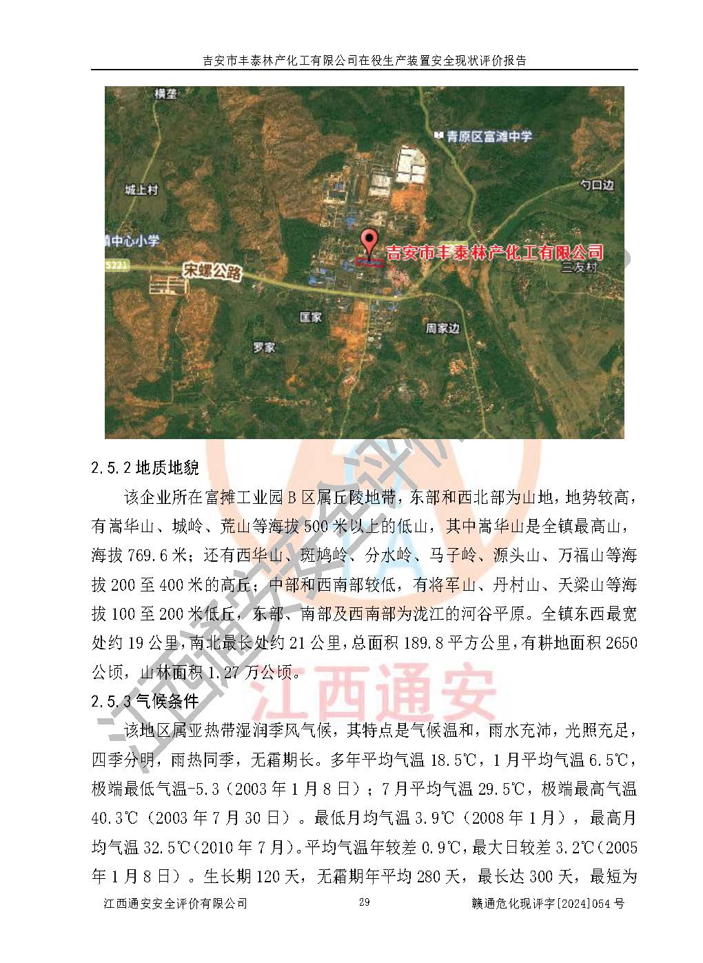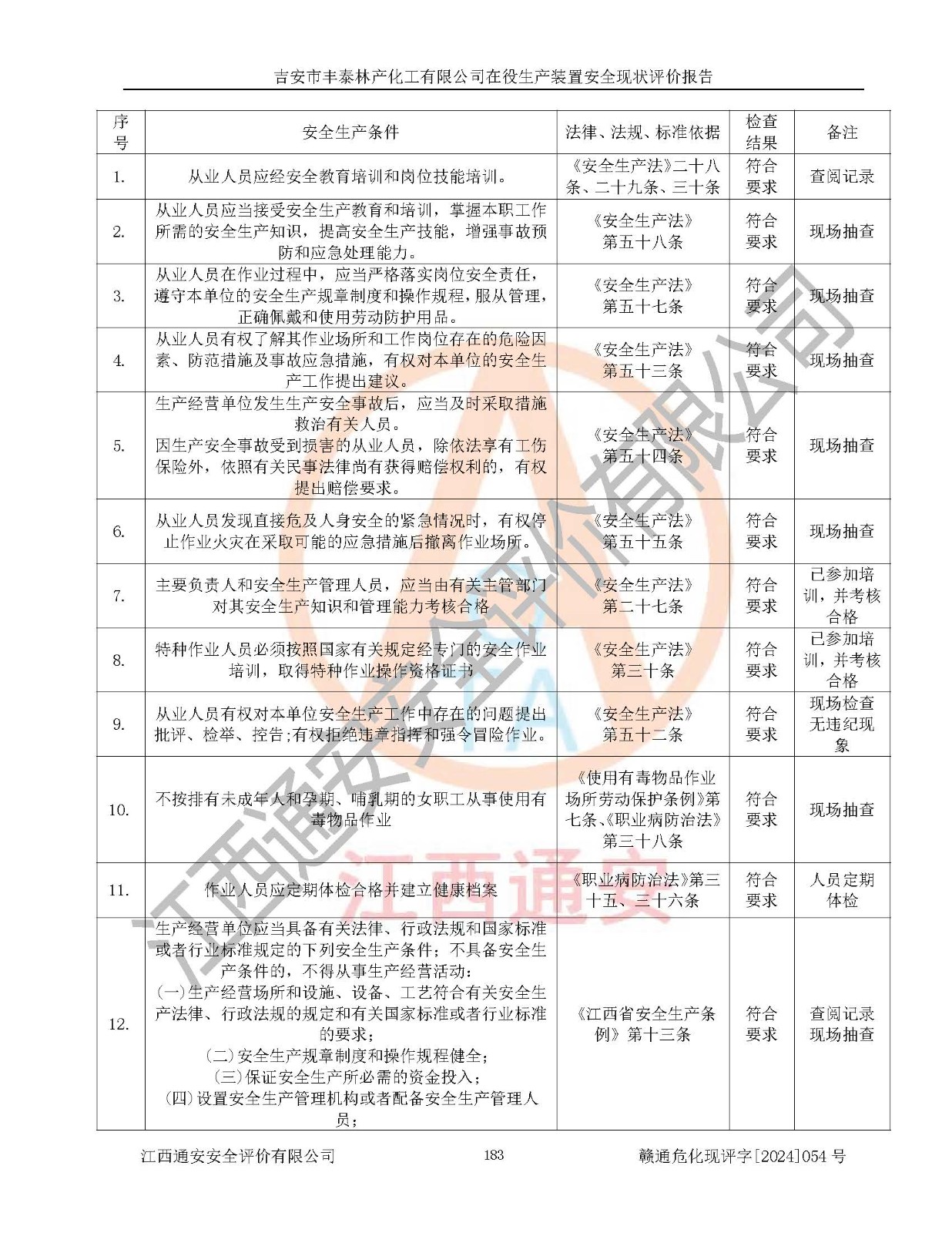评价结论 | 评价结论:本报告认为,吉安市丰泰林产化工有限公司在役生产装置现场情况与设计图纸一致,有关从业人员资格符合《江西省危险化学品安全专项整治三年行动实施方案》要求,安全设施及安全管理符合**及有关部门关于安全生产法律法规、标准的要求,安全设施正常投用且运行**,安全风险是可以控制的,其风险程度是可以接受的,安全现状符合安全生产条件,能够满足安全生产的要求。 | |||