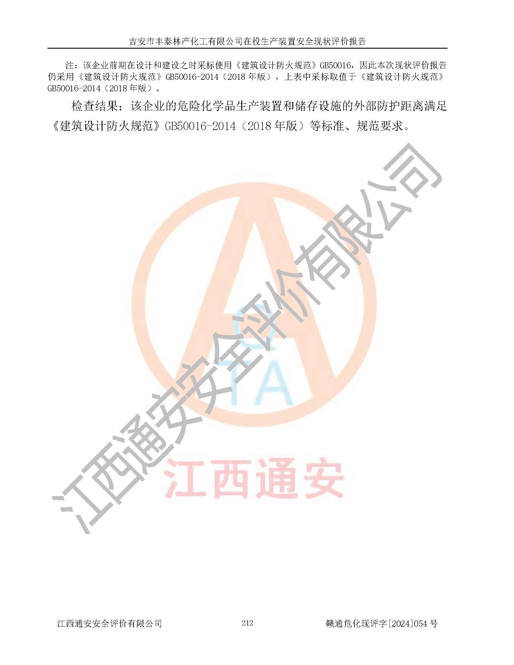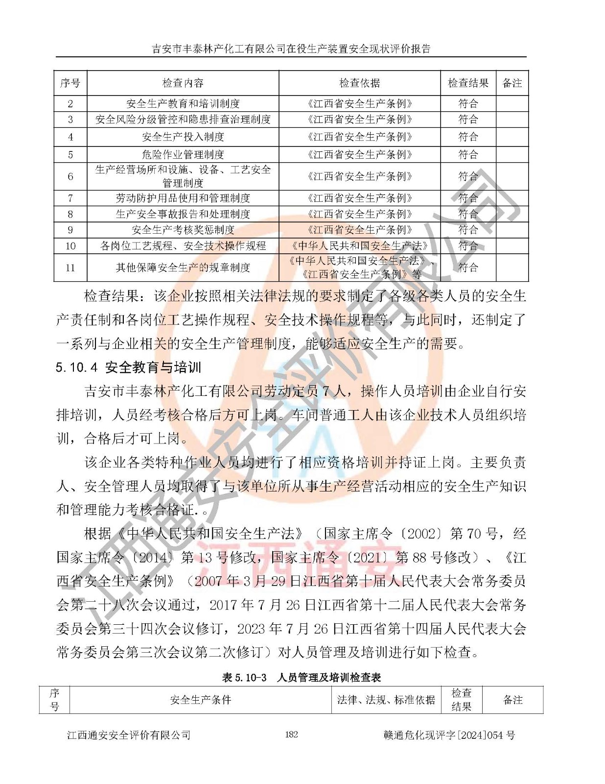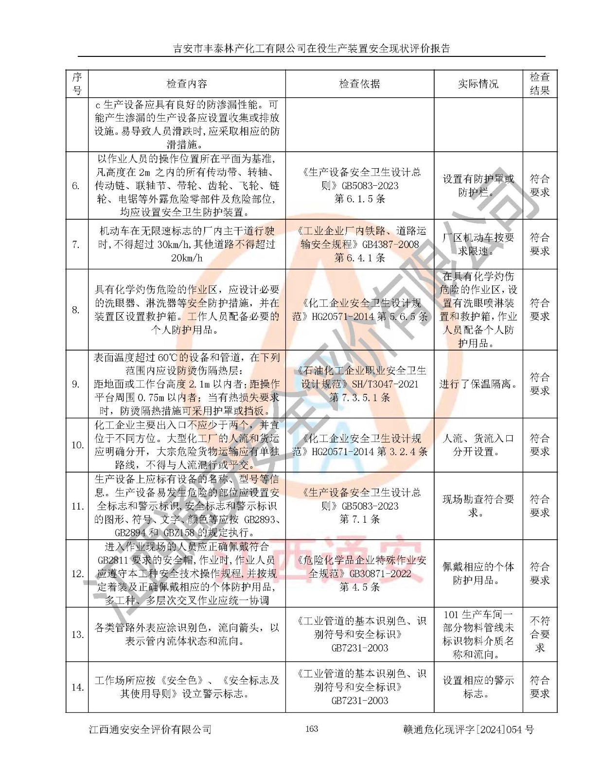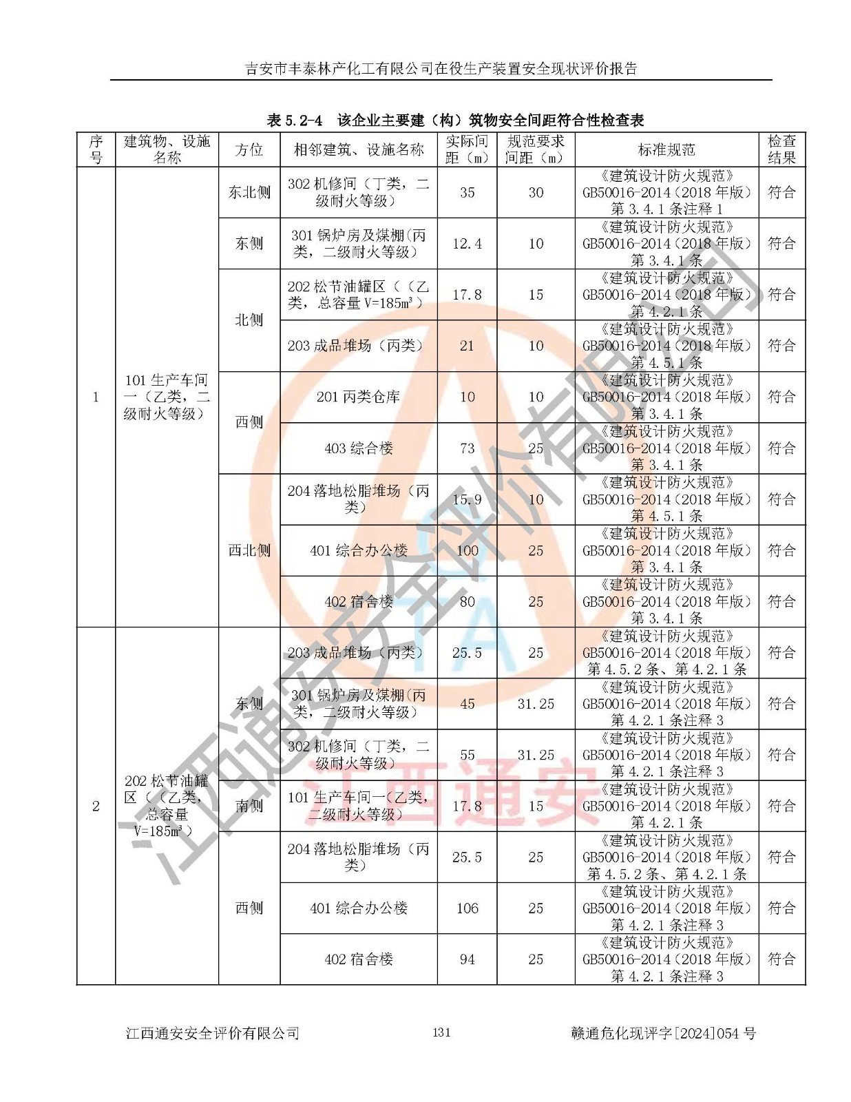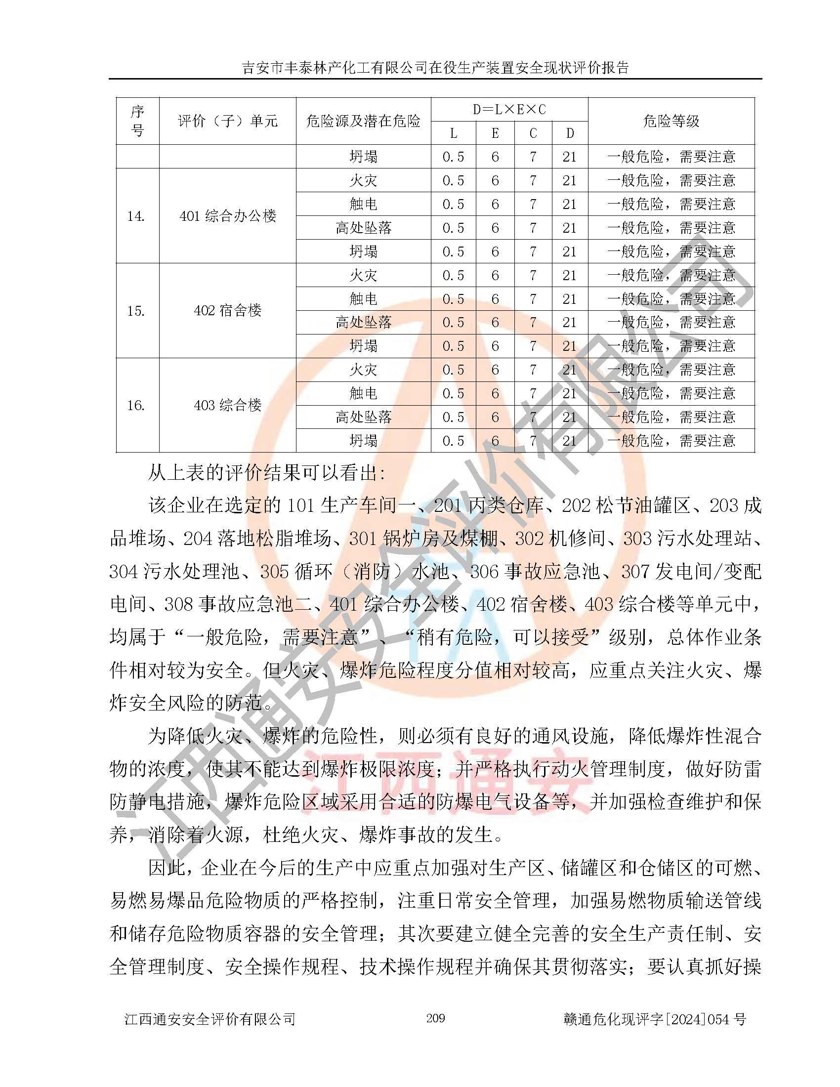 评价结论 | 评价结论:本报告认为,吉安市丰泰林产化工有限公司在役生产装置现场情况与设计图纸一致,有关从业人员资格符合《江西省危险化学品安全专项整治三年行动实施方案》要求,安全设施及安全管理符合**及有关部门关于安全生产法律法规、标准的要求,安全设施正常投用且运行**,安全风险是可以控制的,其风险程度是可以接受的,安全现状符合安全生产条件,能够满足安全生产的要求。 | |||