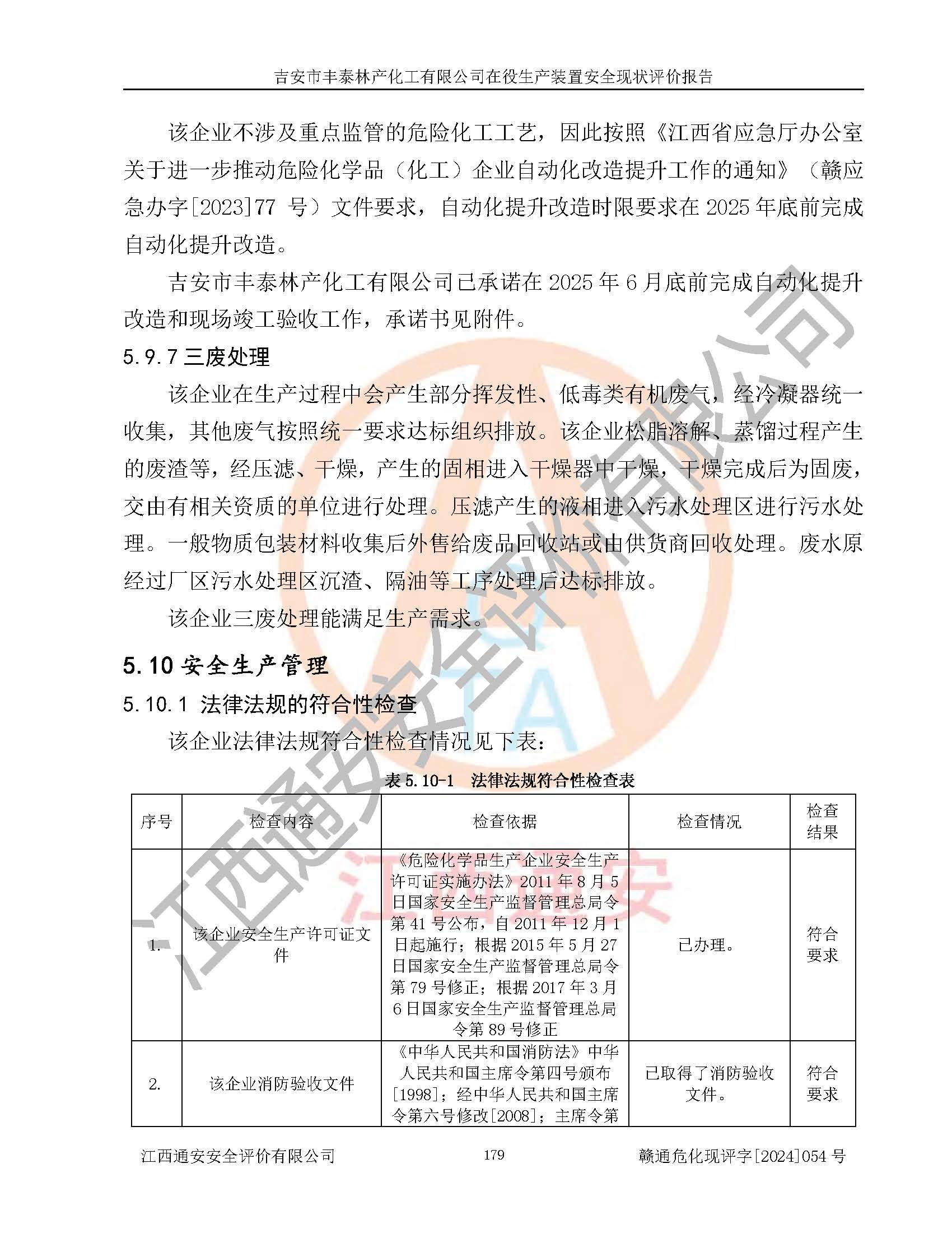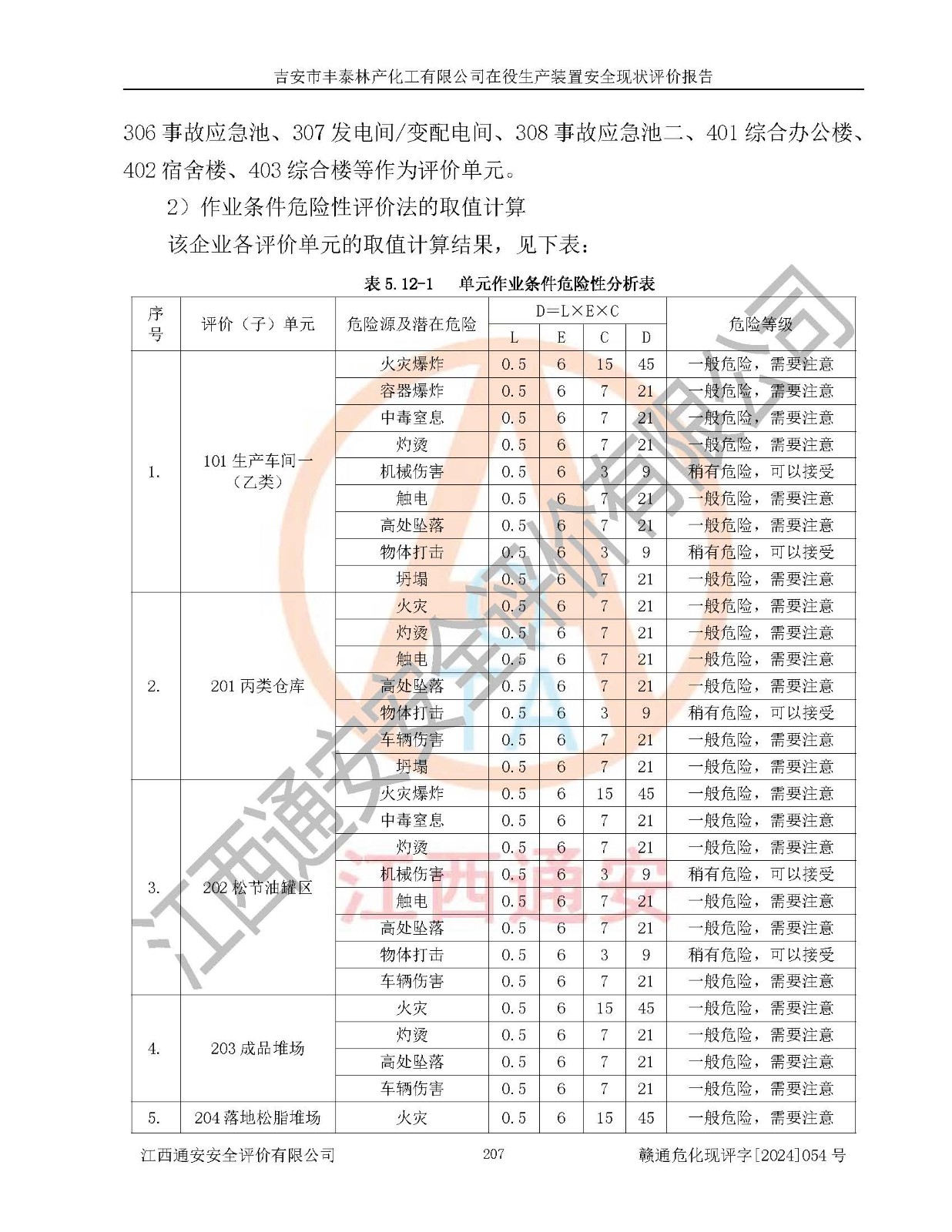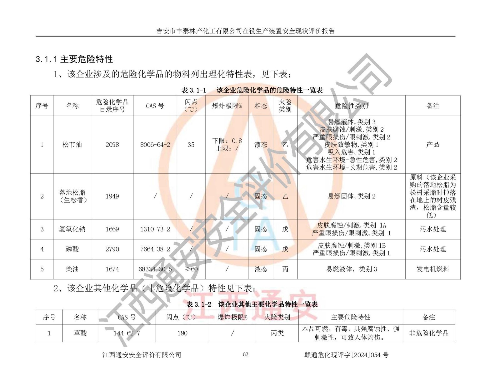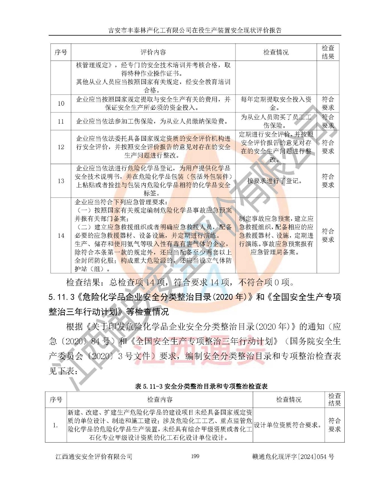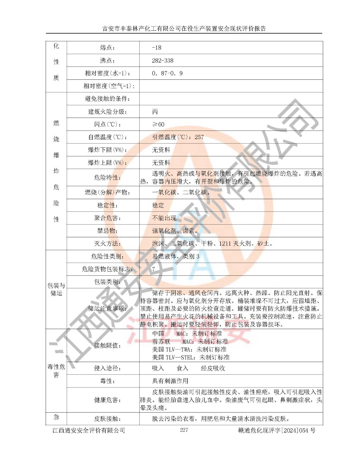 评价结论 | 评价结论:本报告认为,吉安市丰泰林产化工有限公司在役生产装置现场情况与设计图纸一致,有关从业人员资格符合《江西省危险化学品安全专项整治三年行动实施方案》要求,安全设施及安全管理符合**及有关部门关于安全生产法律法规、标准的要求,安全设施正常投用且运行**,安全风险是可以控制的,其风险程度是可以接受的,安全现状符合安全生产条件,能够满足安全生产的要求。 | |||