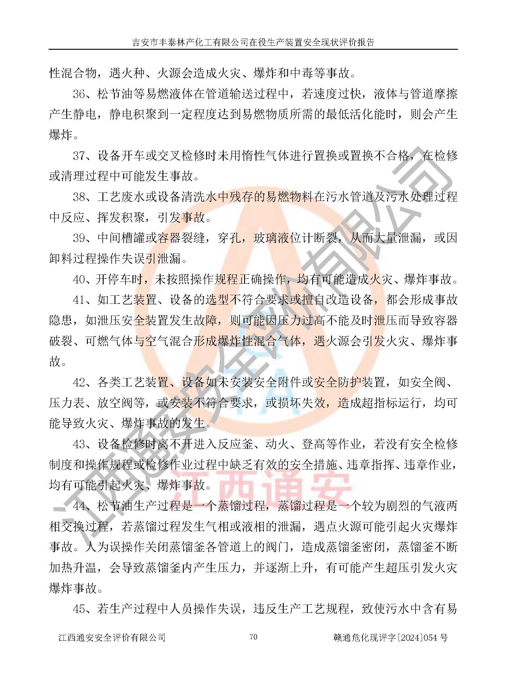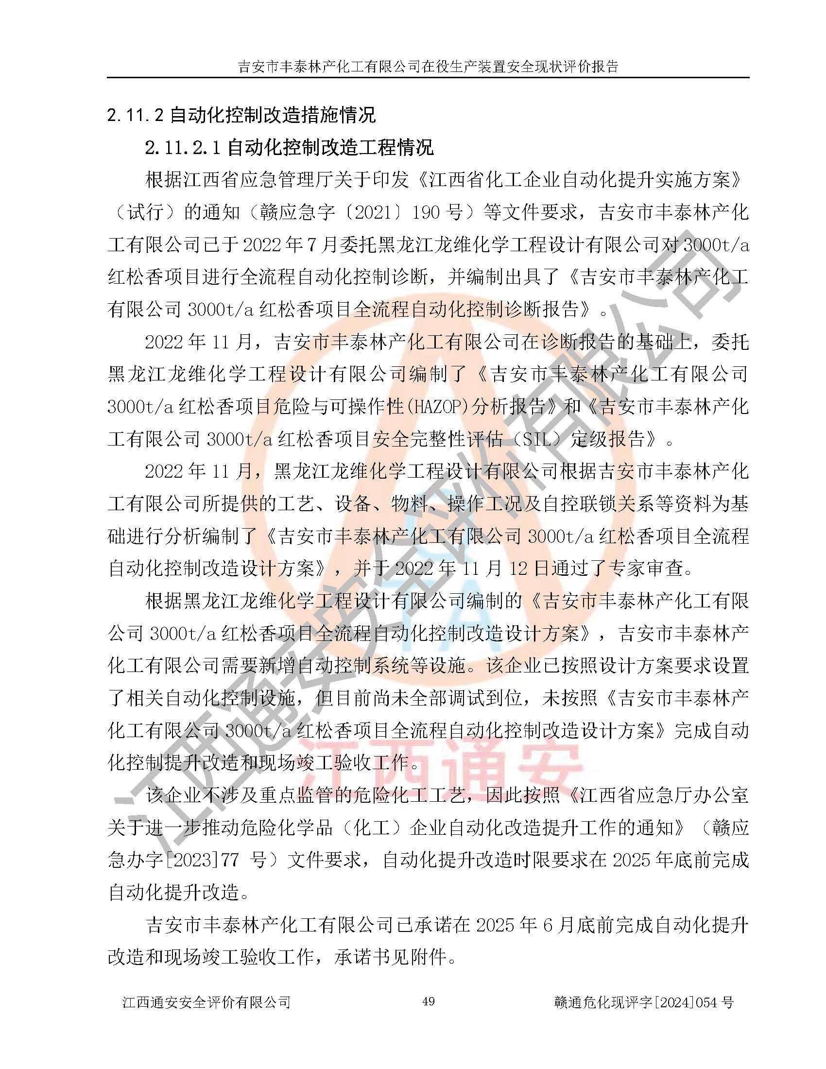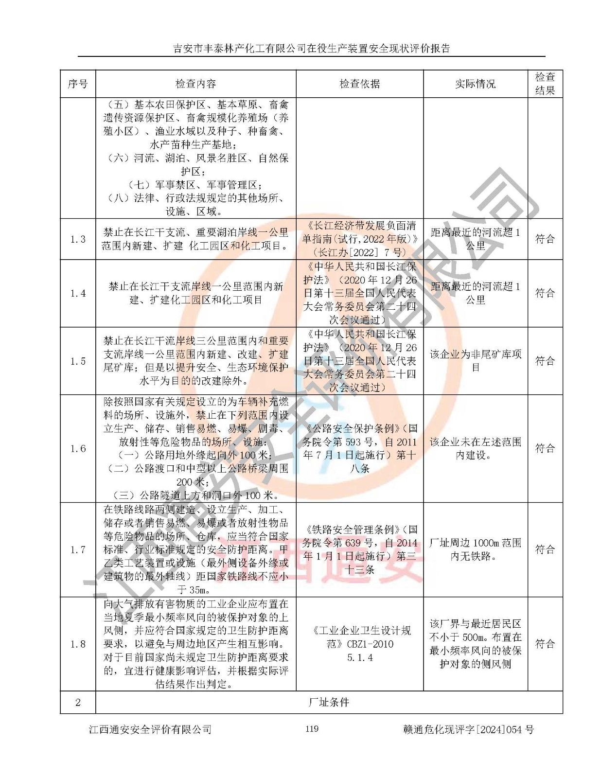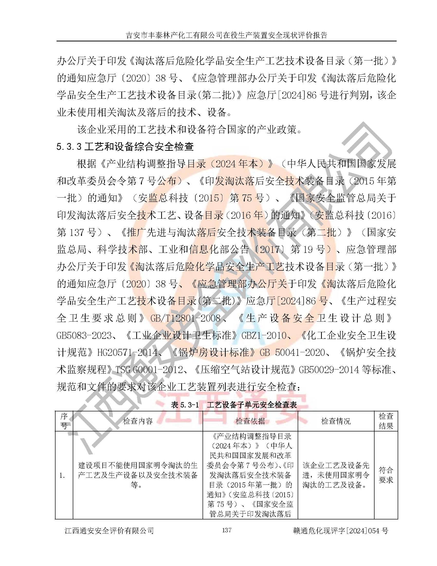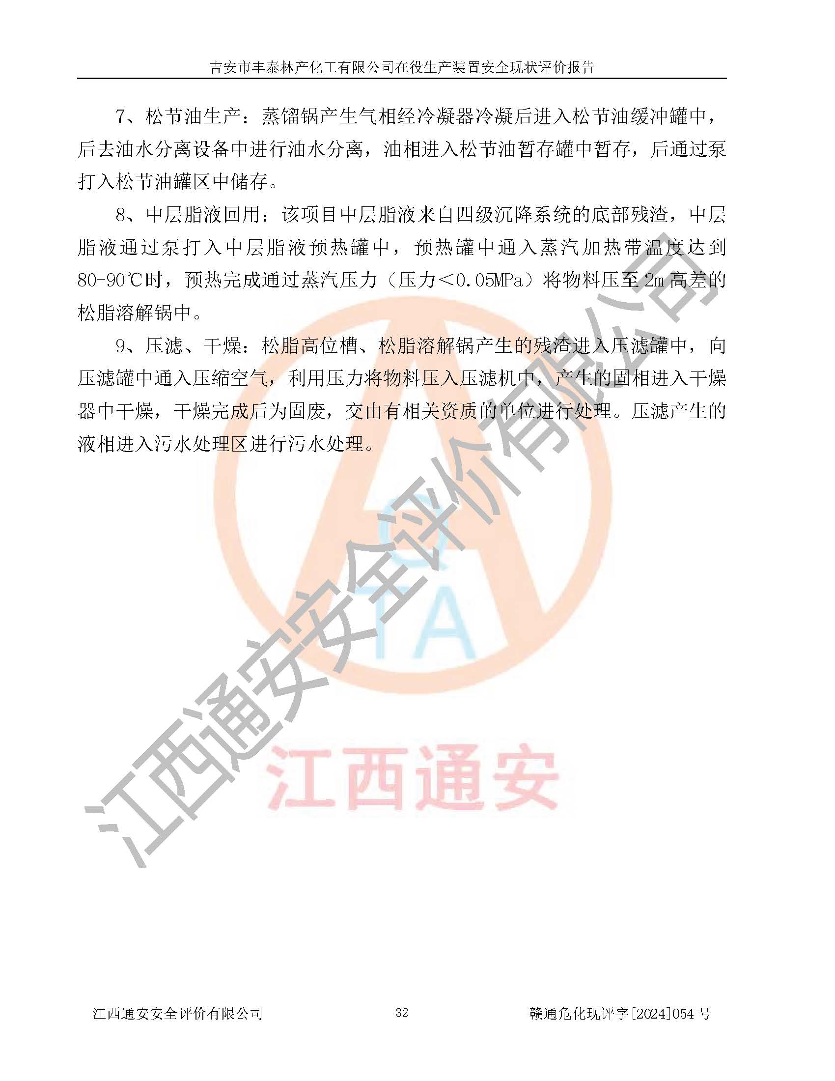 评价结论 | 评价结论:本报告认为,吉安市丰泰林产化工有限公司在役生产装置现场情况与设计图纸一致,有关从业人员资格符合《江西省危险化学品安全专项整治三年行动实施方案》要求,安全设施及安全管理符合**及有关部门关于安全生产法律法规、标准的要求,安全设施正常投用且运行**,安全风险是可以控制的,其风险程度是可以接受的,安全现状符合安全生产条件,能够满足安全生产的要求。 | |||