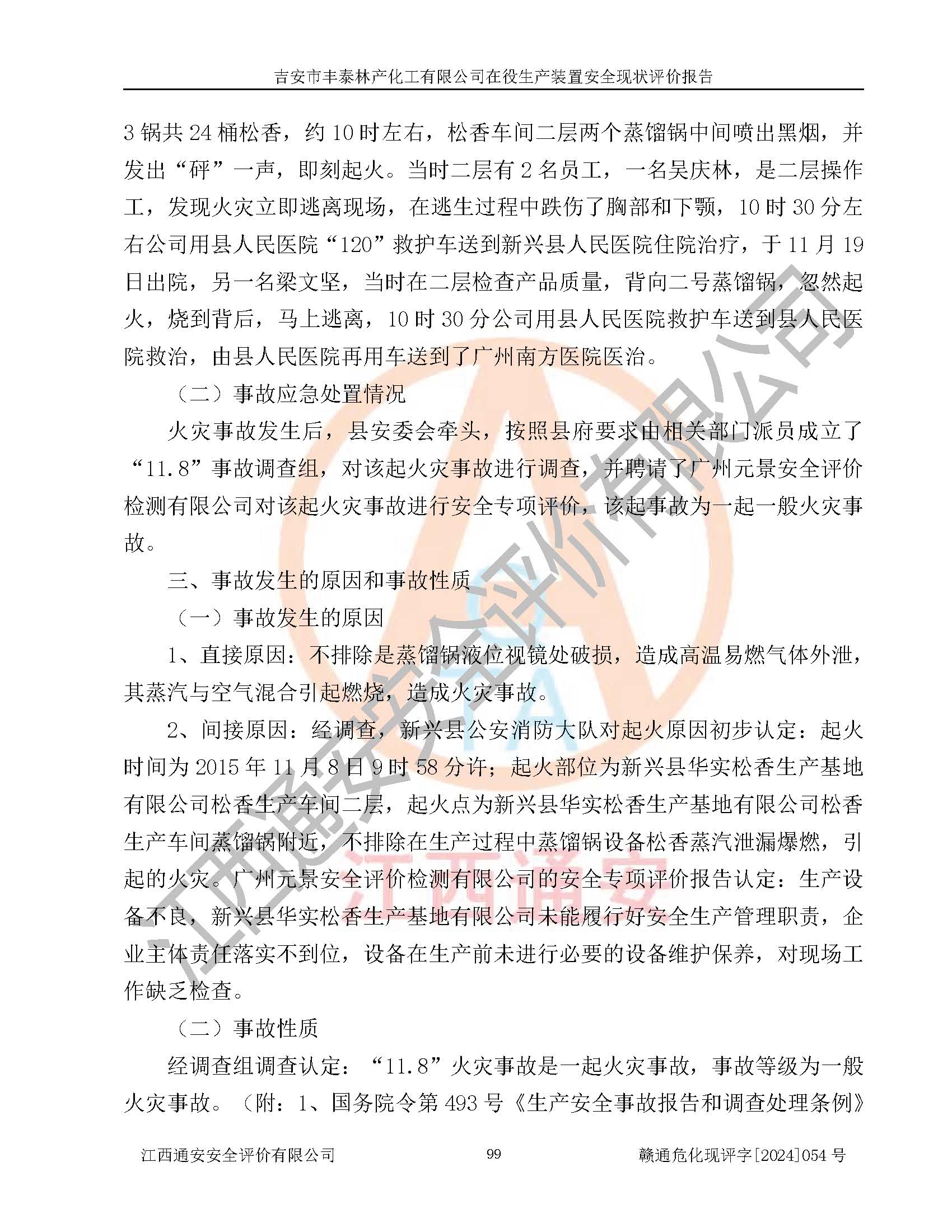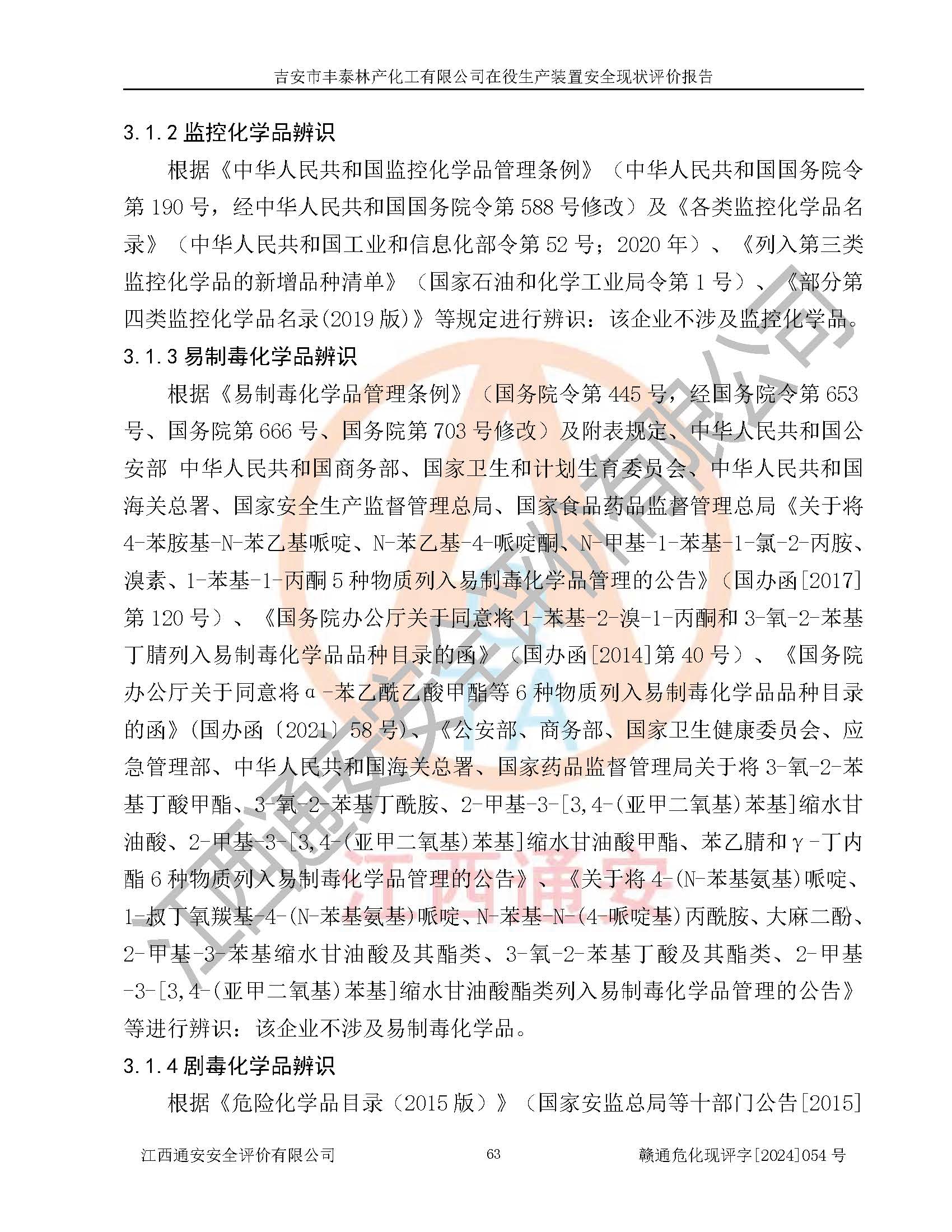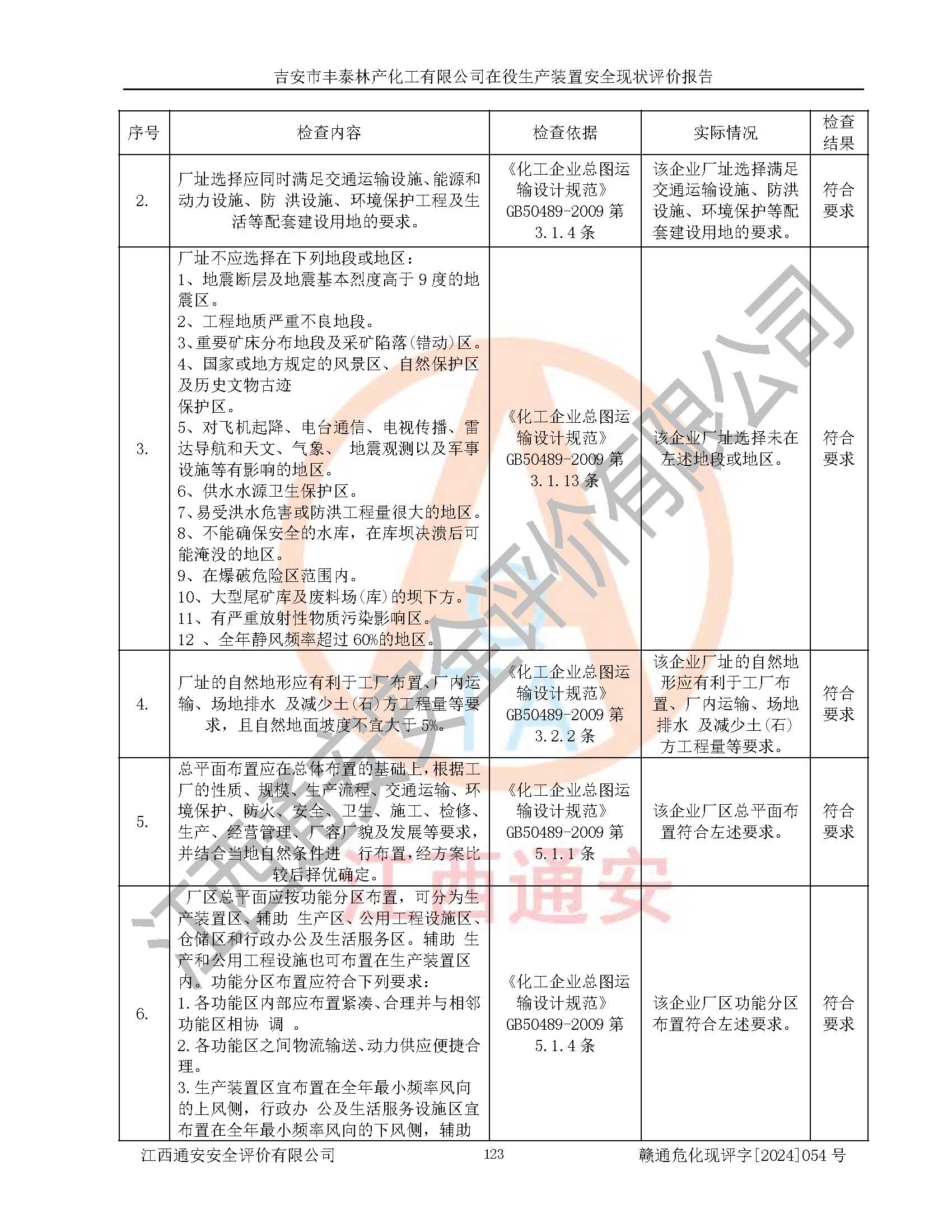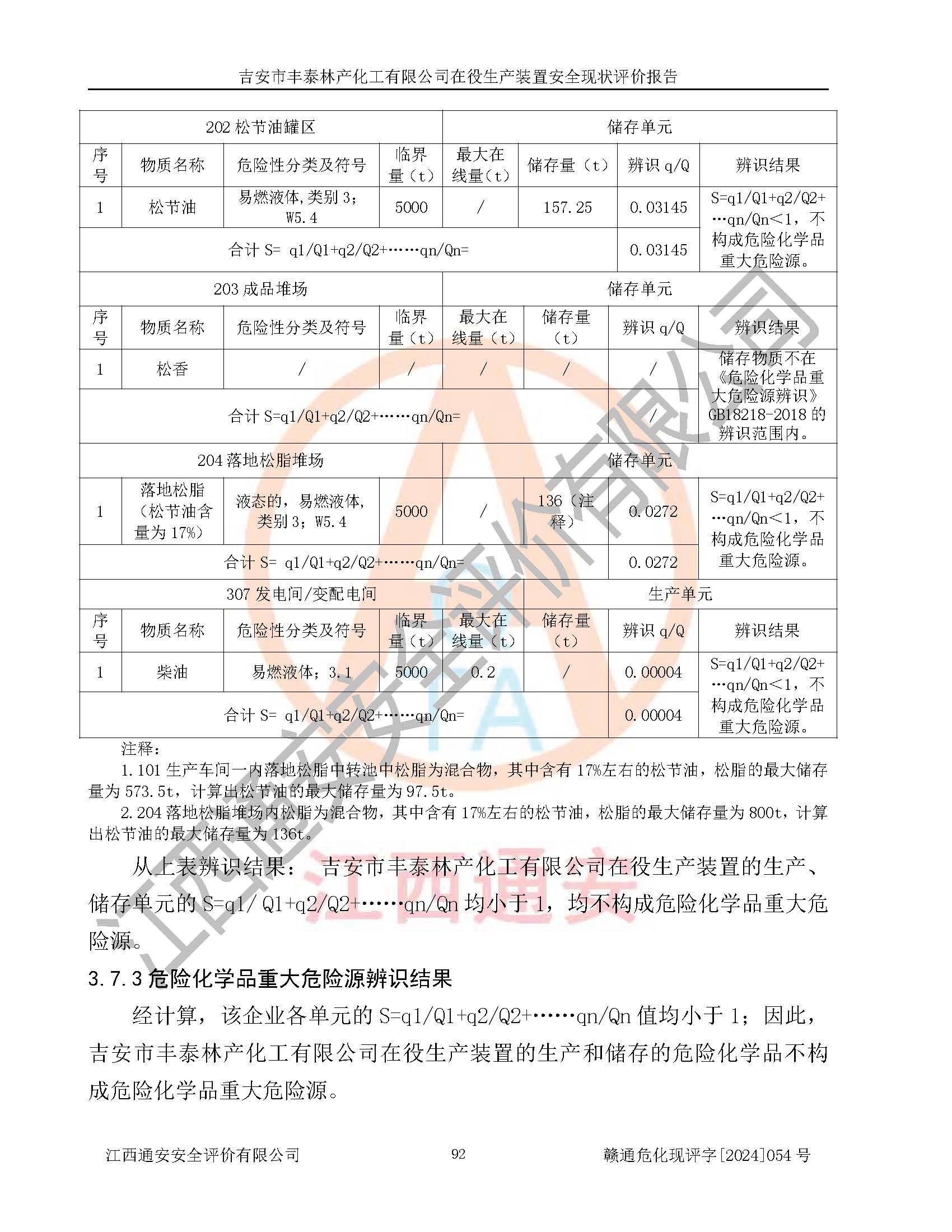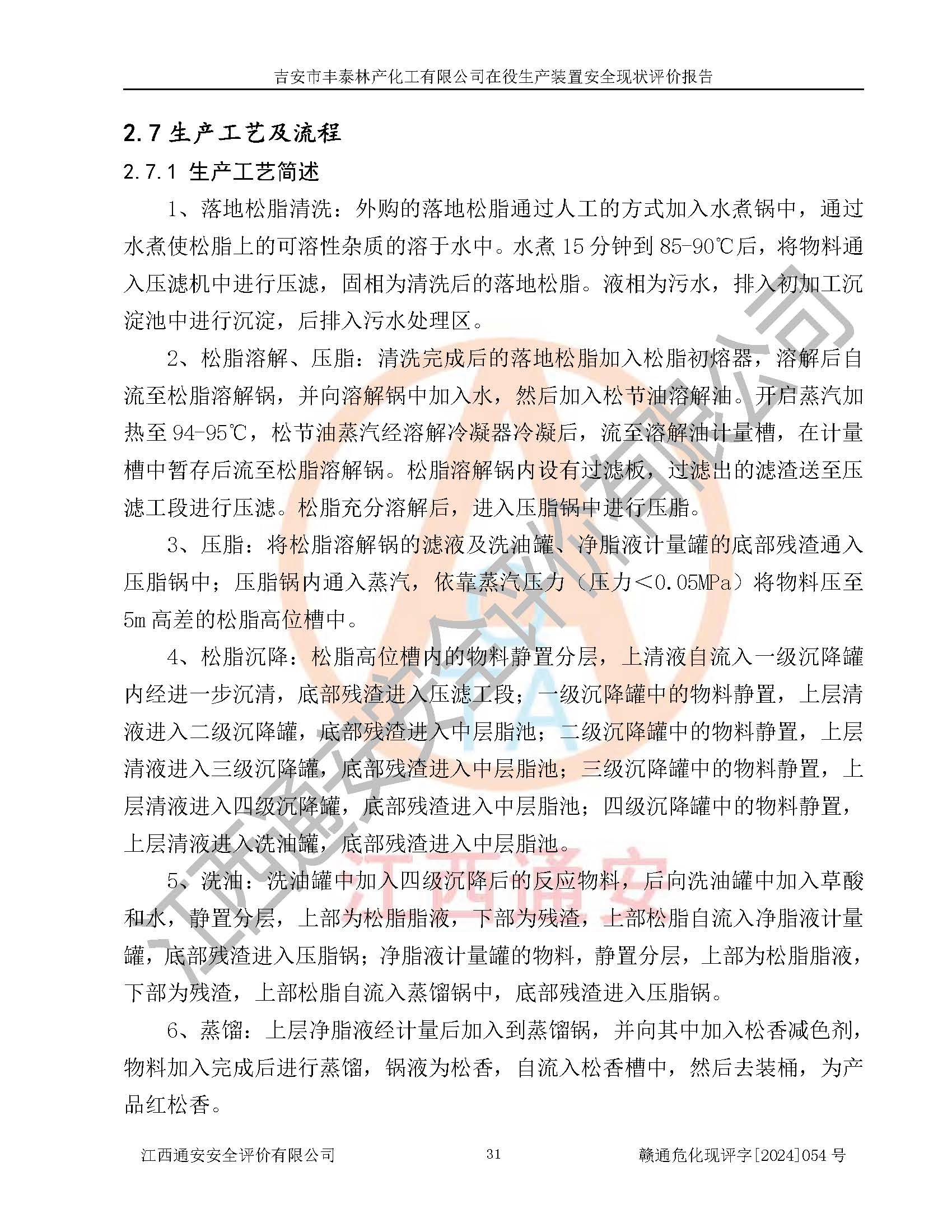 评价结论 | 评价结论:本报告认为,吉安市丰泰林产化工有限公司在役生产装置现场情况与设计图纸一致,有关从业人员资格符合《江西省危险化学品安全专项整治三年行动实施方案》要求,安全设施及安全管理符合**及有关部门关于安全生产法律法规、标准的要求,安全设施正常投用且运行**,安全风险是可以控制的,其风险程度是可以接受的,安全现状符合安全生产条件,能够满足安全生产的要求。 | |||