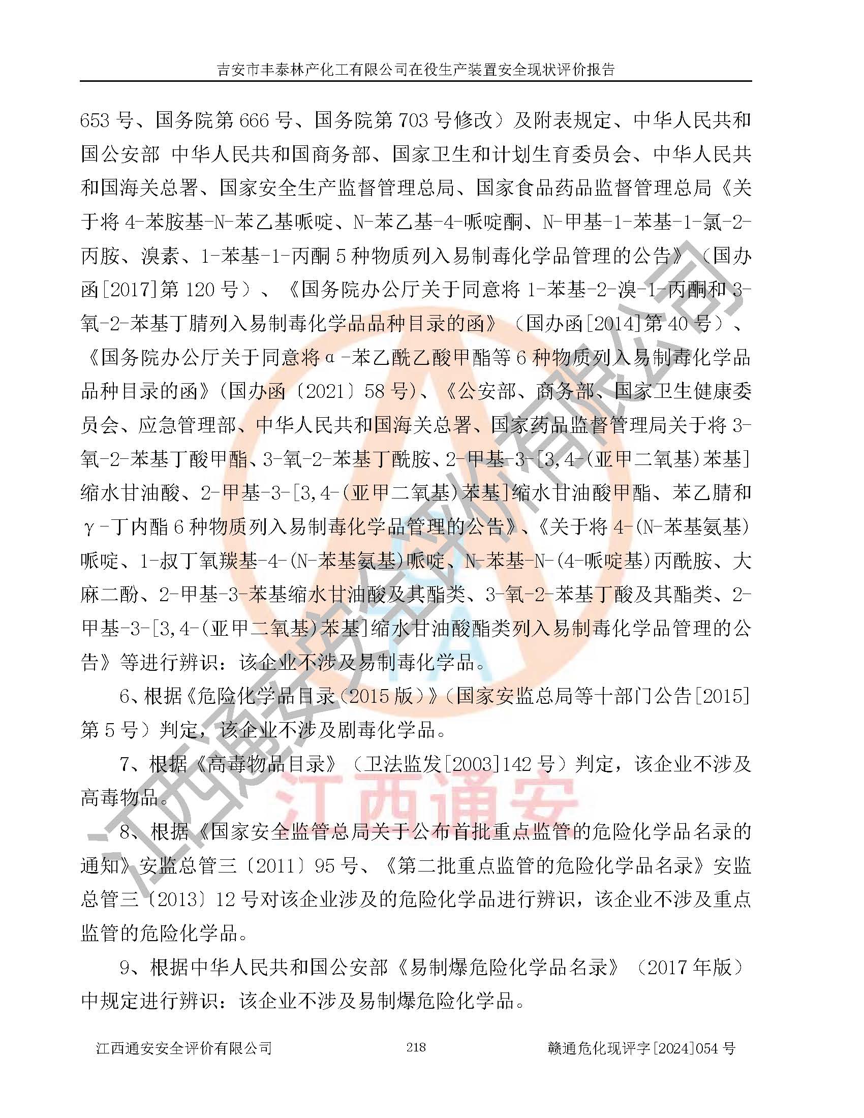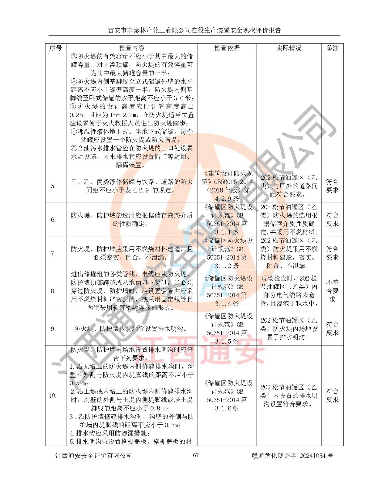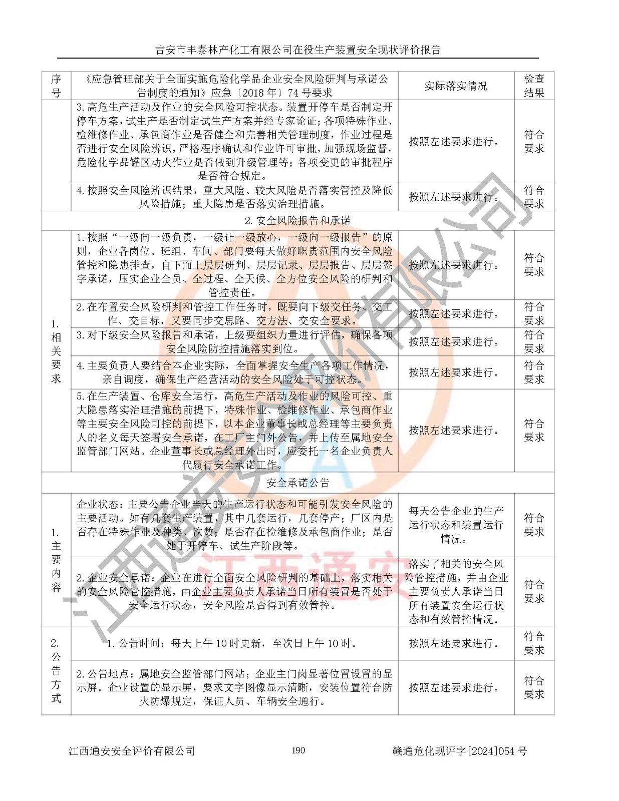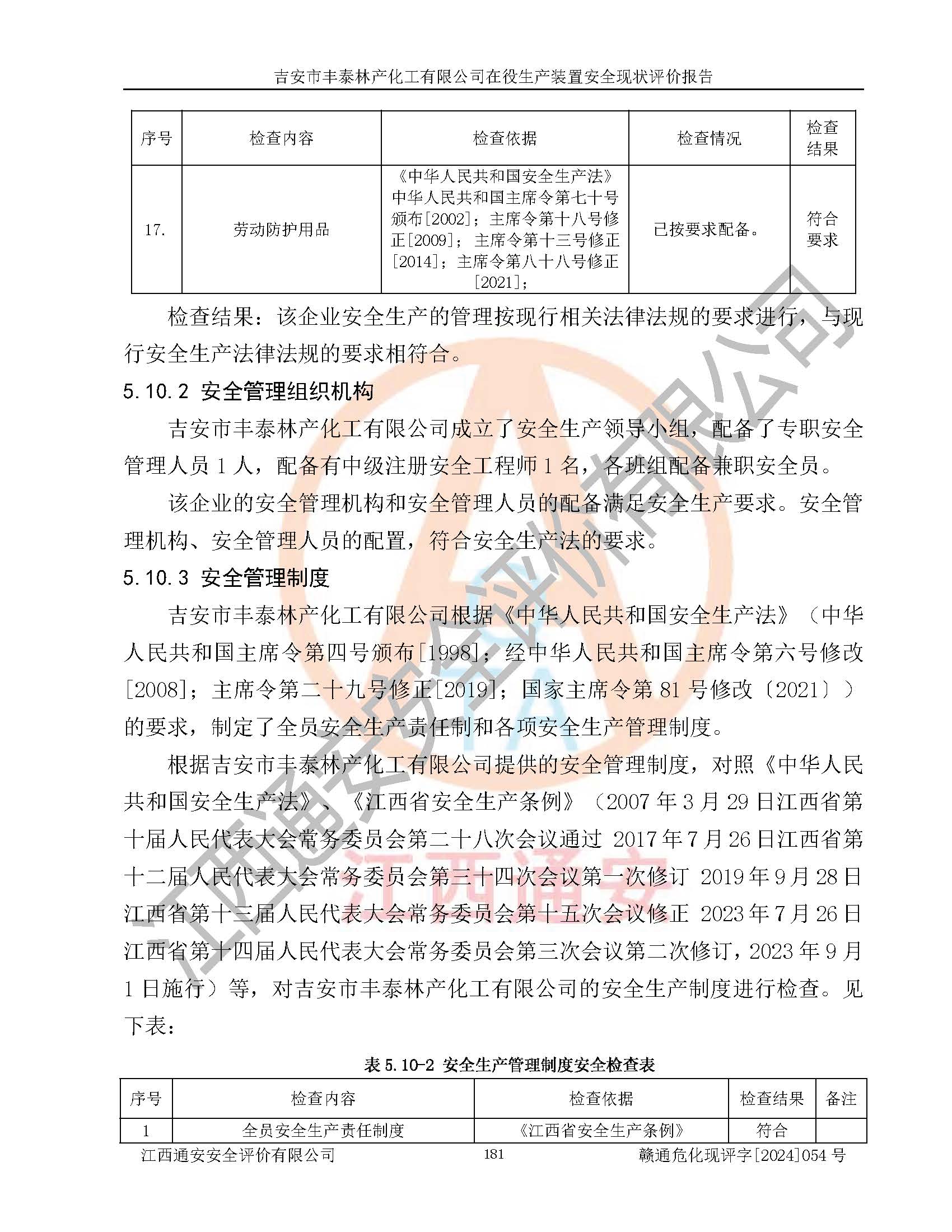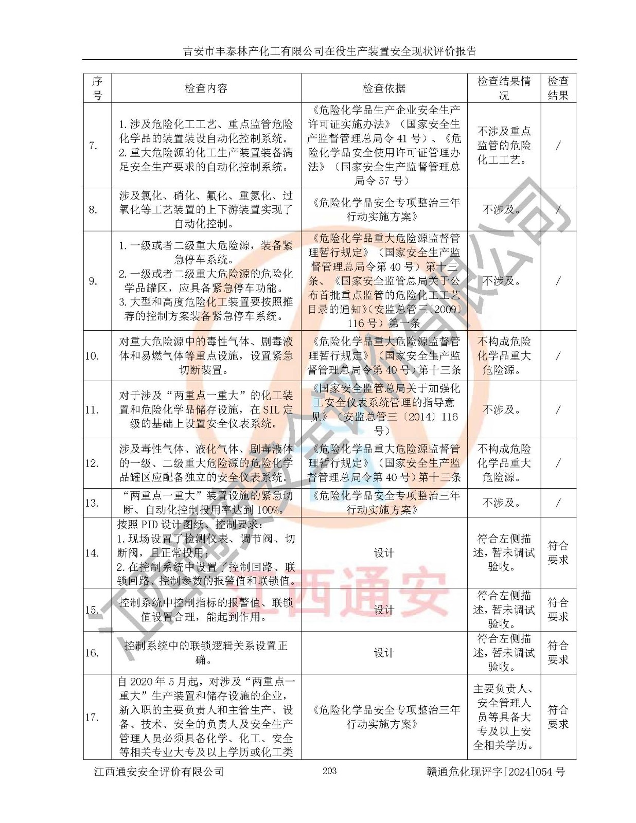评价结论 | 评价结论:本报告认为,吉安市丰泰林产化工有限公司在役生产装置现场情况与设计图纸一致,有关从业人员资格符合《江西省危险化学品安全专项整治三年行动实施方案》要求,安全设施及安全管理符合**及有关部门关于安全生产法律法规、标准的要求,安全设施正常投用且运行**,安全风险是可以控制的,其风险程度是可以接受的,安全现状符合安全生产条件,能够满足安全生产的要求。 | |||