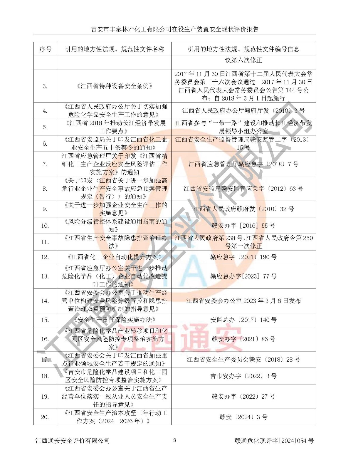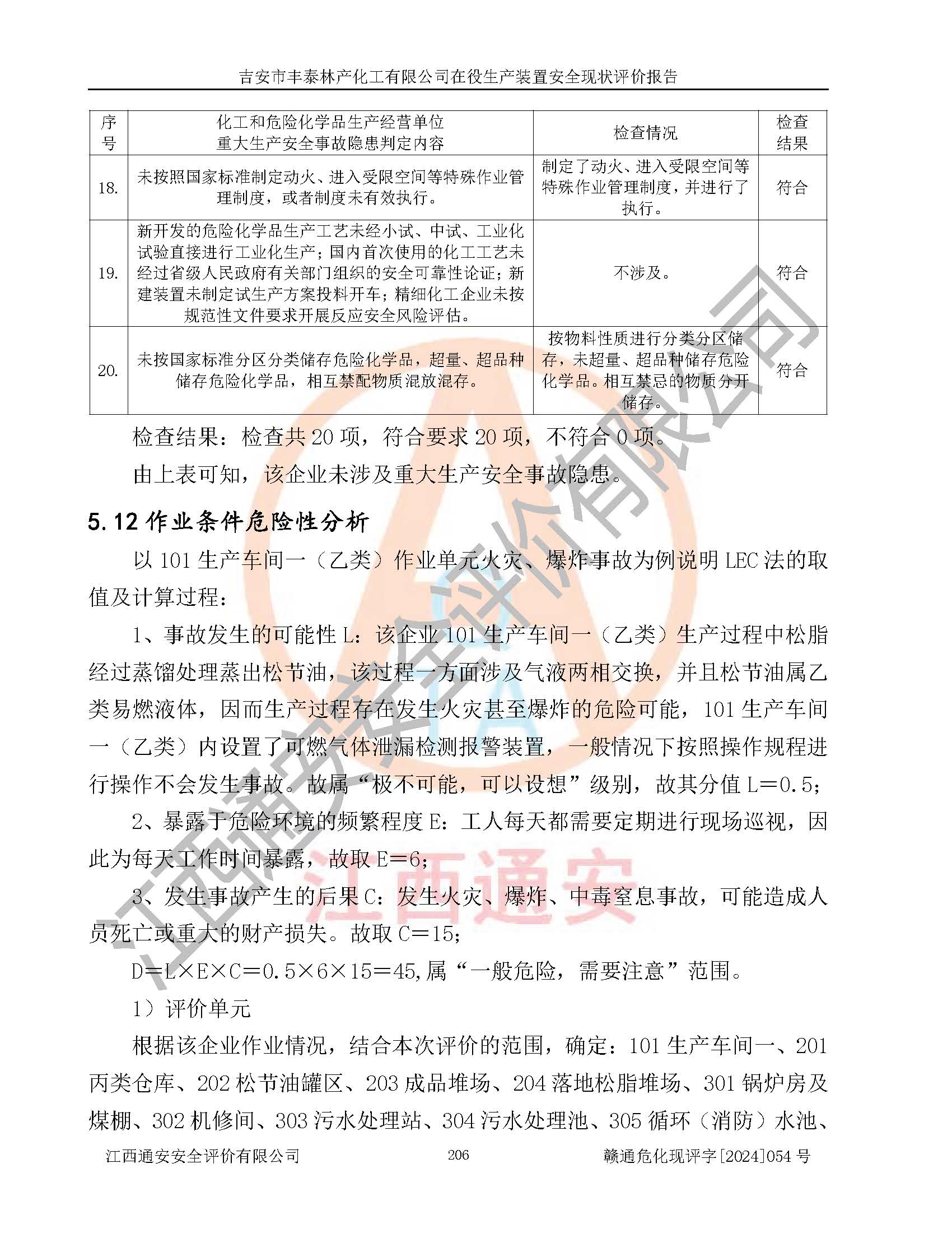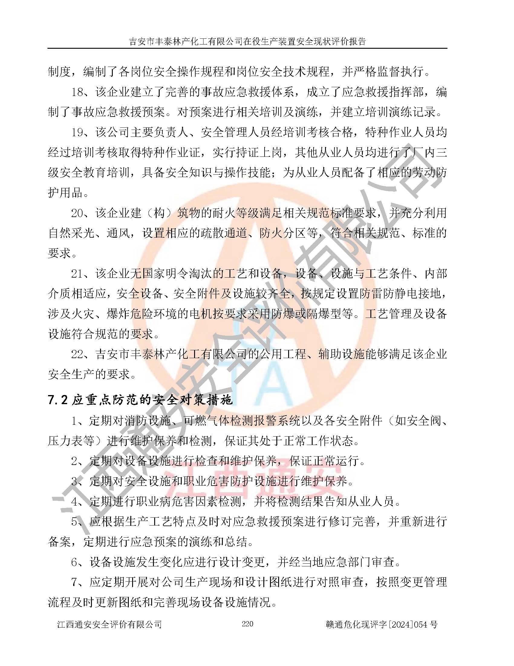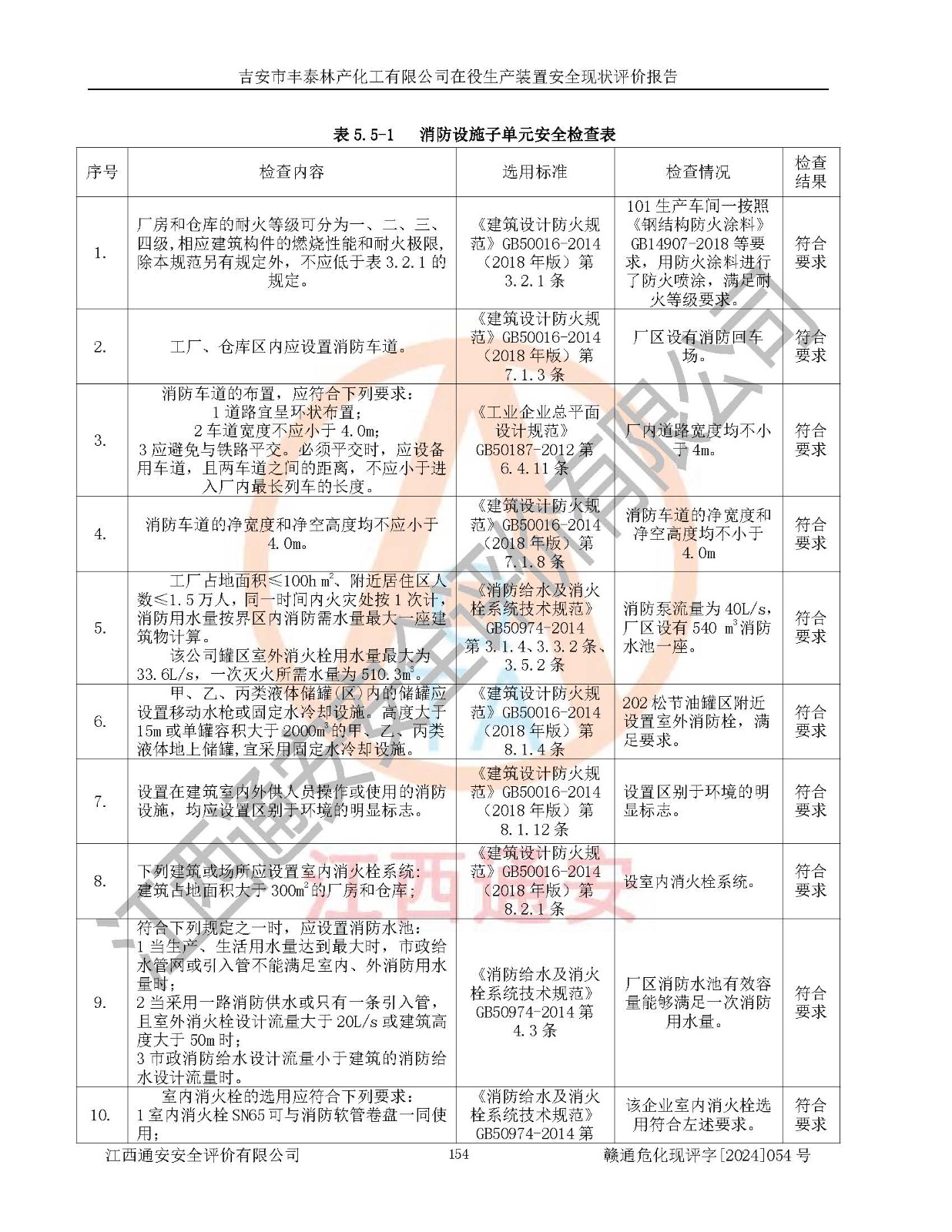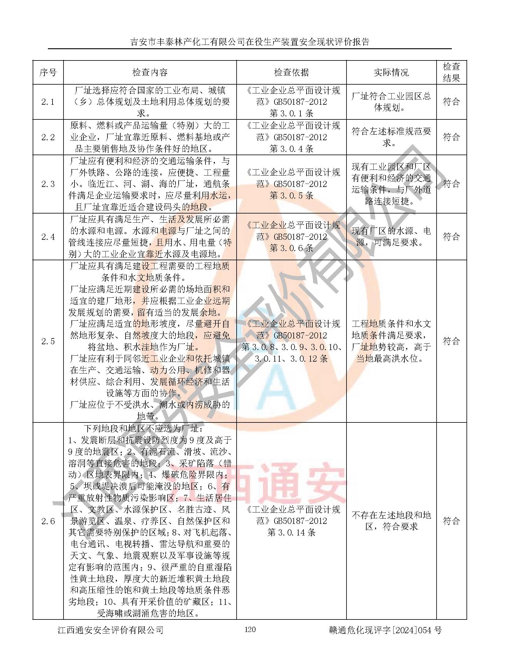 评价结论 | 评价结论:本报告认为,吉安市丰泰林产化工有限公司在役生产装置现场情况与设计图纸一致,有关从业人员资格符合《江西省危险化学品安全专项整治三年行动实施方案》要求,安全设施及安全管理符合**及有关部门关于安全生产法律法规、标准的要求,安全设施正常投用且运行**,安全风险是可以控制的,其风险程度是可以接受的,安全现状符合安全生产条件,能够满足安全生产的要求。 | |||