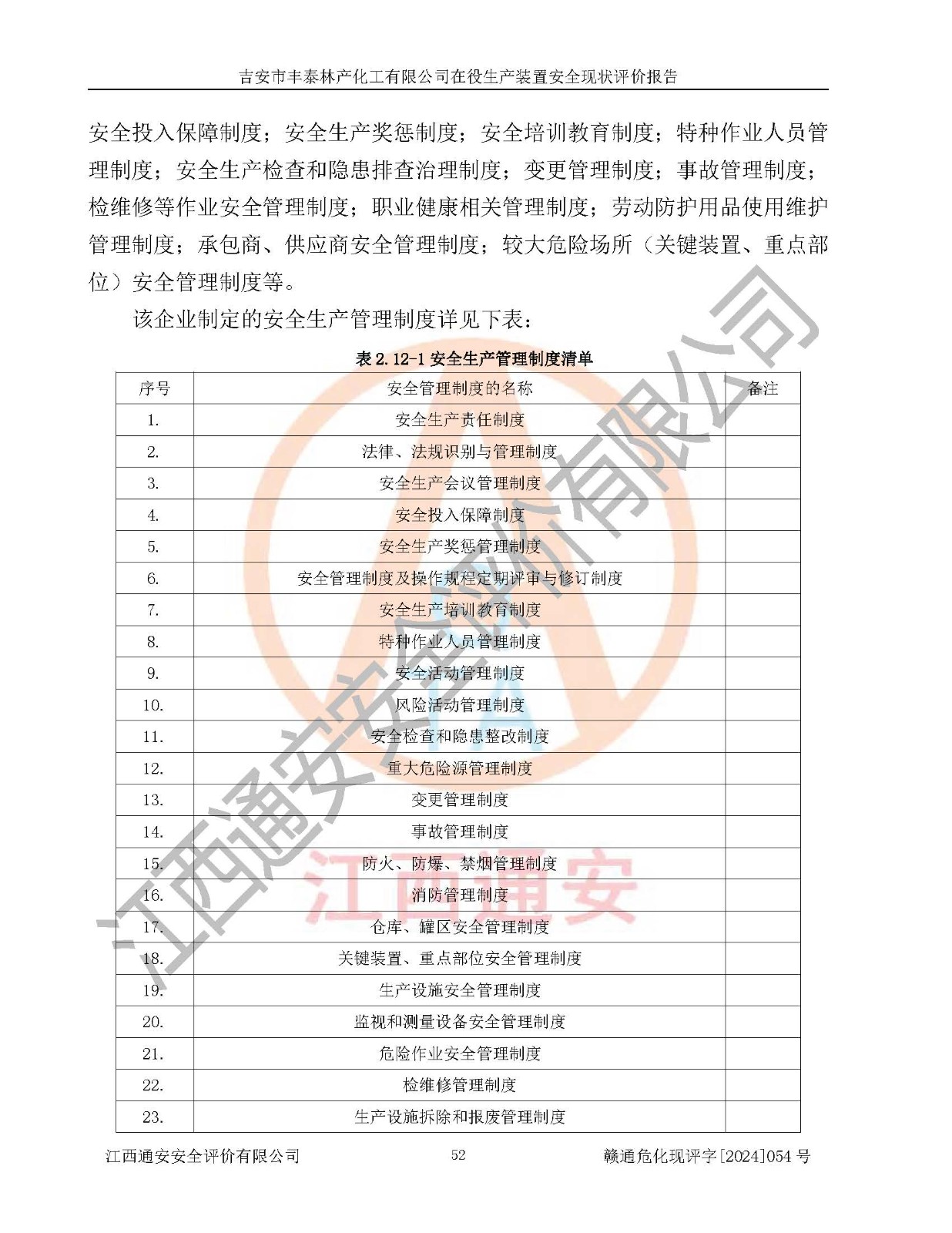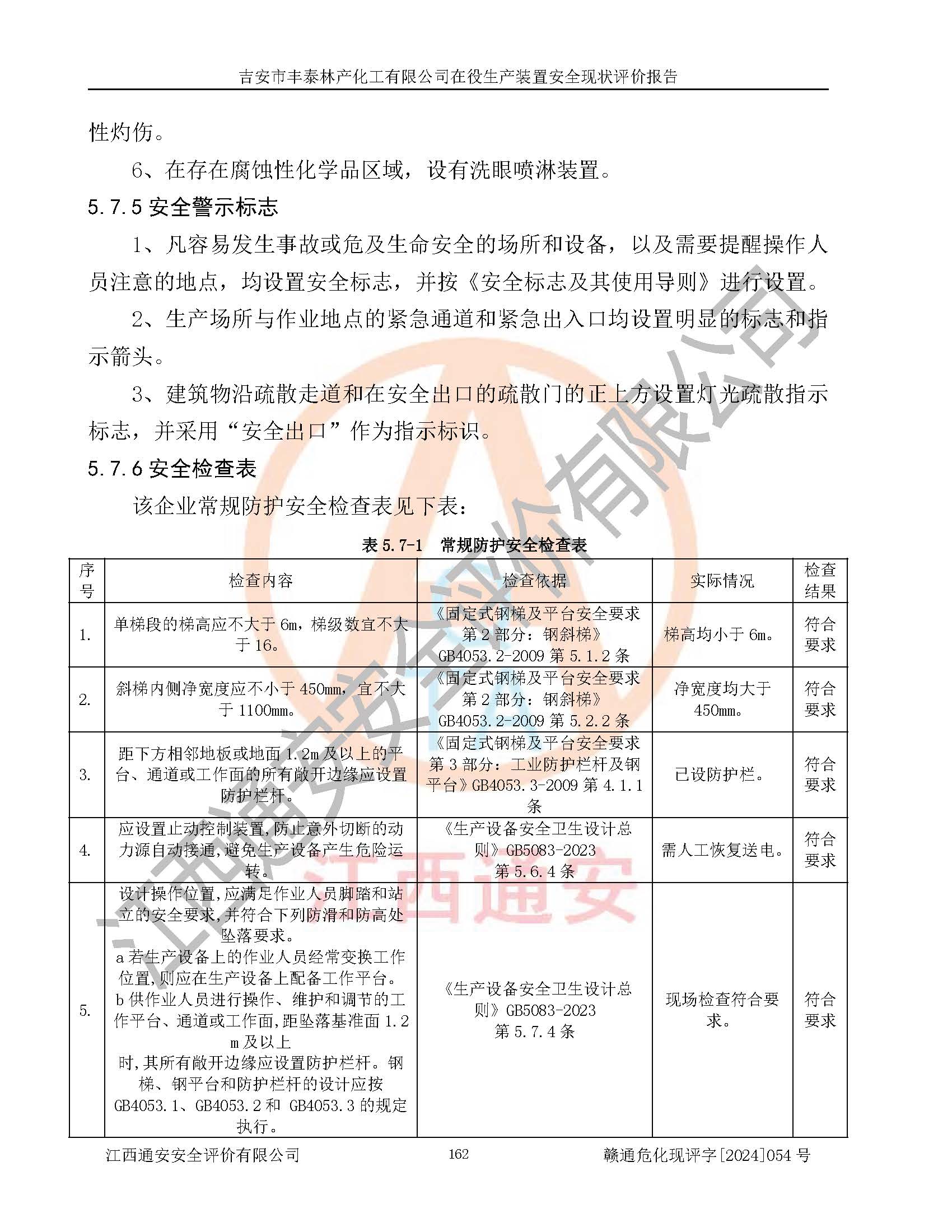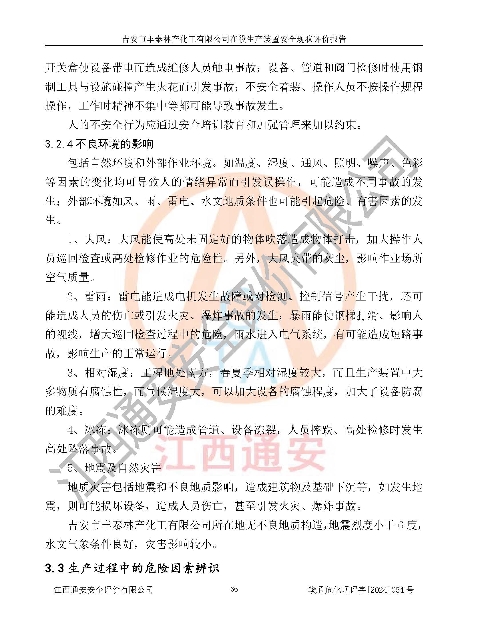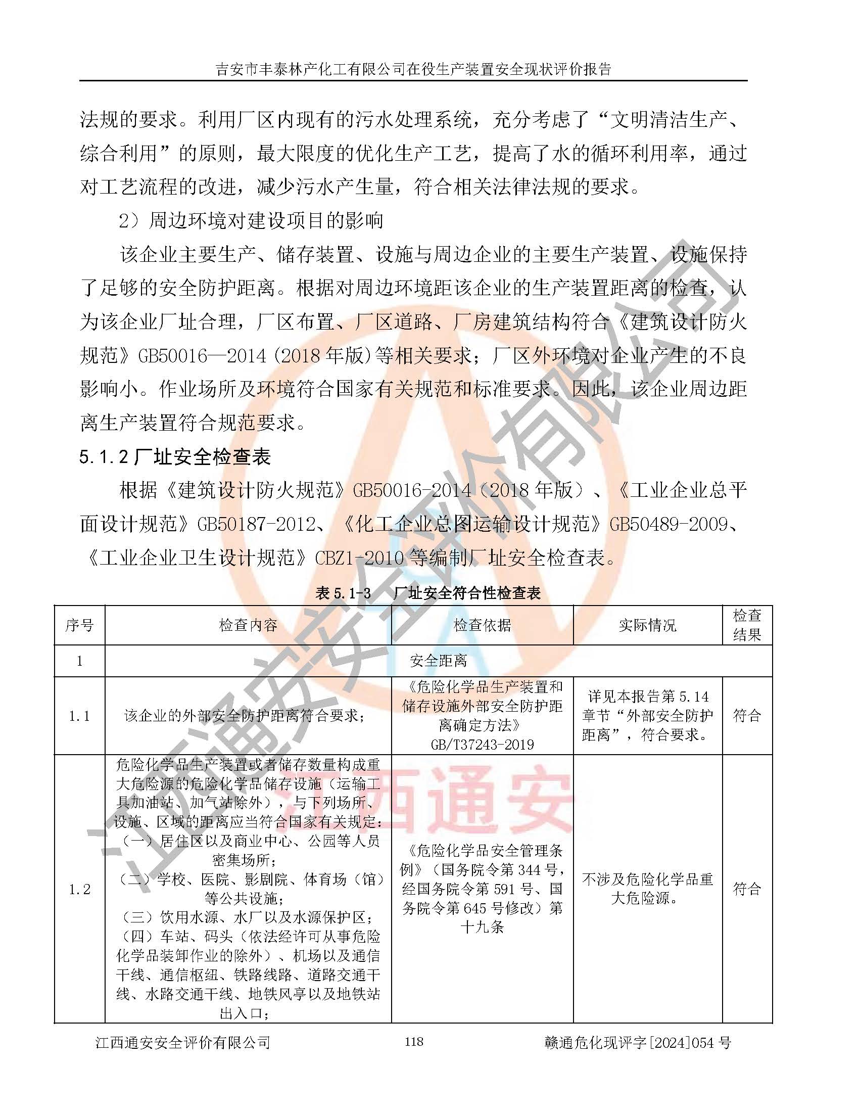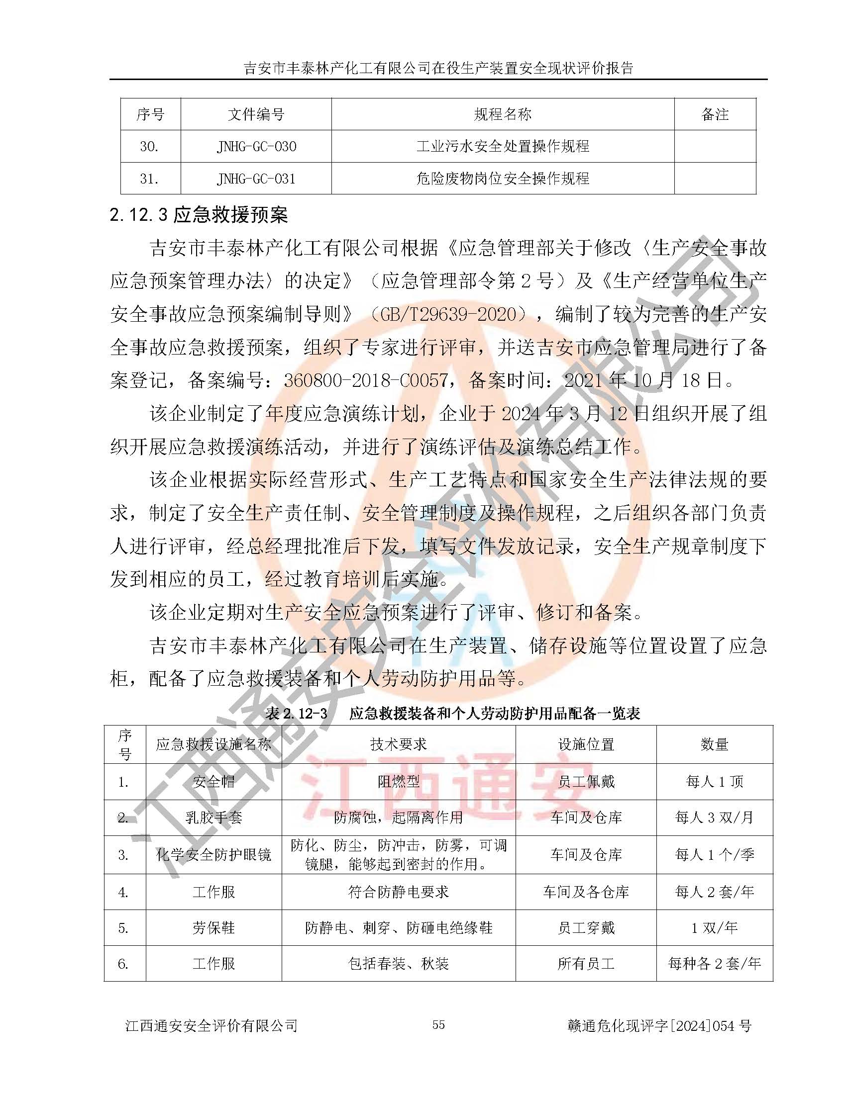评价结论 | 评价结论:本报告认为,吉安市丰泰林产化工有限公司在役生产装置现场情况与设计图纸一致,有关从业人员资格符合《江西省危险化学品安全专项整治三年行动实施方案》要求,安全设施及安全管理符合**及有关部门关于安全生产法律法规、标准的要求,安全设施正常投用且运行**,安全风险是可以控制的,其风险程度是可以接受的,安全现状符合安全生产条件,能够满足安全生产的要求。 | |||