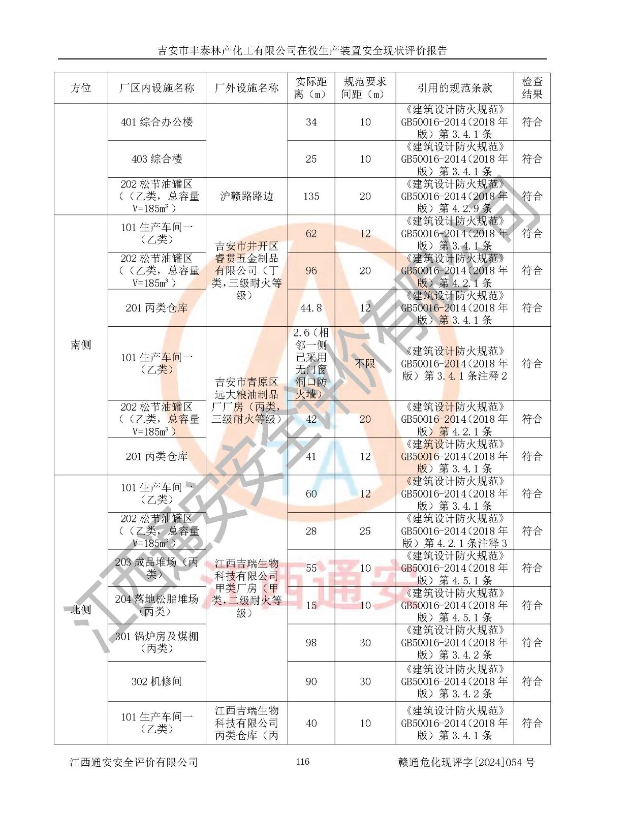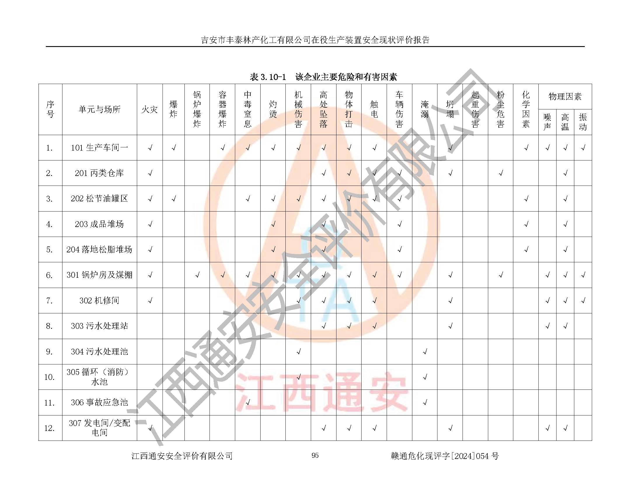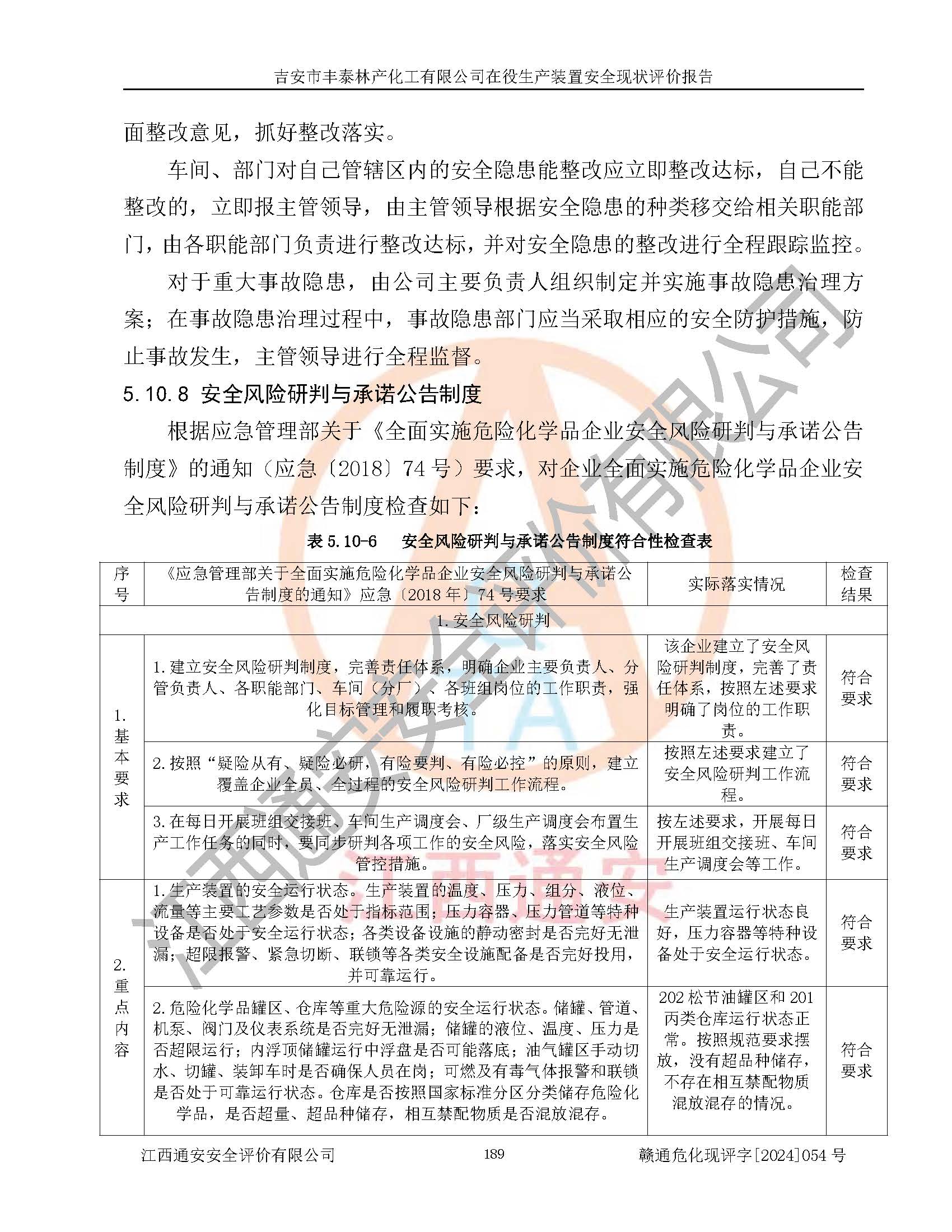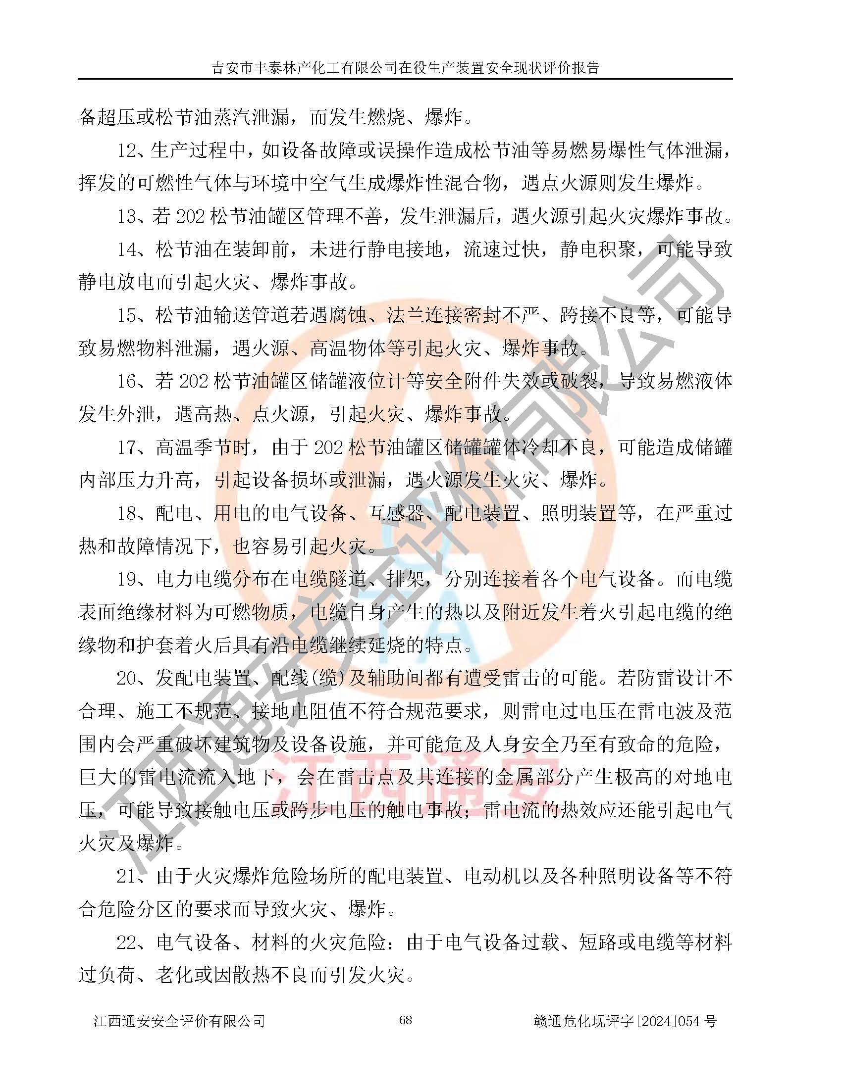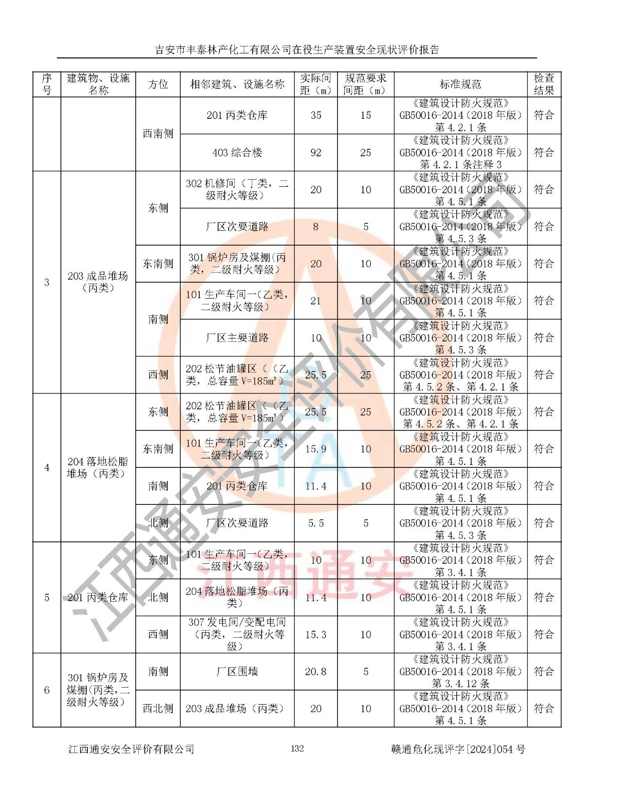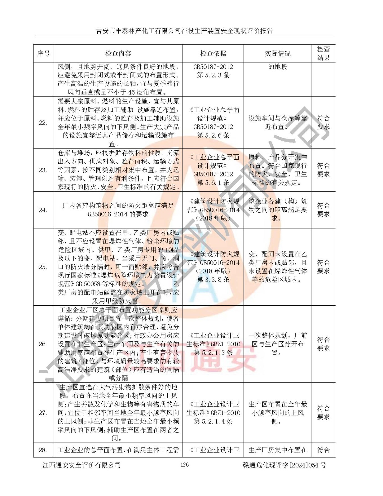 评价结论 | 评价结论:本报告认为,吉安市丰泰林产化工有限公司在役生产装置现场情况与设计图纸一致,有关从业人员资格符合《江西省危险化学品安全专项整治三年行动实施方案》要求,安全设施及安全管理符合**及有关部门关于安全生产法律法规、标准的要求,安全设施正常投用且运行**,安全风险是可以控制的,其风险程度是可以接受的,安全现状符合安全生产条件,能够满足安全生产的要求。 | |||
