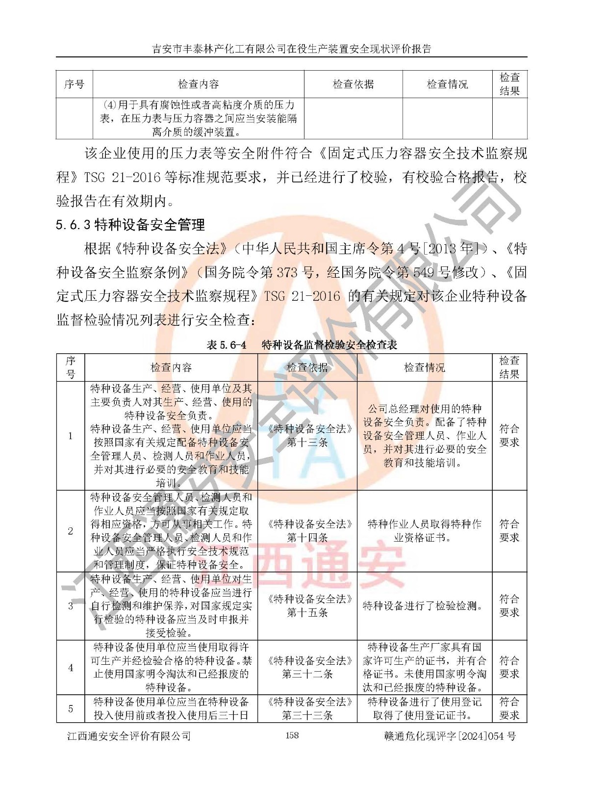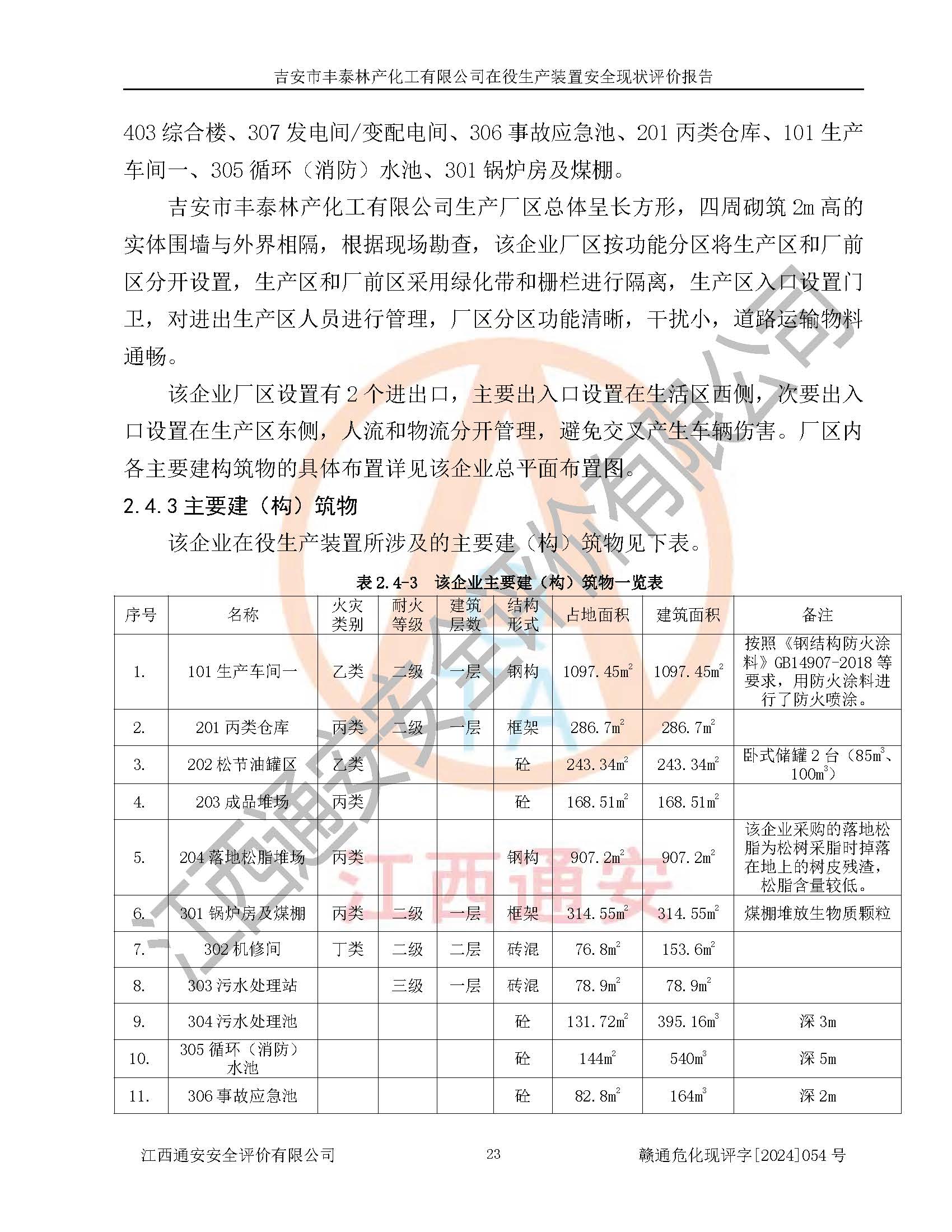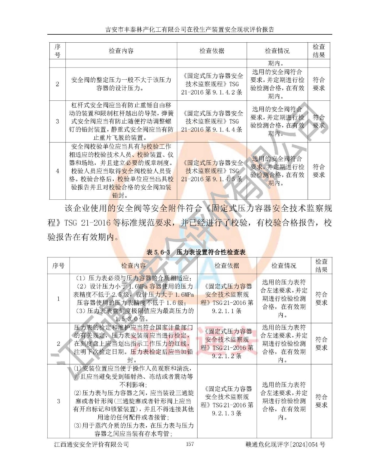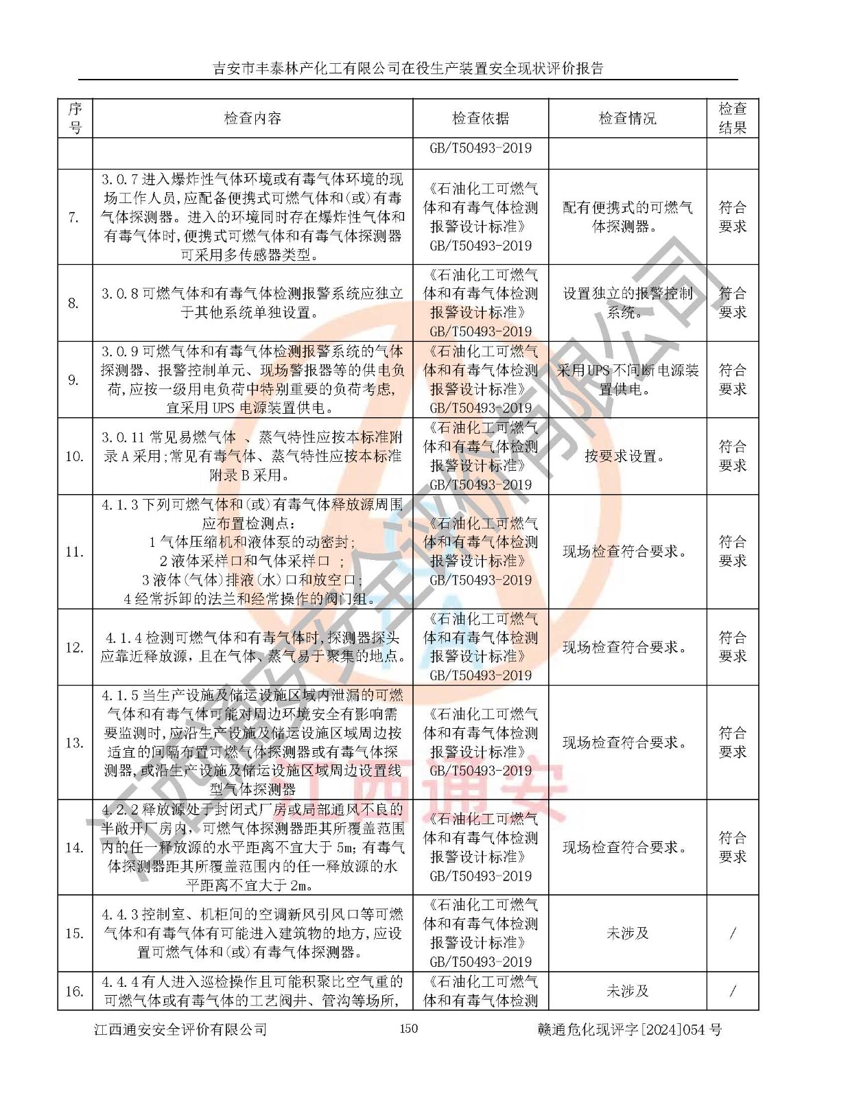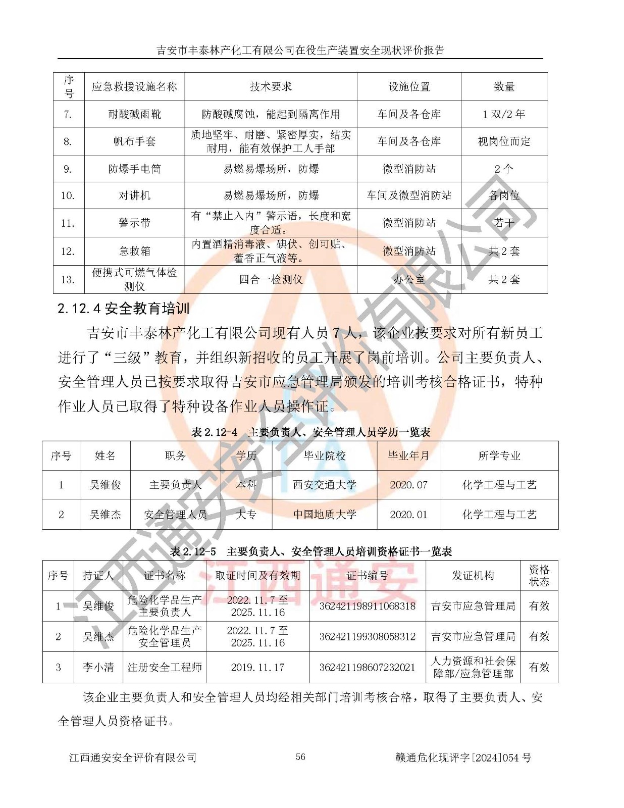 评价结论 | 评价结论:本报告认为,吉安市丰泰林产化工有限公司在役生产装置现场情况与设计图纸一致,有关从业人员资格符合《江西省危险化学品安全专项整治三年行动实施方案》要求,安全设施及安全管理符合**及有关部门关于安全生产法律法规、标准的要求,安全设施正常投用且运行**,安全风险是可以控制的,其风险程度是可以接受的,安全现状符合安全生产条件,能够满足安全生产的要求。 | |||