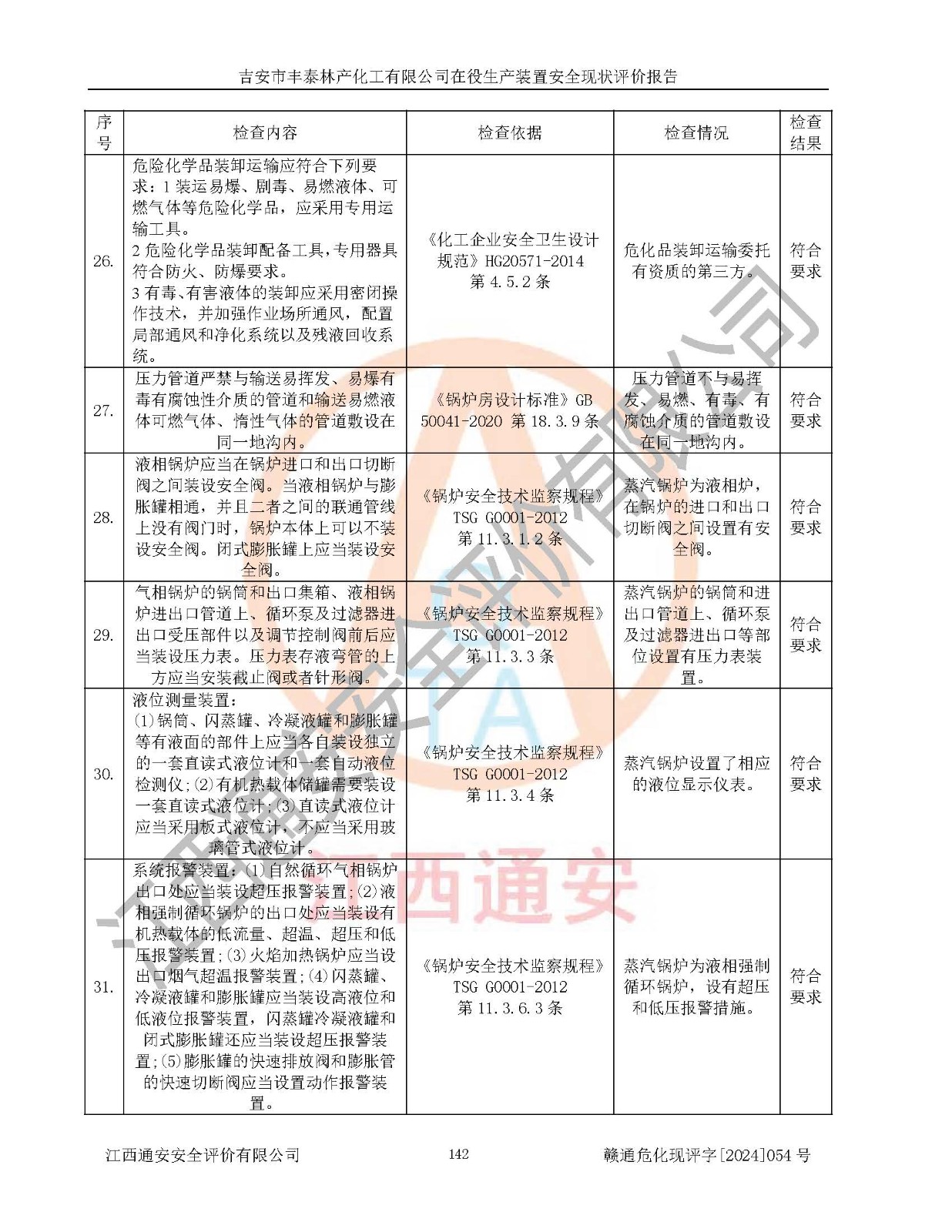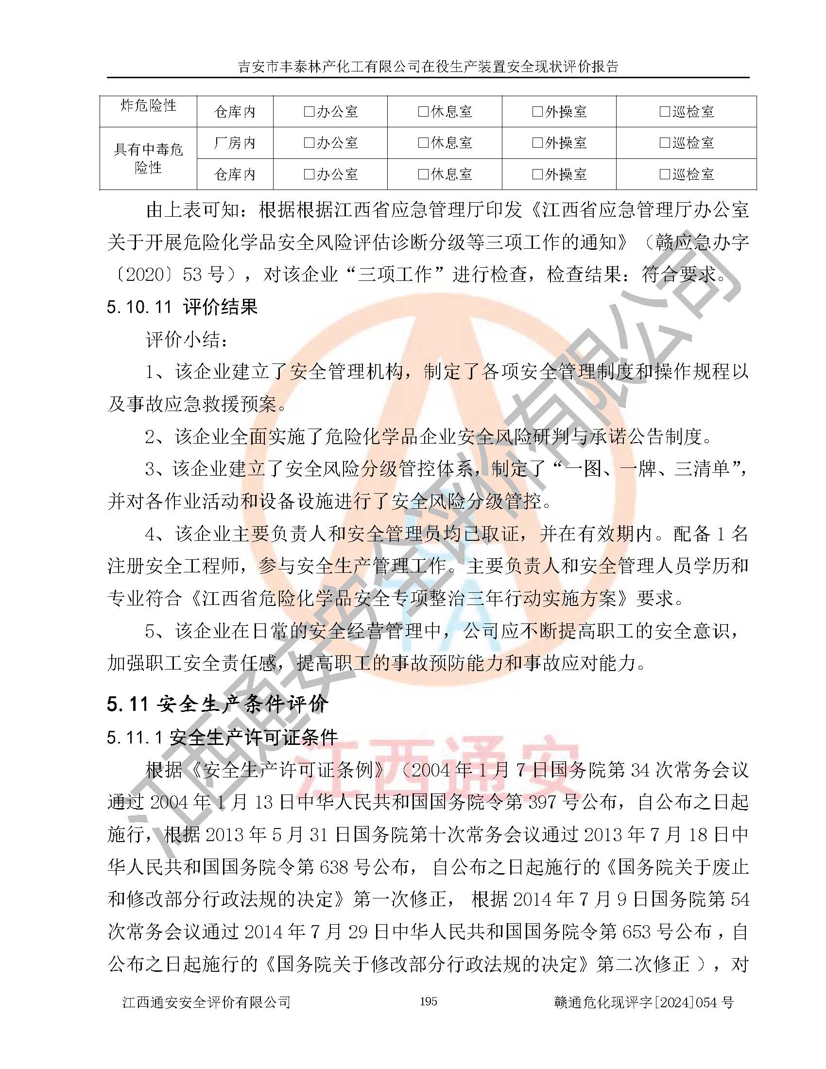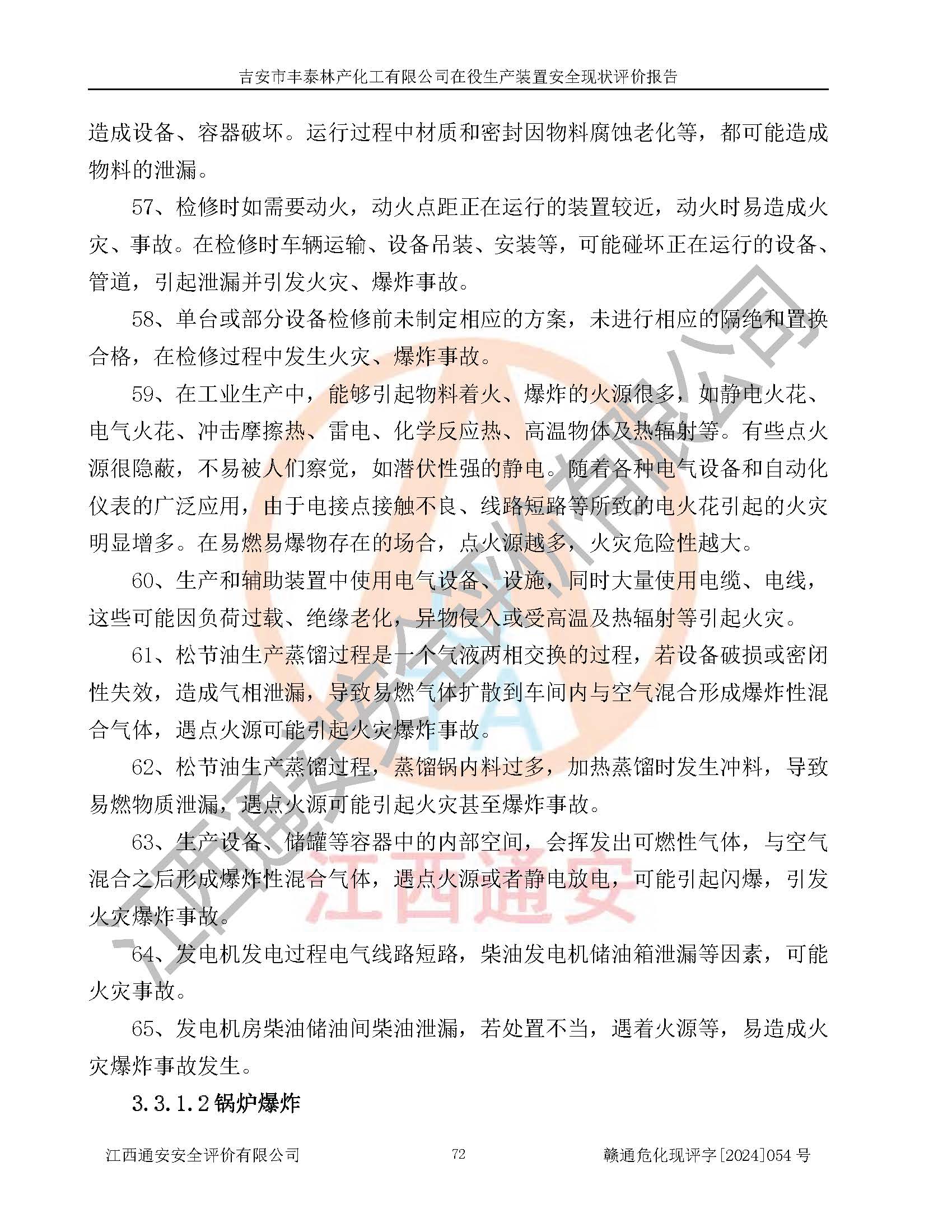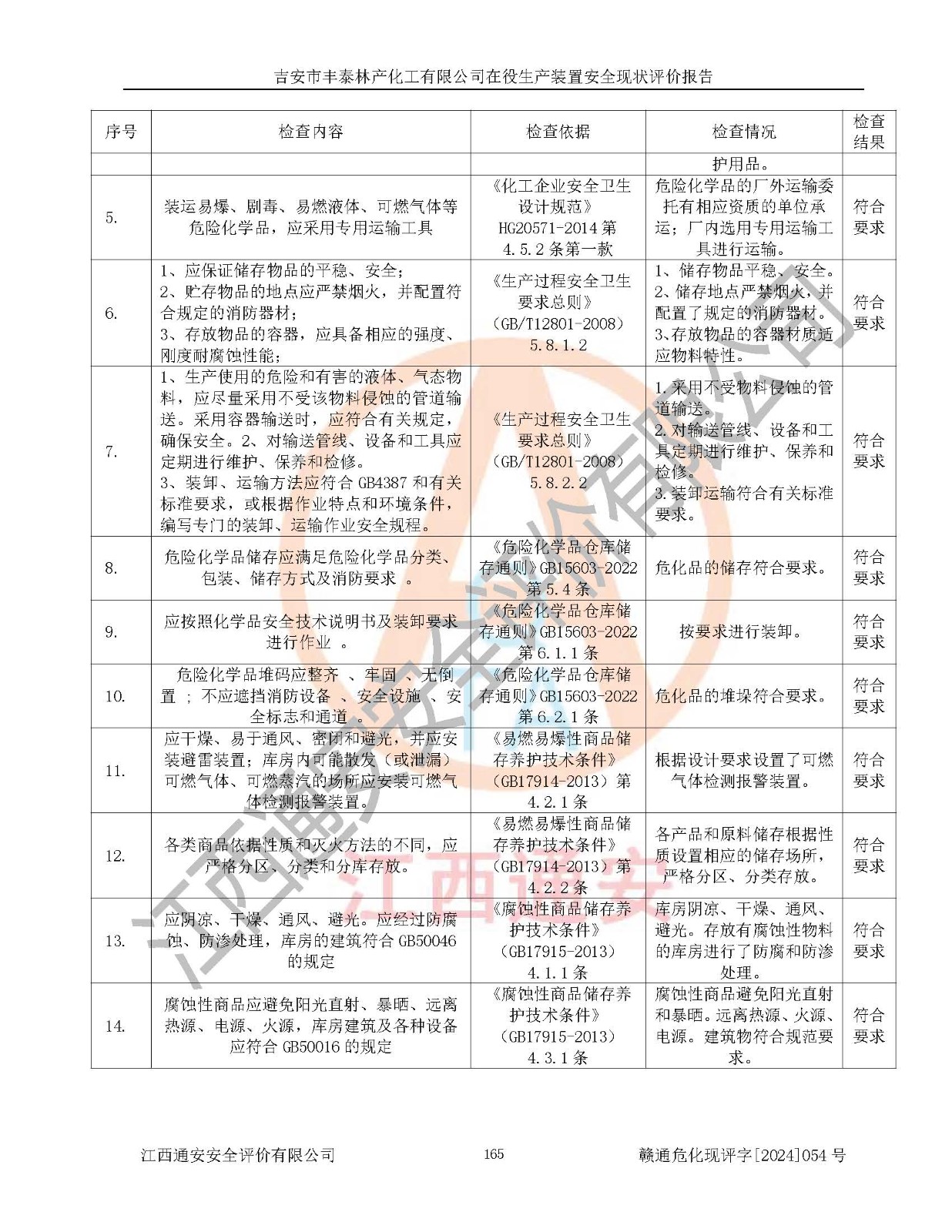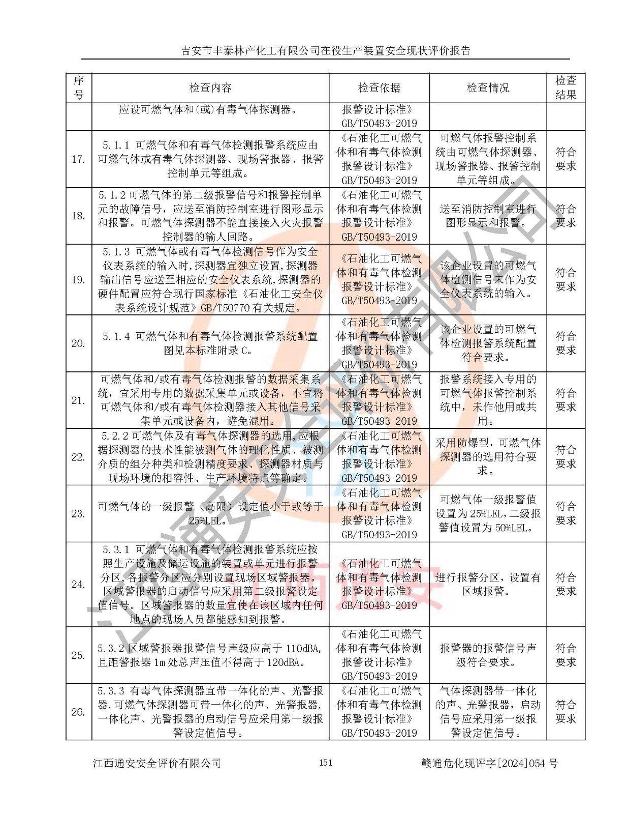 评价结论 | 评价结论:本报告认为,吉安市丰泰林产化工有限公司在役生产装置现场情况与设计图纸一致,有关从业人员资格符合《江西省危险化学品安全专项整治三年行动实施方案》要求,安全设施及安全管理符合**及有关部门关于安全生产法律法规、标准的要求,安全设施正常投用且运行**,安全风险是可以控制的,其风险程度是可以接受的,安全现状符合安全生产条件,能够满足安全生产的要求。 | |||