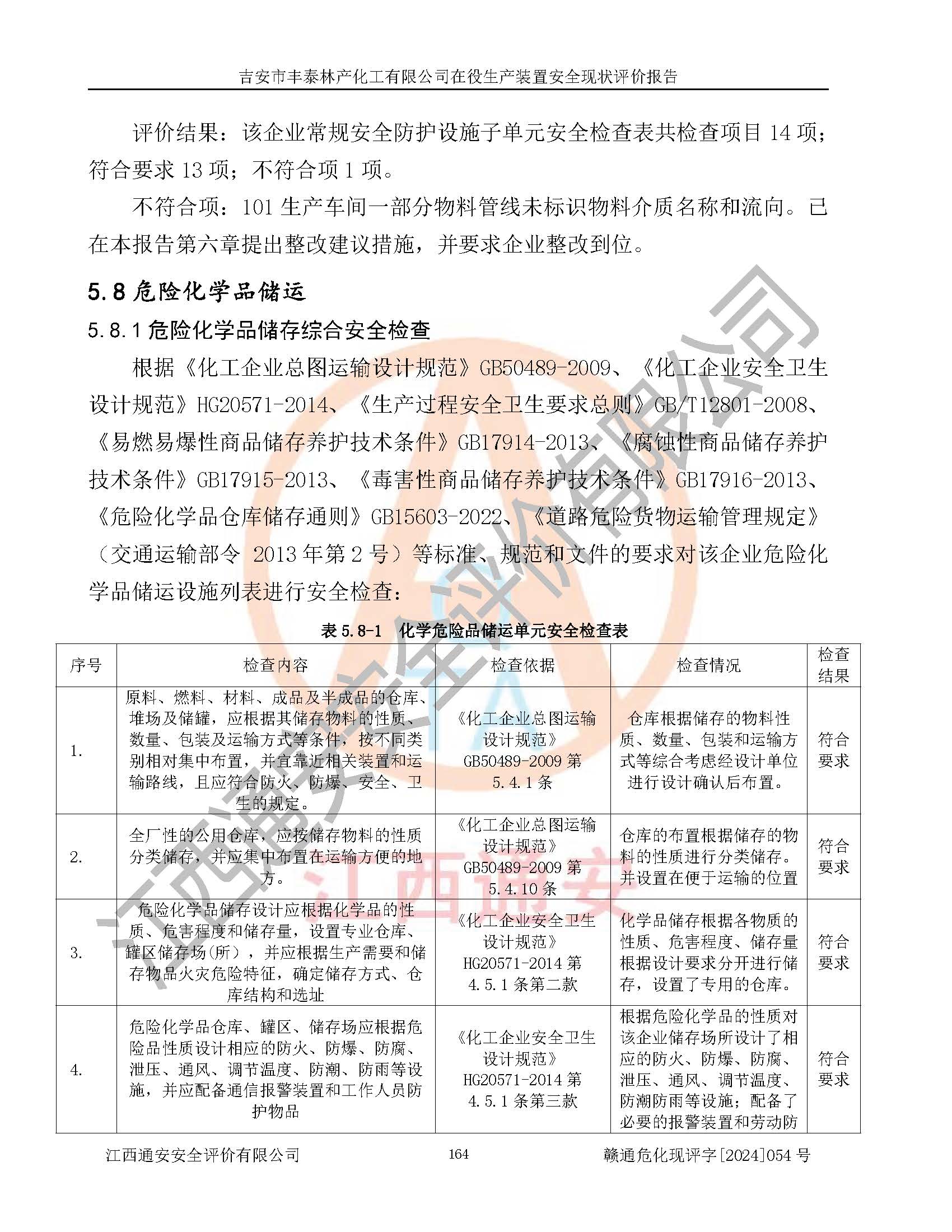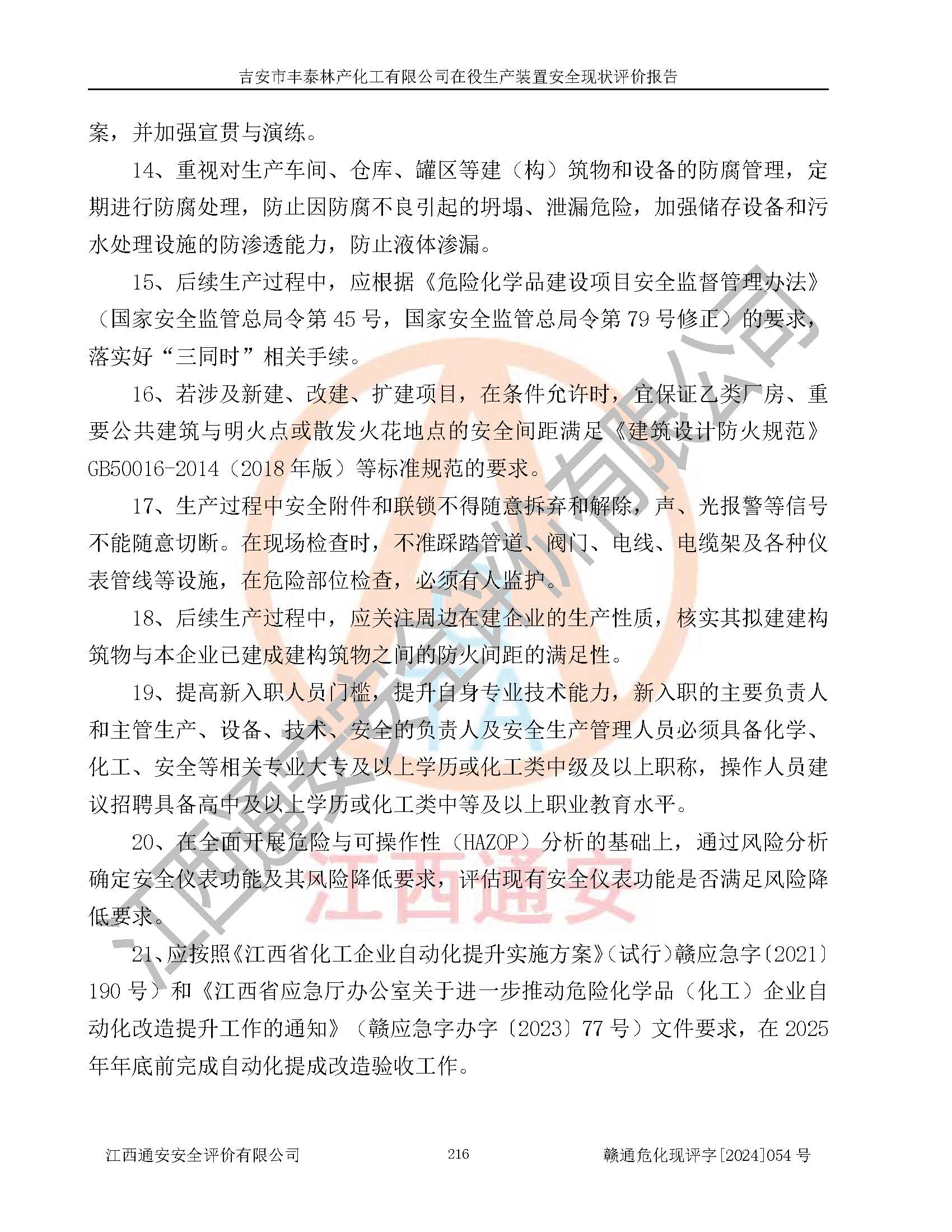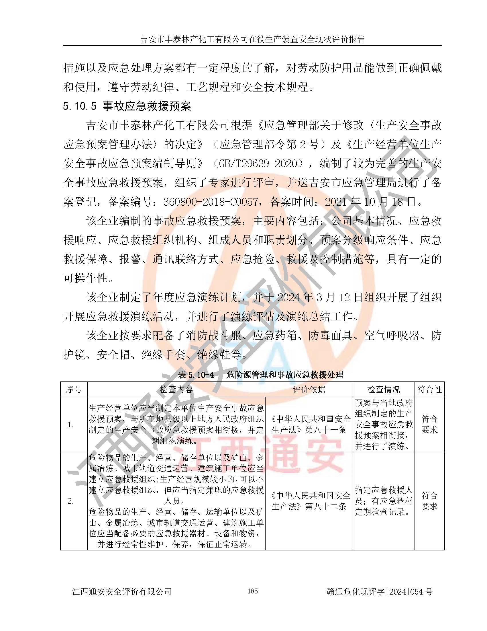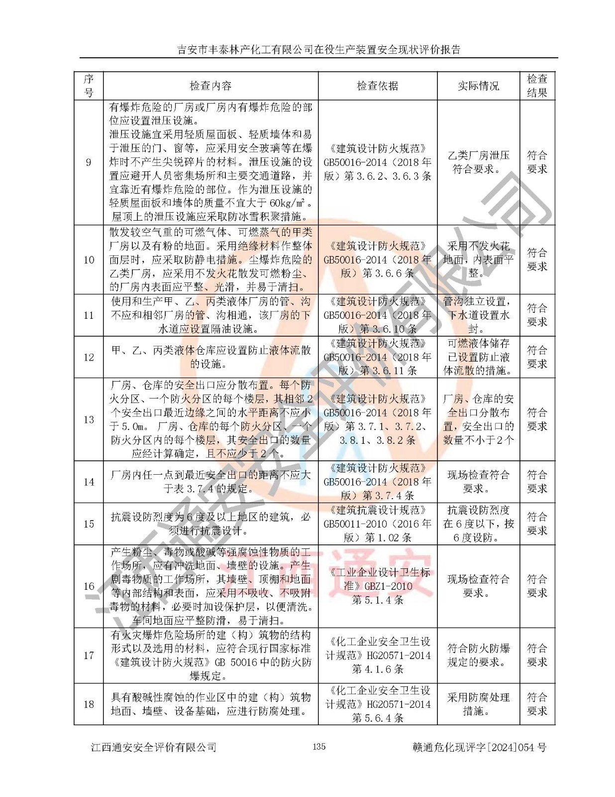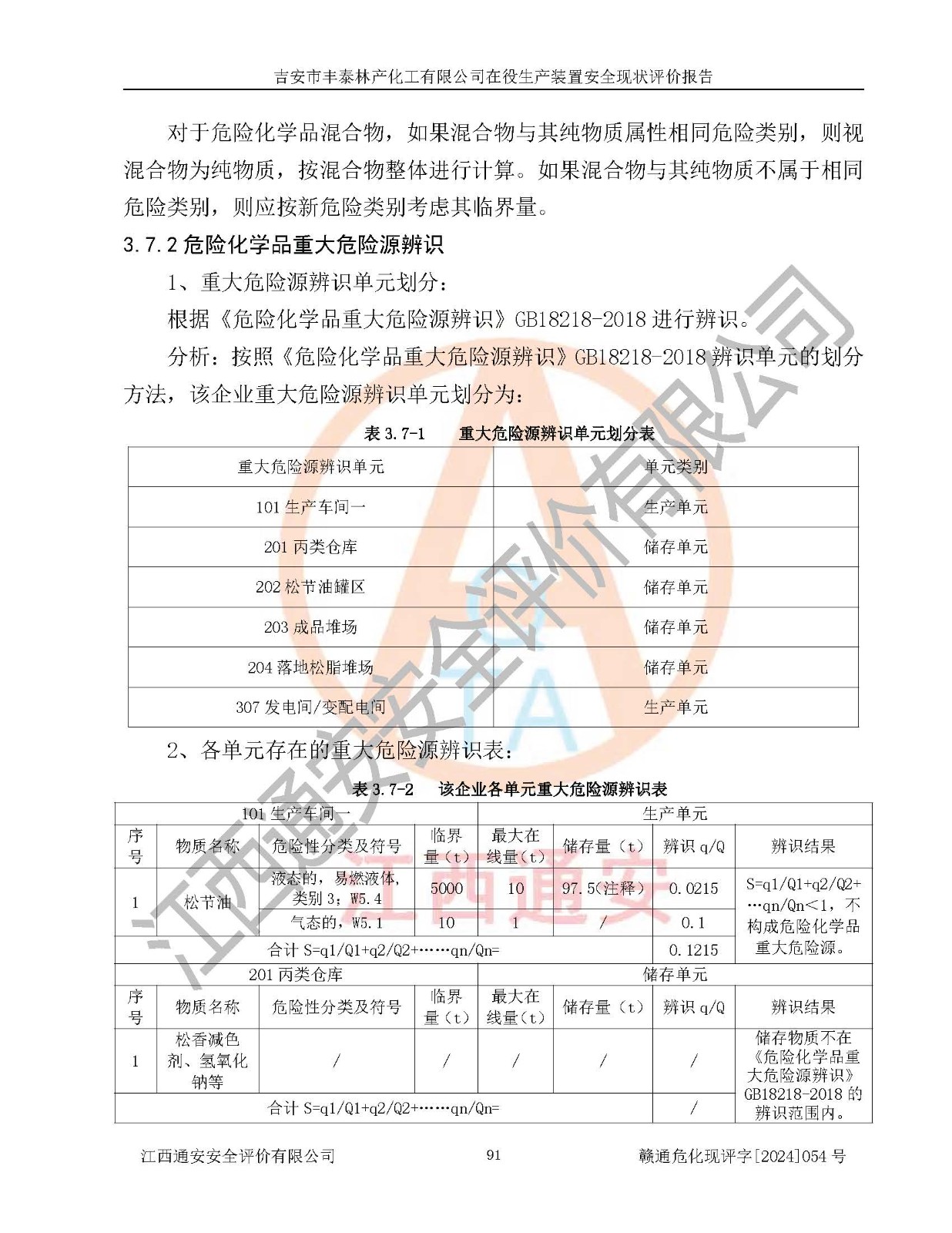 评价结论 | 评价结论:本报告认为,吉安市丰泰林产化工有限公司在役生产装置现场情况与设计图纸一致,有关从业人员资格符合《江西省危险化学品安全专项整治三年行动实施方案》要求,安全设施及安全管理符合**及有关部门关于安全生产法律法规、标准的要求,安全设施正常投用且运行**,安全风险是可以控制的,其风险程度是可以接受的,安全现状符合安全生产条件,能够满足安全生产的要求。 | |||