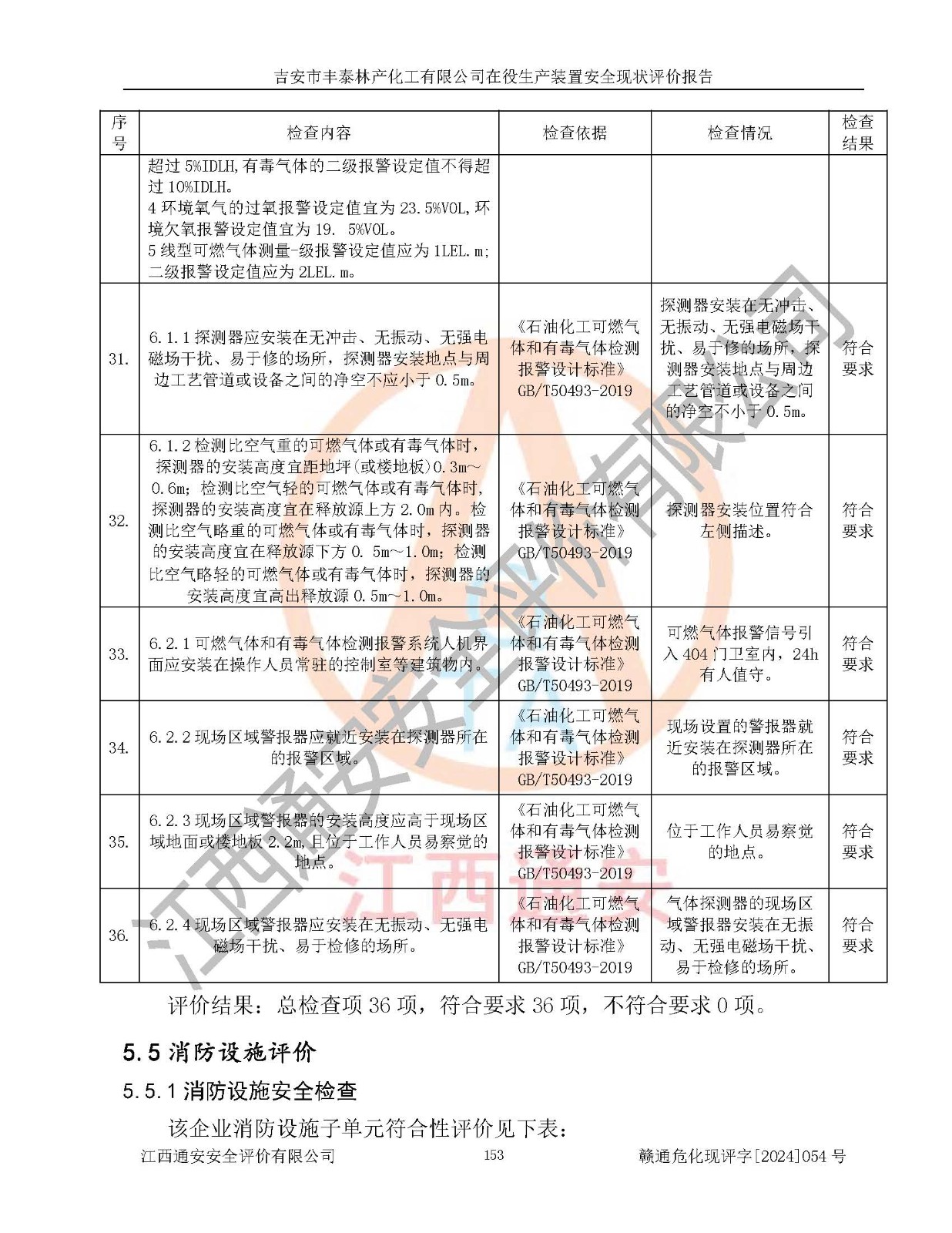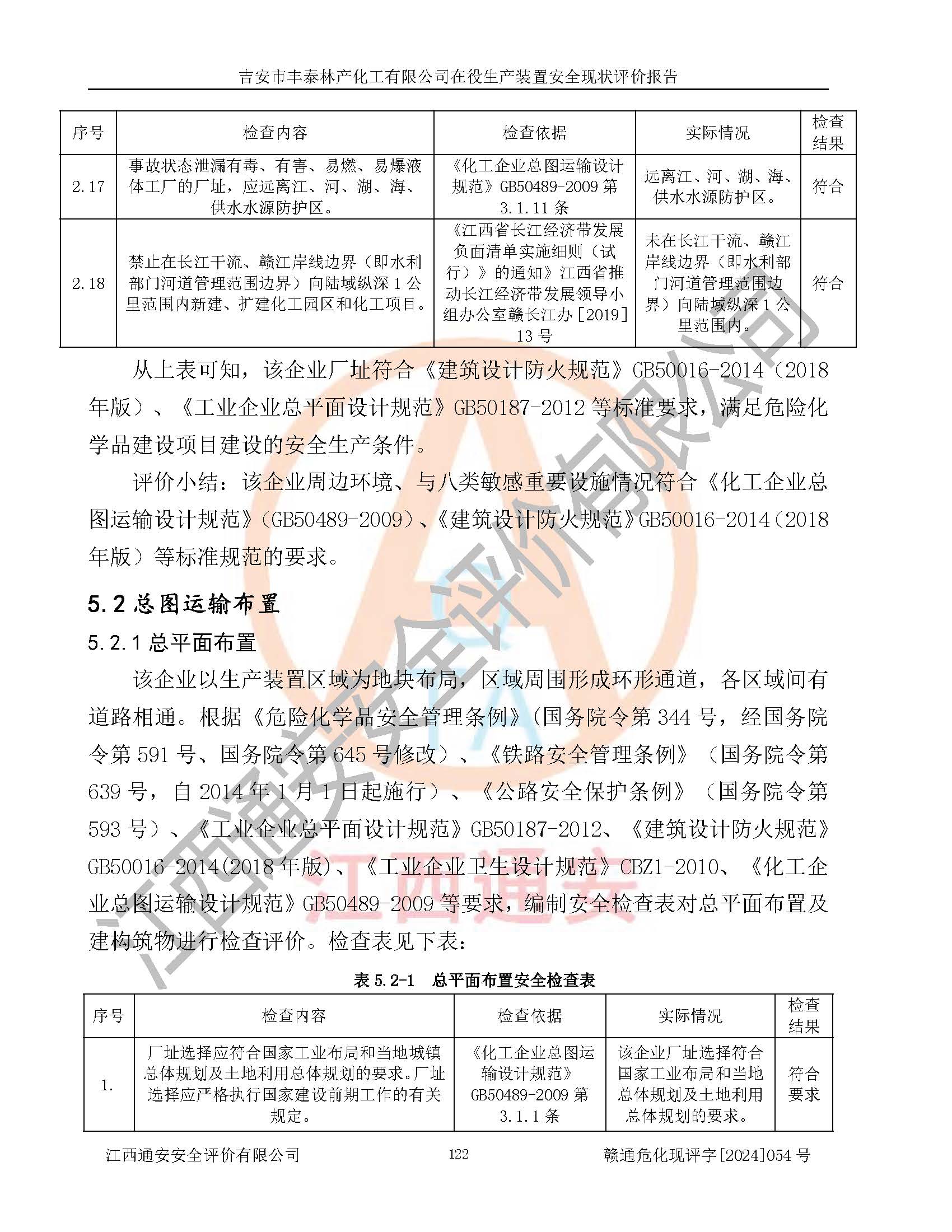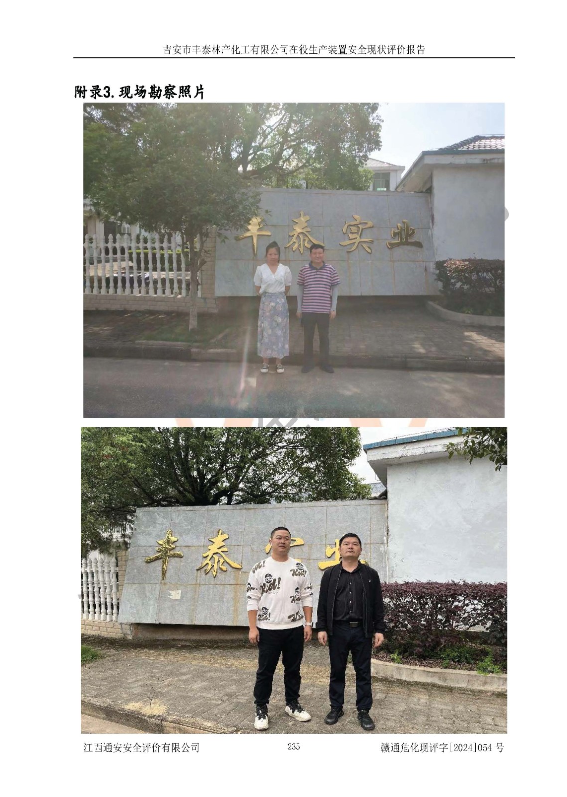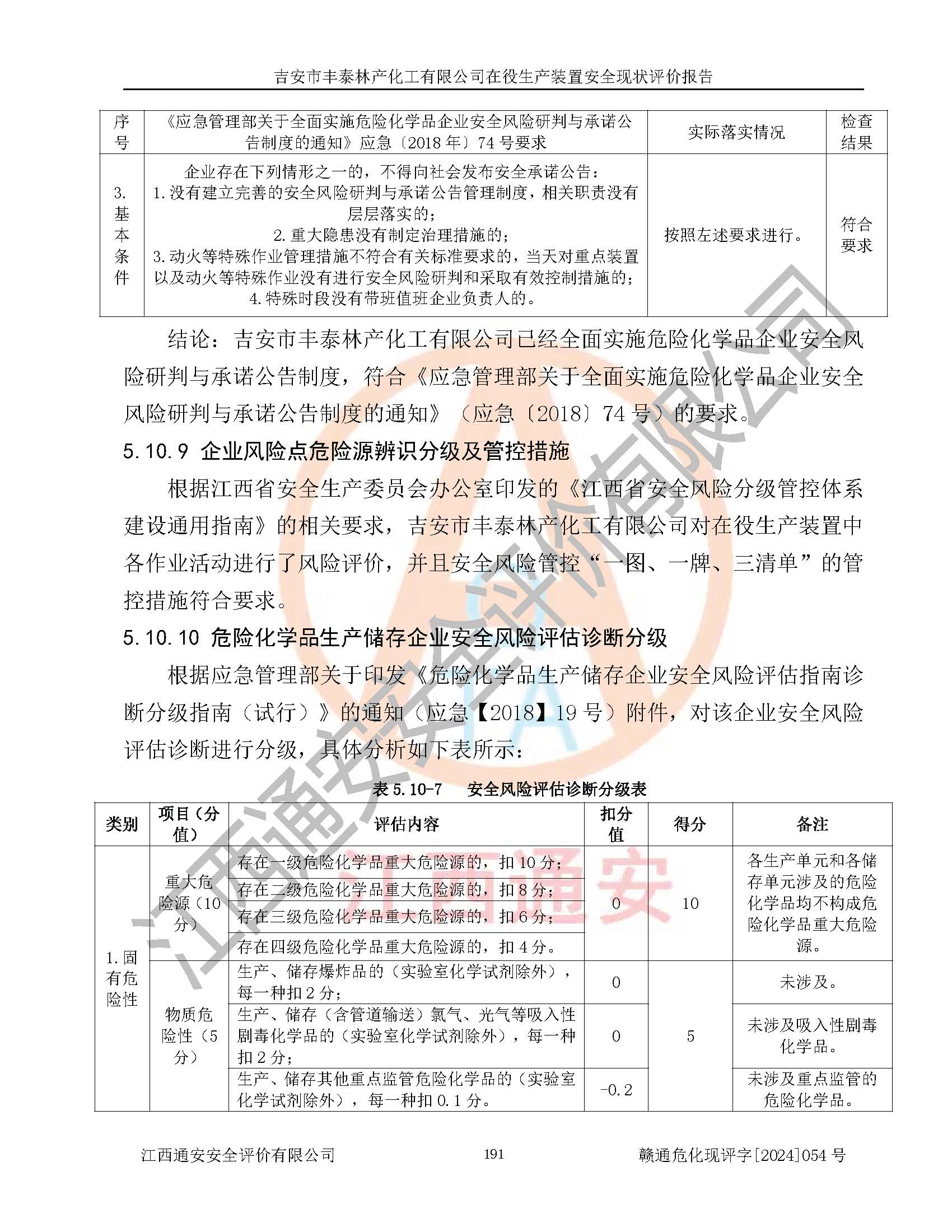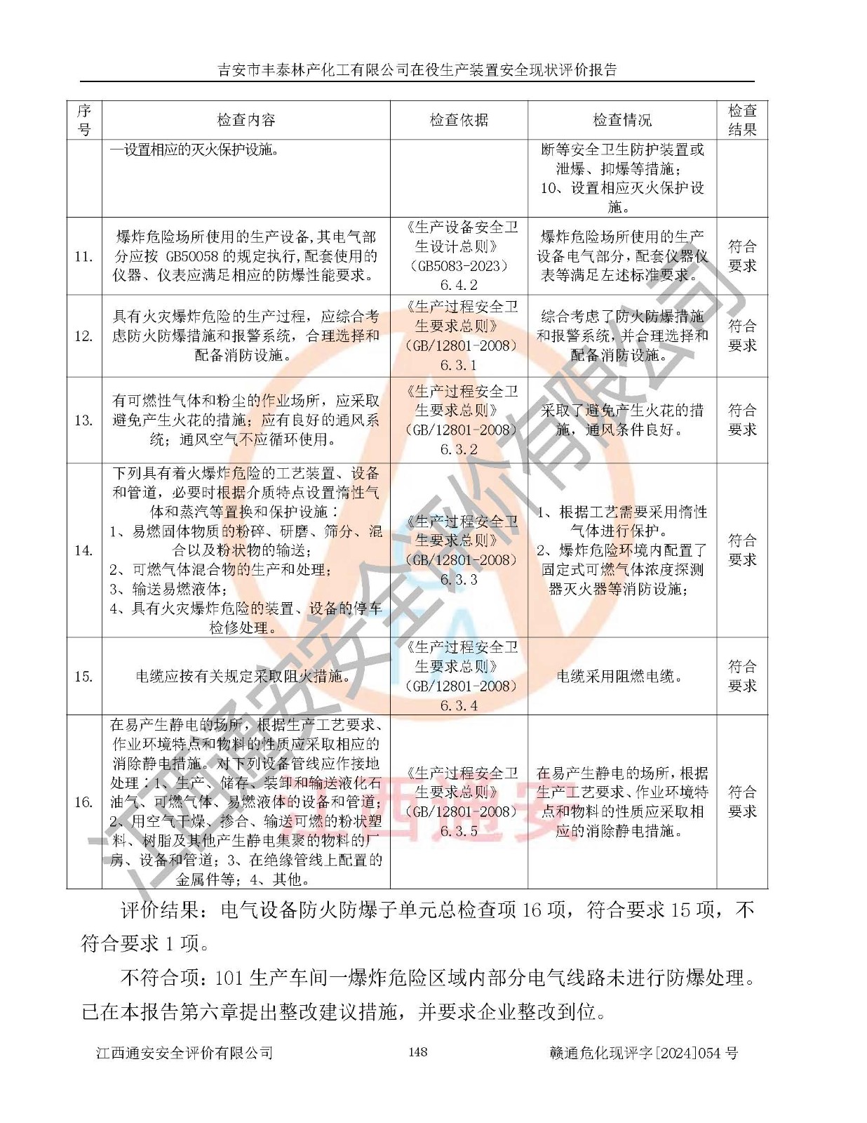 评价结论 | 评价结论:本报告认为,吉安市丰泰林产化工有限公司在役生产装置现场情况与设计图纸一致,有关从业人员资格符合《江西省危险化学品安全专项整治三年行动实施方案》要求,安全设施及安全管理符合**及有关部门关于安全生产法律法规、标准的要求,安全设施正常投用且运行**,安全风险是可以控制的,其风险程度是可以接受的,安全现状符合安全生产条件,能够满足安全生产的要求。 | |||