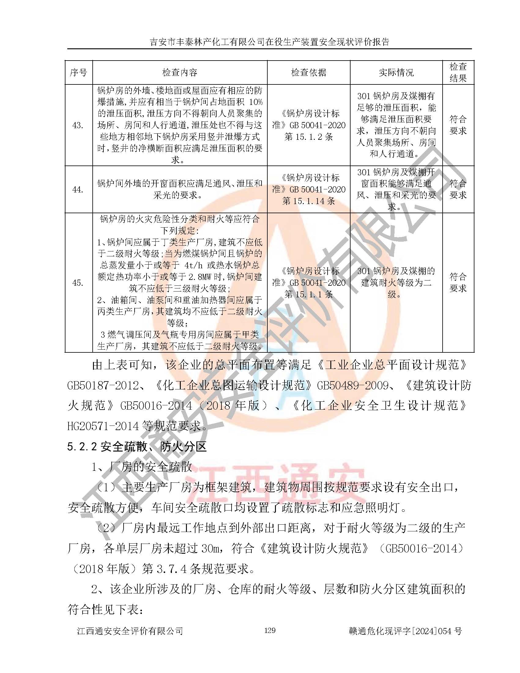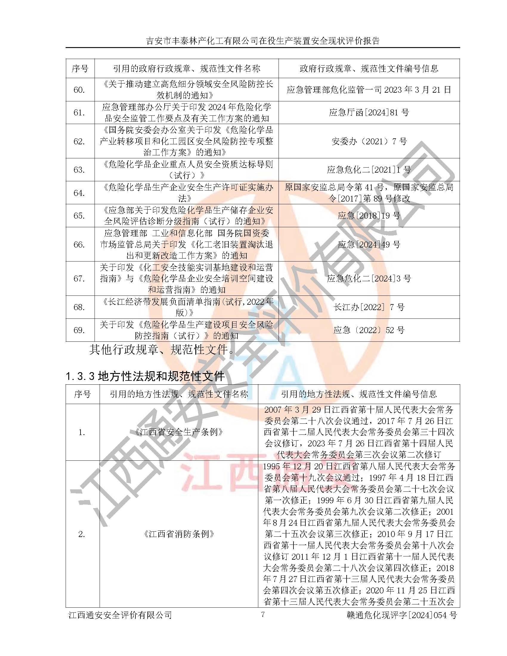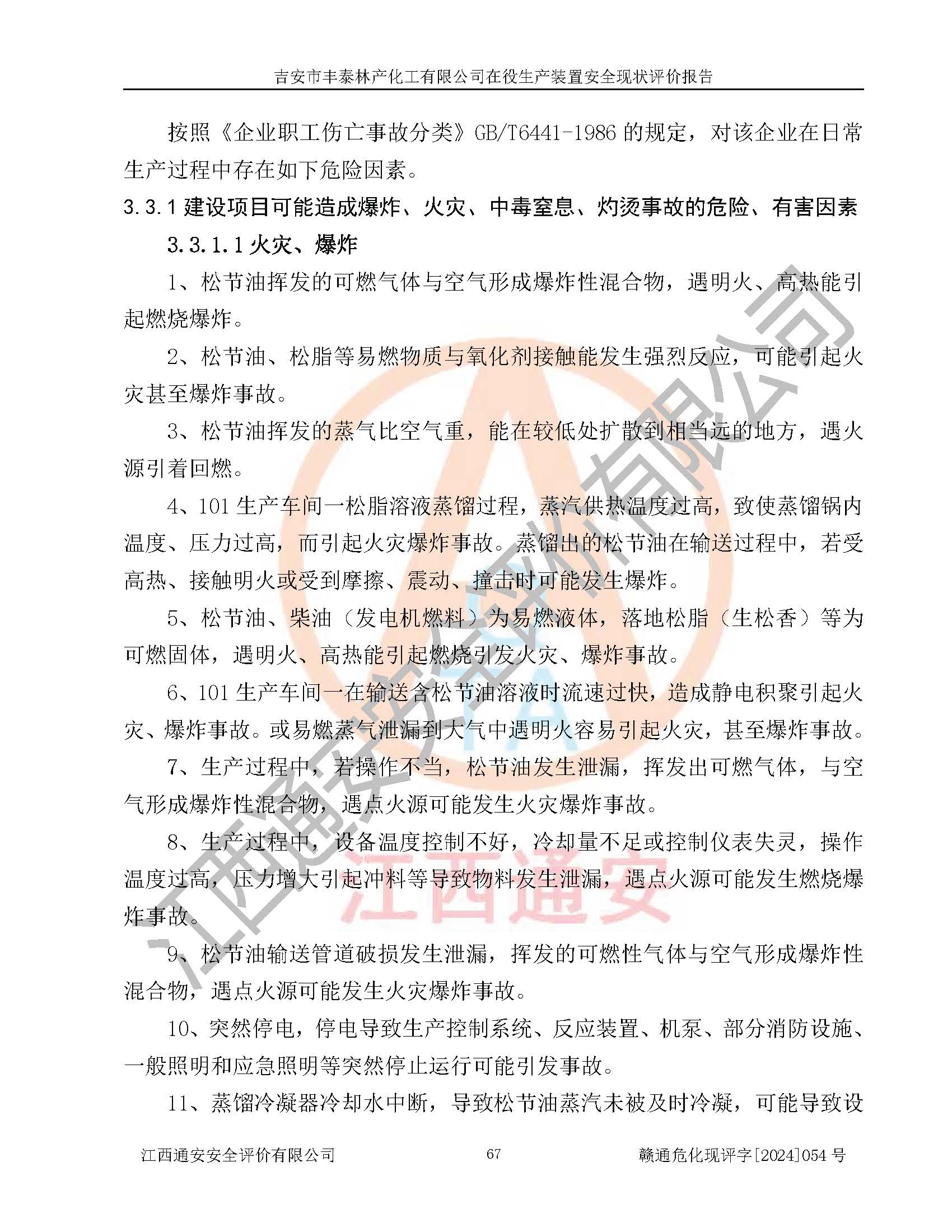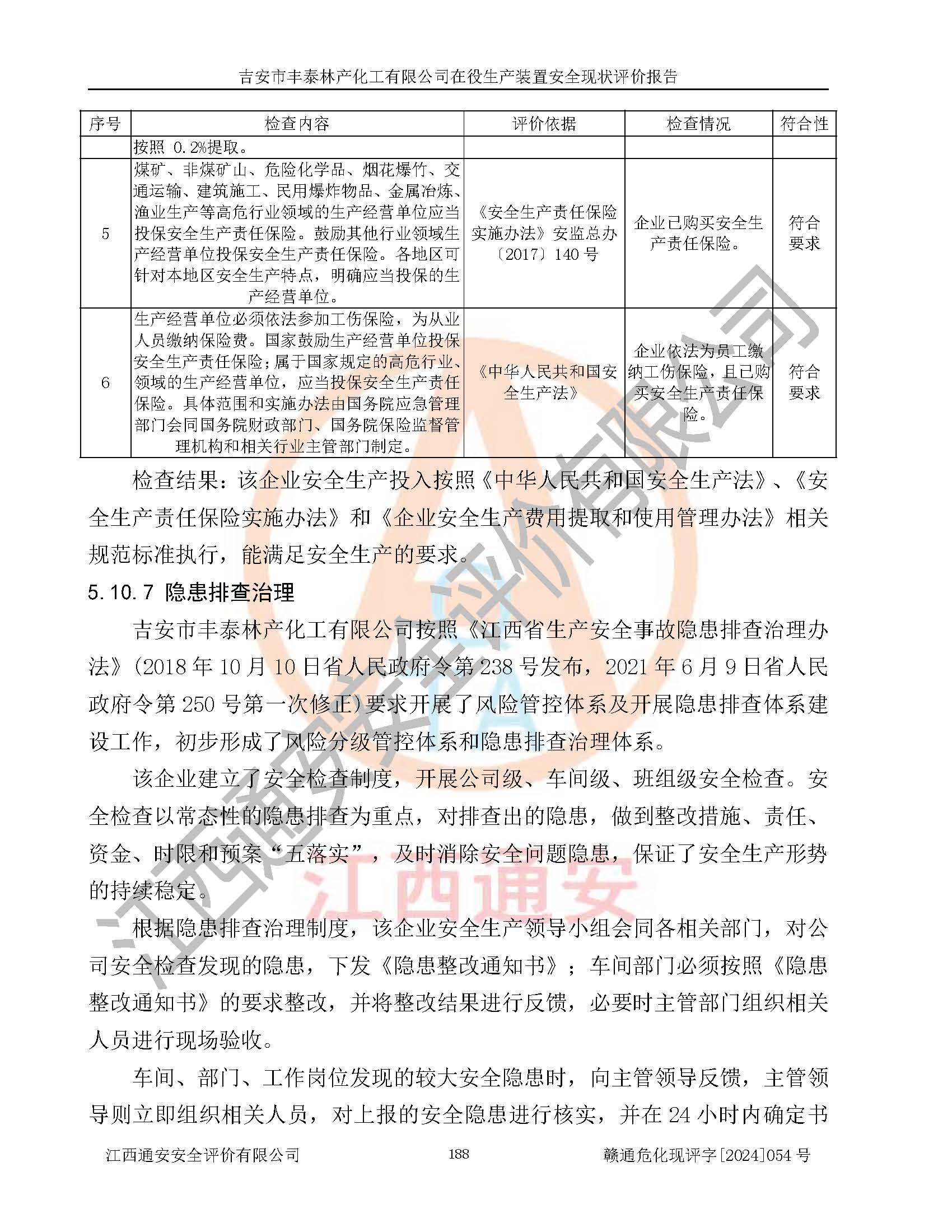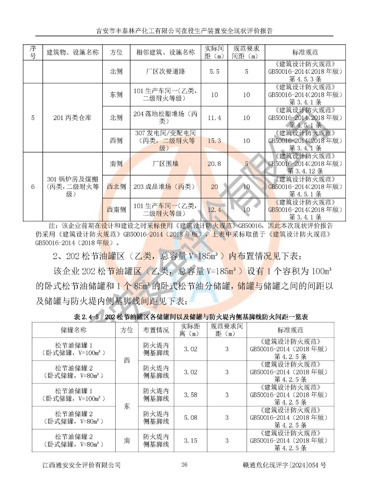 评价结论 | 评价结论:本报告认为,吉安市丰泰林产化工有限公司在役生产装置现场情况与设计图纸一致,有关从业人员资格符合《江西省危险化学品安全专项整治三年行动实施方案》要求,安全设施及安全管理符合**及有关部门关于安全生产法律法规、标准的要求,安全设施正常投用且运行**,安全风险是可以控制的,其风险程度是可以接受的,安全现状符合安全生产条件,能够满足安全生产的要求。 | |||