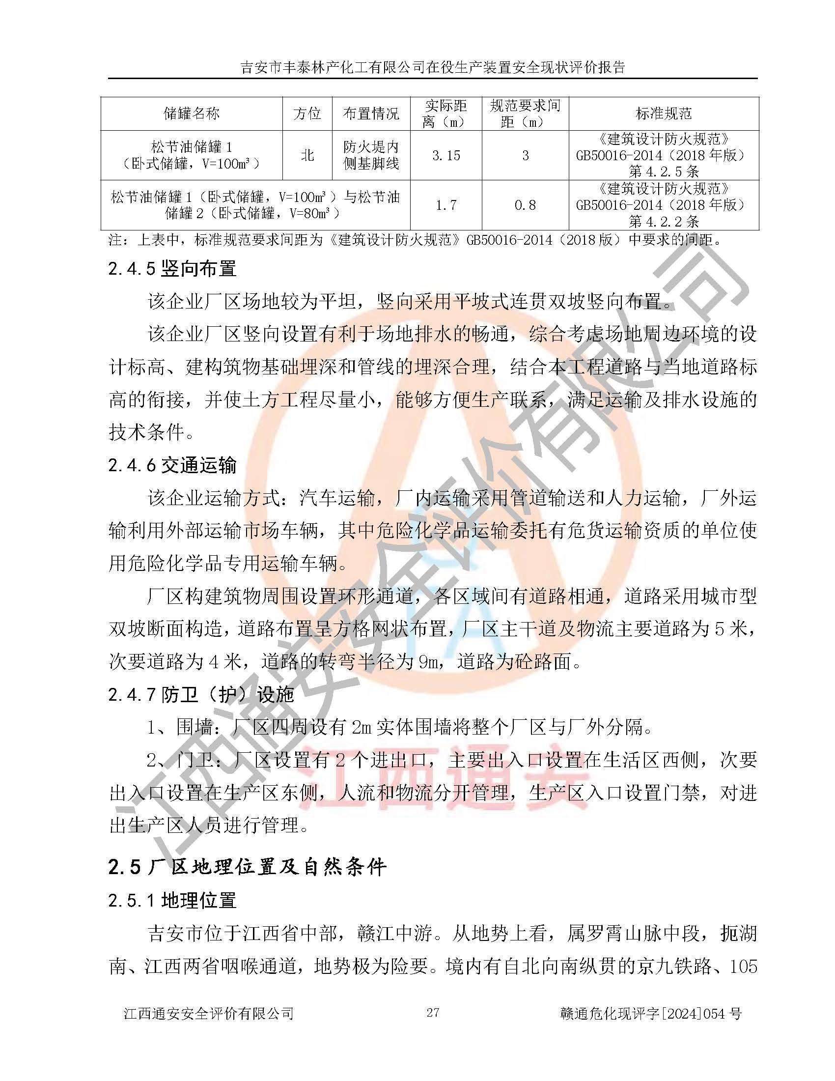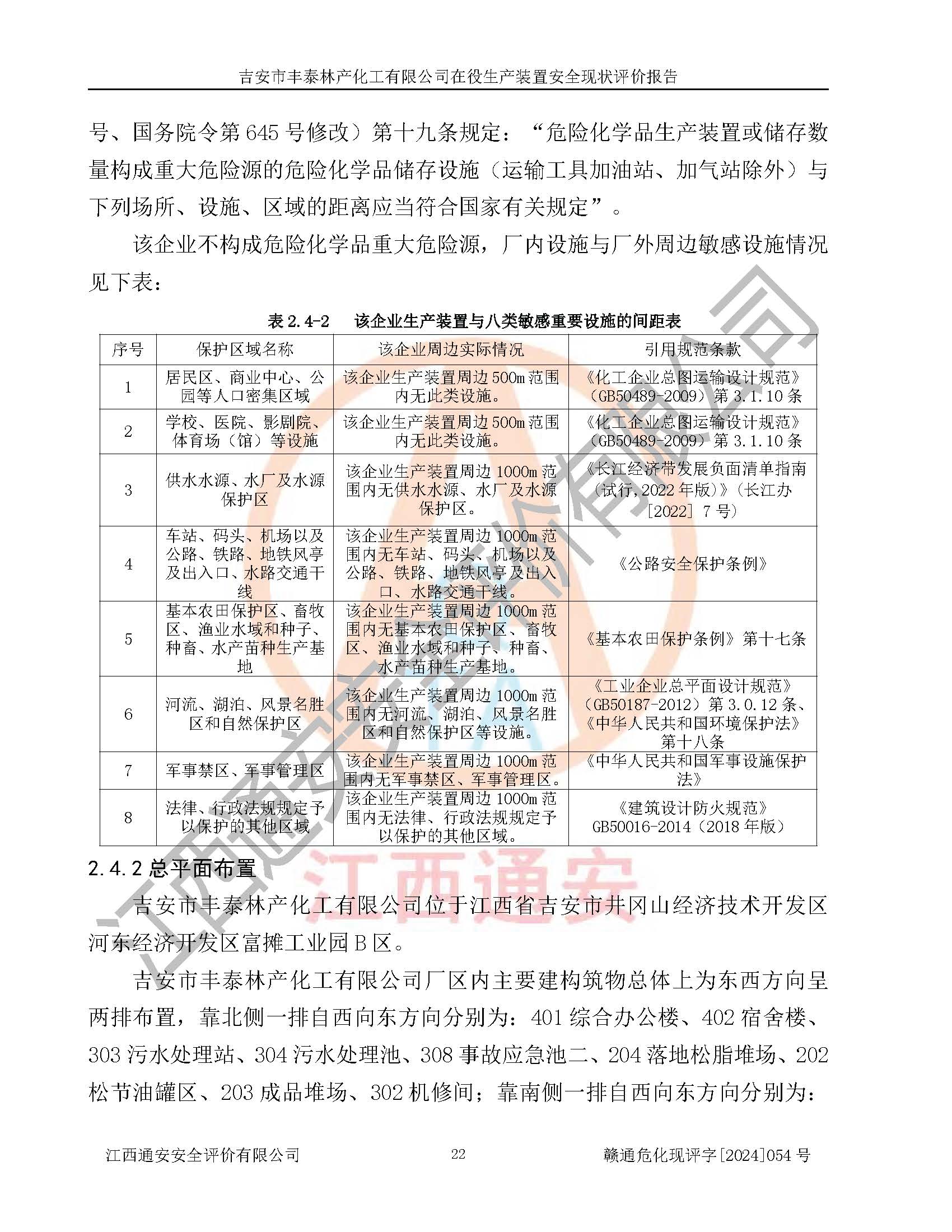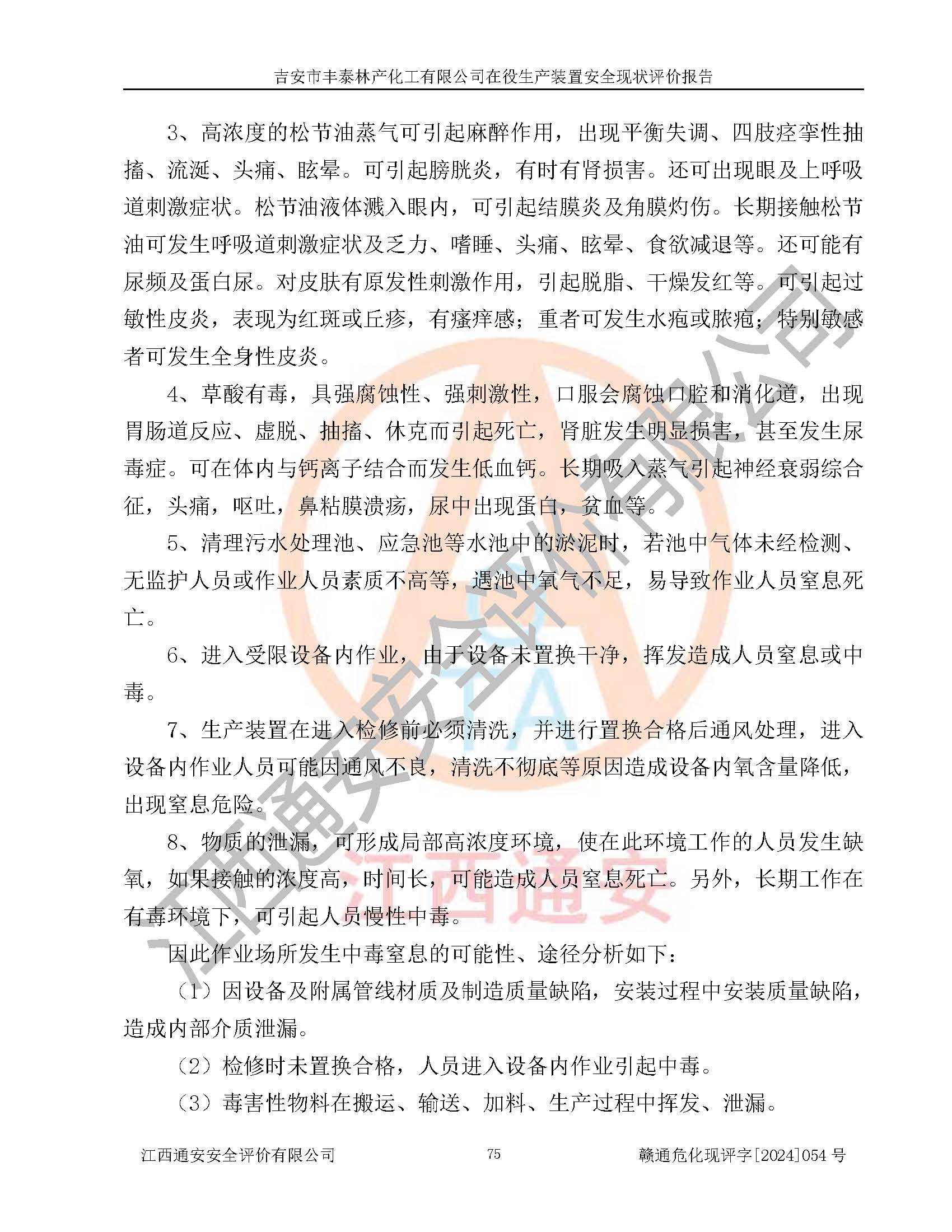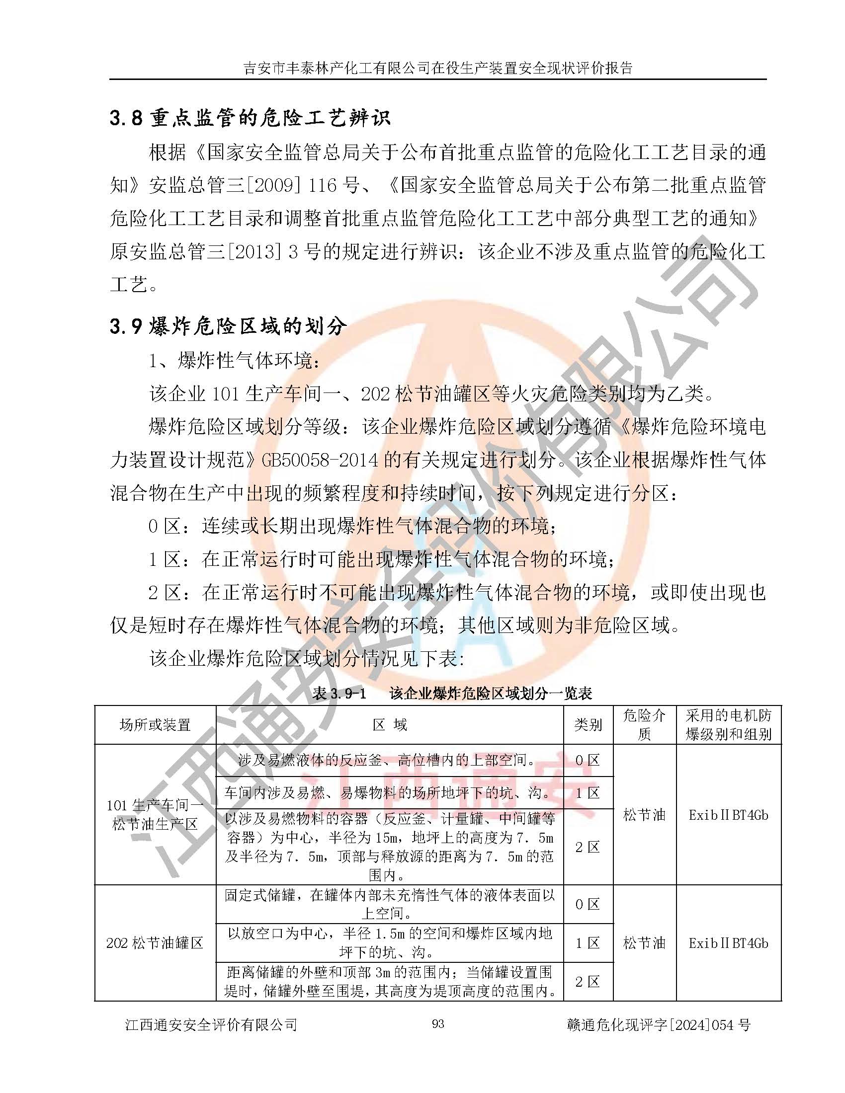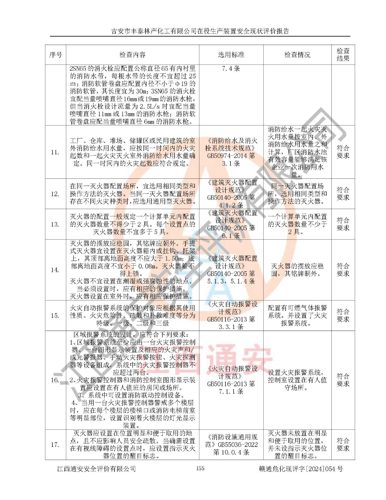 评价结论 | 评价结论:本报告认为,吉安市丰泰林产化工有限公司在役生产装置现场情况与设计图纸一致,有关从业人员资格符合《江西省危险化学品安全专项整治三年行动实施方案》要求,安全设施及安全管理符合**及有关部门关于安全生产法律法规、标准的要求,安全设施正常投用且运行**,安全风险是可以控制的,其风险程度是可以接受的,安全现状符合安全生产条件,能够满足安全生产的要求。 | |||