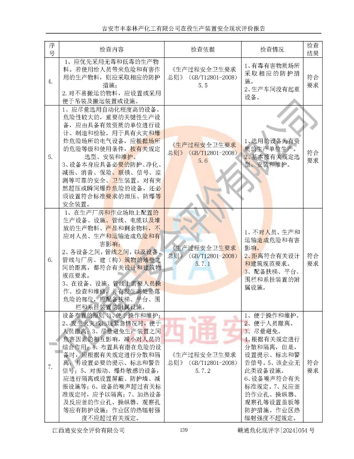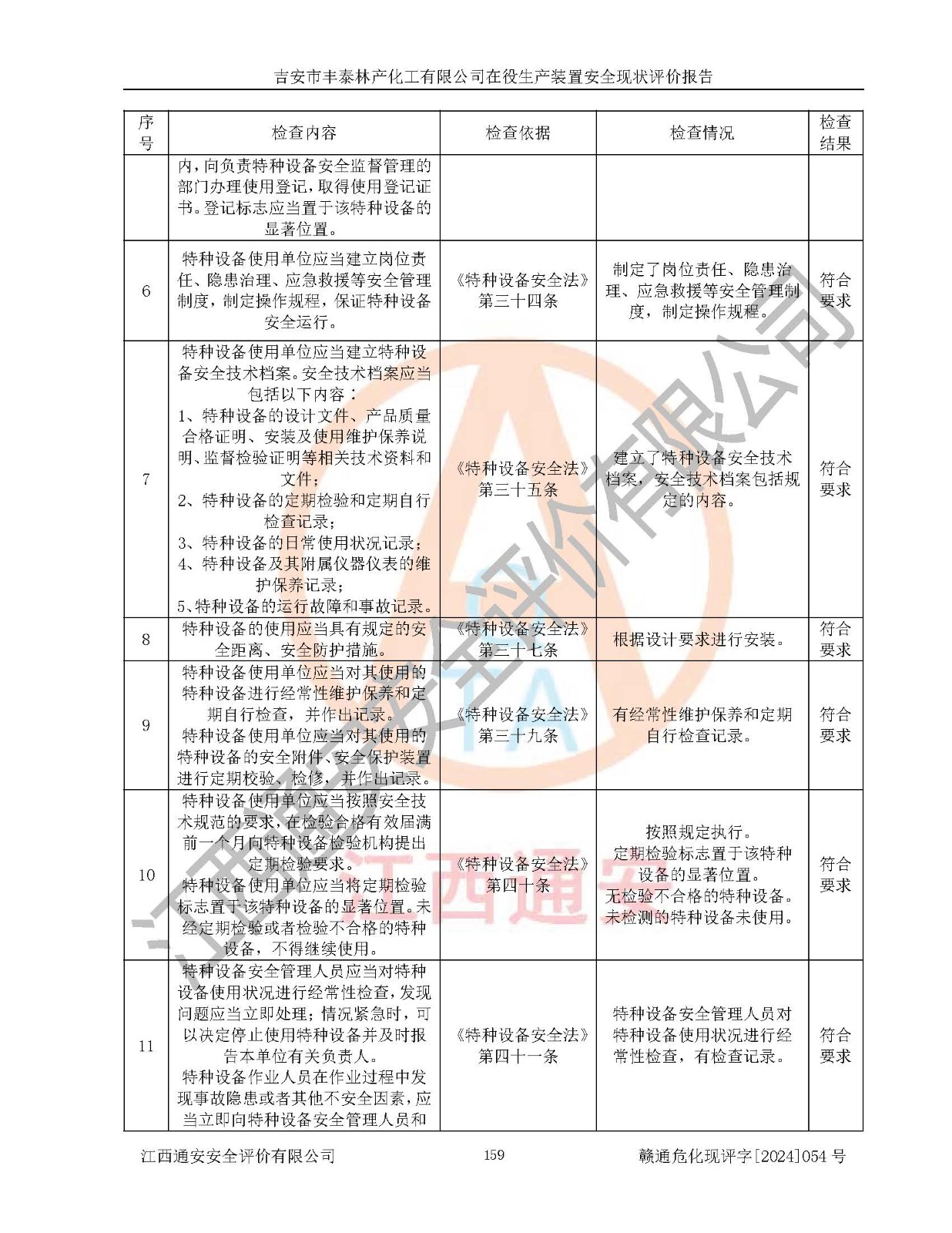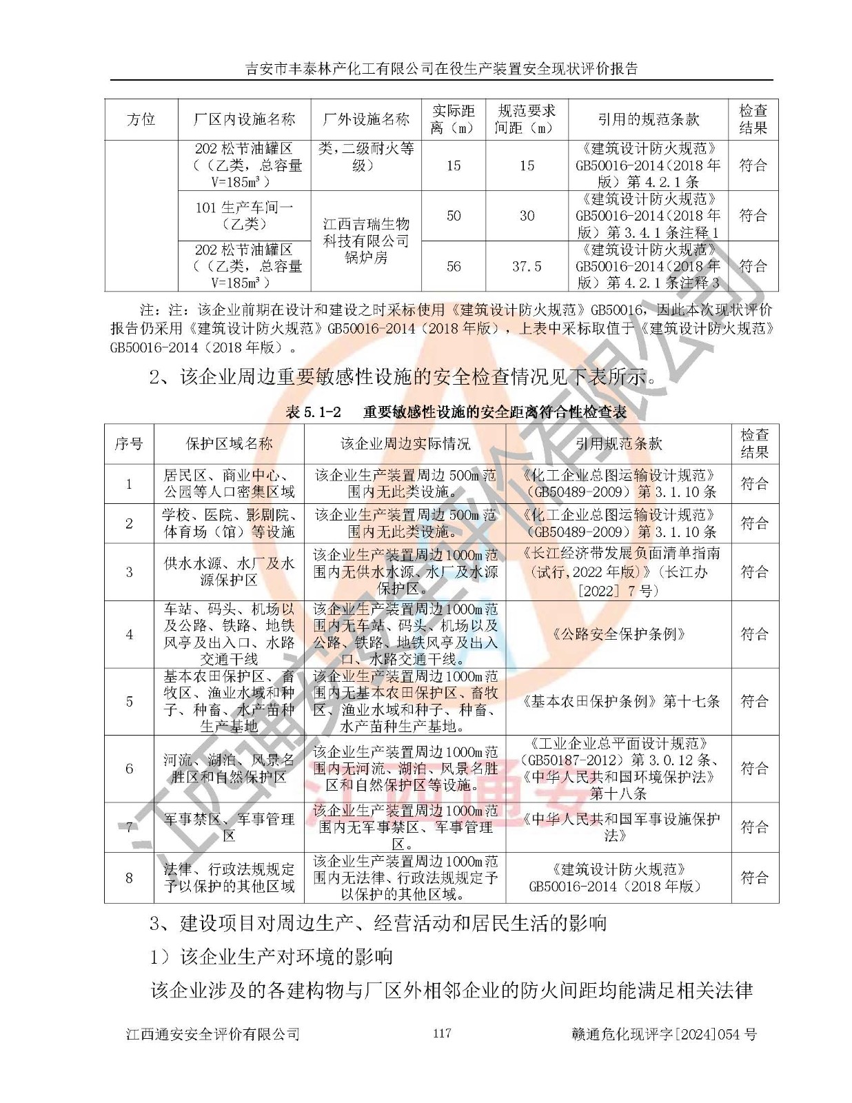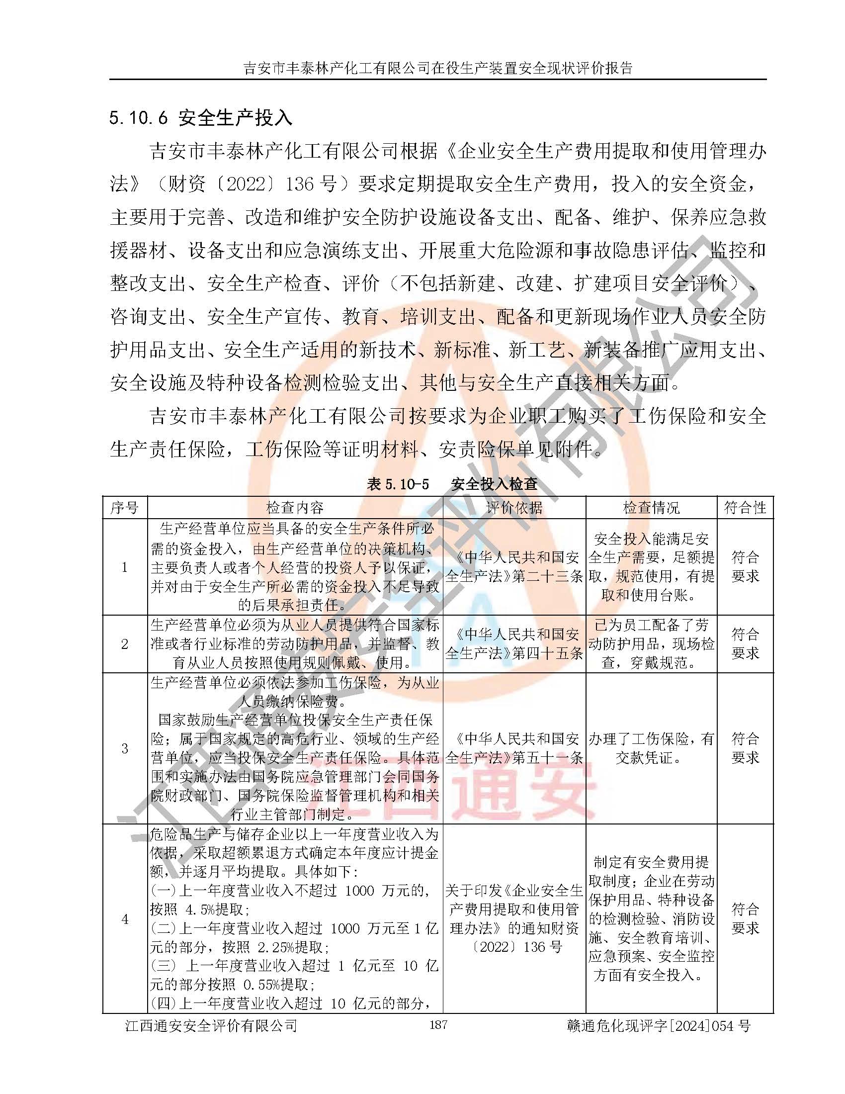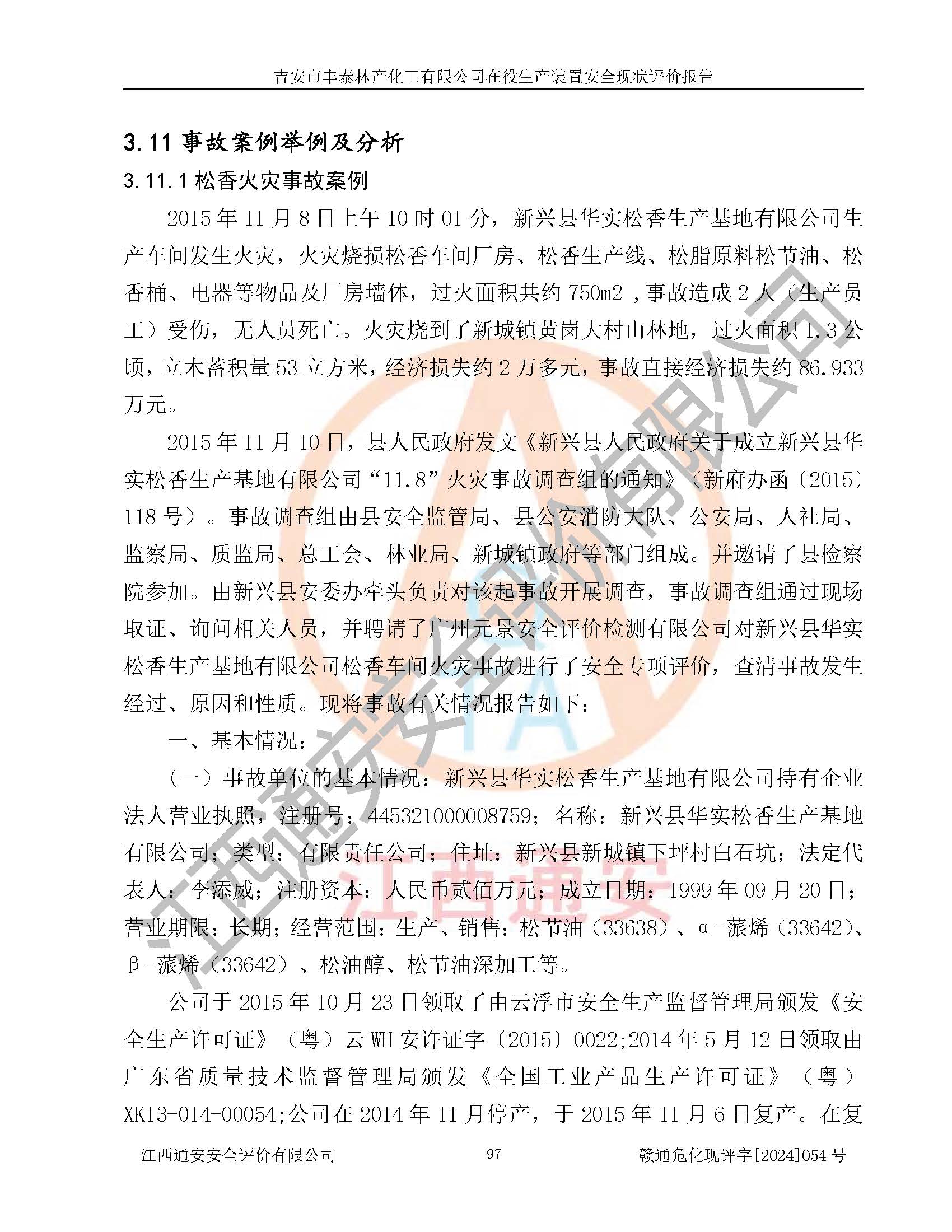 评价结论 | 评价结论:本报告认为,吉安市丰泰林产化工有限公司在役生产装置现场情况与设计图纸一致,有关从业人员资格符合《江西省危险化学品安全专项整治三年行动实施方案》要求,安全设施及安全管理符合**及有关部门关于安全生产法律法规、标准的要求,安全设施正常投用且运行**,安全风险是可以控制的,其风险程度是可以接受的,安全现状符合安全生产条件,能够满足安全生产的要求。 | |||